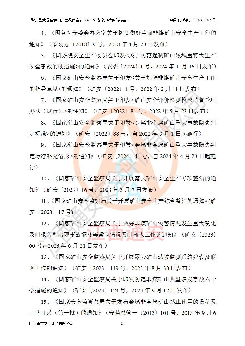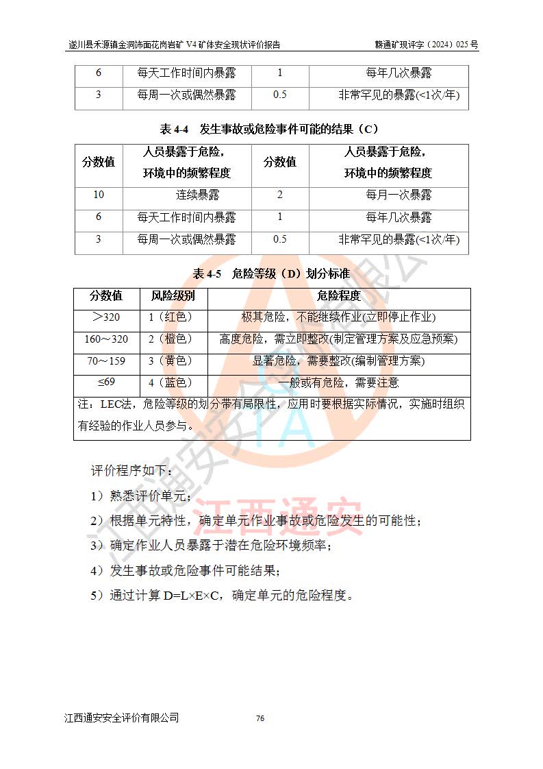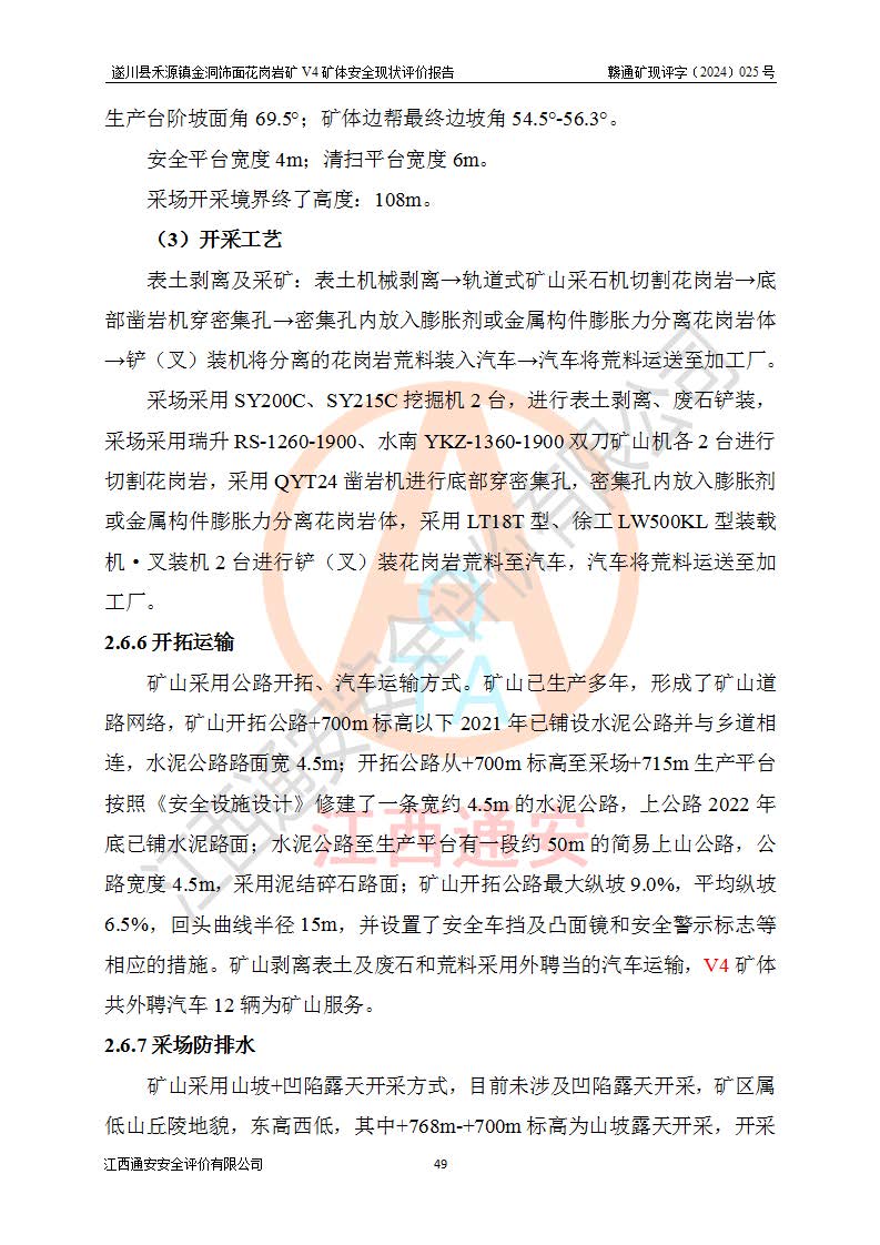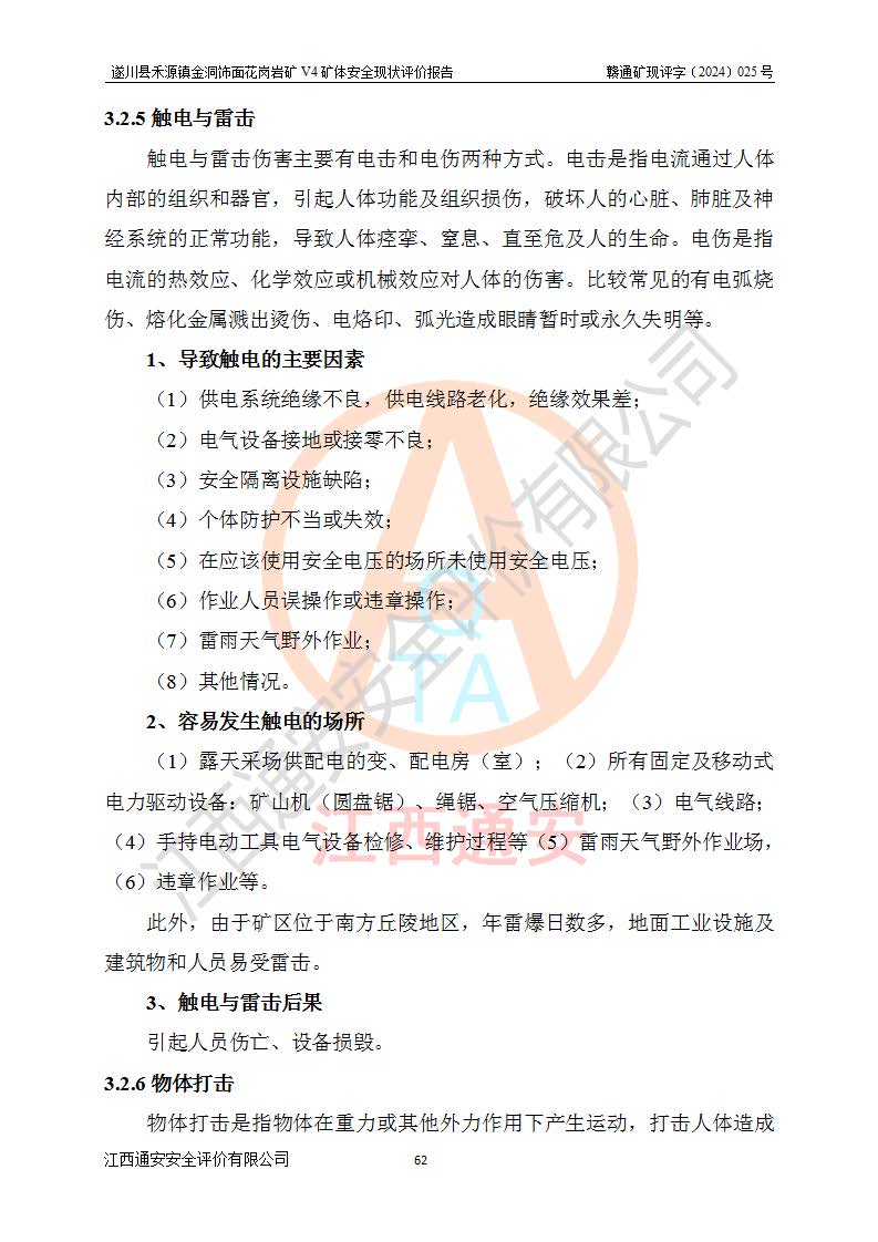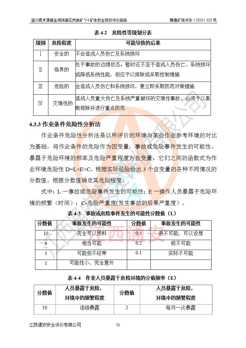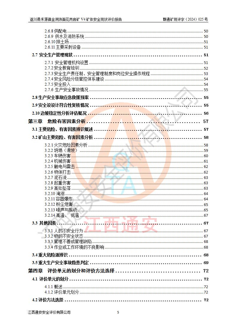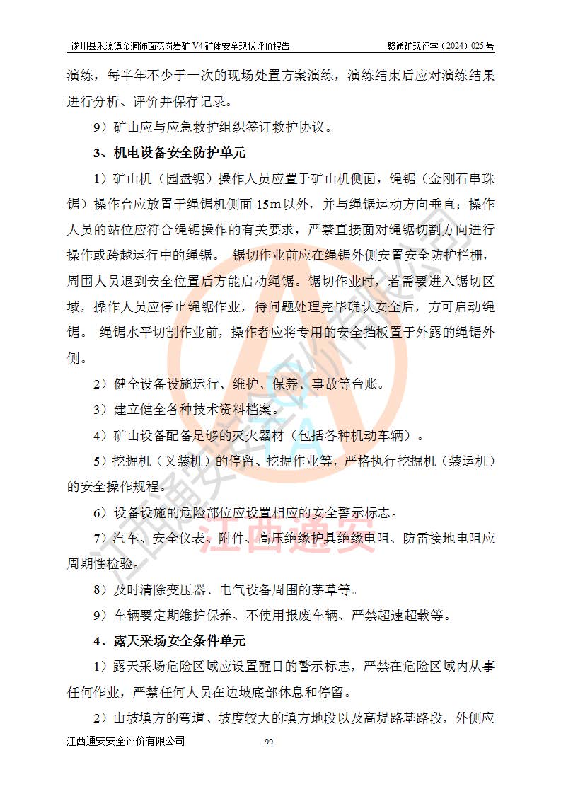 1、該評(píng)價(jià)項(xiàng)目中存在的主要危險(xiǎn)因素:火災(zāi),坍塌(滑坡),**傷害,機(jī)械傷害,觸電與雷擊,物體打擊,泥石流,起重傷害,高處墜落,淹溺,容器爆炸等危險(xiǎn)有害因素。 2、該評(píng)價(jià)項(xiàng)目中存在的有害因素包括:粉塵、噪聲與振動(dòng)、不良作業(yè)環(huán)境,如高溫、雷擊對(duì)礦山人員的傷害和其他不利的環(huán)境因素等。 3、該評(píng)價(jià)項(xiàng)目為非金屬露天礦山,無(wú)瓦斯和自燃發(fā)火危險(xiǎn),礦區(qū)范圍內(nèi)及周邊無(wú)較大水系,礦區(qū)水文地質(zhì)條件簡(jiǎn)單。該礦山只是對(duì)飾面用石料進(jìn)行機(jī)械開采,不使用有毒有害危險(xiǎn)化學(xué)品藥劑。該評(píng)價(jià)項(xiàng)目使用的壓力容器為空壓機(jī)儲(chǔ)氣罐,其工作介質(zhì)為空氣,屬**性、非易燃介質(zhì)。綜合上述分析,本評(píng)價(jià)項(xiàng)目不存在重大危險(xiǎn)源。 上述主要危險(xiǎn)、有害因素在采取本報(bào)告第六章中提出的安全對(duì)策措施及建議后,能得到**控制。遂川縣禾源鎮(zhèn)金洞飾面花崗巖礦V4礦體設(shè)備、設(shè)施和場(chǎng)所符合**安全生產(chǎn)有關(guān)法律、法規(guī)、標(biāo)準(zhǔn)及規(guī)范的規(guī)定。礦山采用露天開采、公路開拓、汽車運(yùn)輸方式,安全生產(chǎn)條件一般,能滿足基本的安全生產(chǎn)活動(dòng);安全管理能滿足法規(guī)要求,礦山露天開采按照《安全設(shè)施設(shè)計(jì)》組織生產(chǎn)、具備安全生產(chǎn)條件。 |