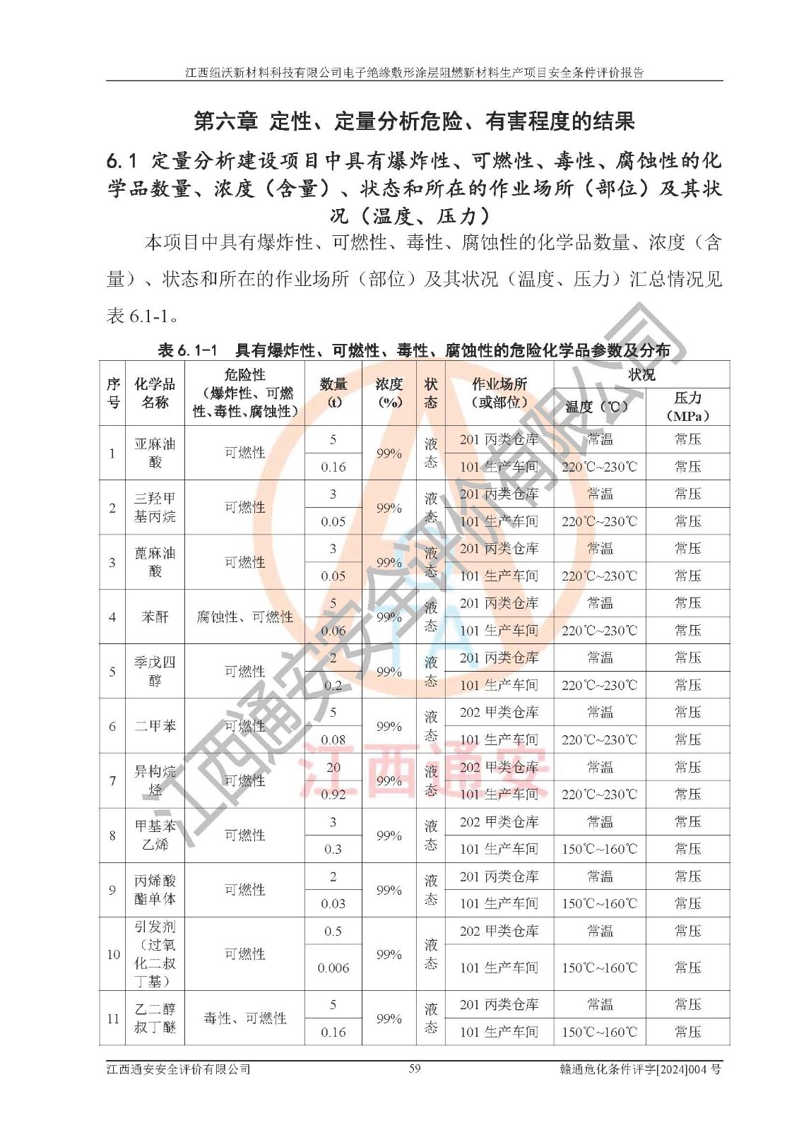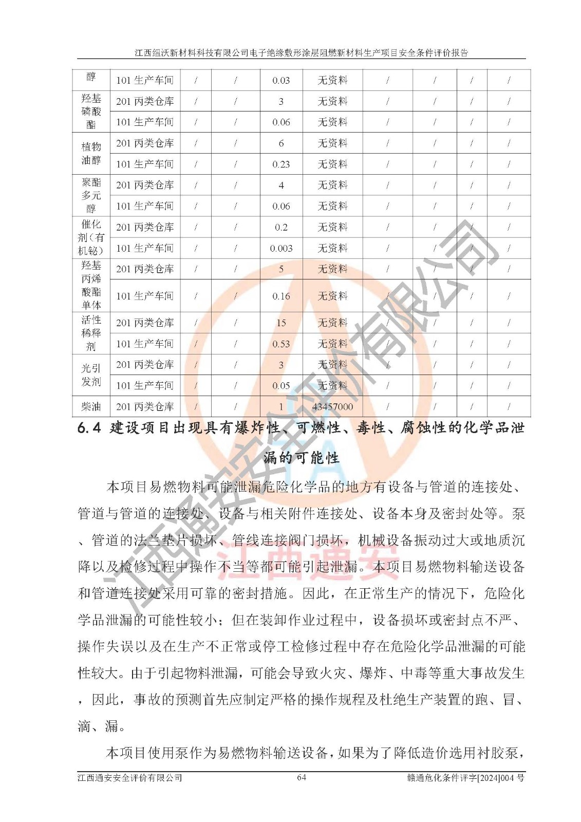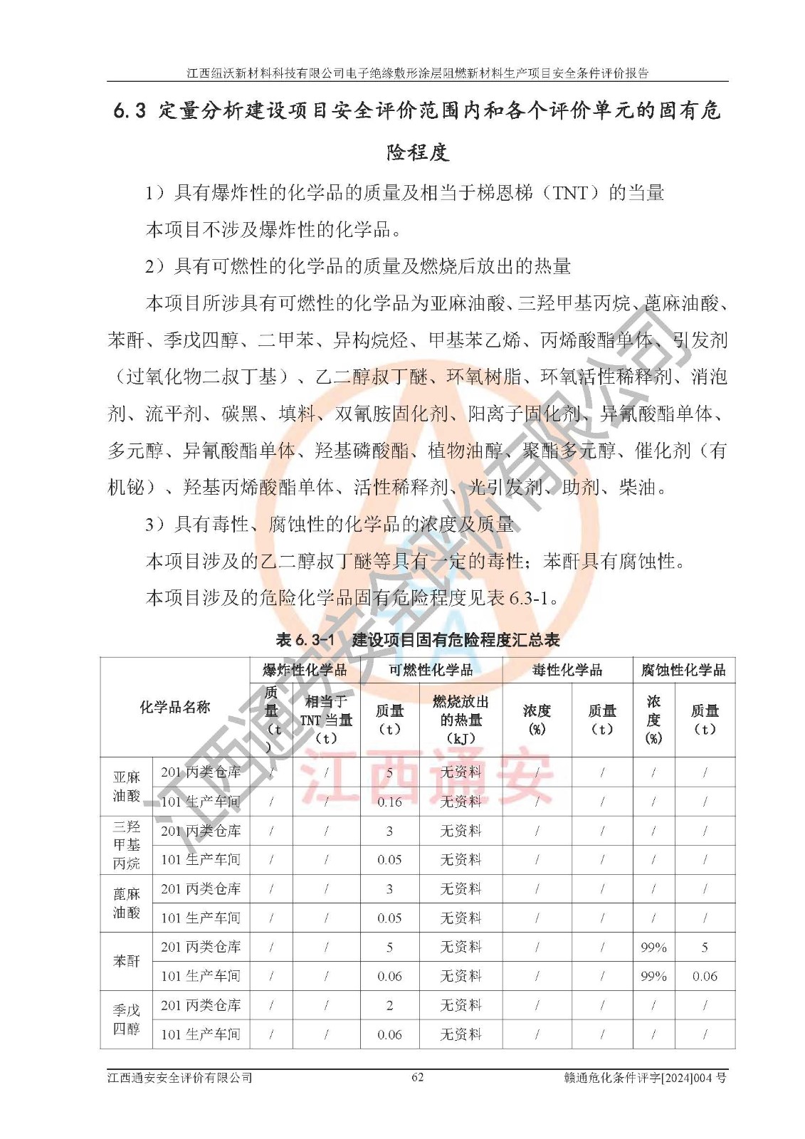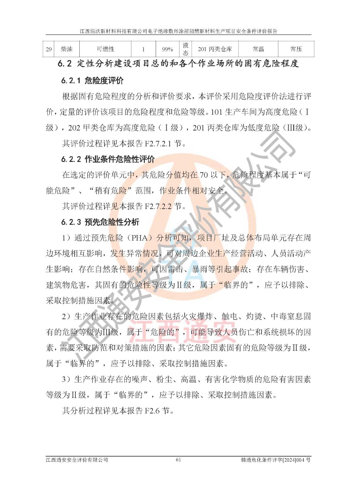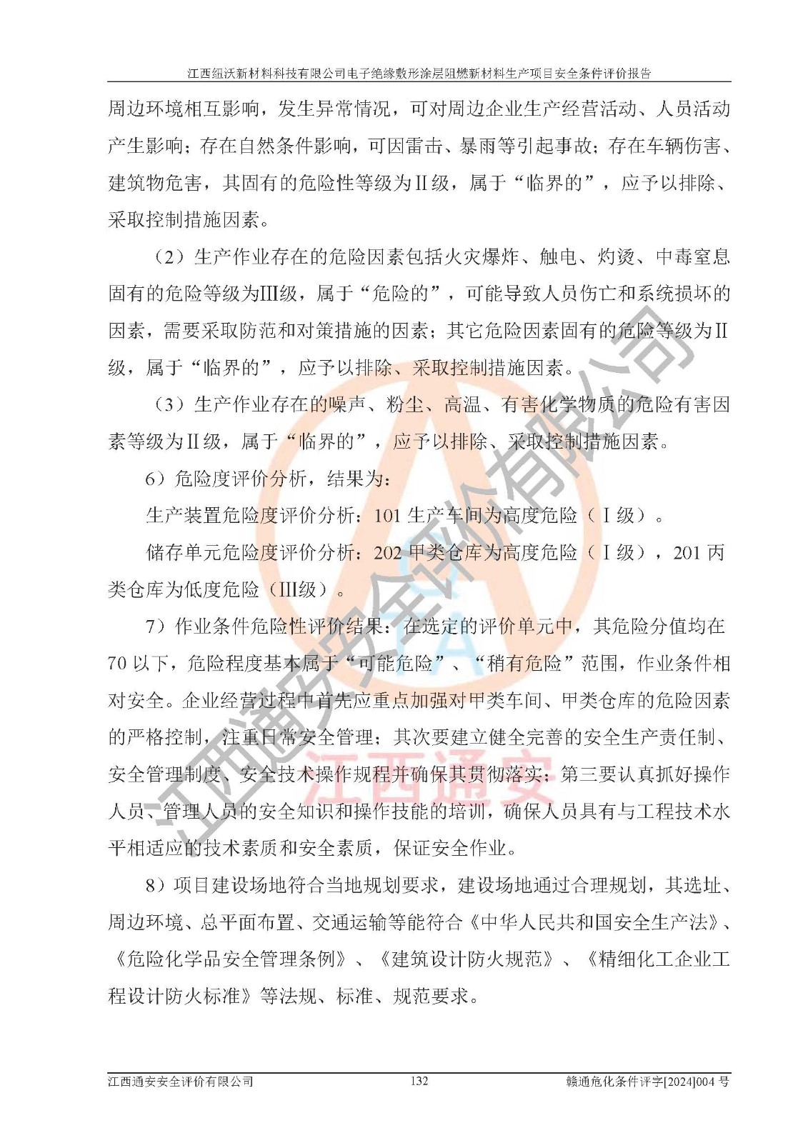 1)本項(xiàng)目依法取得了《江西省企業(yè)投資項(xiàng)目備案通知書》、《建設(shè)用地規(guī)劃許可證》,符合地方產(chǎn)業(yè)發(fā)展規(guī)劃的要求。 2)根據(jù)《**安全監(jiān)管總局關(guān)于公布首批重點(diǎn)監(jiān)管的危險(xiǎn)化工工藝目錄的通知》(安監(jiān)總管三[2009]116號(hào))和《**安全監(jiān)管總局關(guān)于公布第二批重點(diǎn)監(jiān)管危險(xiǎn)化工工藝目錄和調(diào)整首批重點(diǎn)監(jiān)管危險(xiǎn)化工工藝中部分典型工藝的通知》(安監(jiān)總管三[2013]3號(hào)),該項(xiàng)目未涉及重點(diǎn)監(jiān)管危險(xiǎn)化工工藝。 3)根據(jù)《危險(xiǎn)化學(xué)品重大危險(xiǎn)源辨識(shí)》(GB18218-2018),該項(xiàng)目未構(gòu)成危險(xiǎn)化學(xué)品重大危險(xiǎn)源。 4)項(xiàng)目存在的主要危險(xiǎn)因素有:火災(zāi)爆炸、容器爆炸、中毒窒息、灼燙、觸電、**傷害、機(jī)械傷害、高處墜落、物體打擊、淹溺等,存在的主要危害因素有:噪聲與振動(dòng)、高溫、有害化學(xué)物質(zhì)等;引起事故的原因有人的不安全行為、物的不安全狀態(tài)、管理缺陷和環(huán)境不良。其中*主要的危險(xiǎn)有害因素是火災(zāi)爆炸。 5)采用預(yù)先危險(xiǎn)性分析法評(píng)價(jià),結(jié)果為: (1)通過預(yù)先危險(xiǎn)(PHA)分析可知,項(xiàng)目廠址及總體布局單元存在周邊環(huán)境相互影響,發(fā)生異常情況,可對(duì)周邊企業(yè)生產(chǎn)經(jīng)營活動(dòng)、人員活動(dòng)產(chǎn)生影響;存在自然條件影響,可因雷擊、暴雨等引起事故;存在**傷害、建筑物危害,其固有的危險(xiǎn)性等級(jí)為Ⅱ級(jí),屬于“臨界的”,應(yīng)予以排除、采取控制措施因素。 (2)生產(chǎn)作業(yè)存在的危險(xiǎn)因素包括火災(zāi)爆炸、觸電、灼燙、中毒窒息固有的危險(xiǎn)等級(jí)為Ⅲ級(jí),屬于“危險(xiǎn)的”,可能導(dǎo)致人員傷亡和系統(tǒng)損壞的因素,需要采取防范和對(duì)策措施的因素;其它危險(xiǎn)因素固有的危險(xiǎn)等級(jí)為Ⅱ級(jí),屬于“臨界的”,應(yīng)予以排除、采取控制措施因素。 (3)生產(chǎn)作業(yè)存在的噪聲、粉塵、高溫、有害化學(xué)物質(zhì)的危險(xiǎn)有害因素等級(jí)為Ⅱ級(jí),屬于“臨界的”,應(yīng)予以排除、采取控制措施因素。 6)危險(xiǎn)度評(píng)價(jià)分析,結(jié)果為: 生產(chǎn)裝置危險(xiǎn)度評(píng)價(jià)分析:101生產(chǎn)車間為**危險(xiǎn)(Ⅰ級(jí))。 儲(chǔ)存單元危險(xiǎn)度評(píng)價(jià)分析:202甲類倉庫為**危險(xiǎn)(Ⅰ級(jí)),201丙類倉庫為低度危險(xiǎn)(Ⅲ級(jí))。 7)作業(yè)條件危險(xiǎn)性評(píng)價(jià)結(jié)果:在選定的評(píng)價(jià)單元中,其危險(xiǎn)分值均在70以下,危險(xiǎn)程度基本屬于“可能危險(xiǎn)”、“稍有危險(xiǎn)”范圍,作業(yè)條件相對(duì)安全。企業(yè)經(jīng)營過程中首先應(yīng)重點(diǎn)加強(qiáng)對(duì)甲類車間、甲類倉庫的危險(xiǎn)因素的嚴(yán)格控制,注重日常安全管理;其次要建立健全完善的安全生產(chǎn)責(zé)任制、安全管理制度、安全技術(shù)操作規(guī)程并**其貫徹落實(shí);第三要認(rèn)真抓好操作人員、管理人員的安全知識(shí)和操作技能的培訓(xùn),**人員具有與工程技術(shù)水平相適應(yīng)的技術(shù)素質(zhì)和安全素質(zhì),**安全作業(yè)。 8)項(xiàng)目建設(shè)場(chǎng)地符合當(dāng)?shù)匾?guī)劃要求,建設(shè)場(chǎng)地通過合理規(guī)劃,其選址、周邊環(huán)境、總平面布置、交通運(yùn)輸?shù)饶芊稀吨腥A人民共和國安全生產(chǎn)法》、《危險(xiǎn)化學(xué)品安全管理?xiàng)l例》、《建筑設(shè)計(jì)防火規(guī)范》、《精細(xì)化工企業(yè)工程設(shè)計(jì)防火標(biāo)準(zhǔn)》等法規(guī)、標(biāo)準(zhǔn)、規(guī)范要求。 廠址地區(qū)地震活動(dòng)相對(duì)較弱,災(zāi)害性天氣出現(xiàn)頻率稍高,自然災(zāi)害對(duì)項(xiàng)目建設(shè)具有**影響,通過采取相應(yīng)的防護(hù)措施,自然條件適宜建設(shè)。 9)建設(shè)項(xiàng)目符合**產(chǎn)業(yè)政策的要求;選擇工藝為現(xiàn)行成熟工藝,其安全可靠性可得到**。 10)本報(bào)告已根據(jù)有關(guān)安全生產(chǎn)法律、法規(guī)、規(guī)章和**標(biāo)準(zhǔn)、行業(yè)標(biāo)準(zhǔn),并嚴(yán)格執(zhí)行省委辦公廳省**辦公廳《關(guān)于全面加強(qiáng)危險(xiǎn)化學(xué)品安全生產(chǎn)工作的實(shí)施意見》(贛辦發(fā)[2020]32號(hào))及鄱陽湖生態(tài)經(jīng)濟(jì)區(qū)、長(zhǎng)江經(jīng)濟(jì)帶、“五河一湖”相關(guān)政策規(guī)定,客觀、公正、科學(xué)地進(jìn)行安全評(píng)價(jià),項(xiàng)目符合《江西省應(yīng)急管理廳關(guān)于印發(fā)《江西省危險(xiǎn)化學(xué)品建設(shè)項(xiàng)目安全監(jiān)督管理實(shí)施細(xì)則》(試行)的通知》(贛應(yīng)急字[2021]100號(hào))的要求。 11)本報(bào)告結(jié)合工藝特征,提出應(yīng)采取的對(duì)應(yīng)的自動(dòng)化控制系統(tǒng)及自動(dòng)化實(shí)施方案,滿足《江西省應(yīng)急管理廳關(guān)于印發(fā)《江西省化工企業(yè)自動(dòng)化提升實(shí)施方案》(試行)的通知》(贛應(yīng)急字[2021]190號(hào))的要求。 綜上所述:江西紐沃新材料科技有限公司電