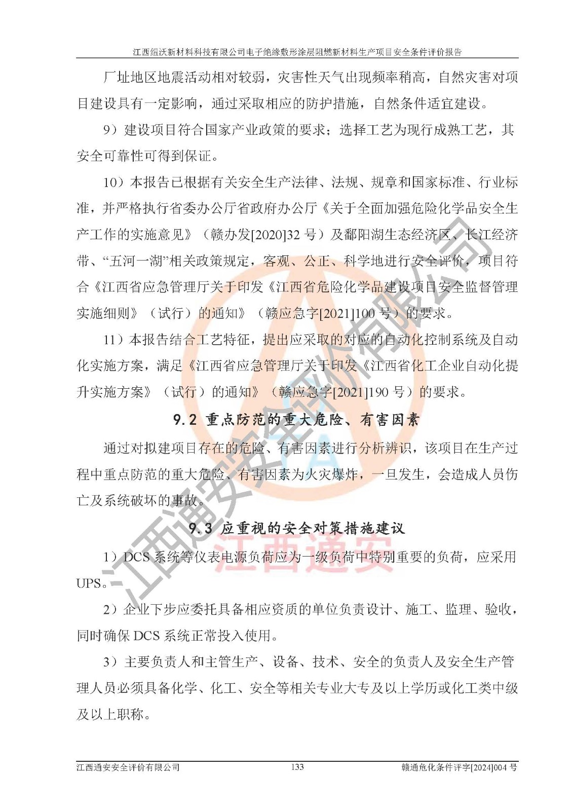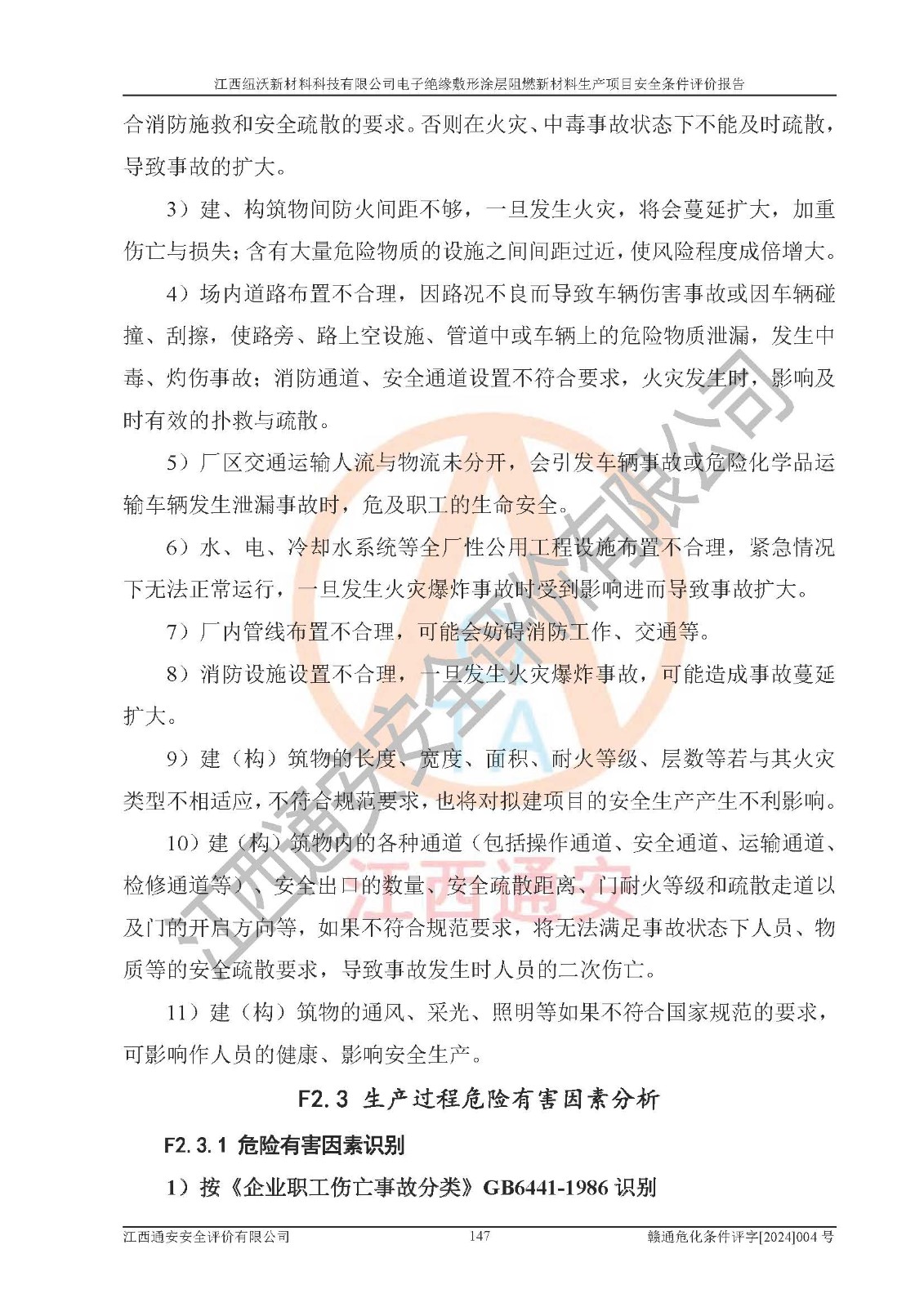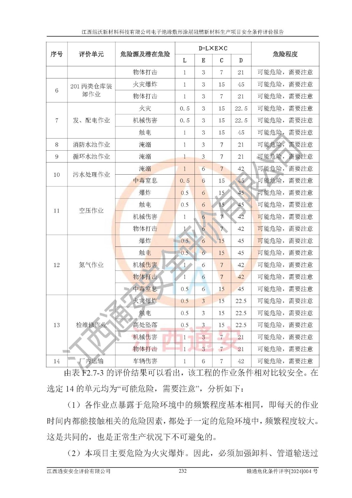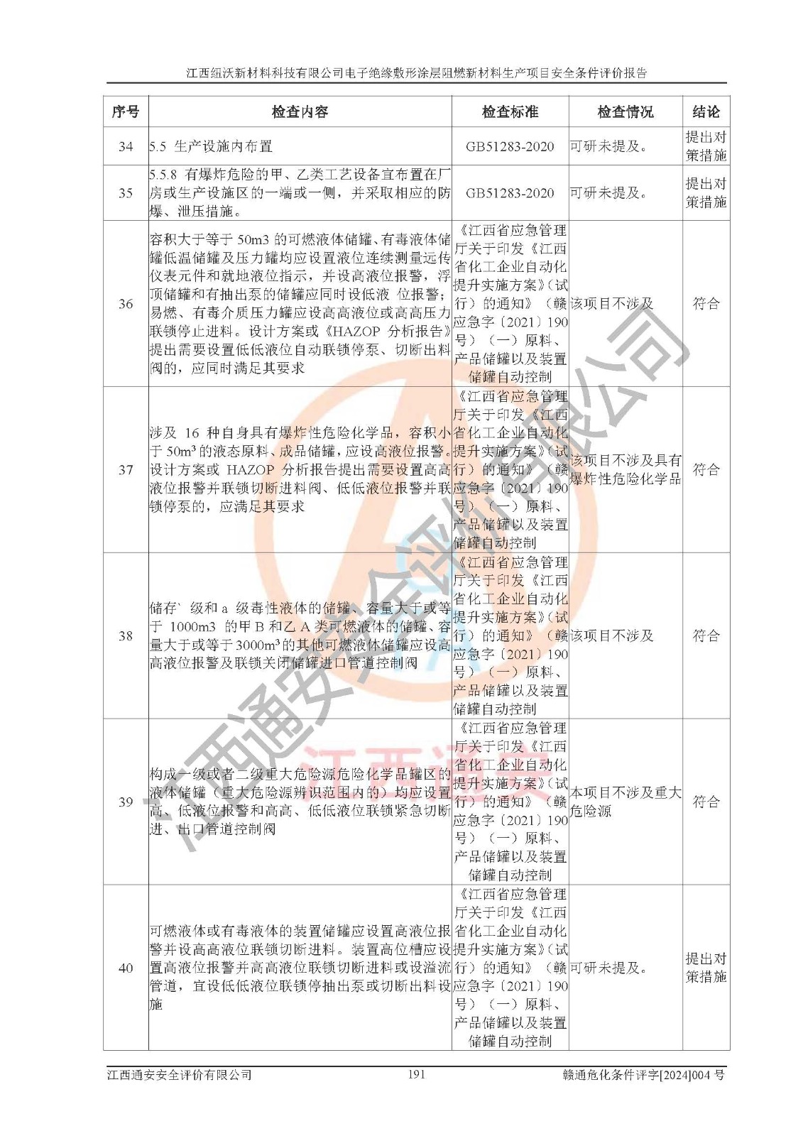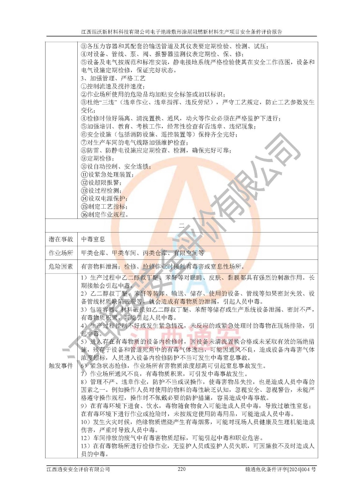 1)本項(xiàng)目依法取得了《江西省企業(yè)投資項(xiàng)目備案通知書》、《建設(shè)用地規(guī)劃許可證》,符合地方產(chǎn)業(yè)發(fā)展規(guī)劃的要求。 2)根據(jù)《**安全監(jiān)管總局關(guān)于公布首批重點(diǎn)監(jiān)管的危險(xiǎn)化工工藝目錄的通知》(安監(jiān)總管三[2009]116號(hào))和《**安全監(jiān)管總局關(guān)于公布第二批重點(diǎn)監(jiān)管危險(xiǎn)化工工藝目錄和調(diào)整首批重點(diǎn)監(jiān)管危險(xiǎn)化工工藝中部分典型工藝的通知》(安監(jiān)總管三[2013]3號(hào)),該項(xiàng)目未涉及重點(diǎn)監(jiān)管危險(xiǎn)化工工藝。 3)根據(jù)《危險(xiǎn)化學(xué)品重大危險(xiǎn)源辨識(shí)》(GB18218-2018),該項(xiàng)目未構(gòu)成危險(xiǎn)化學(xué)品重大危險(xiǎn)源。 4)項(xiàng)目存在的主要危險(xiǎn)因素有:火災(zāi)爆炸、容器爆炸、中毒窒息、灼燙、觸電、**傷害、機(jī)械傷害、高處墜落、物體打擊、淹溺等,存在的主要危害因素有:噪聲與振動(dòng)、高溫、有害化學(xué)物質(zhì)等;引起事故的原因有人的不安全行為、物的不安全狀態(tài)、管理缺陷和環(huán)境不良。其中*主要的危險(xiǎn)有害因素是火災(zāi)爆炸。 5)采用預(yù)先危險(xiǎn)性分析法評(píng)價(jià),結(jié)果為: (1)通過預(yù)先危險(xiǎn)(PHA)分析可知,項(xiàng)目廠址及總體布局單元存在周邊環(huán)境相互影響,發(fā)生異常情況,可對(duì)周邊企業(yè)生產(chǎn)經(jīng)營活動(dòng)、人員活動(dòng)產(chǎn)生影響;存在自然條件影響,可因雷擊、暴雨等引起事故;存在**傷害、建筑物危害,其固有的危險(xiǎn)性等級(jí)為Ⅱ級(jí),屬于“臨界的”,應(yīng)予以排除、采取控制措施因素。 (2)生產(chǎn)作業(yè)存在的危險(xiǎn)因素包括火災(zāi)爆炸、觸電、灼燙、中毒窒息固有的危險(xiǎn)等級(jí)為Ⅲ級(jí),屬于“危險(xiǎn)的”,可能導(dǎo)致人員傷亡和系統(tǒng)損壞的因素,需要采取防范和對(duì)策措施的因素;其它危險(xiǎn)因素固有的危險(xiǎn)等級(jí)為Ⅱ級(jí),屬于“臨界的”,應(yīng)予以排除、采取控制措施因素。 (3)生產(chǎn)作業(yè)存在的噪聲、粉塵、高溫、有害化學(xué)物質(zhì)的危險(xiǎn)有害因素等級(jí)為Ⅱ級(jí),屬于“臨界的”,應(yīng)予以排除、采取控制措施因素。 6)危險(xiǎn)度評(píng)價(jià)分析,結(jié)果為: 生產(chǎn)裝置危險(xiǎn)度評(píng)價(jià)分析:101生產(chǎn)車間為**危險(xiǎn)(Ⅰ級(jí))。 儲(chǔ)存單元危險(xiǎn)度評(píng)價(jià)分析:202甲類倉庫為**危險(xiǎn)(Ⅰ級(jí)),201丙類倉庫為低度危險(xiǎn)(Ⅲ級(jí))。 7)作業(yè)條件危險(xiǎn)性評(píng)價(jià)結(jié)果:在選定的評(píng)價(jià)單元中,其危險(xiǎn)分值均在70以下,危險(xiǎn)程度基本屬于“可能危險(xiǎn)”、“稍有危險(xiǎn)”范圍,作業(yè)條件相對(duì)安全。企業(yè)經(jīng)營過程中首先應(yīng)重點(diǎn)加強(qiáng)對(duì)甲類車間、甲類倉庫的危險(xiǎn)因素的嚴(yán)格控制,注重日常安全管理;其次要建立健全完善的安全生產(chǎn)責(zé)任制、安全管理制度、安全技術(shù)操作規(guī)程并**其貫徹落實(shí);第三要認(rèn)真抓好操作人員、管理人員的安全知識(shí)和操作技能的培訓(xùn),**人員具有與工程技術(shù)水平相適應(yīng)的技術(shù)素質(zhì)和安全素質(zhì),**安全作業(yè)。 8)項(xiàng)目建設(shè)場(chǎng)地符合當(dāng)?shù)匾?guī)劃要求,建設(shè)場(chǎng)地通過合理規(guī)劃,其選址、周邊環(huán)境、總平面布置、交通運(yùn)輸?shù)饶芊稀吨腥A人民共和國安全生產(chǎn)法》、《危險(xiǎn)化學(xué)品安全管理?xiàng)l例》、《建筑設(shè)計(jì)防火規(guī)范》、《精細(xì)化工企業(yè)工程設(shè)計(jì)防火標(biāo)準(zhǔn)》等法規(guī)、標(biāo)準(zhǔn)、規(guī)范要求。 廠址地區(qū)地震活動(dòng)相對(duì)較弱,災(zāi)害性天氣出現(xiàn)頻率稍高,自然災(zāi)害對(duì)項(xiàng)目建設(shè)具有**影響,通過采取相應(yīng)的防護(hù)措施,自然條件適宜建設(shè)。 9)建設(shè)項(xiàng)目符合**產(chǎn)業(yè)政策的要求;選擇工藝為現(xiàn)行成熟工藝,其安全可靠性可得到**。 10)本報(bào)告已根據(jù)有關(guān)安全生產(chǎn)法律、法規(guī)、規(guī)章和**標(biāo)準(zhǔn)、行業(yè)標(biāo)準(zhǔn),并嚴(yán)格執(zhí)行省委辦公廳省**辦公廳《關(guān)于全面加強(qiáng)危險(xiǎn)化學(xué)品安全生產(chǎn)工作的實(shí)施意見》(贛辦發(fā)[2020]32號(hào))及鄱陽湖生態(tài)經(jīng)濟(jì)區(qū)、長(zhǎng)江經(jīng)濟(jì)帶、“五河一湖”相關(guān)政策規(guī)定,客觀、公正、科學(xué)地進(jìn)行安全評(píng)價(jià),項(xiàng)目符合《江西省應(yīng)急管理廳關(guān)于印發(fā)《江西省危險(xiǎn)化學(xué)品建設(shè)項(xiàng)目安全監(jiān)督管理實(shí)施細(xì)則》(試行)的通知》(贛應(yīng)急字[2021]100號(hào))的要求。 11)本報(bào)告結(jié)合工藝特征,提出應(yīng)采取的對(duì)應(yīng)的自動(dòng)化控制系統(tǒng)及自動(dòng)化實(shí)施方案,滿足《江西省應(yīng)急管理廳關(guān)于印發(fā)《江西省化工企業(yè)自動(dòng)化提升實(shí)施方案》(試行)的通知》(贛應(yīng)急字[2021]190號(hào))的要求。 綜上所述:江西紐沃新材料科技有限公司電