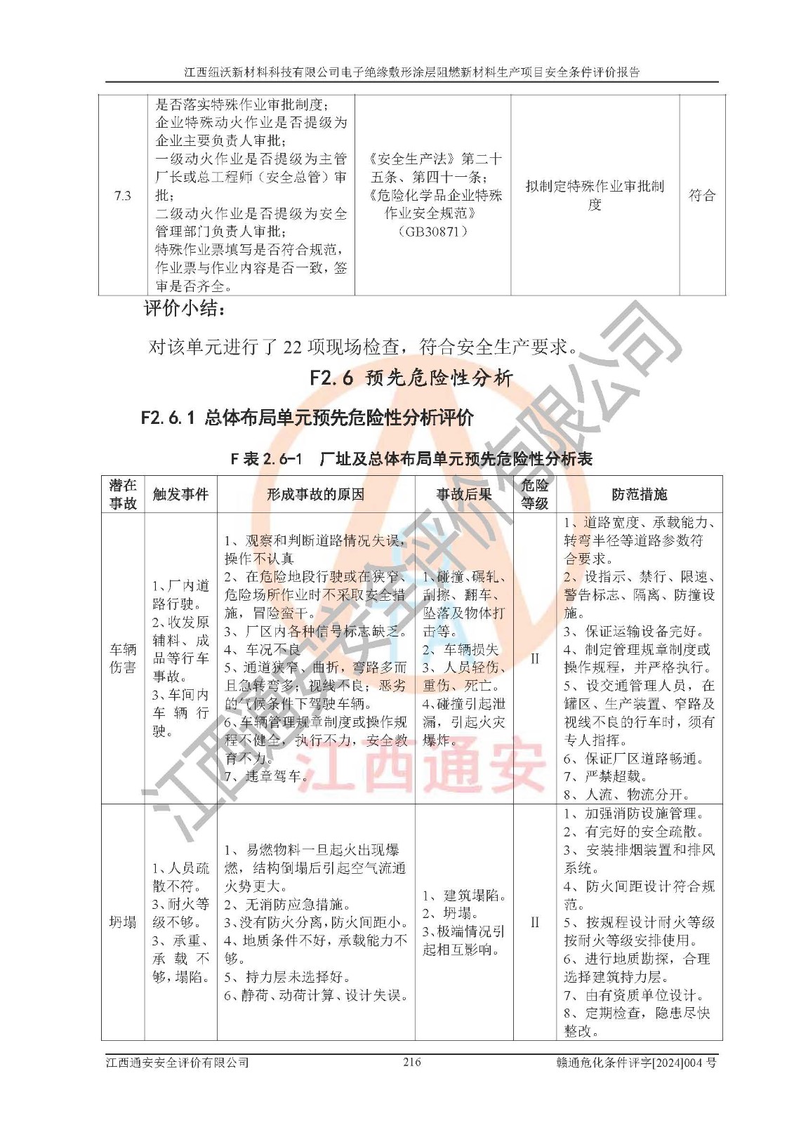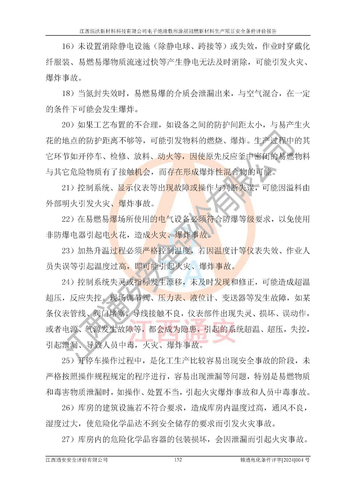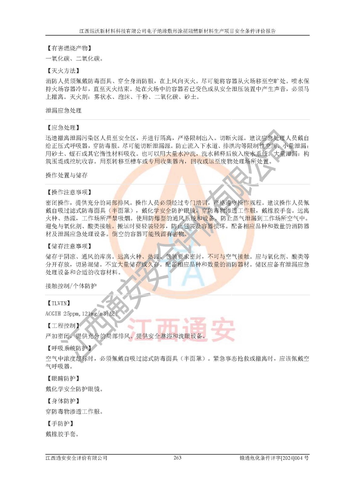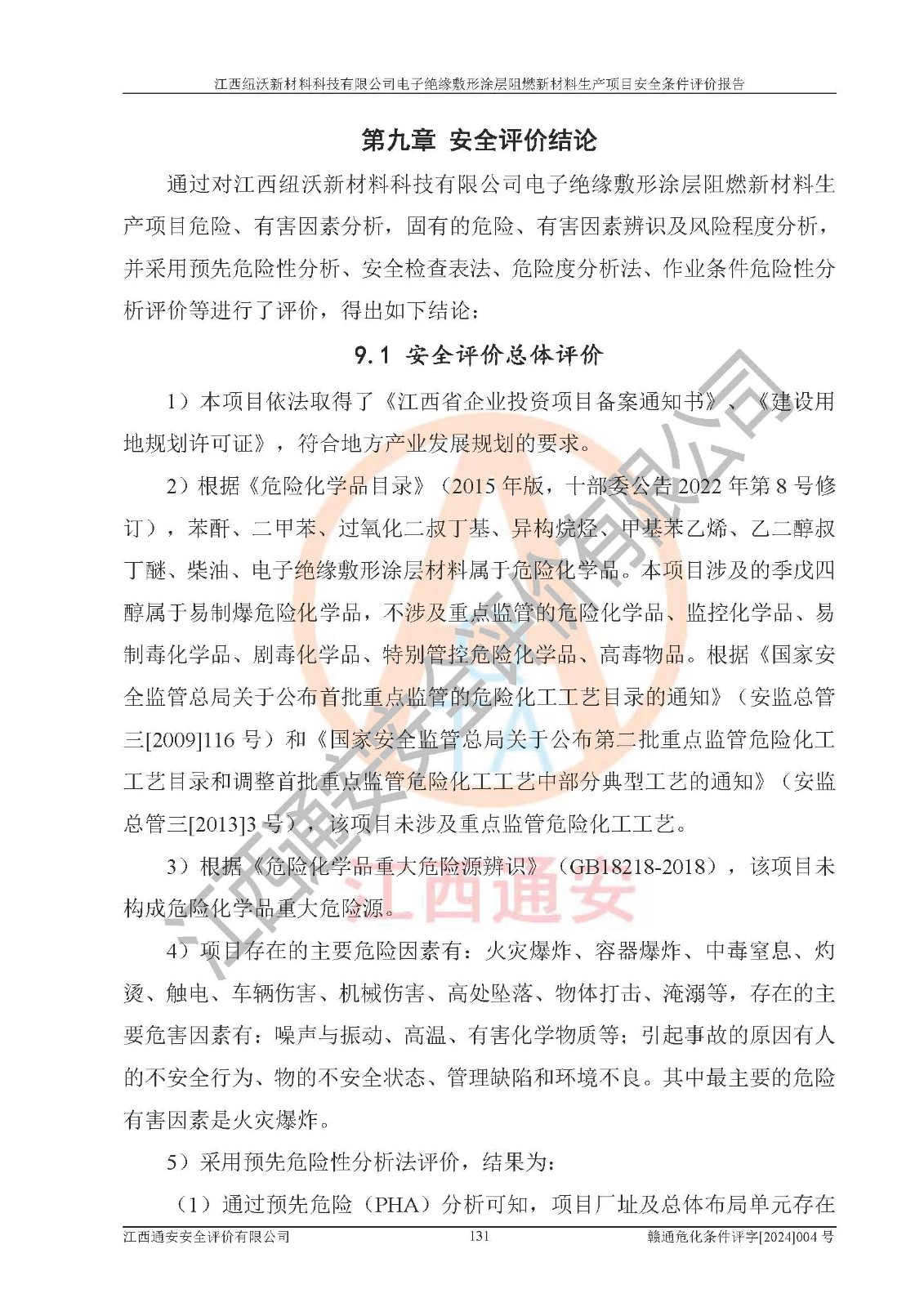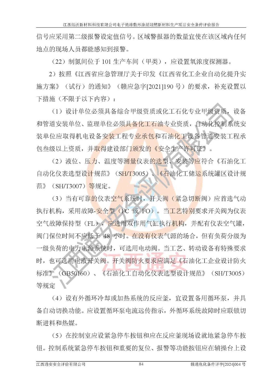 1)本項(xiàng)目依法取得了《江西省企業(yè)投資項(xiàng)目備案通知書》、《建設(shè)用地規(guī)劃許可證》,符合地方產(chǎn)業(yè)發(fā)展規(guī)劃的要求。 2)根據(jù)《**安全監(jiān)管總局關(guān)于公布首批重點(diǎn)監(jiān)管的危險(xiǎn)化工工藝目錄的通知》(安監(jiān)總管三[2009]116號(hào))和《**安全監(jiān)管總局關(guān)于公布第二批重點(diǎn)監(jiān)管危險(xiǎn)化工工藝目錄和調(diào)整首批重點(diǎn)監(jiān)管危險(xiǎn)化工工藝中部分典型工藝的通知》(安監(jiān)總管三[2013]3號(hào)),該項(xiàng)目未涉及重點(diǎn)監(jiān)管危險(xiǎn)化工工藝。 3)根據(jù)《危險(xiǎn)化學(xué)品重大危險(xiǎn)源辨識(shí)》(GB18218-2018),該項(xiàng)目未構(gòu)成危險(xiǎn)化學(xué)品重大危險(xiǎn)源。 4)項(xiàng)目存在的主要危險(xiǎn)因素有:火災(zāi)爆炸、容器爆炸、中毒窒息、灼燙、觸電、**傷害、機(jī)械傷害、高處墜落、物體打擊、淹溺等,存在的主要危害因素有:噪聲與振動(dòng)、高溫、有害化學(xué)物質(zhì)等;引起事故的原因有人的不安全行為、物的不安全狀態(tài)、管理缺陷和環(huán)境不良。其中*主要的危險(xiǎn)有害因素是火災(zāi)爆炸。 5)采用預(yù)先危險(xiǎn)性分析法評(píng)價(jià),結(jié)果為: (1)通過預(yù)先危險(xiǎn)(PHA)分析可知,項(xiàng)目廠址及總體布局單元存在周邊環(huán)境相互影響,發(fā)生異常情況,可對(duì)周邊企業(yè)生產(chǎn)經(jīng)營活動(dòng)、人員活動(dòng)產(chǎn)生影響;存在自然條件影響,可因雷擊、暴雨等引起事故;存在**傷害、建筑物危害,其固有的危險(xiǎn)性等級(jí)為Ⅱ級(jí),屬于“臨界的”,應(yīng)予以排除、采取控制措施因素。 (2)生產(chǎn)作業(yè)存在的危險(xiǎn)因素包括火災(zāi)爆炸、觸電、灼燙、中毒窒息固有的危險(xiǎn)等級(jí)為Ⅲ級(jí),屬于“危險(xiǎn)的”,可能導(dǎo)致人員傷亡和系統(tǒng)損壞的因素,需要采取防范和對(duì)策措施的因素;其它危險(xiǎn)因素固有的危險(xiǎn)等級(jí)為Ⅱ級(jí),屬于“臨界的”,應(yīng)予以排除、采取控制措施因素。 (3)生產(chǎn)作業(yè)存在的噪聲、粉塵、高溫、有害化學(xué)物質(zhì)的危險(xiǎn)有害因素等級(jí)為Ⅱ級(jí),屬于“臨界的”,應(yīng)予以排除、采取控制措施因素。 6)危險(xiǎn)度評(píng)價(jià)分析,結(jié)果為: 生產(chǎn)裝置危險(xiǎn)度評(píng)價(jià)分析:101生產(chǎn)車間為**危險(xiǎn)(Ⅰ級(jí))。 儲(chǔ)存單元危險(xiǎn)度評(píng)價(jià)分析:202甲類倉庫為**危險(xiǎn)(Ⅰ級(jí)),201丙類倉庫為低度危險(xiǎn)(Ⅲ級(jí))。 7)作業(yè)條件危險(xiǎn)性評(píng)價(jià)結(jié)果:在選定的評(píng)價(jià)單元中,其危險(xiǎn)分值均在70以下,危險(xiǎn)程度基本屬于“可能危險(xiǎn)”、“稍有危險(xiǎn)”范圍,作業(yè)條件相對(duì)安全。企業(yè)經(jīng)營過程中首先應(yīng)重點(diǎn)加強(qiáng)對(duì)甲類車間、甲類倉庫的危險(xiǎn)因素的嚴(yán)格控制,注重日常安全管理;其次要建立健全完善的安全生產(chǎn)責(zé)任制、安全管理制度、安全技術(shù)操作規(guī)程并**其貫徹落實(shí);第三要認(rèn)真抓好操作人員、管理人員的安全知識(shí)和操作技能的培訓(xùn),**人員具有與工程技術(shù)水平相適應(yīng)的技術(shù)素質(zhì)和安全素質(zhì),**安全作業(yè)。 8)項(xiàng)目建設(shè)場(chǎng)地符合當(dāng)?shù)匾?guī)劃要求,建設(shè)場(chǎng)地通過合理規(guī)劃,其選址、周邊環(huán)境、總平面布置、交通運(yùn)輸?shù)饶芊稀吨腥A人民共和國安全生產(chǎn)法》、《危險(xiǎn)化學(xué)品安全管理?xiàng)l例》、《建筑設(shè)計(jì)防火規(guī)范》、《精細(xì)化工企業(yè)工程設(shè)計(jì)防火標(biāo)準(zhǔn)》等法規(guī)、標(biāo)準(zhǔn)、規(guī)范要求。 廠址地區(qū)地震活動(dòng)相對(duì)較弱,災(zāi)害性天氣出現(xiàn)頻率稍高,自然災(zāi)害對(duì)項(xiàng)目建設(shè)具有**影響,通過采取相應(yīng)的防護(hù)措施,自然條件適宜建設(shè)。 9)建設(shè)項(xiàng)目符合**產(chǎn)業(yè)政策的要求;選擇工藝為現(xiàn)行成熟工藝,其安全可靠性可得到**。 10)本報(bào)告已根據(jù)有關(guān)安全生產(chǎn)法律、法規(guī)、規(guī)章和**標(biāo)準(zhǔn)、行業(yè)標(biāo)準(zhǔn),并嚴(yán)格執(zhí)行省委辦公廳省**辦公廳《關(guān)于全面加強(qiáng)危險(xiǎn)化學(xué)品安全生產(chǎn)工作的實(shí)施意見》(贛辦發(fā)[2020]32號(hào))及鄱陽湖生態(tài)經(jīng)濟(jì)區(qū)、長(zhǎng)江經(jīng)濟(jì)帶、“五河一湖”相關(guān)政策規(guī)定,客觀、公正、科學(xué)地進(jìn)行安全評(píng)價(jià),項(xiàng)目符合《江西省應(yīng)急管理廳關(guān)于印發(fā)《江西省危險(xiǎn)化學(xué)品建設(shè)項(xiàng)目安全監(jiān)督管理實(shí)施細(xì)則》(試行)的通知》(贛應(yīng)急字[2021]100號(hào))的要求。 11)本報(bào)告結(jié)合工藝特征,提出應(yīng)采取的對(duì)應(yīng)的自動(dòng)化控制系統(tǒng)及自動(dòng)化實(shí)施方案,滿足《江西省應(yīng)急管理廳關(guān)于印發(fā)《江西省化工企業(yè)自動(dòng)化提升實(shí)施方案》(試行)的通知》(贛應(yīng)急字[2021]190號(hào))的要求。 綜上所述:江西紐沃新材料科技有限公司電