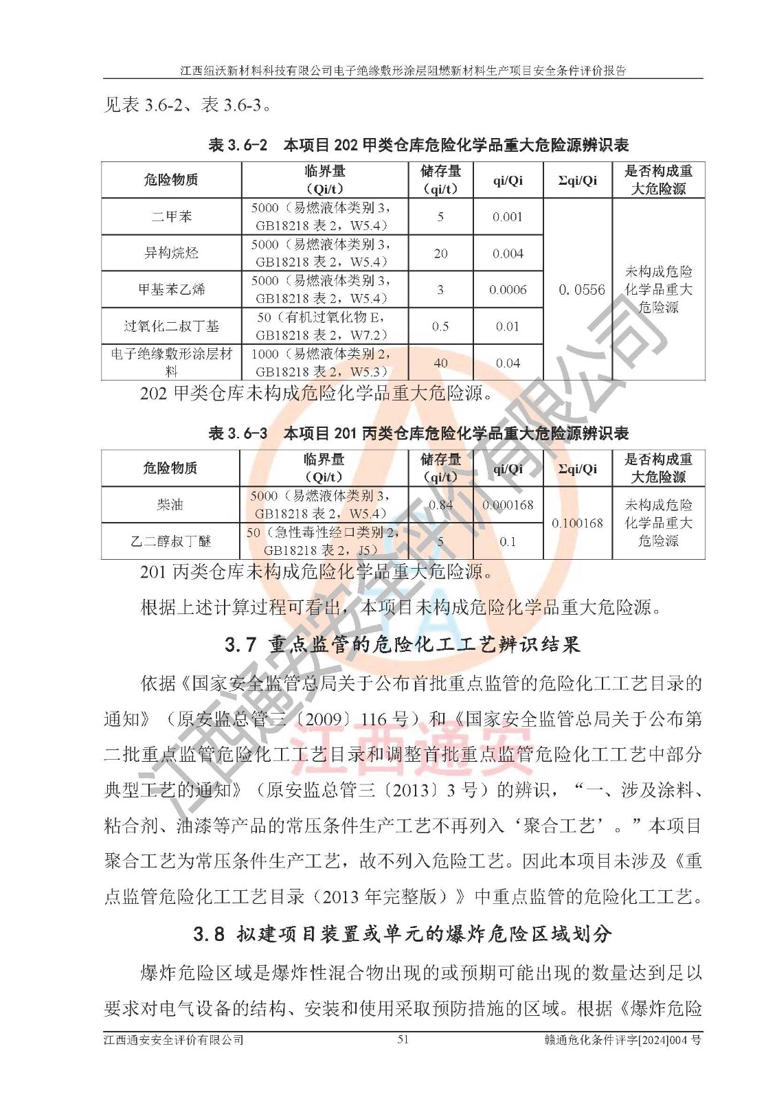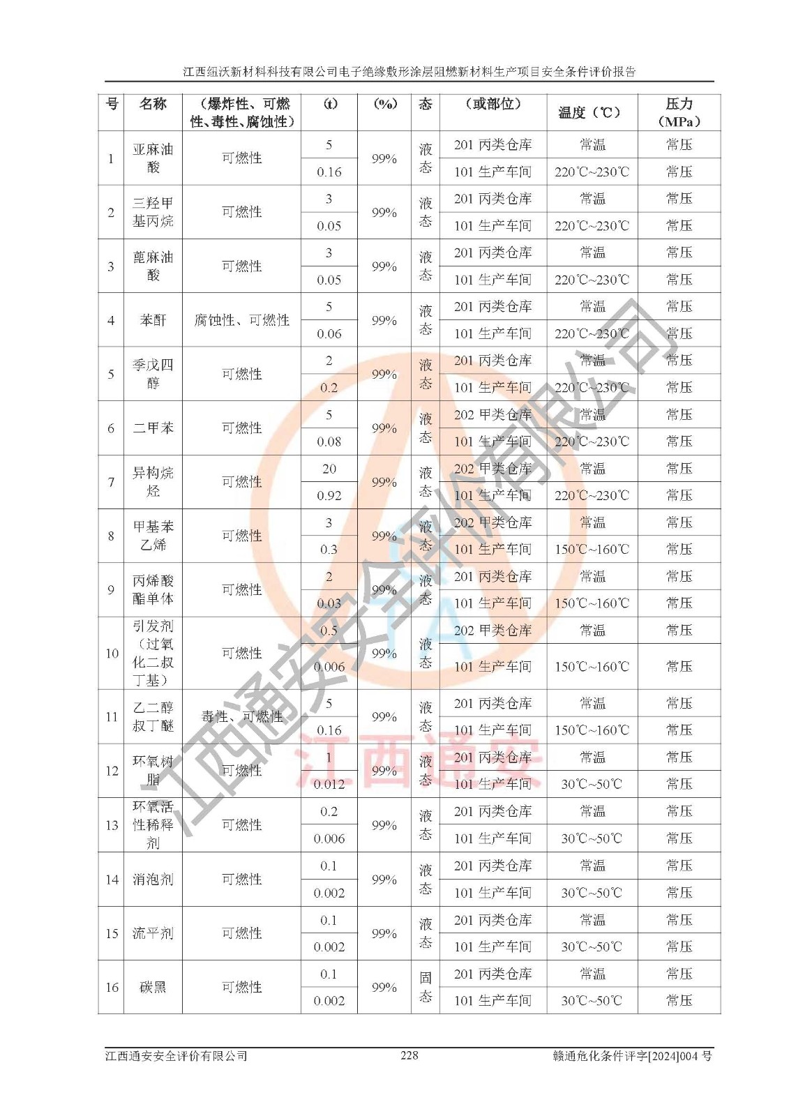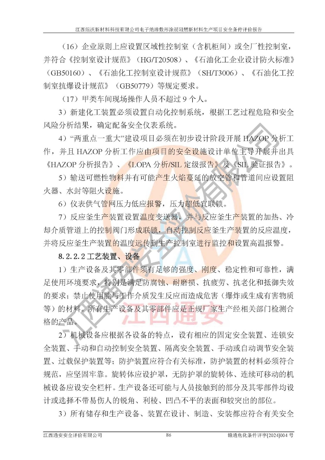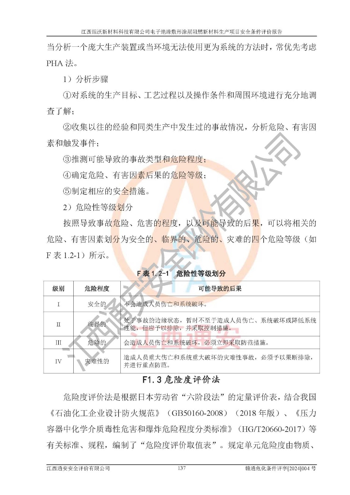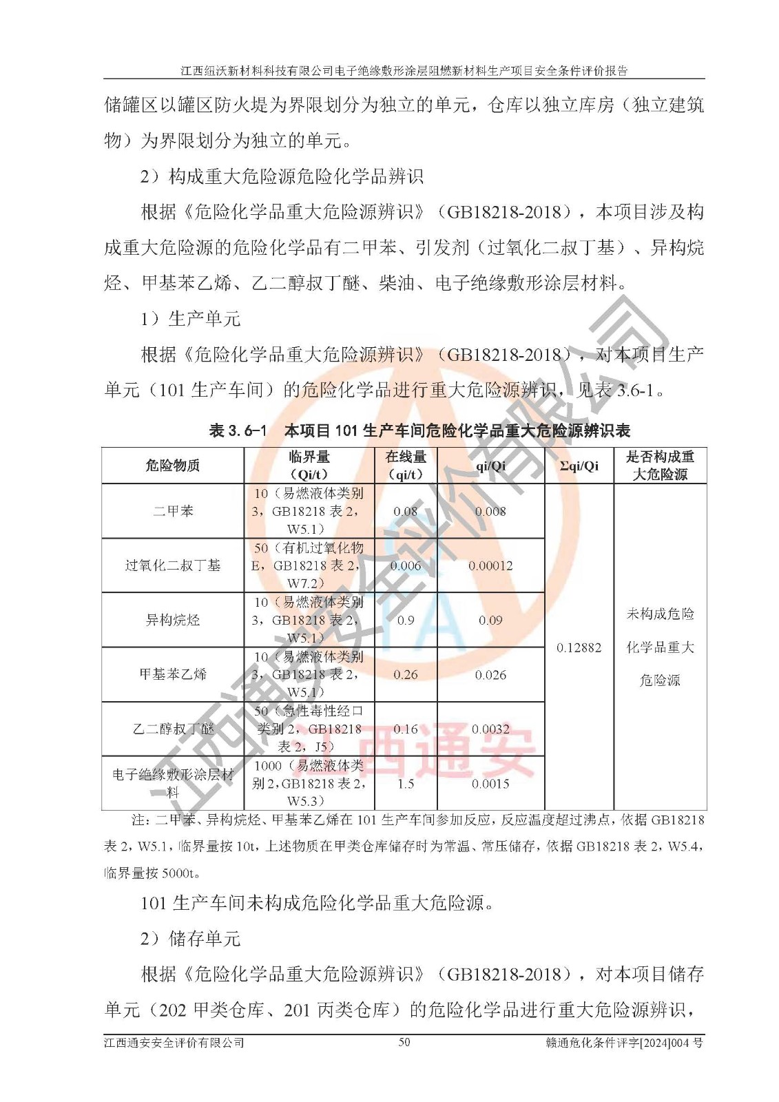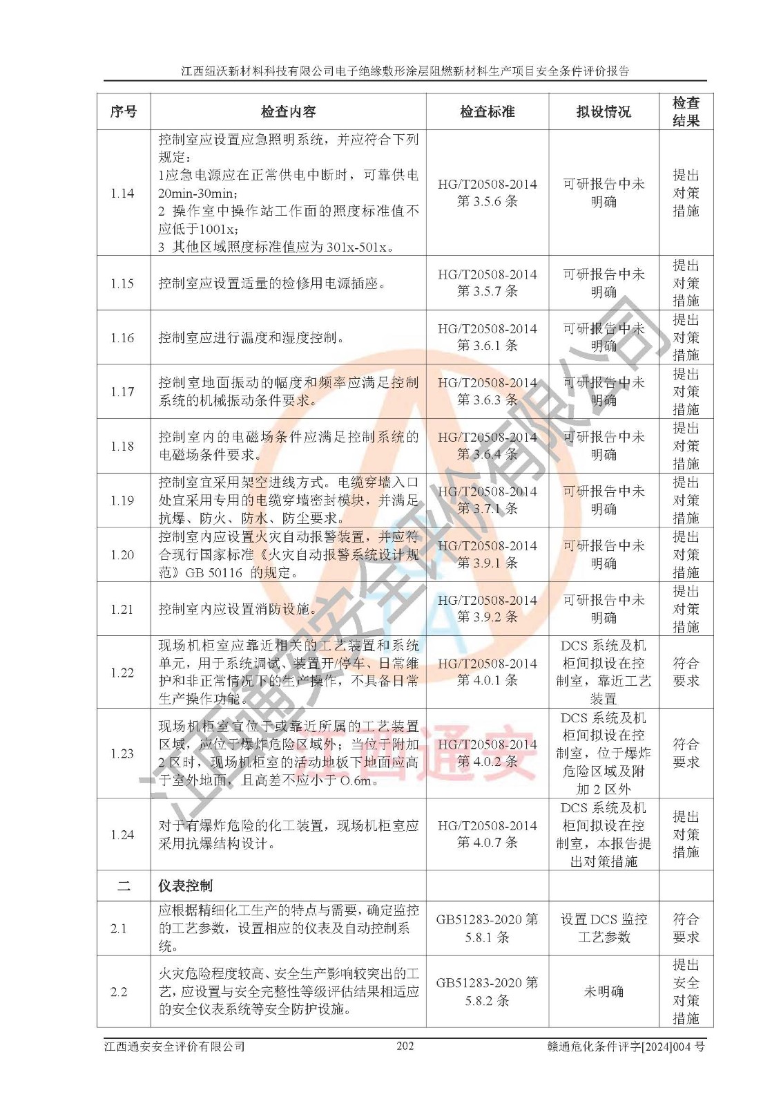 1)本項(xiàng)目依法取得了《江西省企業(yè)投資項(xiàng)目備案通知書》、《建設(shè)用地規(guī)劃許可證》,符合地方產(chǎn)業(yè)發(fā)展規(guī)劃的要求。 2)根據(jù)《**安全監(jiān)管總局關(guān)于公布首批重點(diǎn)監(jiān)管的危險(xiǎn)化工工藝目錄的通知》(安監(jiān)總管三[2009]116號(hào))和《**安全監(jiān)管總局關(guān)于公布第二批重點(diǎn)監(jiān)管危險(xiǎn)化工工藝目錄和調(diào)整首批重點(diǎn)監(jiān)管危險(xiǎn)化工工藝中部分典型工藝的通知》(安監(jiān)總管三[2013]3號(hào)),該項(xiàng)目未涉及重點(diǎn)監(jiān)管危險(xiǎn)化工工藝。 3)根據(jù)《危險(xiǎn)化學(xué)品重大危險(xiǎn)源辨識(shí)》(GB18218-2018),該項(xiàng)目未構(gòu)成危險(xiǎn)化學(xué)品重大危險(xiǎn)源。 4)項(xiàng)目存在的主要危險(xiǎn)因素有:火災(zāi)爆炸、容器爆炸、中毒窒息、灼燙、觸電、**傷害、機(jī)械傷害、高處墜落、物體打擊、淹溺等,存在的主要危害因素有:噪聲與振動(dòng)、高溫、有害化學(xué)物質(zhì)等;引起事故的原因有人的不安全行為、物的不安全狀態(tài)、管理缺陷和環(huán)境不良。其中*主要的危險(xiǎn)有害因素是火災(zāi)爆炸。 5)采用預(yù)先危險(xiǎn)性分析法評(píng)價(jià),結(jié)果為: (1)通過預(yù)先危險(xiǎn)(PHA)分析可知,項(xiàng)目廠址及總體布局單元存在周邊環(huán)境相互影響,發(fā)生異常情況,可對(duì)周邊企業(yè)生產(chǎn)經(jīng)營活動(dòng)、人員活動(dòng)產(chǎn)生影響;存在自然條件影響,可因雷擊、暴雨等引起事故;存在**傷害、建筑物危害,其固有的危險(xiǎn)性等級(jí)為Ⅱ級(jí),屬于“臨界的”,應(yīng)予以排除、采取控制措施因素。 (2)生產(chǎn)作業(yè)存在的危險(xiǎn)因素包括火災(zāi)爆炸、觸電、灼燙、中毒窒息固有的危險(xiǎn)等級(jí)為Ⅲ級(jí),屬于“危險(xiǎn)的”,可能導(dǎo)致人員傷亡和系統(tǒng)損壞的因素,需要采取防范和對(duì)策措施的因素;其它危險(xiǎn)因素固有的危險(xiǎn)等級(jí)為Ⅱ級(jí),屬于“臨界的”,應(yīng)予以排除、采取控制措施因素。 (3)生產(chǎn)作業(yè)存在的噪聲、粉塵、高溫、有害化學(xué)物質(zhì)的危險(xiǎn)有害因素等級(jí)為Ⅱ級(jí),屬于“臨界的”,應(yīng)予以排除、采取控制措施因素。 6)危險(xiǎn)度評(píng)價(jià)分析,結(jié)果為: 生產(chǎn)裝置危險(xiǎn)度評(píng)價(jià)分析:101生產(chǎn)車間為**危險(xiǎn)(Ⅰ級(jí))。 儲(chǔ)存單元危險(xiǎn)度評(píng)價(jià)分析:202甲類倉庫為**危險(xiǎn)(Ⅰ級(jí)),201丙類倉庫為低度危險(xiǎn)(Ⅲ級(jí))。 7)作業(yè)條件危險(xiǎn)性評(píng)價(jià)結(jié)果:在選定的評(píng)價(jià)單元中,其危險(xiǎn)分值均在70以下,危險(xiǎn)程度基本屬于“可能危險(xiǎn)”、“稍有危險(xiǎn)”范圍,作業(yè)條件相對(duì)安全。企業(yè)經(jīng)營過程中首先應(yīng)重點(diǎn)加強(qiáng)對(duì)甲類車間、甲類倉庫的危險(xiǎn)因素的嚴(yán)格控制,注重日常安全管理;其次要建立健全完善的安全生產(chǎn)責(zé)任制、安全管理制度、安全技術(shù)操作規(guī)程并**其貫徹落實(shí);第三要認(rèn)真抓好操作人員、管理人員的安全知識(shí)和操作技能的培訓(xùn),**人員具有與工程技術(shù)水平相適應(yīng)的技術(shù)素質(zhì)和安全素質(zhì),**安全作業(yè)。 8)項(xiàng)目建設(shè)場(chǎng)地符合當(dāng)?shù)匾?guī)劃要求,建設(shè)場(chǎng)地通過合理規(guī)劃,其選址、周邊環(huán)境、總平面布置、交通運(yùn)輸?shù)饶芊稀吨腥A人民共和國安全生產(chǎn)法》、《危險(xiǎn)化學(xué)品安全管理?xiàng)l例》、《建筑設(shè)計(jì)防火規(guī)范》、《精細(xì)化工企業(yè)工程設(shè)計(jì)防火標(biāo)準(zhǔn)》等法規(guī)、標(biāo)準(zhǔn)、規(guī)范要求。 廠址地區(qū)地震活動(dòng)相對(duì)較弱,災(zāi)害性天氣出現(xiàn)頻率稍高,自然災(zāi)害對(duì)項(xiàng)目建設(shè)具有**影響,通過采取相應(yīng)的防護(hù)措施,自然條件適宜建設(shè)。 9)建設(shè)項(xiàng)目符合**產(chǎn)業(yè)政策的要求;選擇工藝為現(xiàn)行成熟工藝,其安全可靠性可得到**。 10)本報(bào)告已根據(jù)有關(guān)安全生產(chǎn)法律、法規(guī)、規(guī)章和**標(biāo)準(zhǔn)、行業(yè)標(biāo)準(zhǔn),并嚴(yán)格執(zhí)行省委辦公廳省**辦公廳《關(guān)于全面加強(qiáng)危險(xiǎn)化學(xué)品安全生產(chǎn)工作的實(shí)施意見》(贛辦發(fā)[2020]32號(hào))及鄱陽湖生態(tài)經(jīng)濟(jì)區(qū)、長(zhǎng)江經(jīng)濟(jì)帶、“五河一湖”相關(guān)政策規(guī)定,客觀、公正、科學(xué)地進(jìn)行安全評(píng)價(jià),項(xiàng)目符合《江西省應(yīng)急管理廳關(guān)于印發(fā)《江西省危險(xiǎn)化學(xué)品建設(shè)項(xiàng)目安全監(jiān)督管理實(shí)施細(xì)則》(試行)的通知》(贛應(yīng)急字[2021]100號(hào))的要求。 11)本報(bào)告結(jié)合工藝特征,提出應(yīng)采取的對(duì)應(yīng)的自動(dòng)化控制系統(tǒng)及自動(dòng)化實(shí)施方案,滿足《江西省應(yīng)急管理廳關(guān)于印發(fā)《江西省化工企業(yè)自動(dòng)化提升實(shí)施方案》(試行)的通知》(贛應(yīng)急字[2021]190號(hào))的要求。 綜上所述:江西紐沃新材料科技有限公司電
