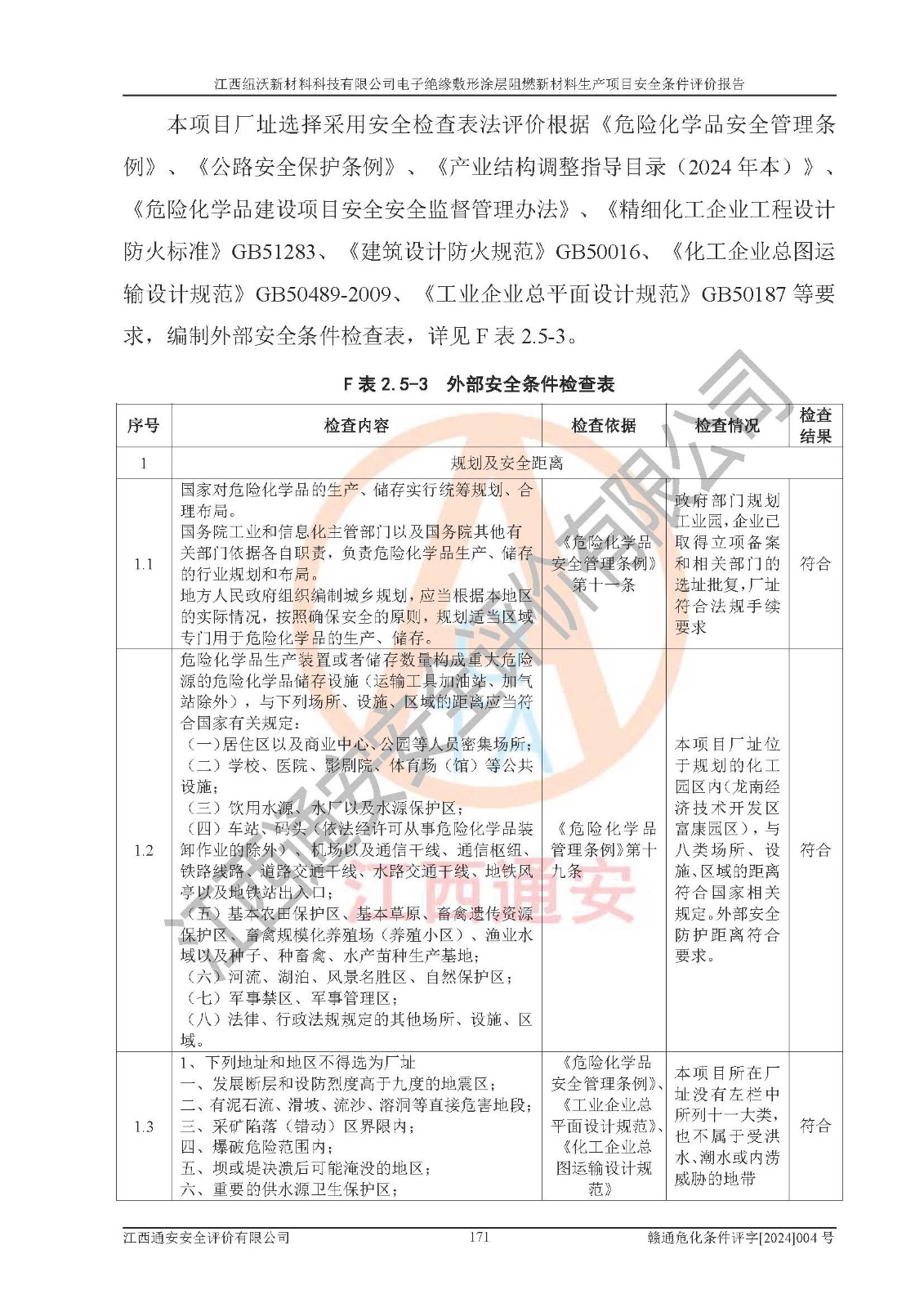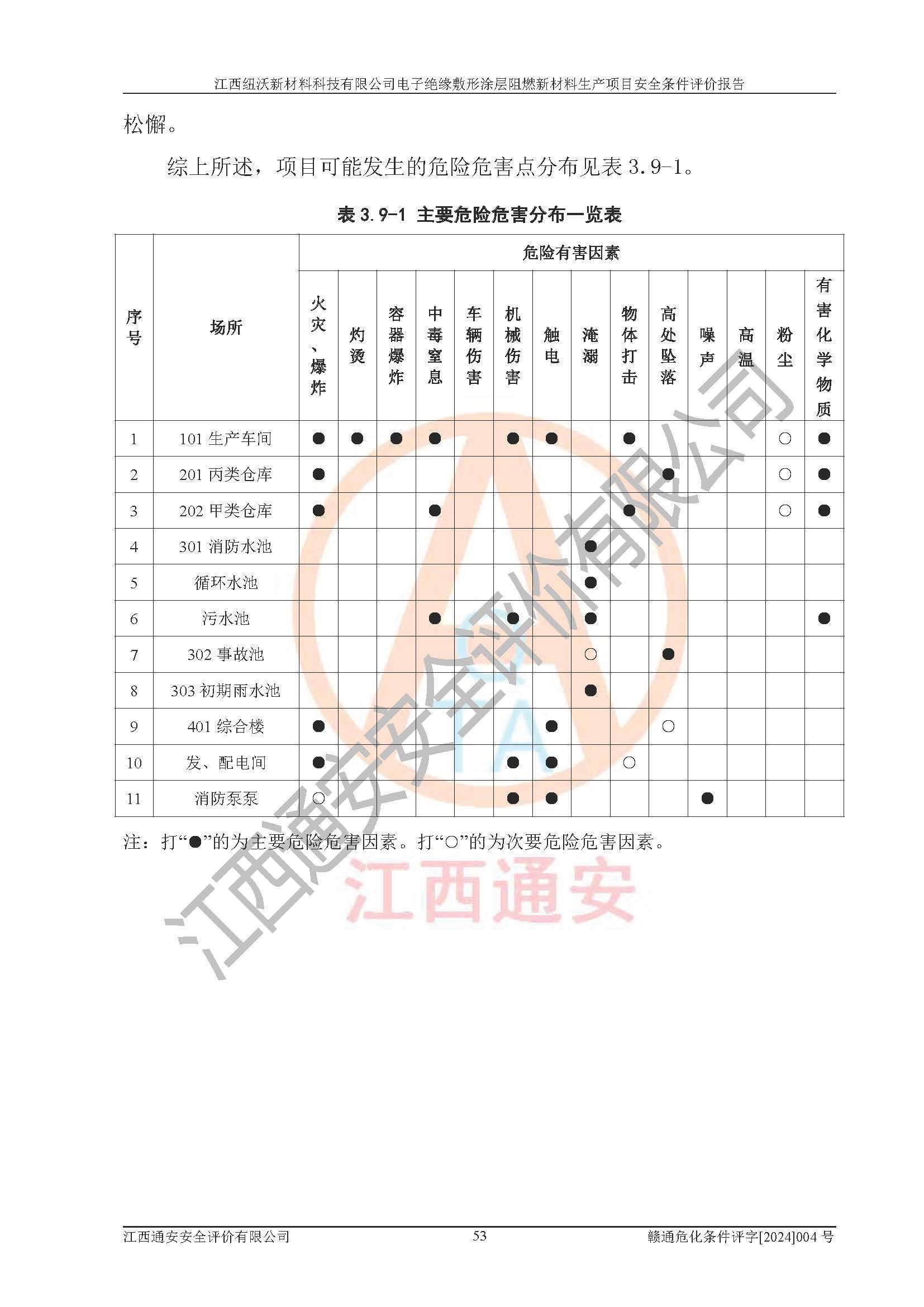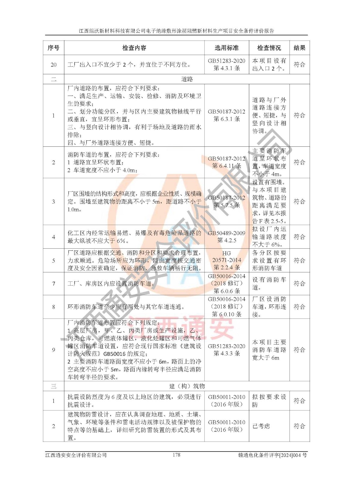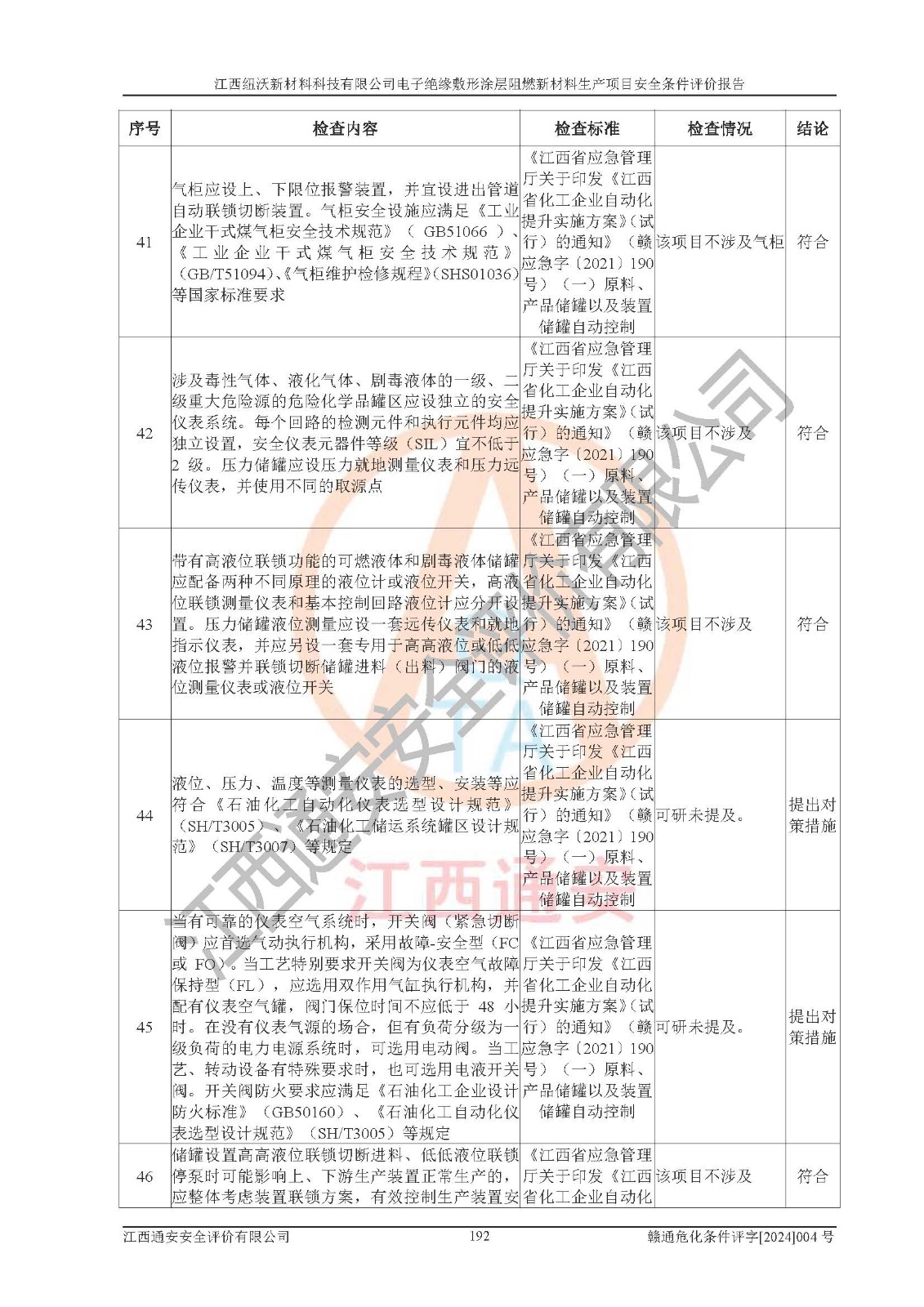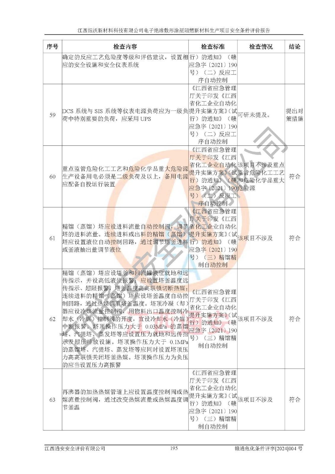 1)本項(xiàng)目依法取得了《江西省企業(yè)投資項(xiàng)目備案通知書》、《建設(shè)用地規(guī)劃許可證》,符合地方產(chǎn)業(yè)發(fā)展規(guī)劃的要求。 2)根據(jù)《**安全監(jiān)管總局關(guān)于公布首批重點(diǎn)監(jiān)管的危險(xiǎn)化工工藝目錄的通知》(安監(jiān)總管三[2009]116號(hào))和《**安全監(jiān)管總局關(guān)于公布第二批重點(diǎn)監(jiān)管危險(xiǎn)化工工藝目錄和調(diào)整首批重點(diǎn)監(jiān)管危險(xiǎn)化工工藝中部分典型工藝的通知》(安監(jiān)總管三[2013]3號(hào)),該項(xiàng)目未涉及重點(diǎn)監(jiān)管危險(xiǎn)化工工藝。 3)根據(jù)《危險(xiǎn)化學(xué)品重大危險(xiǎn)源辨識(shí)》(GB18218-2018),該項(xiàng)目未構(gòu)成危險(xiǎn)化學(xué)品重大危險(xiǎn)源。 4)項(xiàng)目存在的主要危險(xiǎn)因素有:火災(zāi)爆炸、容器爆炸、中毒窒息、灼燙、觸電、**傷害、機(jī)械傷害、高處墜落、物體打擊、淹溺等,存在的主要危害因素有:噪聲與振動(dòng)、高溫、有害化學(xué)物質(zhì)等;引起事故的原因有人的不安全行為、物的不安全狀態(tài)、管理缺陷和環(huán)境不良。其中*主要的危險(xiǎn)有害因素是火災(zāi)爆炸。 5)采用預(yù)先危險(xiǎn)性分析法評(píng)價(jià),結(jié)果為: (1)通過預(yù)先危險(xiǎn)(PHA)分析可知,項(xiàng)目廠址及總體布局單元存在周邊環(huán)境相互影響,發(fā)生異常情況,可對(duì)周邊企業(yè)生產(chǎn)經(jīng)營活動(dòng)、人員活動(dòng)產(chǎn)生影響;存在自然條件影響,可因雷擊、暴雨等引起事故;存在**傷害、建筑物危害,其固有的危險(xiǎn)性等級(jí)為Ⅱ級(jí),屬于“臨界的”,應(yīng)予以排除、采取控制措施因素。 (2)生產(chǎn)作業(yè)存在的危險(xiǎn)因素包括火災(zāi)爆炸、觸電、灼燙、中毒窒息固有的危險(xiǎn)等級(jí)為Ⅲ級(jí),屬于“危險(xiǎn)的”,可能導(dǎo)致人員傷亡和系統(tǒng)損壞的因素,需要采取防范和對(duì)策措施的因素;其它危險(xiǎn)因素固有的危險(xiǎn)等級(jí)為Ⅱ級(jí),屬于“臨界的”,應(yīng)予以排除、采取控制措施因素。 (3)生產(chǎn)作業(yè)存在的噪聲、粉塵、高溫、有害化學(xué)物質(zhì)的危險(xiǎn)有害因素等級(jí)為Ⅱ級(jí),屬于“臨界的”,應(yīng)予以排除、采取控制措施因素。 6)危險(xiǎn)度評(píng)價(jià)分析,結(jié)果為: 生產(chǎn)裝置危險(xiǎn)度評(píng)價(jià)分析:101生產(chǎn)車間為**危險(xiǎn)(Ⅰ級(jí))。 儲(chǔ)存單元危險(xiǎn)度評(píng)價(jià)分析:202甲類倉庫為**危險(xiǎn)(Ⅰ級(jí)),201丙類倉庫為低度危險(xiǎn)(Ⅲ級(jí))。 7)作業(yè)條件危險(xiǎn)性評(píng)價(jià)結(jié)果:在選定的評(píng)價(jià)單元中,其危險(xiǎn)分值均在70以下,危險(xiǎn)程度基本屬于“可能危險(xiǎn)”、“稍有危險(xiǎn)”范圍,作業(yè)條件相對(duì)安全。企業(yè)經(jīng)營過程中首先應(yīng)重點(diǎn)加強(qiáng)對(duì)甲類車間、甲類倉庫的危險(xiǎn)因素的嚴(yán)格控制,注重日常安全管理;其次要建立健全完善的安全生產(chǎn)責(zé)任制、安全管理制度、安全技術(shù)操作規(guī)程并**其貫徹落實(shí);第三要認(rèn)真抓好操作人員、管理人員的安全知識(shí)和操作技能的培訓(xùn),**人員具有與工程技術(shù)水平相適應(yīng)的技術(shù)素質(zhì)和安全素質(zhì),**安全作業(yè)。 8)項(xiàng)目建設(shè)場(chǎng)地符合當(dāng)?shù)匾?guī)劃要求,建設(shè)場(chǎng)地通過合理規(guī)劃,其選址、周邊環(huán)境、總平面布置、交通運(yùn)輸?shù)饶芊稀吨腥A人民共和國安全生產(chǎn)法》、《危險(xiǎn)化學(xué)品安全管理?xiàng)l例》、《建筑設(shè)計(jì)防火規(guī)范》、《精細(xì)化工企業(yè)工程設(shè)計(jì)防火標(biāo)準(zhǔn)》等法規(guī)、標(biāo)準(zhǔn)、規(guī)范要求。 廠址地區(qū)地震活動(dòng)相對(duì)較弱,災(zāi)害性天氣出現(xiàn)頻率稍高,自然災(zāi)害對(duì)項(xiàng)目建設(shè)具有**影響,通過采取相應(yīng)的防護(hù)措施,自然條件適宜建設(shè)。 9)建設(shè)項(xiàng)目符合**產(chǎn)業(yè)政策的要求;選擇工藝為現(xiàn)行成熟工藝,其安全可靠性可得到**。 10)本報(bào)告已根據(jù)有關(guān)安全生產(chǎn)法律、法規(guī)、規(guī)章和**標(biāo)準(zhǔn)、行業(yè)標(biāo)準(zhǔn),并嚴(yán)格執(zhí)行省委辦公廳省**辦公廳《關(guān)于全面加強(qiáng)危險(xiǎn)化學(xué)品安全生產(chǎn)工作的實(shí)施意見》(贛辦發(fā)[2020]32號(hào))及鄱陽湖生態(tài)經(jīng)濟(jì)區(qū)、長(zhǎng)江經(jīng)濟(jì)帶、“五河一湖”相關(guān)政策規(guī)定,客觀、公正、科學(xué)地進(jìn)行安全評(píng)價(jià),項(xiàng)目符合《江西省應(yīng)急管理廳關(guān)于印發(fā)《江西省危險(xiǎn)化學(xué)品建設(shè)項(xiàng)目安全監(jiān)督管理實(shí)施細(xì)則》(試行)的通知》(贛應(yīng)急字[2021]100號(hào))的要求。 11)本報(bào)告結(jié)合工藝特征,提出應(yīng)采取的對(duì)應(yīng)的自動(dòng)化控制系統(tǒng)及自動(dòng)化實(shí)施方案,滿足《江西省應(yīng)急管理廳關(guān)于印發(fā)《江西省化工企業(yè)自動(dòng)化提升實(shí)施方案》(試行)的通知》(贛應(yīng)急字[2021]190號(hào))的要求。 綜上所述:江西紐沃新材料科技有限公司電