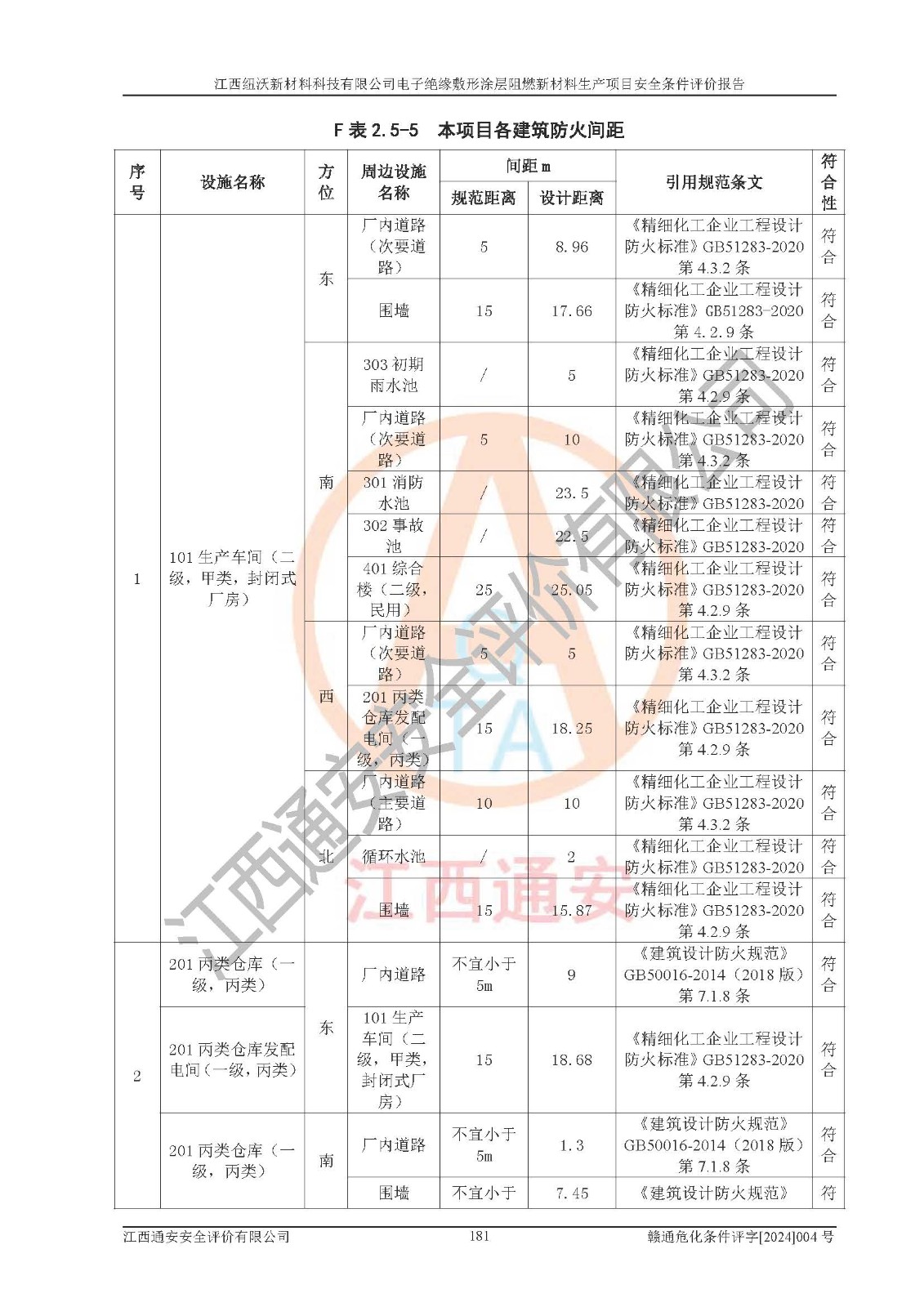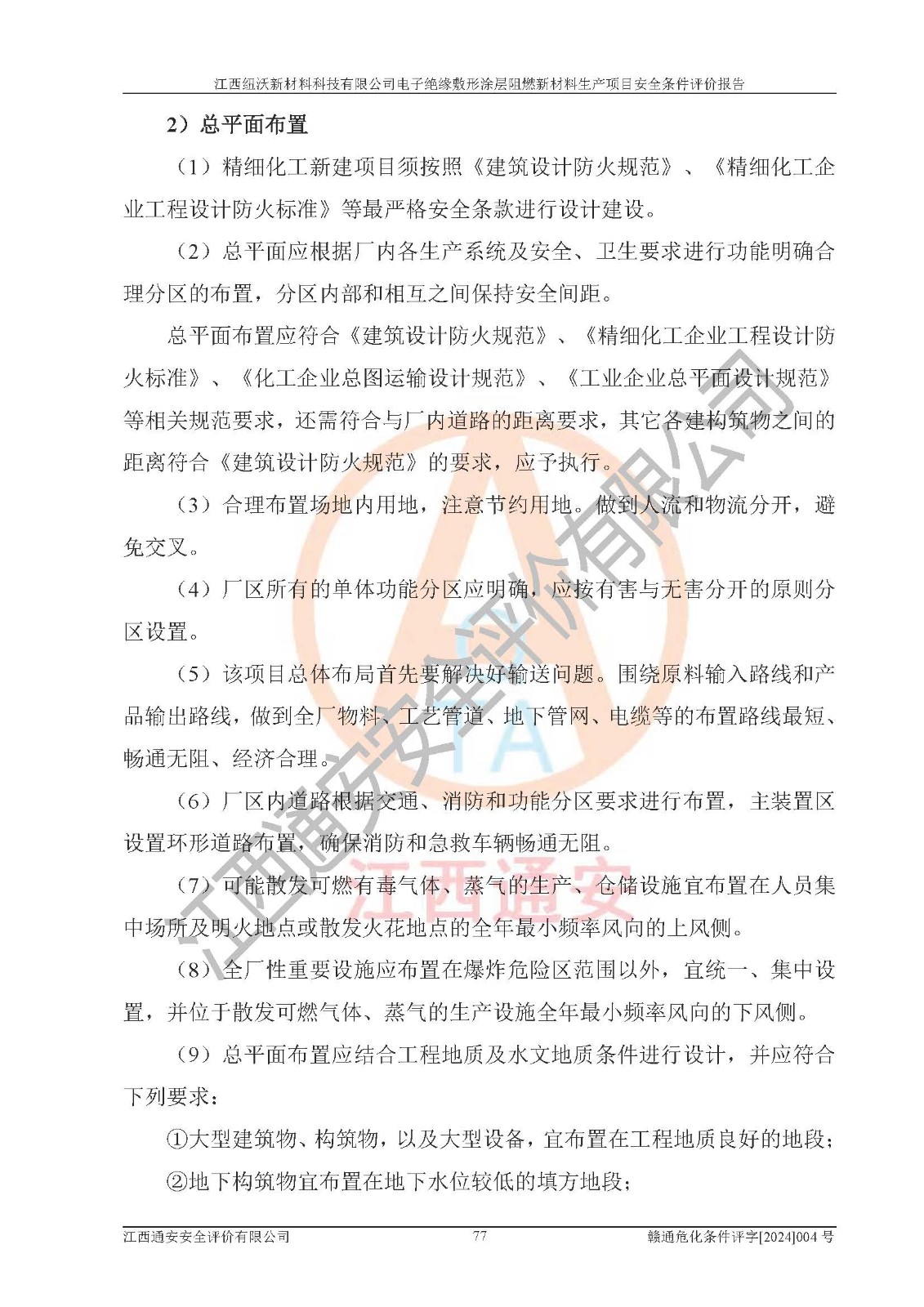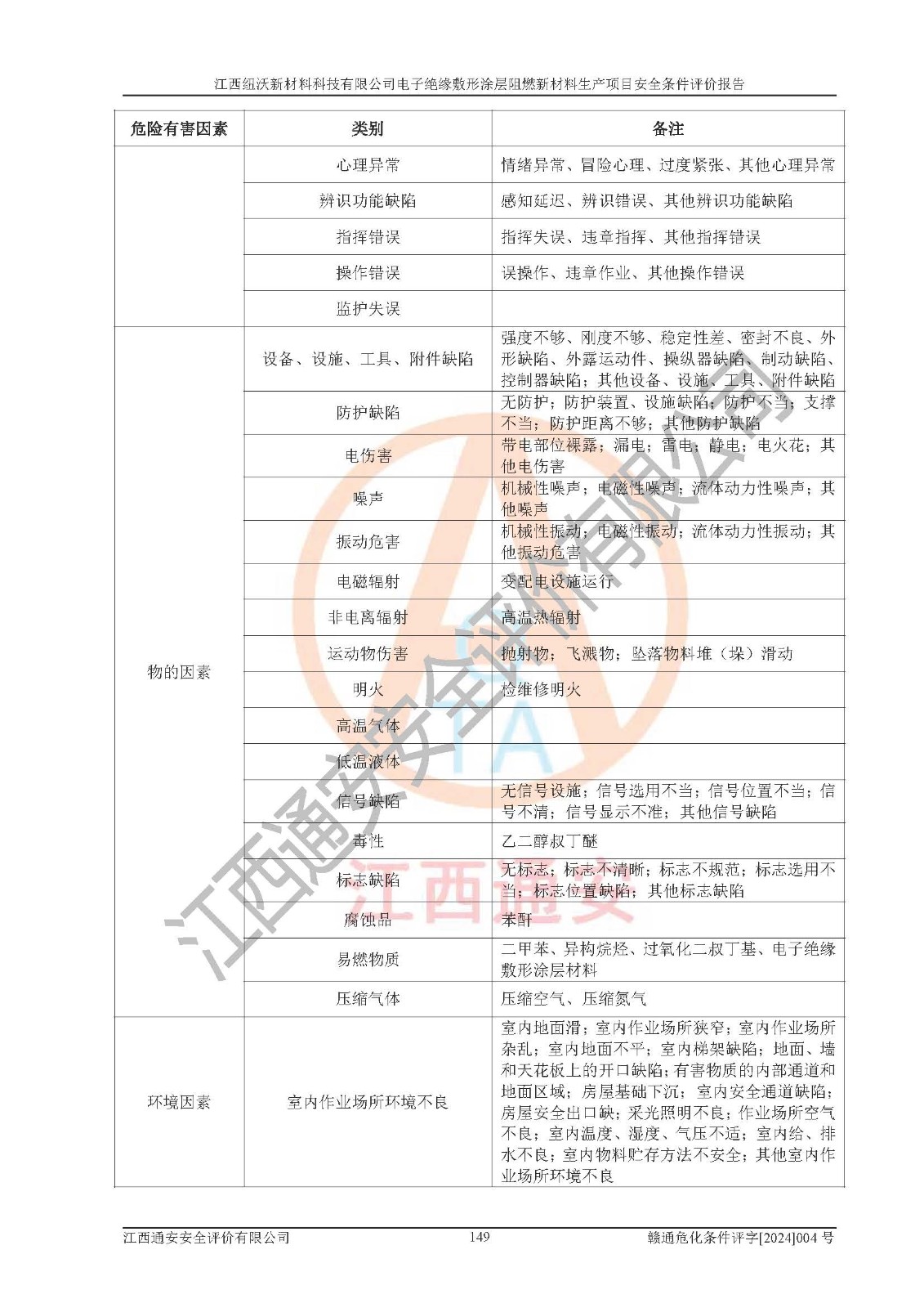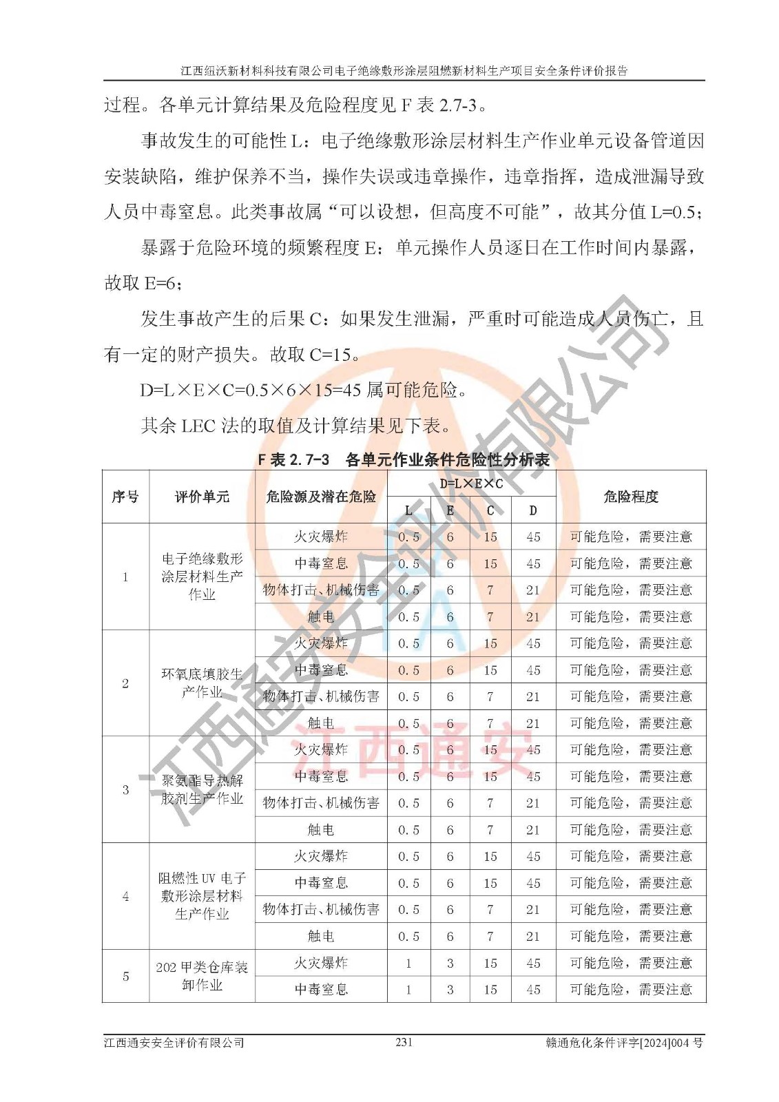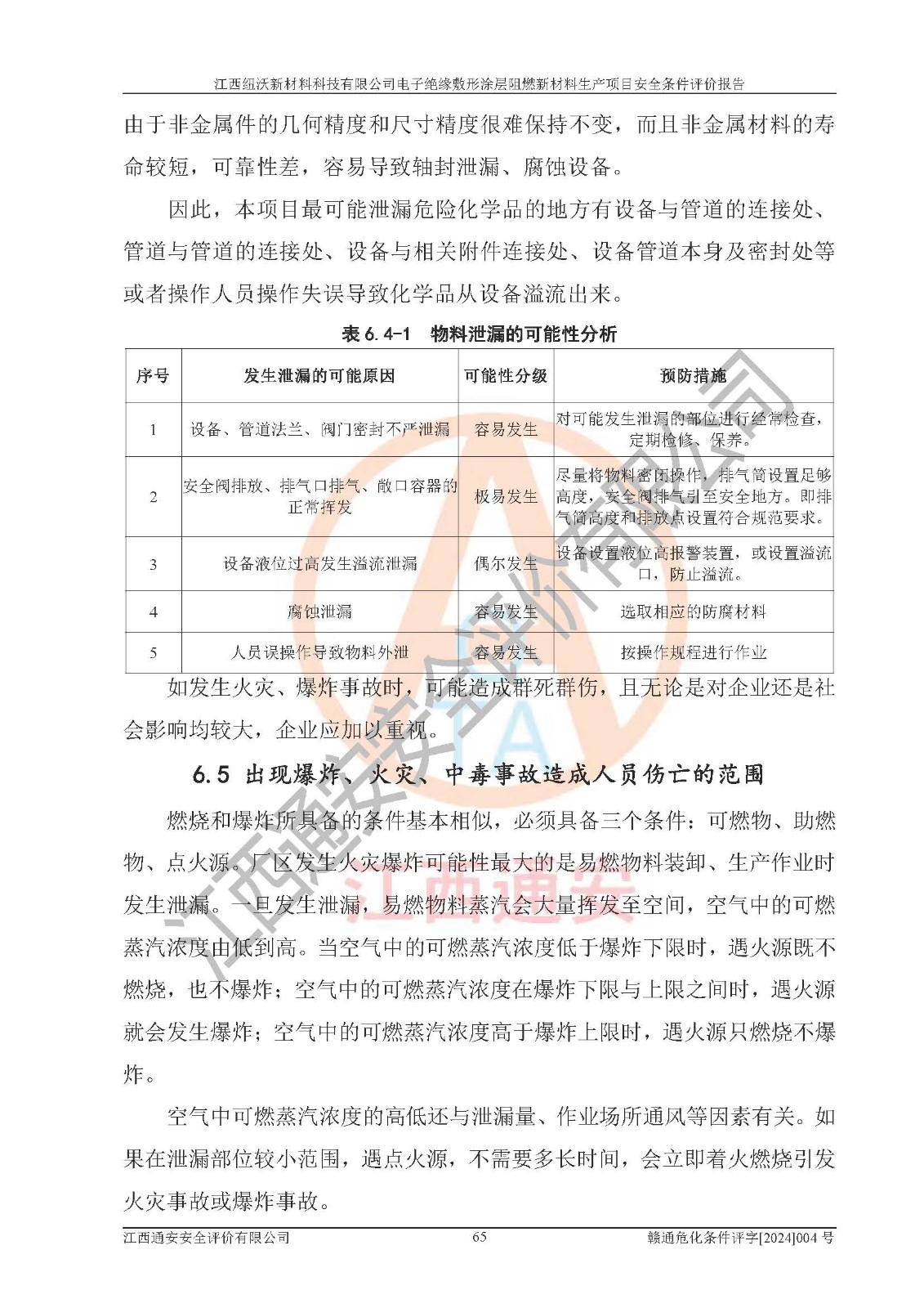 1)本項(xiàng)目依法取得了《江西省企業(yè)投資項(xiàng)目備案通知書》、《建設(shè)用地規(guī)劃許可證》,符合地方產(chǎn)業(yè)發(fā)展規(guī)劃的要求。 2)根據(jù)《**安全監(jiān)管總局關(guān)于公布首批重點(diǎn)監(jiān)管的危險(xiǎn)化工工藝目錄的通知》(安監(jiān)總管三[2009]116號(hào))和《**安全監(jiān)管總局關(guān)于公布第二批重點(diǎn)監(jiān)管危險(xiǎn)化工工藝目錄和調(diào)整首批重點(diǎn)監(jiān)管危險(xiǎn)化工工藝中部分典型工藝的通知》(安監(jiān)總管三[2013]3號(hào)),該項(xiàng)目未涉及重點(diǎn)監(jiān)管危險(xiǎn)化工工藝。 3)根據(jù)《危險(xiǎn)化學(xué)品重大危險(xiǎn)源辨識(shí)》(GB18218-2018),該項(xiàng)目未構(gòu)成危險(xiǎn)化學(xué)品重大危險(xiǎn)源。 4)項(xiàng)目存在的主要危險(xiǎn)因素有:火災(zāi)爆炸、容器爆炸、中毒窒息、灼燙、觸電、**傷害、機(jī)械傷害、高處墜落、物體打擊、淹溺等,存在的主要危害因素有:噪聲與振動(dòng)、高溫、有害化學(xué)物質(zhì)等;引起事故的原因有人的不安全行為、物的不安全狀態(tài)、管理缺陷和環(huán)境不良。其中*主要的危險(xiǎn)有害因素是火災(zāi)爆炸。 5)采用預(yù)先危險(xiǎn)性分析法評(píng)價(jià),結(jié)果為: (1)通過預(yù)先危險(xiǎn)(PHA)分析可知,項(xiàng)目廠址及總體布局單元存在周邊環(huán)境相互影響,發(fā)生異常情況,可對(duì)周邊企業(yè)生產(chǎn)經(jīng)營活動(dòng)、人員活動(dòng)產(chǎn)生影響;存在自然條件影響,可因雷擊、暴雨等引起事故;存在**傷害、建筑物危害,其固有的危險(xiǎn)性等級(jí)為Ⅱ級(jí),屬于“臨界的”,應(yīng)予以排除、采取控制措施因素。 (2)生產(chǎn)作業(yè)存在的危險(xiǎn)因素包括火災(zāi)爆炸、觸電、灼燙、中毒窒息固有的危險(xiǎn)等級(jí)為Ⅲ級(jí),屬于“危險(xiǎn)的”,可能導(dǎo)致人員傷亡和系統(tǒng)損壞的因素,需要采取防范和對(duì)策措施的因素;其它危險(xiǎn)因素固有的危險(xiǎn)等級(jí)為Ⅱ級(jí),屬于“臨界的”,應(yīng)予以排除、采取控制措施因素。 (3)生產(chǎn)作業(yè)存在的噪聲、粉塵、高溫、有害化學(xué)物質(zhì)的危險(xiǎn)有害因素等級(jí)為Ⅱ級(jí),屬于“臨界的”,應(yīng)予以排除、采取控制措施因素。 6)危險(xiǎn)度評(píng)價(jià)分析,結(jié)果為: 生產(chǎn)裝置危險(xiǎn)度評(píng)價(jià)分析:101生產(chǎn)車間為**危險(xiǎn)(Ⅰ級(jí))。 儲(chǔ)存單元危險(xiǎn)度評(píng)價(jià)分析:202甲類倉庫為**危險(xiǎn)(Ⅰ級(jí)),201丙類倉庫為低度危險(xiǎn)(Ⅲ級(jí))。 7)作業(yè)條件危險(xiǎn)性評(píng)價(jià)結(jié)果:在選定的評(píng)價(jià)單元中,其危險(xiǎn)分值均在70以下,危險(xiǎn)程度基本屬于“可能危險(xiǎn)”、“稍有危險(xiǎn)”范圍,作業(yè)條件相對(duì)安全。企業(yè)經(jīng)營過程中首先應(yīng)重點(diǎn)加強(qiáng)對(duì)甲類車間、甲類倉庫的危險(xiǎn)因素的嚴(yán)格控制,注重日常安全管理;其次要建立健全完善的安全生產(chǎn)責(zé)任制、安全管理制度、安全技術(shù)操作規(guī)程并**其貫徹落實(shí);第三要認(rèn)真抓好操作人員、管理人員的安全知識(shí)和操作技能的培訓(xùn),**人員具有與工程技術(shù)水平相適應(yīng)的技術(shù)素質(zhì)和安全素質(zhì),**安全作業(yè)。 8)項(xiàng)目建設(shè)場(chǎng)地符合當(dāng)?shù)匾?guī)劃要求,建設(shè)場(chǎng)地通過合理規(guī)劃,其選址、周邊環(huán)境、總平面布置、交通運(yùn)輸?shù)饶芊稀吨腥A人民共和國安全生產(chǎn)法》、《危險(xiǎn)化學(xué)品安全管理?xiàng)l例》、《建筑設(shè)計(jì)防火規(guī)范》、《精細(xì)化工企業(yè)工程設(shè)計(jì)防火標(biāo)準(zhǔn)》等法規(guī)、標(biāo)準(zhǔn)、規(guī)范要求。 廠址地區(qū)地震活動(dòng)相對(duì)較弱,災(zāi)害性天氣出現(xiàn)頻率稍高,自然災(zāi)害對(duì)項(xiàng)目建設(shè)具有**影響,通過采取相應(yīng)的防護(hù)措施,自然條件適宜建設(shè)。 9)建設(shè)項(xiàng)目符合**產(chǎn)業(yè)政策的要求;選擇工藝為現(xiàn)行成熟工藝,其安全可靠性可得到**。 10)本報(bào)告已根據(jù)有關(guān)安全生產(chǎn)法律、法規(guī)、規(guī)章和**標(biāo)準(zhǔn)、行業(yè)標(biāo)準(zhǔn),并嚴(yán)格執(zhí)行省委辦公廳省**辦公廳《關(guān)于全面加強(qiáng)危險(xiǎn)化學(xué)品安全生產(chǎn)工作的實(shí)施意見》(贛辦發(fā)[2020]32號(hào))及鄱陽湖生態(tài)經(jīng)濟(jì)區(qū)、長(zhǎng)江經(jīng)濟(jì)帶、“五河一湖”相關(guān)政策規(guī)定,客觀、公正、科學(xué)地進(jìn)行安全評(píng)價(jià),項(xiàng)目符合《江西省應(yīng)急管理廳關(guān)于印發(fā)《江西省危險(xiǎn)化學(xué)品建設(shè)項(xiàng)目安全監(jiān)督管理實(shí)施細(xì)則》(試行)的通知》(贛應(yīng)急字[2021]100號(hào))的要求。 11)本報(bào)告結(jié)合工藝特征,提出應(yīng)采取的對(duì)應(yīng)的自動(dòng)化控制系統(tǒng)及自動(dòng)化實(shí)施方案,滿足《江西省應(yīng)急管理廳關(guān)于印發(fā)《江西省化工企業(yè)自動(dòng)化提升實(shí)施方案》(試行)的通知》(贛應(yīng)急字[2021]190號(hào))的要求。 綜上所述:江西紐沃新材料科技有限公司電