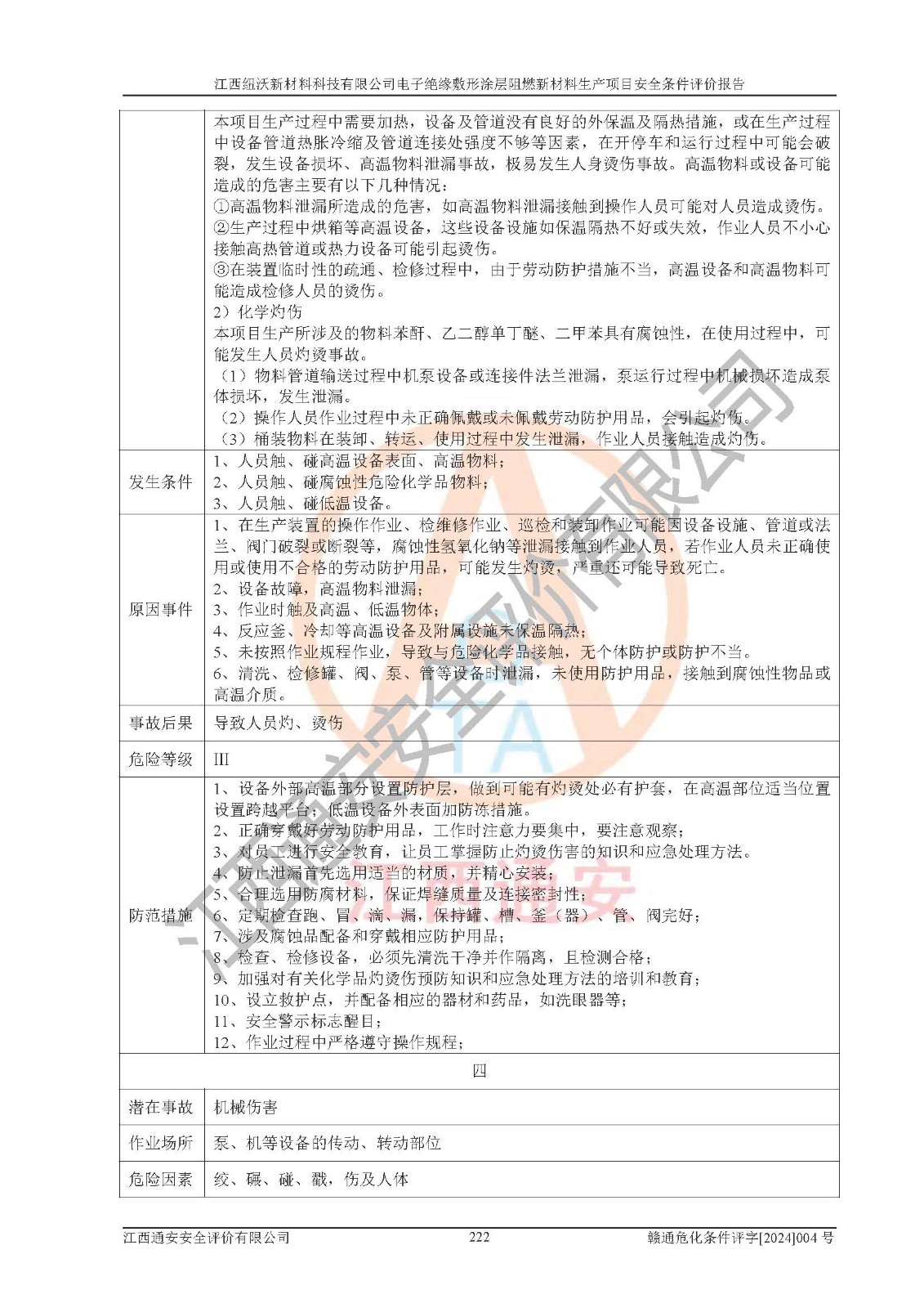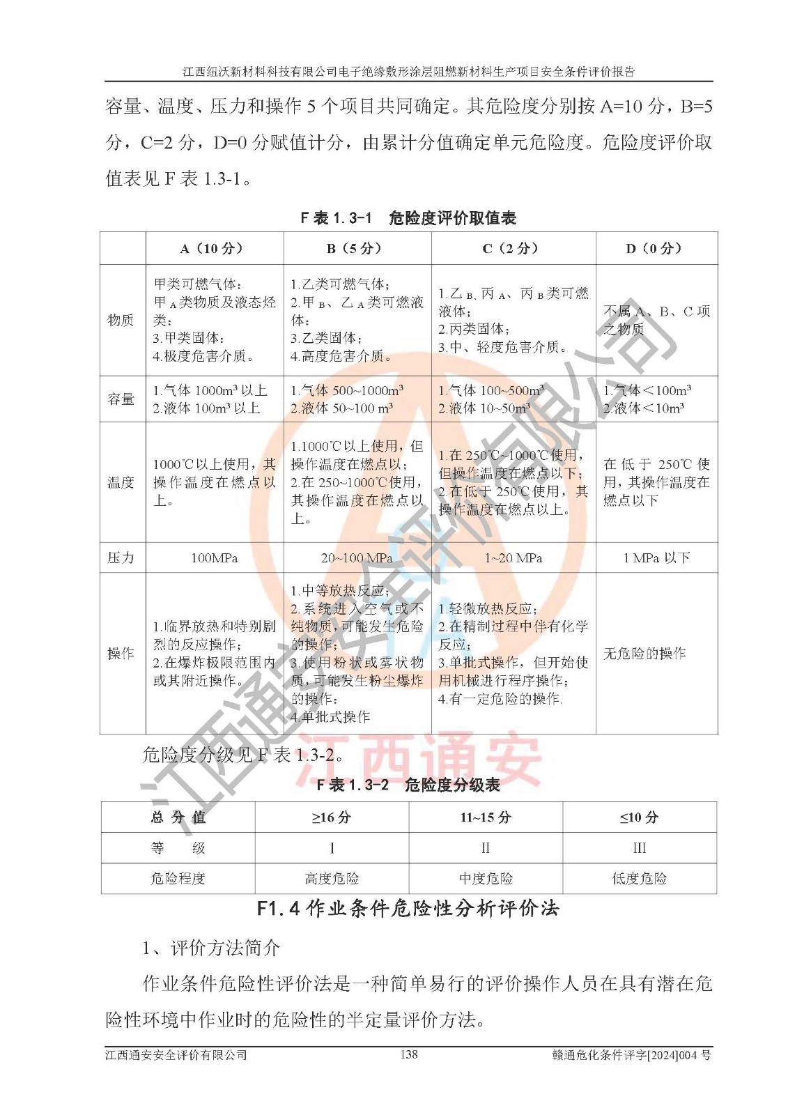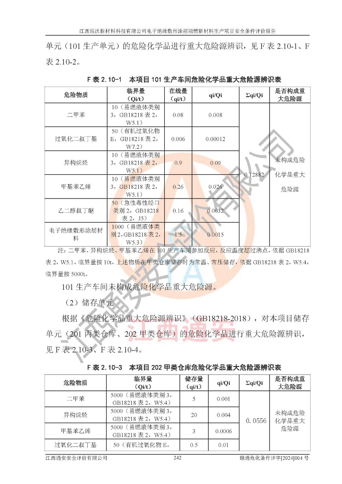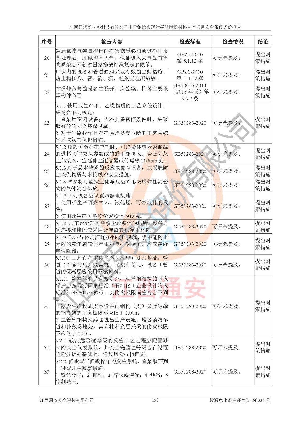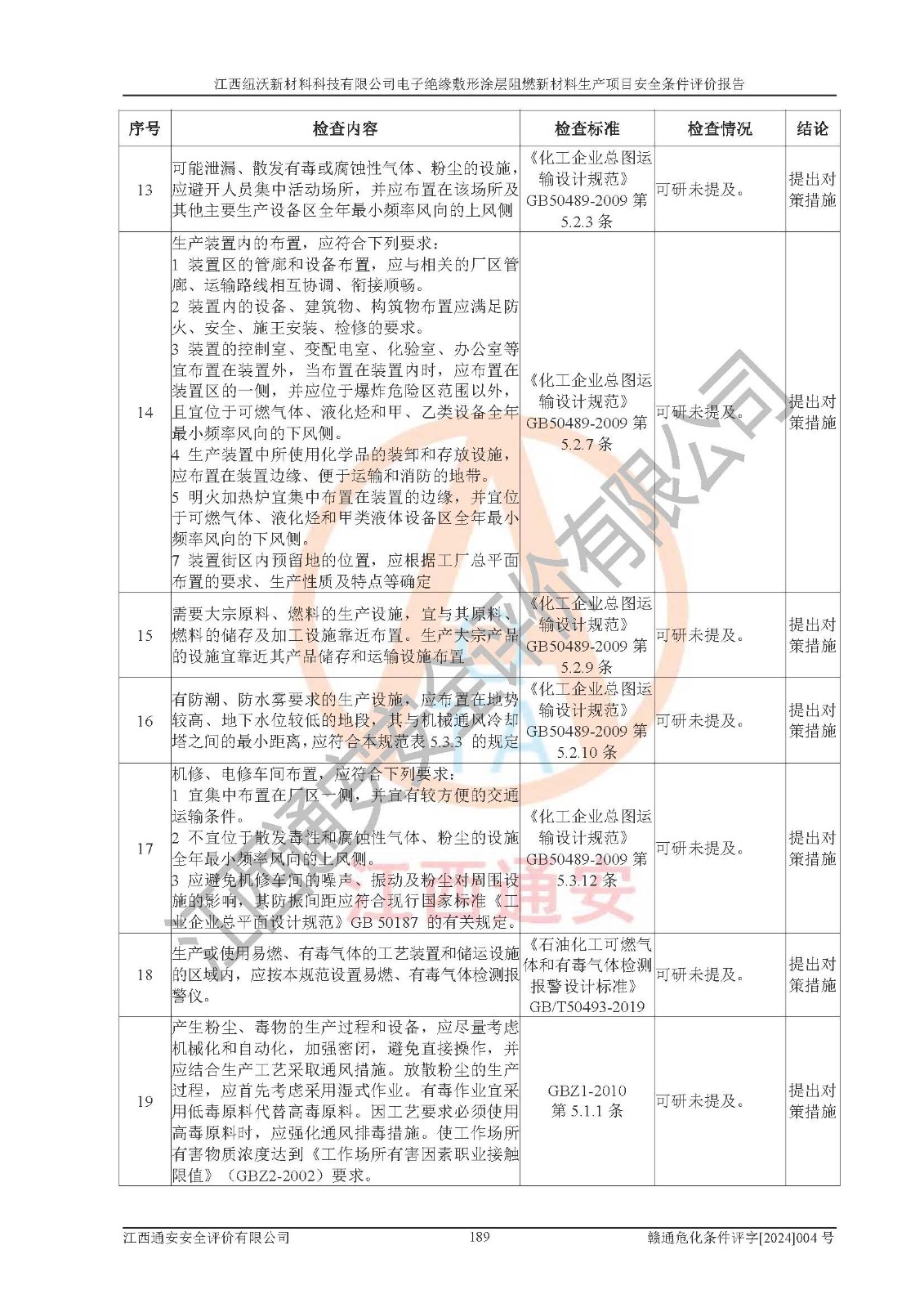 1)本項(xiàng)目依法取得了《江西省企業(yè)投資項(xiàng)目備案通知書》、《建設(shè)用地規(guī)劃許可證》,符合地方產(chǎn)業(yè)發(fā)展規(guī)劃的要求。 2)根據(jù)《**安全監(jiān)管總局關(guān)于公布首批重點(diǎn)監(jiān)管的危險(xiǎn)化工工藝目錄的通知》(安監(jiān)總管三[2009]116號(hào))和《**安全監(jiān)管總局關(guān)于公布第二批重點(diǎn)監(jiān)管危險(xiǎn)化工工藝目錄和調(diào)整首批重點(diǎn)監(jiān)管危險(xiǎn)化工工藝中部分典型工藝的通知》(安監(jiān)總管三[2013]3號(hào)),該項(xiàng)目未涉及重點(diǎn)監(jiān)管危險(xiǎn)化工工藝。 3)根據(jù)《危險(xiǎn)化學(xué)品重大危險(xiǎn)源辨識(shí)》(GB18218-2018),該項(xiàng)目未構(gòu)成危險(xiǎn)化學(xué)品重大危險(xiǎn)源。 4)項(xiàng)目存在的主要危險(xiǎn)因素有:火災(zāi)爆炸、容器爆炸、中毒窒息、灼燙、觸電、**傷害、機(jī)械傷害、高處墜落、物體打擊、淹溺等,存在的主要危害因素有:噪聲與振動(dòng)、高溫、有害化學(xué)物質(zhì)等;引起事故的原因有人的不安全行為、物的不安全狀態(tài)、管理缺陷和環(huán)境不良。其中*主要的危險(xiǎn)有害因素是火災(zāi)爆炸。 5)采用預(yù)先危險(xiǎn)性分析法評(píng)價(jià),結(jié)果為: (1)通過預(yù)先危險(xiǎn)(PHA)分析可知,項(xiàng)目廠址及總體布局單元存在周邊環(huán)境相互影響,發(fā)生異常情況,可對(duì)周邊企業(yè)生產(chǎn)經(jīng)營活動(dòng)、人員活動(dòng)產(chǎn)生影響;存在自然條件影響,可因雷擊、暴雨等引起事故;存在**傷害、建筑物危害,其固有的危險(xiǎn)性等級(jí)為Ⅱ級(jí),屬于“臨界的”,應(yīng)予以排除、采取控制措施因素。 (2)生產(chǎn)作業(yè)存在的危險(xiǎn)因素包括火災(zāi)爆炸、觸電、灼燙、中毒窒息固有的危險(xiǎn)等級(jí)為Ⅲ級(jí),屬于“危險(xiǎn)的”,可能導(dǎo)致人員傷亡和系統(tǒng)損壞的因素,需要采取防范和對(duì)策措施的因素;其它危險(xiǎn)因素固有的危險(xiǎn)等級(jí)為Ⅱ級(jí),屬于“臨界的”,應(yīng)予以排除、采取控制措施因素。 (3)生產(chǎn)作業(yè)存在的噪聲、粉塵、高溫、有害化學(xué)物質(zhì)的危險(xiǎn)有害因素等級(jí)為Ⅱ級(jí),屬于“臨界的”,應(yīng)予以排除、采取控制措施因素。 6)危險(xiǎn)度評(píng)價(jià)分析,結(jié)果為: 生產(chǎn)裝置危險(xiǎn)度評(píng)價(jià)分析:101生產(chǎn)車間為**危險(xiǎn)(Ⅰ級(jí))。 儲(chǔ)存單元危險(xiǎn)度評(píng)價(jià)分析:202甲類倉庫為**危險(xiǎn)(Ⅰ級(jí)),201丙類倉庫為低度危險(xiǎn)(Ⅲ級(jí))。 7)作業(yè)條件危險(xiǎn)性評(píng)價(jià)結(jié)果:在選定的評(píng)價(jià)單元中,其危險(xiǎn)分值均在70以下,危險(xiǎn)程度基本屬于“可能危險(xiǎn)”、“稍有危險(xiǎn)”范圍,作業(yè)條件相對(duì)安全。企業(yè)經(jīng)營過程中首先應(yīng)重點(diǎn)加強(qiáng)對(duì)甲類車間、甲類倉庫的危險(xiǎn)因素的嚴(yán)格控制,注重日常安全管理;其次要建立健全完善的安全生產(chǎn)責(zé)任制、安全管理制度、安全技術(shù)操作規(guī)程并**其貫徹落實(shí);第三要認(rèn)真抓好操作人員、管理人員的安全知識(shí)和操作技能的培訓(xùn),**人員具有與工程技術(shù)水平相適應(yīng)的技術(shù)素質(zhì)和安全素質(zhì),**安全作業(yè)。 8)項(xiàng)目建設(shè)場(chǎng)地符合當(dāng)?shù)匾?guī)劃要求,建設(shè)場(chǎng)地通過合理規(guī)劃,其選址、周邊環(huán)境、總平面布置、交通運(yùn)輸?shù)饶芊稀吨腥A人民共和國安全生產(chǎn)法》、《危險(xiǎn)化學(xué)品安全管理?xiàng)l例》、《建筑設(shè)計(jì)防火規(guī)范》、《精細(xì)化工企業(yè)工程設(shè)計(jì)防火標(biāo)準(zhǔn)》等法規(guī)、標(biāo)準(zhǔn)、規(guī)范要求。 廠址地區(qū)地震活動(dòng)相對(duì)較弱,災(zāi)害性天氣出現(xiàn)頻率稍高,自然災(zāi)害對(duì)項(xiàng)目建設(shè)具有**影響,通過采取相應(yīng)的防護(hù)措施,自然條件適宜建設(shè)。 9)建設(shè)項(xiàng)目符合**產(chǎn)業(yè)政策的要求;選擇工藝為現(xiàn)行成熟工藝,其安全可靠性可得到**。 10)本報(bào)告已根據(jù)有關(guān)安全生產(chǎn)法律、法規(guī)、規(guī)章和**標(biāo)準(zhǔn)、行業(yè)標(biāo)準(zhǔn),并嚴(yán)格執(zhí)行省委辦公廳省**辦公廳《關(guān)于全面加強(qiáng)危險(xiǎn)化學(xué)品安全生產(chǎn)工作的實(shí)施意見》(贛辦發(fā)[2020]32號(hào))及鄱陽湖生態(tài)經(jīng)濟(jì)區(qū)、長(zhǎng)江經(jīng)濟(jì)帶、“五河一湖”相關(guān)政策規(guī)定,客觀、公正、科學(xué)地進(jìn)行安全評(píng)價(jià),項(xiàng)目符合《江西省應(yīng)急管理廳關(guān)于印發(fā)《江西省危險(xiǎn)化學(xué)品建設(shè)項(xiàng)目安全監(jiān)督管理實(shí)施細(xì)則》(試行)的通知》(贛應(yīng)急字[2021]100號(hào))的要求。 11)本報(bào)告結(jié)合工藝特征,提出應(yīng)采取的對(duì)應(yīng)的自動(dòng)化控制系統(tǒng)及自動(dòng)化實(shí)施方案,滿足《江西省應(yīng)急管理廳關(guān)于印發(fā)《江西省化工企業(yè)自動(dòng)化提升實(shí)施方案》(試行)的通知》(贛應(yīng)急字[2021]190號(hào))的要求。 綜上所述:江西紐沃新材料科技有限公司電