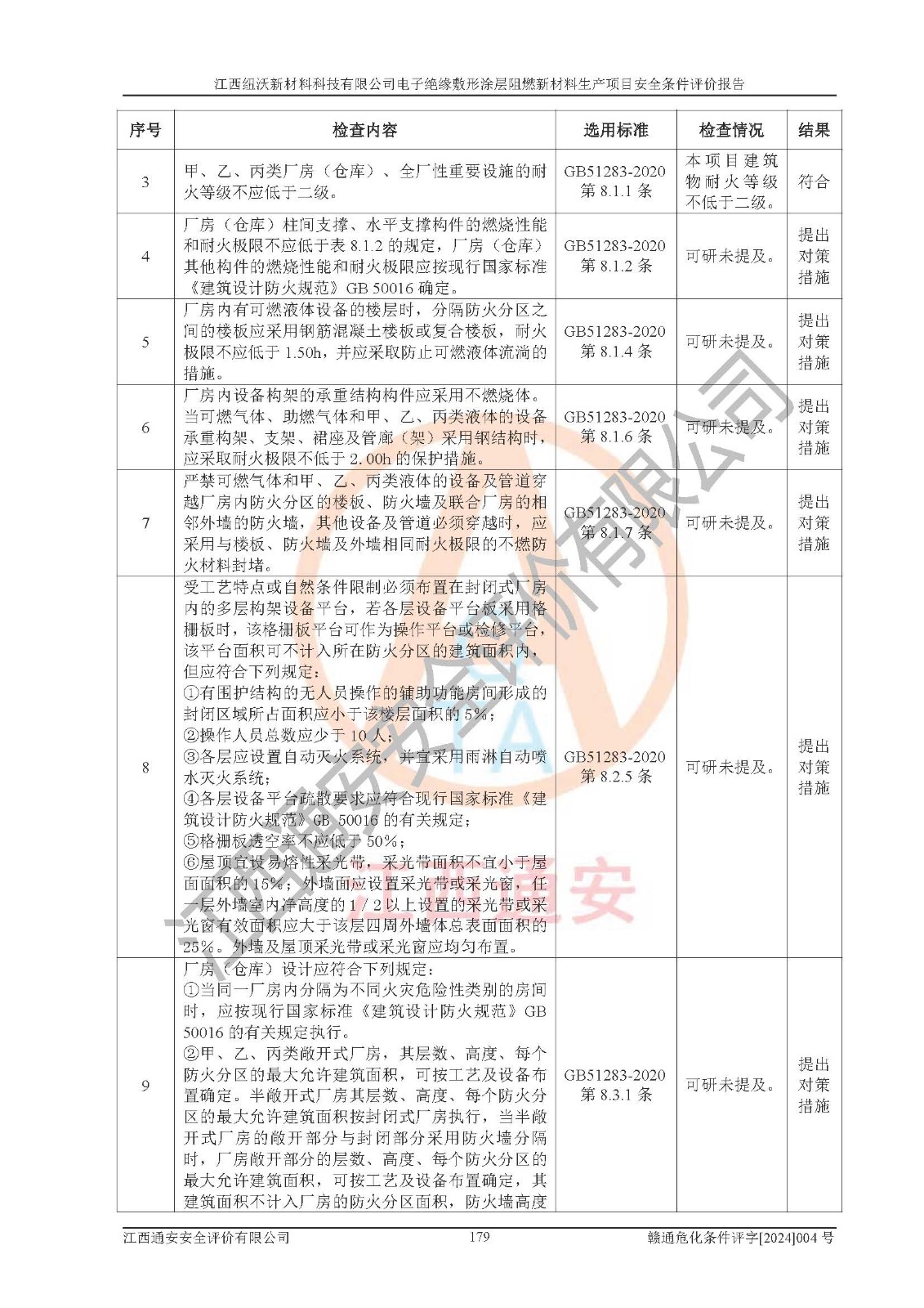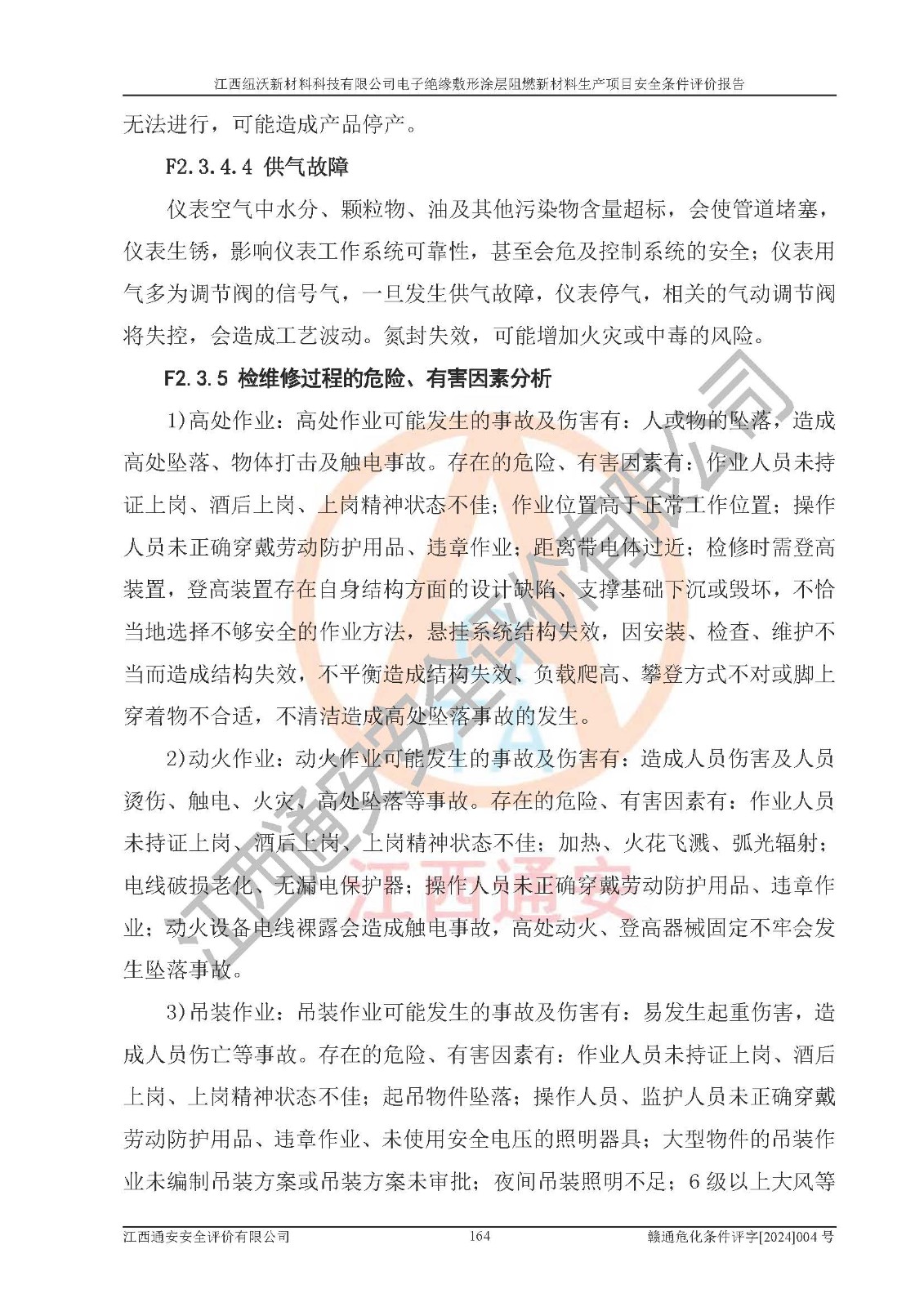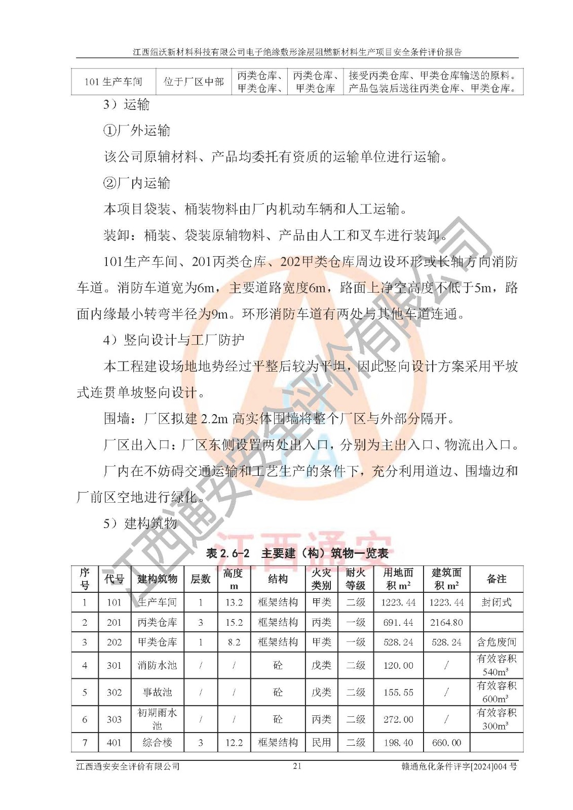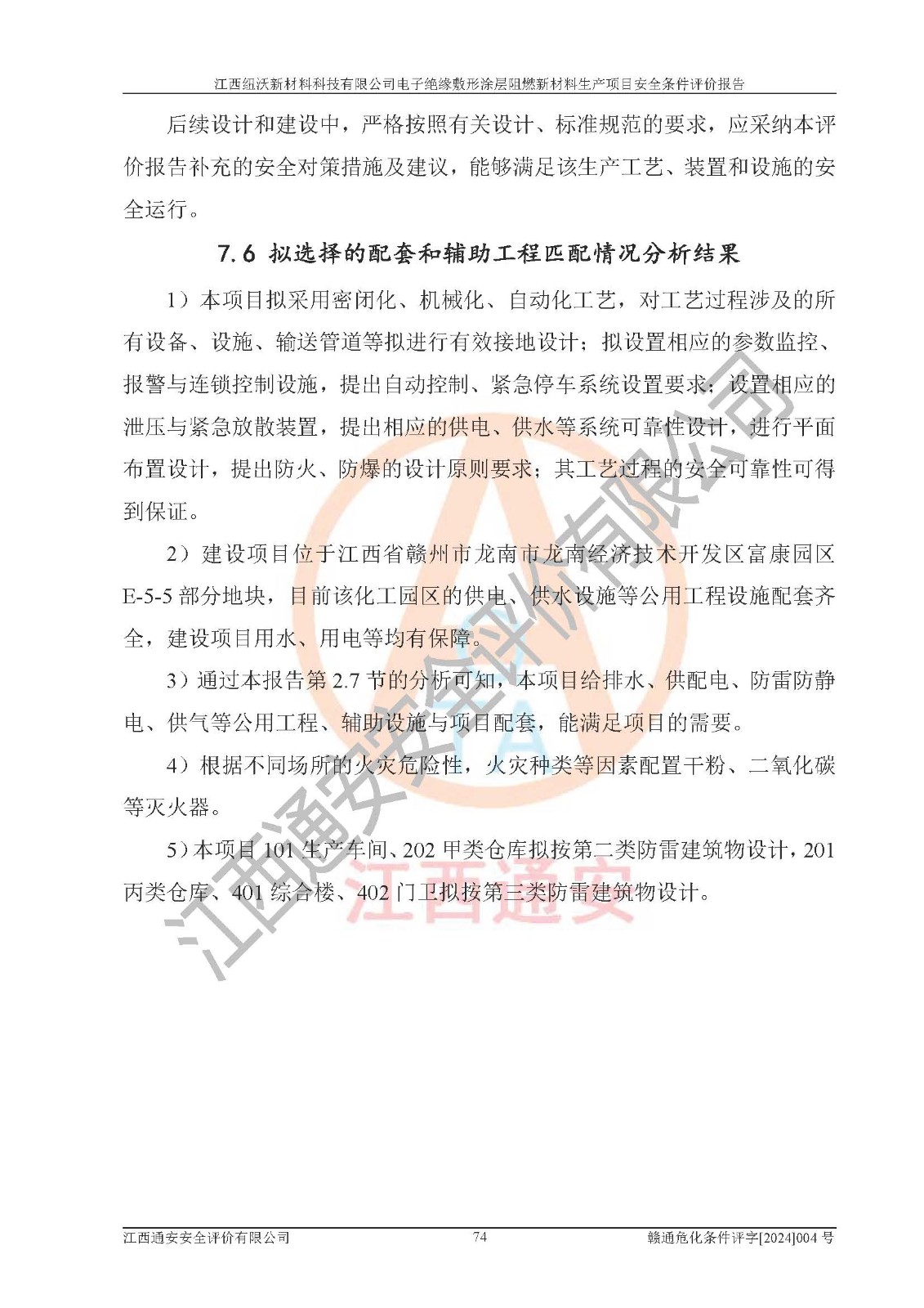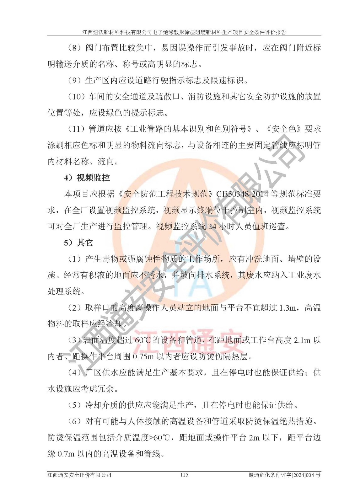 1)本項(xiàng)目依法取得了《江西省企業(yè)投資項(xiàng)目備案通知書》、《建設(shè)用地規(guī)劃許可證》,符合地方產(chǎn)業(yè)發(fā)展規(guī)劃的要求。 2)根據(jù)《**安全監(jiān)管總局關(guān)于公布首批重點(diǎn)監(jiān)管的危險(xiǎn)化工工藝目錄的通知》(安監(jiān)總管三[2009]116號(hào))和《**安全監(jiān)管總局關(guān)于公布第二批重點(diǎn)監(jiān)管危險(xiǎn)化工工藝目錄和調(diào)整首批重點(diǎn)監(jiān)管危險(xiǎn)化工工藝中部分典型工藝的通知》(安監(jiān)總管三[2013]3號(hào)),該項(xiàng)目未涉及重點(diǎn)監(jiān)管危險(xiǎn)化工工藝。 3)根據(jù)《危險(xiǎn)化學(xué)品重大危險(xiǎn)源辨識(shí)》(GB18218-2018),該項(xiàng)目未構(gòu)成危險(xiǎn)化學(xué)品重大危險(xiǎn)源。 4)項(xiàng)目存在的主要危險(xiǎn)因素有:火災(zāi)爆炸、容器爆炸、中毒窒息、灼燙、觸電、**傷害、機(jī)械傷害、高處墜落、物體打擊、淹溺等,存在的主要危害因素有:噪聲與振動(dòng)、高溫、有害化學(xué)物質(zhì)等;引起事故的原因有人的不安全行為、物的不安全狀態(tài)、管理缺陷和環(huán)境不良。其中*主要的危險(xiǎn)有害因素是火災(zāi)爆炸。 5)采用預(yù)先危險(xiǎn)性分析法評(píng)價(jià),結(jié)果為: (1)通過預(yù)先危險(xiǎn)(PHA)分析可知,項(xiàng)目廠址及總體布局單元存在周邊環(huán)境相互影響,發(fā)生異常情況,可對(duì)周邊企業(yè)生產(chǎn)經(jīng)營活動(dòng)、人員活動(dòng)產(chǎn)生影響;存在自然條件影響,可因雷擊、暴雨等引起事故;存在**傷害、建筑物危害,其固有的危險(xiǎn)性等級(jí)為Ⅱ級(jí),屬于“臨界的”,應(yīng)予以排除、采取控制措施因素。 (2)生產(chǎn)作業(yè)存在的危險(xiǎn)因素包括火災(zāi)爆炸、觸電、灼燙、中毒窒息固有的危險(xiǎn)等級(jí)為Ⅲ級(jí),屬于“危險(xiǎn)的”,可能導(dǎo)致人員傷亡和系統(tǒng)損壞的因素,需要采取防范和對(duì)策措施的因素;其它危險(xiǎn)因素固有的危險(xiǎn)等級(jí)為Ⅱ級(jí),屬于“臨界的”,應(yīng)予以排除、采取控制措施因素。 (3)生產(chǎn)作業(yè)存在的噪聲、粉塵、高溫、有害化學(xué)物質(zhì)的危險(xiǎn)有害因素等級(jí)為Ⅱ級(jí),屬于“臨界的”,應(yīng)予以排除、采取控制措施因素。 6)危險(xiǎn)度評(píng)價(jià)分析,結(jié)果為: 生產(chǎn)裝置危險(xiǎn)度評(píng)價(jià)分析:101生產(chǎn)車間為**危險(xiǎn)(Ⅰ級(jí))。 儲(chǔ)存單元危險(xiǎn)度評(píng)價(jià)分析:202甲類倉庫為**危險(xiǎn)(Ⅰ級(jí)),201丙類倉庫為低度危險(xiǎn)(Ⅲ級(jí))。 7)作業(yè)條件危險(xiǎn)性評(píng)價(jià)結(jié)果:在選定的評(píng)價(jià)單元中,其危險(xiǎn)分值均在70以下,危險(xiǎn)程度基本屬于“可能危險(xiǎn)”、“稍有危險(xiǎn)”范圍,作業(yè)條件相對(duì)安全。企業(yè)經(jīng)營過程中首先應(yīng)重點(diǎn)加強(qiáng)對(duì)甲類車間、甲類倉庫的危險(xiǎn)因素的嚴(yán)格控制,注重日常安全管理;其次要建立健全完善的安全生產(chǎn)責(zé)任制、安全管理制度、安全技術(shù)操作規(guī)程并**其貫徹落實(shí);第三要認(rèn)真抓好操作人員、管理人員的安全知識(shí)和操作技能的培訓(xùn),**人員具有與工程技術(shù)水平相適應(yīng)的技術(shù)素質(zhì)和安全素質(zhì),**安全作業(yè)。 8)項(xiàng)目建設(shè)場(chǎng)地符合當(dāng)?shù)匾?guī)劃要求,建設(shè)場(chǎng)地通過合理規(guī)劃,其選址、周邊環(huán)境、總平面布置、交通運(yùn)輸?shù)饶芊稀吨腥A人民共和國安全生產(chǎn)法》、《危險(xiǎn)化學(xué)品安全管理?xiàng)l例》、《建筑設(shè)計(jì)防火規(guī)范》、《精細(xì)化工企業(yè)工程設(shè)計(jì)防火標(biāo)準(zhǔn)》等法規(guī)、標(biāo)準(zhǔn)、規(guī)范要求。 廠址地區(qū)地震活動(dòng)相對(duì)較弱,災(zāi)害性天氣出現(xiàn)頻率稍高,自然災(zāi)害對(duì)項(xiàng)目建設(shè)具有**影響,通過采取相應(yīng)的防護(hù)措施,自然條件適宜建設(shè)。 9)建設(shè)項(xiàng)目符合**產(chǎn)業(yè)政策的要求;選擇工藝為現(xiàn)行成熟工藝,其安全可靠性可得到**。 10)本報(bào)告已根據(jù)有關(guān)安全生產(chǎn)法律、法規(guī)、規(guī)章和**標(biāo)準(zhǔn)、行業(yè)標(biāo)準(zhǔn),并嚴(yán)格執(zhí)行省委辦公廳省**辦公廳《關(guān)于全面加強(qiáng)危險(xiǎn)化學(xué)品安全生產(chǎn)工作的實(shí)施意見》(贛辦發(fā)[2020]32號(hào))及鄱陽湖生態(tài)經(jīng)濟(jì)區(qū)、長(zhǎng)江經(jīng)濟(jì)帶、“五河一湖”相關(guān)政策規(guī)定,客觀、公正、科學(xué)地進(jìn)行安全評(píng)價(jià),項(xiàng)目符合《江西省應(yīng)急管理廳關(guān)于印發(fā)《江西省危險(xiǎn)化學(xué)品建設(shè)項(xiàng)目安全監(jiān)督管理實(shí)施細(xì)則》(試行)的通知》(贛應(yīng)急字[2021]100號(hào))的要求。 11)本報(bào)告結(jié)合工藝特征,提出應(yīng)采取的對(duì)應(yīng)的自動(dòng)化控制系統(tǒng)及自動(dòng)化實(shí)施方案,滿足《江西省應(yīng)急管理廳關(guān)于印發(fā)《江西省化工企業(yè)自動(dòng)化提升實(shí)施方案》(試行)的通知》(贛應(yīng)急字[2021]190號(hào))的要求。 綜上所述:江西紐沃新材料科技有限公司電