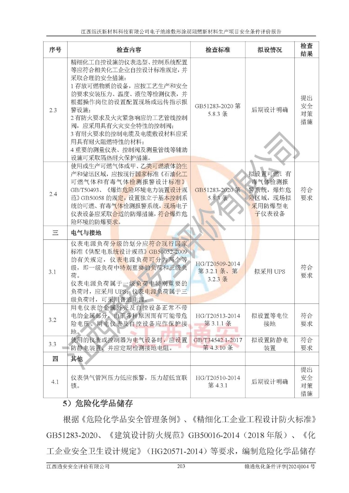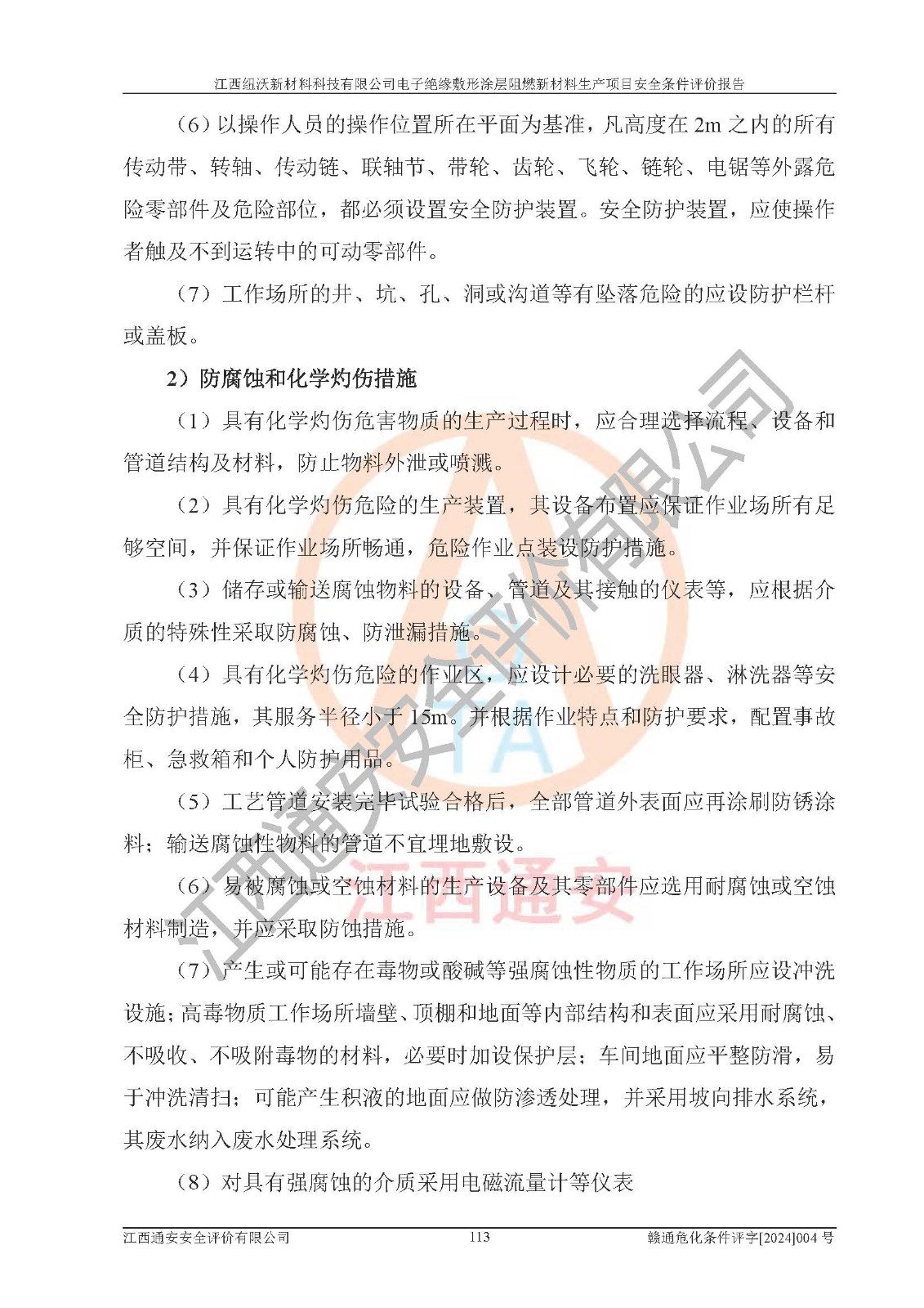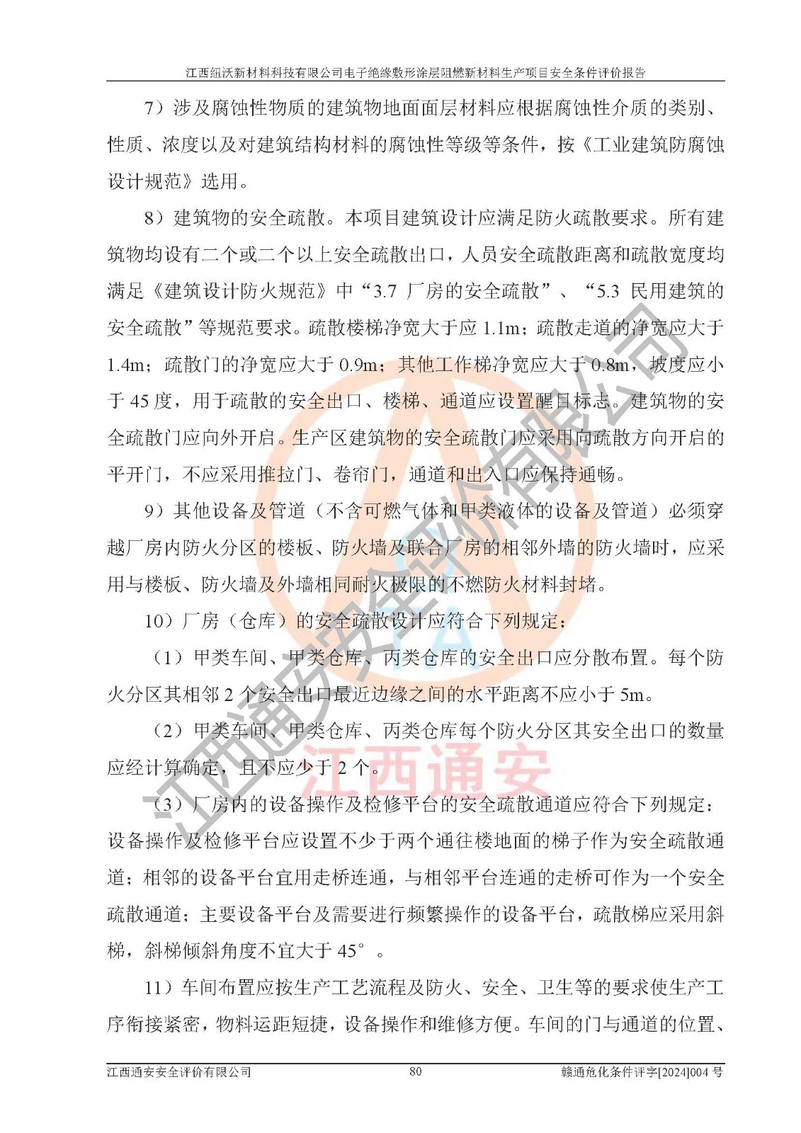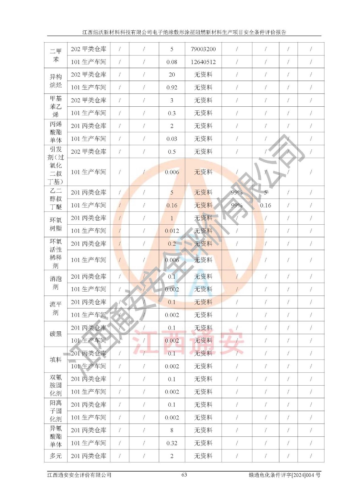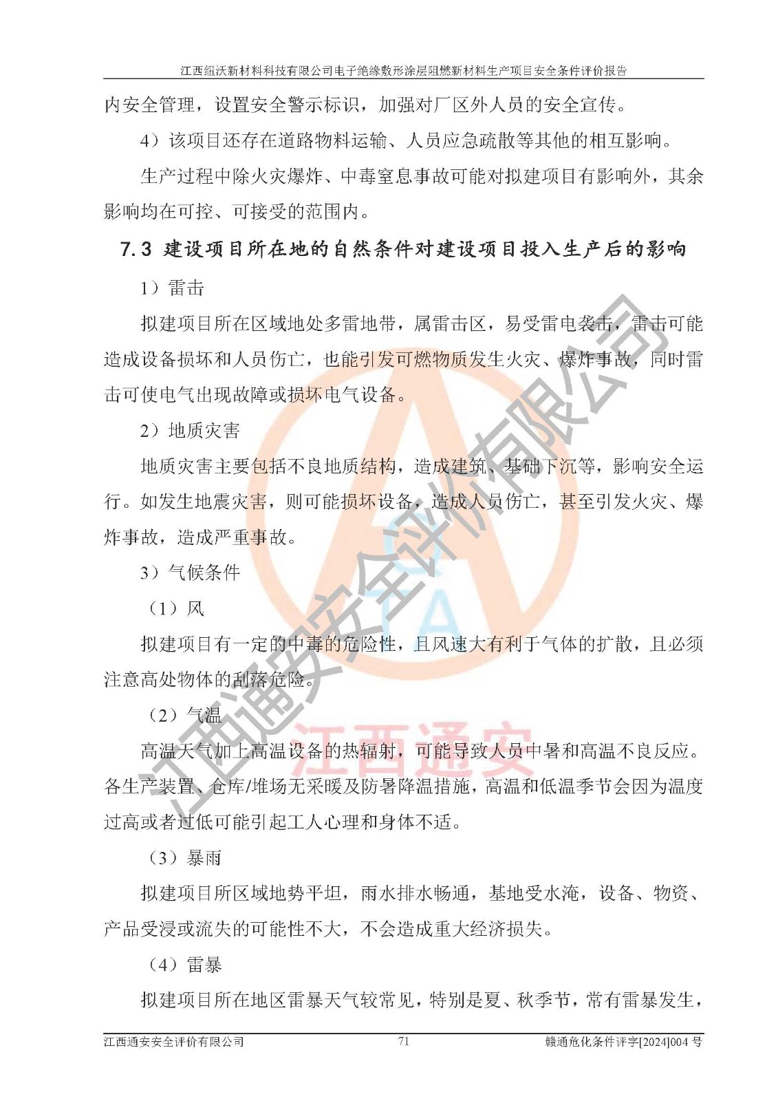 1)本項(xiàng)目依法取得了《江西省企業(yè)投資項(xiàng)目備案通知書》、《建設(shè)用地規(guī)劃許可證》,符合地方產(chǎn)業(yè)發(fā)展規(guī)劃的要求。 2)根據(jù)《**安全監(jiān)管總局關(guān)于公布首批重點(diǎn)監(jiān)管的危險(xiǎn)化工工藝目錄的通知》(安監(jiān)總管三[2009]116號(hào))和《**安全監(jiān)管總局關(guān)于公布第二批重點(diǎn)監(jiān)管危險(xiǎn)化工工藝目錄和調(diào)整首批重點(diǎn)監(jiān)管危險(xiǎn)化工工藝中部分典型工藝的通知》(安監(jiān)總管三[2013]3號(hào)),該項(xiàng)目未涉及重點(diǎn)監(jiān)管危險(xiǎn)化工工藝。 3)根據(jù)《危險(xiǎn)化學(xué)品重大危險(xiǎn)源辨識(shí)》(GB18218-2018),該項(xiàng)目未構(gòu)成危險(xiǎn)化學(xué)品重大危險(xiǎn)源。 4)項(xiàng)目存在的主要危險(xiǎn)因素有:火災(zāi)爆炸、容器爆炸、中毒窒息、灼燙、觸電、**傷害、機(jī)械傷害、高處墜落、物體打擊、淹溺等,存在的主要危害因素有:噪聲與振動(dòng)、高溫、有害化學(xué)物質(zhì)等;引起事故的原因有人的不安全行為、物的不安全狀態(tài)、管理缺陷和環(huán)境不良。其中*主要的危險(xiǎn)有害因素是火災(zāi)爆炸。 5)采用預(yù)先危險(xiǎn)性分析法評(píng)價(jià),結(jié)果為: (1)通過預(yù)先危險(xiǎn)(PHA)分析可知,項(xiàng)目廠址及總體布局單元存在周邊環(huán)境相互影響,發(fā)生異常情況,可對(duì)周邊企業(yè)生產(chǎn)經(jīng)營活動(dòng)、人員活動(dòng)產(chǎn)生影響;存在自然條件影響,可因雷擊、暴雨等引起事故;存在**傷害、建筑物危害,其固有的危險(xiǎn)性等級(jí)為Ⅱ級(jí),屬于“臨界的”,應(yīng)予以排除、采取控制措施因素。 (2)生產(chǎn)作業(yè)存在的危險(xiǎn)因素包括火災(zāi)爆炸、觸電、灼燙、中毒窒息固有的危險(xiǎn)等級(jí)為Ⅲ級(jí),屬于“危險(xiǎn)的”,可能導(dǎo)致人員傷亡和系統(tǒng)損壞的因素,需要采取防范和對(duì)策措施的因素;其它危險(xiǎn)因素固有的危險(xiǎn)等級(jí)為Ⅱ級(jí),屬于“臨界的”,應(yīng)予以排除、采取控制措施因素。 (3)生產(chǎn)作業(yè)存在的噪聲、粉塵、高溫、有害化學(xué)物質(zhì)的危險(xiǎn)有害因素等級(jí)為Ⅱ級(jí),屬于“臨界的”,應(yīng)予以排除、采取控制措施因素。 6)危險(xiǎn)度評(píng)價(jià)分析,結(jié)果為: 生產(chǎn)裝置危險(xiǎn)度評(píng)價(jià)分析:101生產(chǎn)車間為**危險(xiǎn)(Ⅰ級(jí))。 儲(chǔ)存單元危險(xiǎn)度評(píng)價(jià)分析:202甲類倉庫為**危險(xiǎn)(Ⅰ級(jí)),201丙類倉庫為低度危險(xiǎn)(Ⅲ級(jí))。 7)作業(yè)條件危險(xiǎn)性評(píng)價(jià)結(jié)果:在選定的評(píng)價(jià)單元中,其危險(xiǎn)分值均在70以下,危險(xiǎn)程度基本屬于“可能危險(xiǎn)”、“稍有危險(xiǎn)”范圍,作業(yè)條件相對(duì)安全。企業(yè)經(jīng)營過程中首先應(yīng)重點(diǎn)加強(qiáng)對(duì)甲類車間、甲類倉庫的危險(xiǎn)因素的嚴(yán)格控制,注重日常安全管理;其次要建立健全完善的安全生產(chǎn)責(zé)任制、安全管理制度、安全技術(shù)操作規(guī)程并**其貫徹落實(shí);第三要認(rèn)真抓好操作人員、管理人員的安全知識(shí)和操作技能的培訓(xùn),**人員具有與工程技術(shù)水平相適應(yīng)的技術(shù)素質(zhì)和安全素質(zhì),**安全作業(yè)。 8)項(xiàng)目建設(shè)場(chǎng)地符合當(dāng)?shù)匾?guī)劃要求,建設(shè)場(chǎng)地通過合理規(guī)劃,其選址、周邊環(huán)境、總平面布置、交通運(yùn)輸?shù)饶芊稀吨腥A人民共和國安全生產(chǎn)法》、《危險(xiǎn)化學(xué)品安全管理?xiàng)l例》、《建筑設(shè)計(jì)防火規(guī)范》、《精細(xì)化工企業(yè)工程設(shè)計(jì)防火標(biāo)準(zhǔn)》等法規(guī)、標(biāo)準(zhǔn)、規(guī)范要求。 廠址地區(qū)地震活動(dòng)相對(duì)較弱,災(zāi)害性天氣出現(xiàn)頻率稍高,自然災(zāi)害對(duì)項(xiàng)目建設(shè)具有**影響,通過采取相應(yīng)的防護(hù)措施,自然條件適宜建設(shè)。 9)建設(shè)項(xiàng)目符合**產(chǎn)業(yè)政策的要求;選擇工藝為現(xiàn)行成熟工藝,其安全可靠性可得到**。 10)本報(bào)告已根據(jù)有關(guān)安全生產(chǎn)法律、法規(guī)、規(guī)章和**標(biāo)準(zhǔn)、行業(yè)標(biāo)準(zhǔn),并嚴(yán)格執(zhí)行省委辦公廳省**辦公廳《關(guān)于全面加強(qiáng)危險(xiǎn)化學(xué)品安全生產(chǎn)工作的實(shí)施意見》(贛辦發(fā)[2020]32號(hào))及鄱陽湖生態(tài)經(jīng)濟(jì)區(qū)、長(zhǎng)江經(jīng)濟(jì)帶、“五河一湖”相關(guān)政策規(guī)定,客觀、公正、科學(xué)地進(jìn)行安全評(píng)價(jià),項(xiàng)目符合《江西省應(yīng)急管理廳關(guān)于印發(fā)《江西省危險(xiǎn)化學(xué)品建設(shè)項(xiàng)目安全監(jiān)督管理實(shí)施細(xì)則》(試行)的通知》(贛應(yīng)急字[2021]100號(hào))的要求。 11)本報(bào)告結(jié)合工藝特征,提出應(yīng)采取的對(duì)應(yīng)的自動(dòng)化控制系統(tǒng)及自動(dòng)化實(shí)施方案,滿足《江西省應(yīng)急管理廳關(guān)于印發(fā)《江西省化工企業(yè)自動(dòng)化提升實(shí)施方案》(試行)的通知》(贛應(yīng)急字[2021]190號(hào))的要求。 綜上所述:江西紐沃新材料科技有限公司電