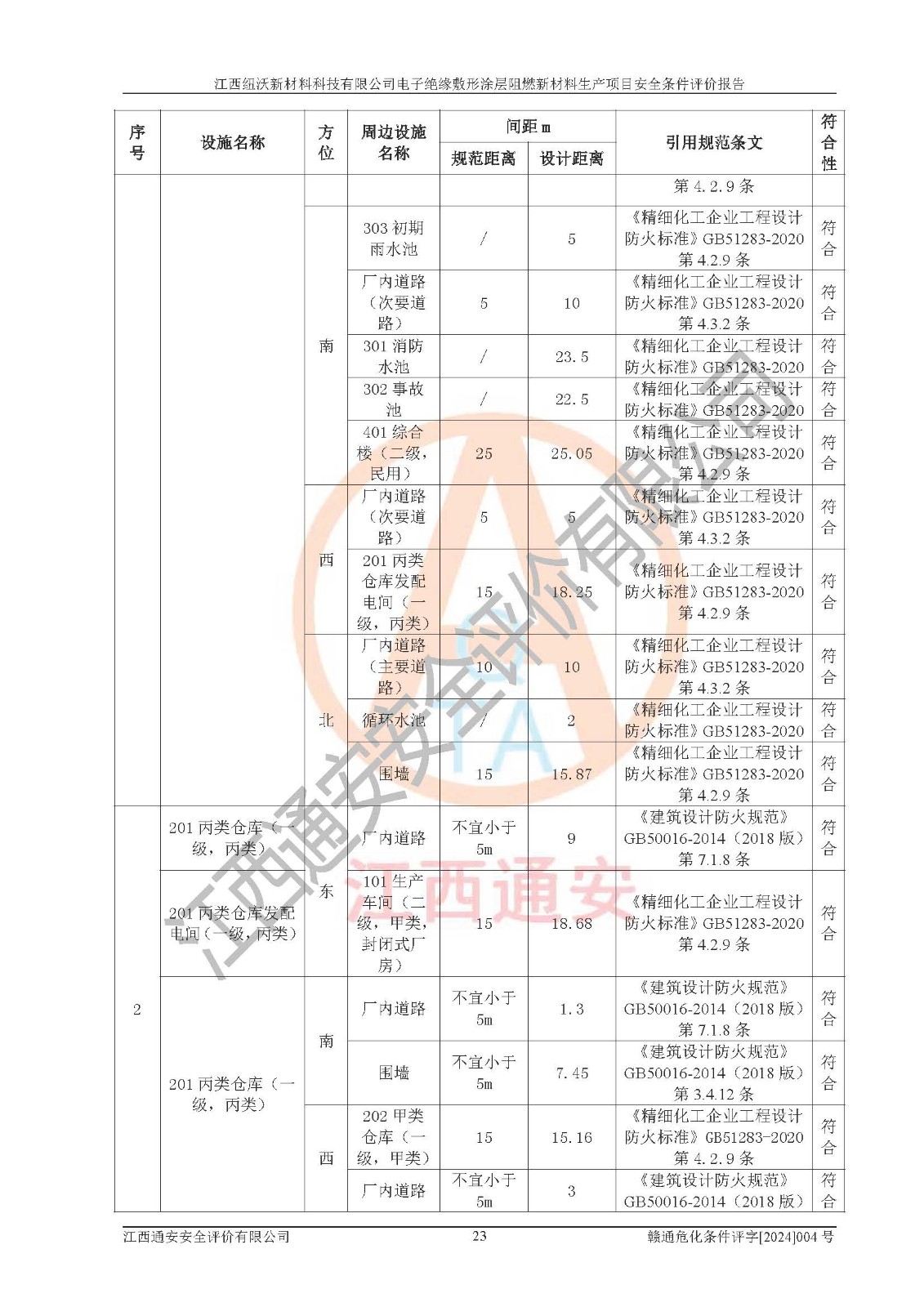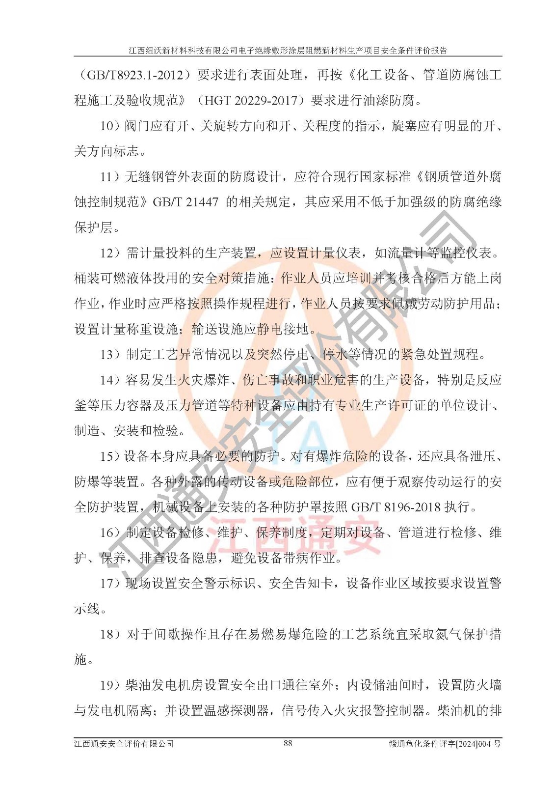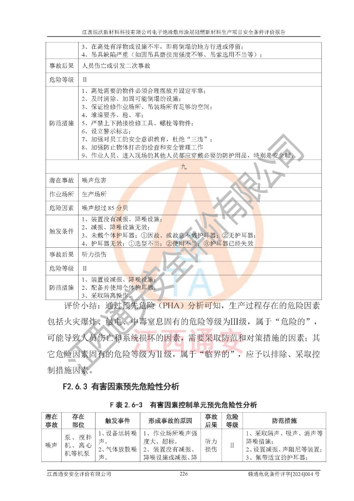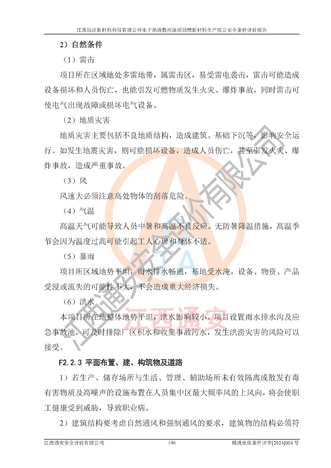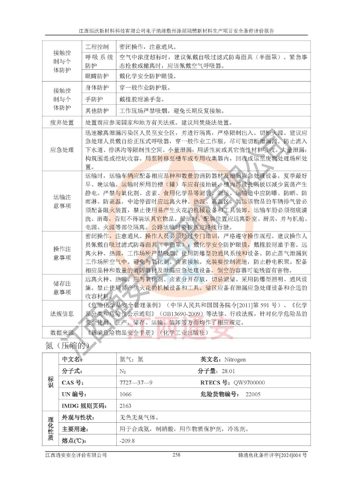 1)本項(xiàng)目依法取得了《江西省企業(yè)投資項(xiàng)目備案通知書》、《建設(shè)用地規(guī)劃許可證》,符合地方產(chǎn)業(yè)發(fā)展規(guī)劃的要求。 2)根據(jù)《**安全監(jiān)管總局關(guān)于公布首批重點(diǎn)監(jiān)管的危險(xiǎn)化工工藝目錄的通知》(安監(jiān)總管三[2009]116號(hào))和《**安全監(jiān)管總局關(guān)于公布第二批重點(diǎn)監(jiān)管危險(xiǎn)化工工藝目錄和調(diào)整首批重點(diǎn)監(jiān)管危險(xiǎn)化工工藝中部分典型工藝的通知》(安監(jiān)總管三[2013]3號(hào)),該項(xiàng)目未涉及重點(diǎn)監(jiān)管危險(xiǎn)化工工藝。 3)根據(jù)《危險(xiǎn)化學(xué)品重大危險(xiǎn)源辨識(shí)》(GB18218-2018),該項(xiàng)目未構(gòu)成危險(xiǎn)化學(xué)品重大危險(xiǎn)源。 4)項(xiàng)目存在的主要危險(xiǎn)因素有:火災(zāi)爆炸、容器爆炸、中毒窒息、灼燙、觸電、**傷害、機(jī)械傷害、高處墜落、物體打擊、淹溺等,存在的主要危害因素有:噪聲與振動(dòng)、高溫、有害化學(xué)物質(zhì)等;引起事故的原因有人的不安全行為、物的不安全狀態(tài)、管理缺陷和環(huán)境不良。其中*主要的危險(xiǎn)有害因素是火災(zāi)爆炸。 5)采用預(yù)先危險(xiǎn)性分析法評(píng)價(jià),結(jié)果為: (1)通過預(yù)先危險(xiǎn)(PHA)分析可知,項(xiàng)目廠址及總體布局單元存在周邊環(huán)境相互影響,發(fā)生異常情況,可對(duì)周邊企業(yè)生產(chǎn)經(jīng)營活動(dòng)、人員活動(dòng)產(chǎn)生影響;存在自然條件影響,可因雷擊、暴雨等引起事故;存在**傷害、建筑物危害,其固有的危險(xiǎn)性等級(jí)為Ⅱ級(jí),屬于“臨界的”,應(yīng)予以排除、采取控制措施因素。 (2)生產(chǎn)作業(yè)存在的危險(xiǎn)因素包括火災(zāi)爆炸、觸電、灼燙、中毒窒息固有的危險(xiǎn)等級(jí)為Ⅲ級(jí),屬于“危險(xiǎn)的”,可能導(dǎo)致人員傷亡和系統(tǒng)損壞的因素,需要采取防范和對(duì)策措施的因素;其它危險(xiǎn)因素固有的危險(xiǎn)等級(jí)為Ⅱ級(jí),屬于“臨界的”,應(yīng)予以排除、采取控制措施因素。 (3)生產(chǎn)作業(yè)存在的噪聲、粉塵、高溫、有害化學(xué)物質(zhì)的危險(xiǎn)有害因素等級(jí)為Ⅱ級(jí),屬于“臨界的”,應(yīng)予以排除、采取控制措施因素。 6)危險(xiǎn)度評(píng)價(jià)分析,結(jié)果為: 生產(chǎn)裝置危險(xiǎn)度評(píng)價(jià)分析:101生產(chǎn)車間為**危險(xiǎn)(Ⅰ級(jí))。 儲(chǔ)存單元危險(xiǎn)度評(píng)價(jià)分析:202甲類倉庫為**危險(xiǎn)(Ⅰ級(jí)),201丙類倉庫為低度危險(xiǎn)(Ⅲ級(jí))。 7)作業(yè)條件危險(xiǎn)性評(píng)價(jià)結(jié)果:在選定的評(píng)價(jià)單元中,其危險(xiǎn)分值均在70以下,危險(xiǎn)程度基本屬于“可能危險(xiǎn)”、“稍有危險(xiǎn)”范圍,作業(yè)條件相對(duì)安全。企業(yè)經(jīng)營過程中首先應(yīng)重點(diǎn)加強(qiáng)對(duì)甲類車間、甲類倉庫的危險(xiǎn)因素的嚴(yán)格控制,注重日常安全管理;其次要建立健全完善的安全生產(chǎn)責(zé)任制、安全管理制度、安全技術(shù)操作規(guī)程并**其貫徹落實(shí);第三要認(rèn)真抓好操作人員、管理人員的安全知識(shí)和操作技能的培訓(xùn),**人員具有與工程技術(shù)水平相適應(yīng)的技術(shù)素質(zhì)和安全素質(zhì),**安全作業(yè)。 8)項(xiàng)目建設(shè)場(chǎng)地符合當(dāng)?shù)匾?guī)劃要求,建設(shè)場(chǎng)地通過合理規(guī)劃,其選址、周邊環(huán)境、總平面布置、交通運(yùn)輸?shù)饶芊稀吨腥A人民共和國安全生產(chǎn)法》、《危險(xiǎn)化學(xué)品安全管理?xiàng)l例》、《建筑設(shè)計(jì)防火規(guī)范》、《精細(xì)化工企業(yè)工程設(shè)計(jì)防火標(biāo)準(zhǔn)》等法規(guī)、標(biāo)準(zhǔn)、規(guī)范要求。 廠址地區(qū)地震活動(dòng)相對(duì)較弱,災(zāi)害性天氣出現(xiàn)頻率稍高,自然災(zāi)害對(duì)項(xiàng)目建設(shè)具有**影響,通過采取相應(yīng)的防護(hù)措施,自然條件適宜建設(shè)。 9)建設(shè)項(xiàng)目符合**產(chǎn)業(yè)政策的要求;選擇工藝為現(xiàn)行成熟工藝,其安全可靠性可得到**。 10)本報(bào)告已根據(jù)有關(guān)安全生產(chǎn)法律、法規(guī)、規(guī)章和**標(biāo)準(zhǔn)、行業(yè)標(biāo)準(zhǔn),并嚴(yán)格執(zhí)行省委辦公廳省**辦公廳《關(guān)于全面加強(qiáng)危險(xiǎn)化學(xué)品安全生產(chǎn)工作的實(shí)施意見》(贛辦發(fā)[2020]32號(hào))及鄱陽湖生態(tài)經(jīng)濟(jì)區(qū)、長(zhǎng)江經(jīng)濟(jì)帶、“五河一湖”相關(guān)政策規(guī)定,客觀、公正、科學(xué)地進(jìn)行安全評(píng)價(jià),項(xiàng)目符合《江西省應(yīng)急管理廳關(guān)于印發(fā)《江西省危險(xiǎn)化學(xué)品建設(shè)項(xiàng)目安全監(jiān)督管理實(shí)施細(xì)則》(試行)的通知》(贛應(yīng)急字[2021]100號(hào))的要求。 11)本報(bào)告結(jié)合工藝特征,提出應(yīng)采取的對(duì)應(yīng)的自動(dòng)化控制系統(tǒng)及自動(dòng)化實(shí)施方案,滿足《江西省應(yīng)急管理廳關(guān)于印發(fā)《江西省化工企業(yè)自動(dòng)化提升實(shí)施方案》(試行)的通知》(贛應(yīng)急字[2021]190號(hào))的要求。 綜上所述:江西紐沃新材料科技有限公司電