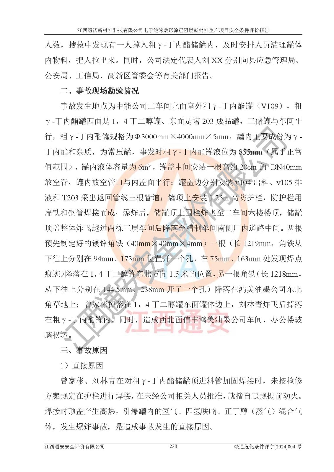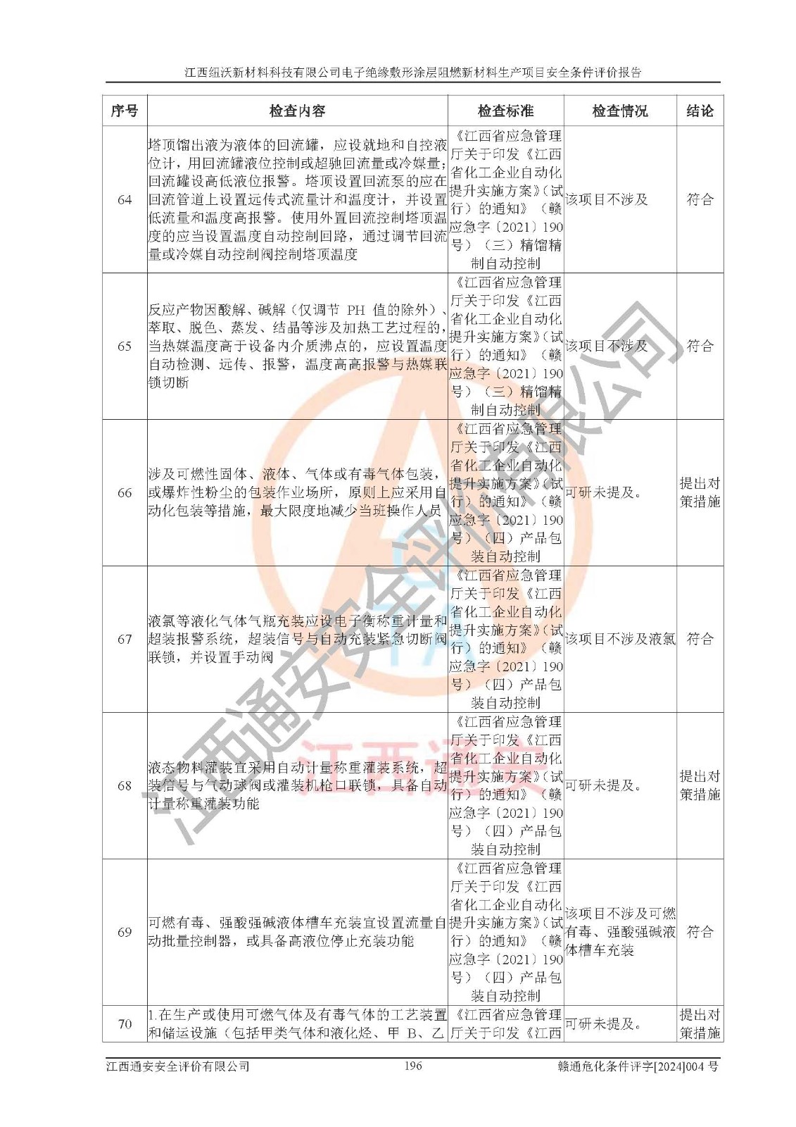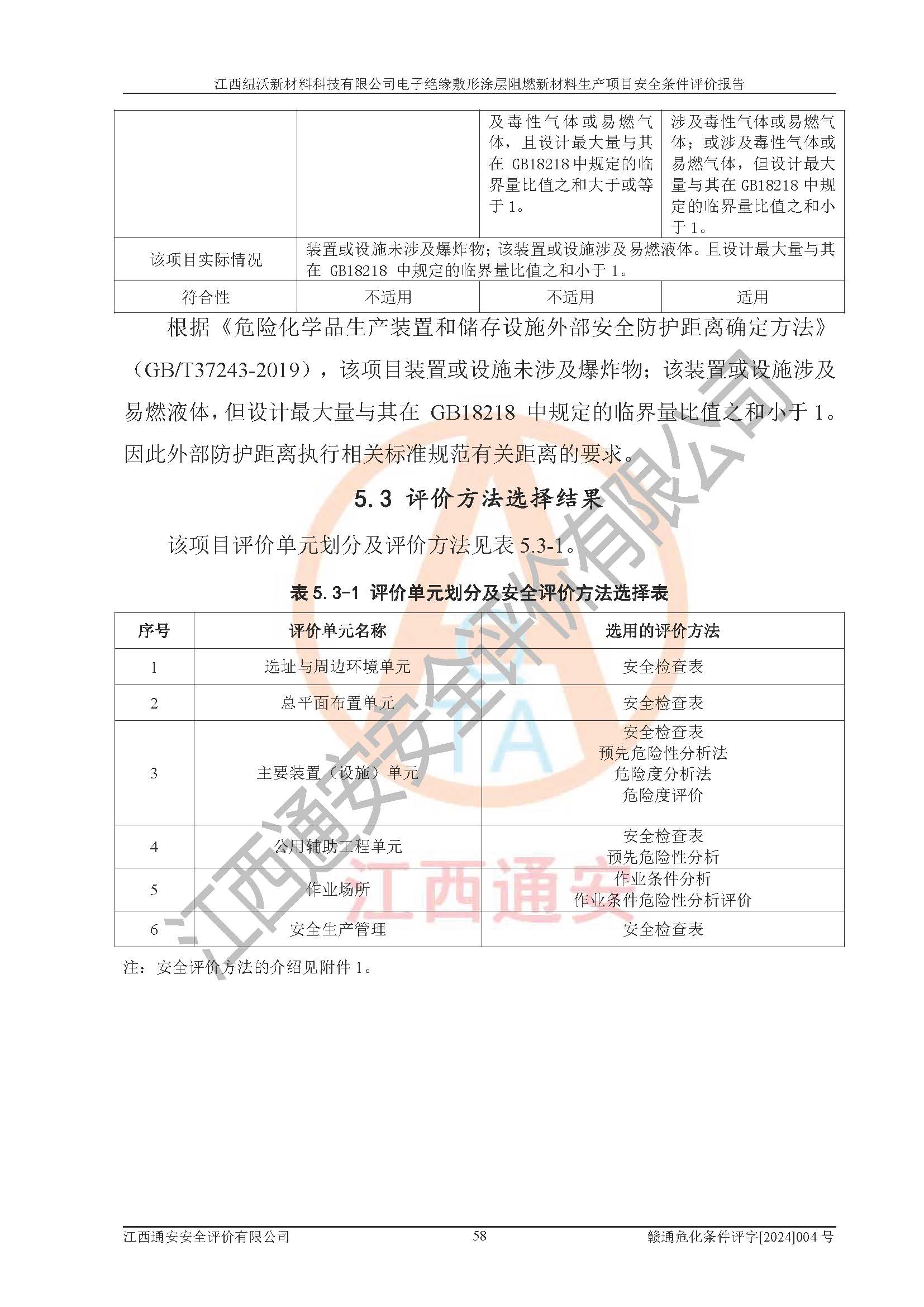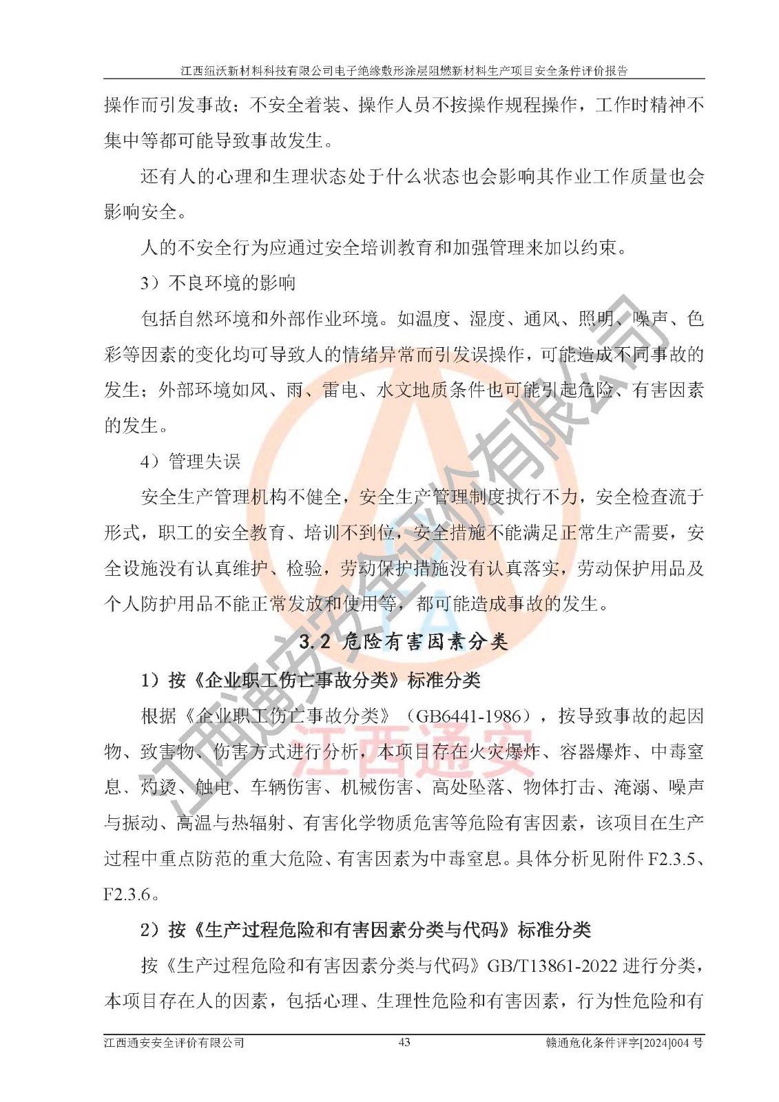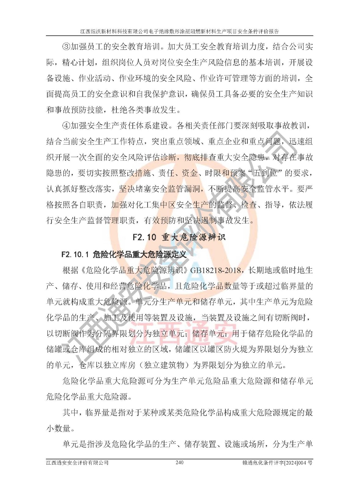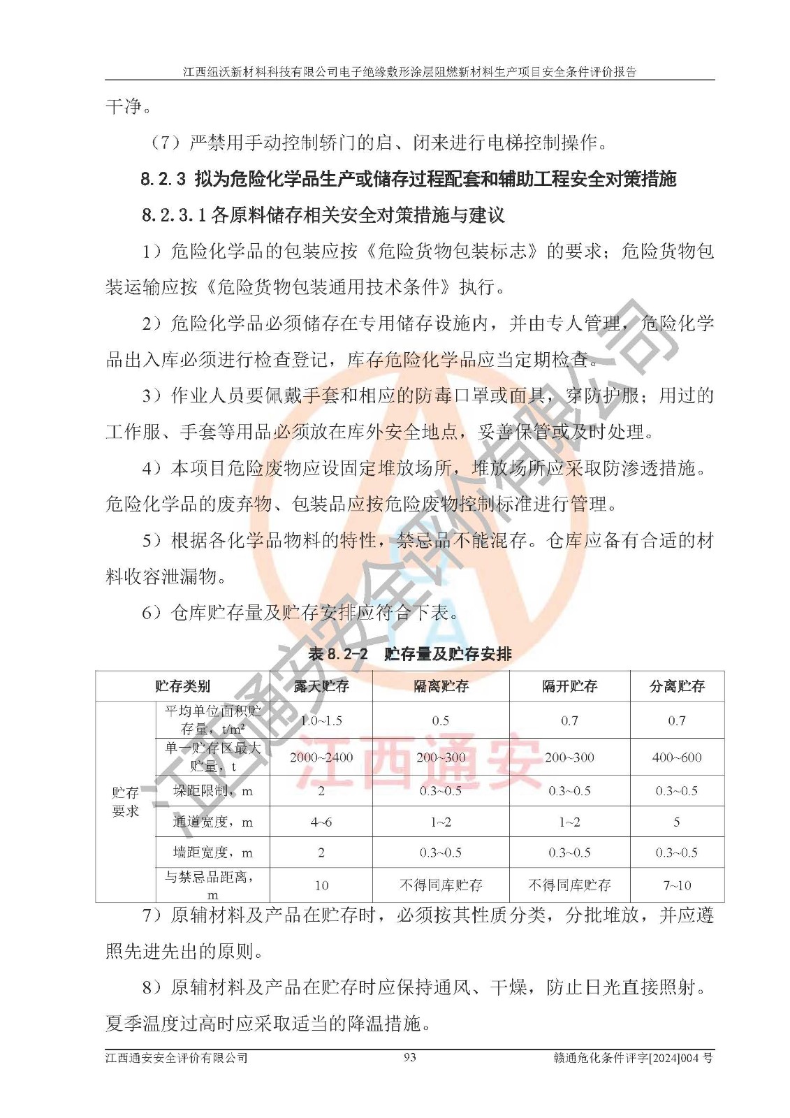 1)本項(xiàng)目依法取得了《江西省企業(yè)投資項(xiàng)目備案通知書》、《建設(shè)用地規(guī)劃許可證》,符合地方產(chǎn)業(yè)發(fā)展規(guī)劃的要求。 2)根據(jù)《**安全監(jiān)管總局關(guān)于公布首批重點(diǎn)監(jiān)管的危險(xiǎn)化工工藝目錄的通知》(安監(jiān)總管三[2009]116號(hào))和《**安全監(jiān)管總局關(guān)于公布第二批重點(diǎn)監(jiān)管危險(xiǎn)化工工藝目錄和調(diào)整首批重點(diǎn)監(jiān)管危險(xiǎn)化工工藝中部分典型工藝的通知》(安監(jiān)總管三[2013]3號(hào)),該項(xiàng)目未涉及重點(diǎn)監(jiān)管危險(xiǎn)化工工藝。 3)根據(jù)《危險(xiǎn)化學(xué)品重大危險(xiǎn)源辨識(shí)》(GB18218-2018),該項(xiàng)目未構(gòu)成危險(xiǎn)化學(xué)品重大危險(xiǎn)源。 4)項(xiàng)目存在的主要危險(xiǎn)因素有:火災(zāi)爆炸、容器爆炸、中毒窒息、灼燙、觸電、**傷害、機(jī)械傷害、高處墜落、物體打擊、淹溺等,存在的主要危害因素有:噪聲與振動(dòng)、高溫、有害化學(xué)物質(zhì)等;引起事故的原因有人的不安全行為、物的不安全狀態(tài)、管理缺陷和環(huán)境不良。其中*主要的危險(xiǎn)有害因素是火災(zāi)爆炸。 5)采用預(yù)先危險(xiǎn)性分析法評(píng)價(jià),結(jié)果為: (1)通過預(yù)先危險(xiǎn)(PHA)分析可知,項(xiàng)目廠址及總體布局單元存在周邊環(huán)境相互影響,發(fā)生異常情況,可對(duì)周邊企業(yè)生產(chǎn)經(jīng)營活動(dòng)、人員活動(dòng)產(chǎn)生影響;存在自然條件影響,可因雷擊、暴雨等引起事故;存在**傷害、建筑物危害,其固有的危險(xiǎn)性等級(jí)為Ⅱ級(jí),屬于“臨界的”,應(yīng)予以排除、采取控制措施因素。 (2)生產(chǎn)作業(yè)存在的危險(xiǎn)因素包括火災(zāi)爆炸、觸電、灼燙、中毒窒息固有的危險(xiǎn)等級(jí)為Ⅲ級(jí),屬于“危險(xiǎn)的”,可能導(dǎo)致人員傷亡和系統(tǒng)損壞的因素,需要采取防范和對(duì)策措施的因素;其它危險(xiǎn)因素固有的危險(xiǎn)等級(jí)為Ⅱ級(jí),屬于“臨界的”,應(yīng)予以排除、采取控制措施因素。 (3)生產(chǎn)作業(yè)存在的噪聲、粉塵、高溫、有害化學(xué)物質(zhì)的危險(xiǎn)有害因素等級(jí)為Ⅱ級(jí),屬于“臨界的”,應(yīng)予以排除、采取控制措施因素。 6)危險(xiǎn)度評(píng)價(jià)分析,結(jié)果為: 生產(chǎn)裝置危險(xiǎn)度評(píng)價(jià)分析:101生產(chǎn)車間為**危險(xiǎn)(Ⅰ級(jí))。 儲(chǔ)存單元危險(xiǎn)度評(píng)價(jià)分析:202甲類倉庫為**危險(xiǎn)(Ⅰ級(jí)),201丙類倉庫為低度危險(xiǎn)(Ⅲ級(jí))。 7)作業(yè)條件危險(xiǎn)性評(píng)價(jià)結(jié)果:在選定的評(píng)價(jià)單元中,其危險(xiǎn)分值均在70以下,危險(xiǎn)程度基本屬于“可能危險(xiǎn)”、“稍有危險(xiǎn)”范圍,作業(yè)條件相對(duì)安全。企業(yè)經(jīng)營過程中首先應(yīng)重點(diǎn)加強(qiáng)對(duì)甲類車間、甲類倉庫的危險(xiǎn)因素的嚴(yán)格控制,注重日常安全管理;其次要建立健全完善的安全生產(chǎn)責(zé)任制、安全管理制度、安全技術(shù)操作規(guī)程并**其貫徹落實(shí);第三要認(rèn)真抓好操作人員、管理人員的安全知識(shí)和操作技能的培訓(xùn),**人員具有與工程技術(shù)水平相適應(yīng)的技術(shù)素質(zhì)和安全素質(zhì),**安全作業(yè)。 8)項(xiàng)目建設(shè)場(chǎng)地符合當(dāng)?shù)匾?guī)劃要求,建設(shè)場(chǎng)地通過合理規(guī)劃,其選址、周邊環(huán)境、總平面布置、交通運(yùn)輸?shù)饶芊稀吨腥A人民共和國安全生產(chǎn)法》、《危險(xiǎn)化學(xué)品安全管理?xiàng)l例》、《建筑設(shè)計(jì)防火規(guī)范》、《精細(xì)化工企業(yè)工程設(shè)計(jì)防火標(biāo)準(zhǔn)》等法規(guī)、標(biāo)準(zhǔn)、規(guī)范要求。 廠址地區(qū)地震活動(dòng)相對(duì)較弱,災(zāi)害性天氣出現(xiàn)頻率稍高,自然災(zāi)害對(duì)項(xiàng)目建設(shè)具有**影響,通過采取相應(yīng)的防護(hù)措施,自然條件適宜建設(shè)。 9)建設(shè)項(xiàng)目符合**產(chǎn)業(yè)政策的要求;選擇工藝為現(xiàn)行成熟工藝,其安全可靠性可得到**。 10)本報(bào)告已根據(jù)有關(guān)安全生產(chǎn)法律、法規(guī)、規(guī)章和**標(biāo)準(zhǔn)、行業(yè)標(biāo)準(zhǔn),并嚴(yán)格執(zhí)行省委辦公廳省**辦公廳《關(guān)于全面加強(qiáng)危險(xiǎn)化學(xué)品安全生產(chǎn)工作的實(shí)施意見》(贛辦發(fā)[2020]32號(hào))及鄱陽湖生態(tài)經(jīng)濟(jì)區(qū)、長(zhǎng)江經(jīng)濟(jì)帶、“五河一湖”相關(guān)政策規(guī)定,客觀、公正、科學(xué)地進(jìn)行安全評(píng)價(jià),項(xiàng)目符合《江西省應(yīng)急管理廳關(guān)于印發(fā)《江西省危險(xiǎn)化學(xué)品建設(shè)項(xiàng)目安全監(jiān)督管理實(shí)施細(xì)則》(試行)的通知》(贛應(yīng)急字[2021]100號(hào))的要求。 11)本報(bào)告結(jié)合工藝特征,提出應(yīng)采取的對(duì)應(yīng)的自動(dòng)化控制系統(tǒng)及自動(dòng)化實(shí)施方案,滿足《江西省應(yīng)急管理廳關(guān)于印發(fā)《江西省化工企業(yè)自動(dòng)化提升實(shí)施方案》(試行)的通知》(贛應(yīng)急字[2021]190號(hào))的要求。 綜上所述:江西紐沃新材料科技有限公司電