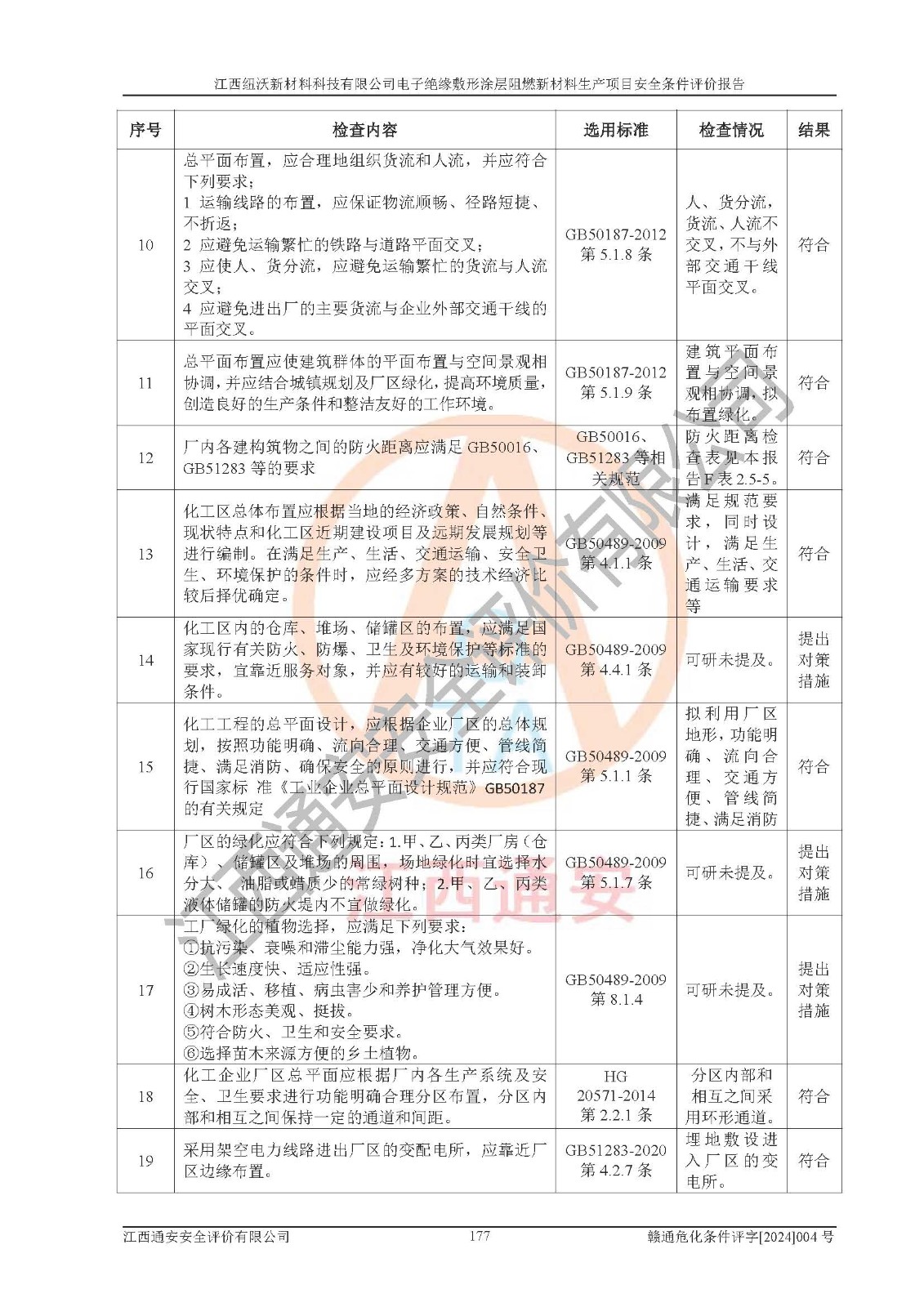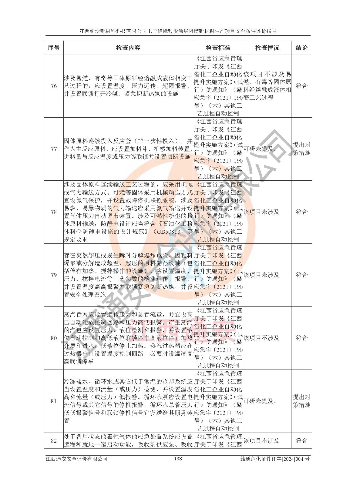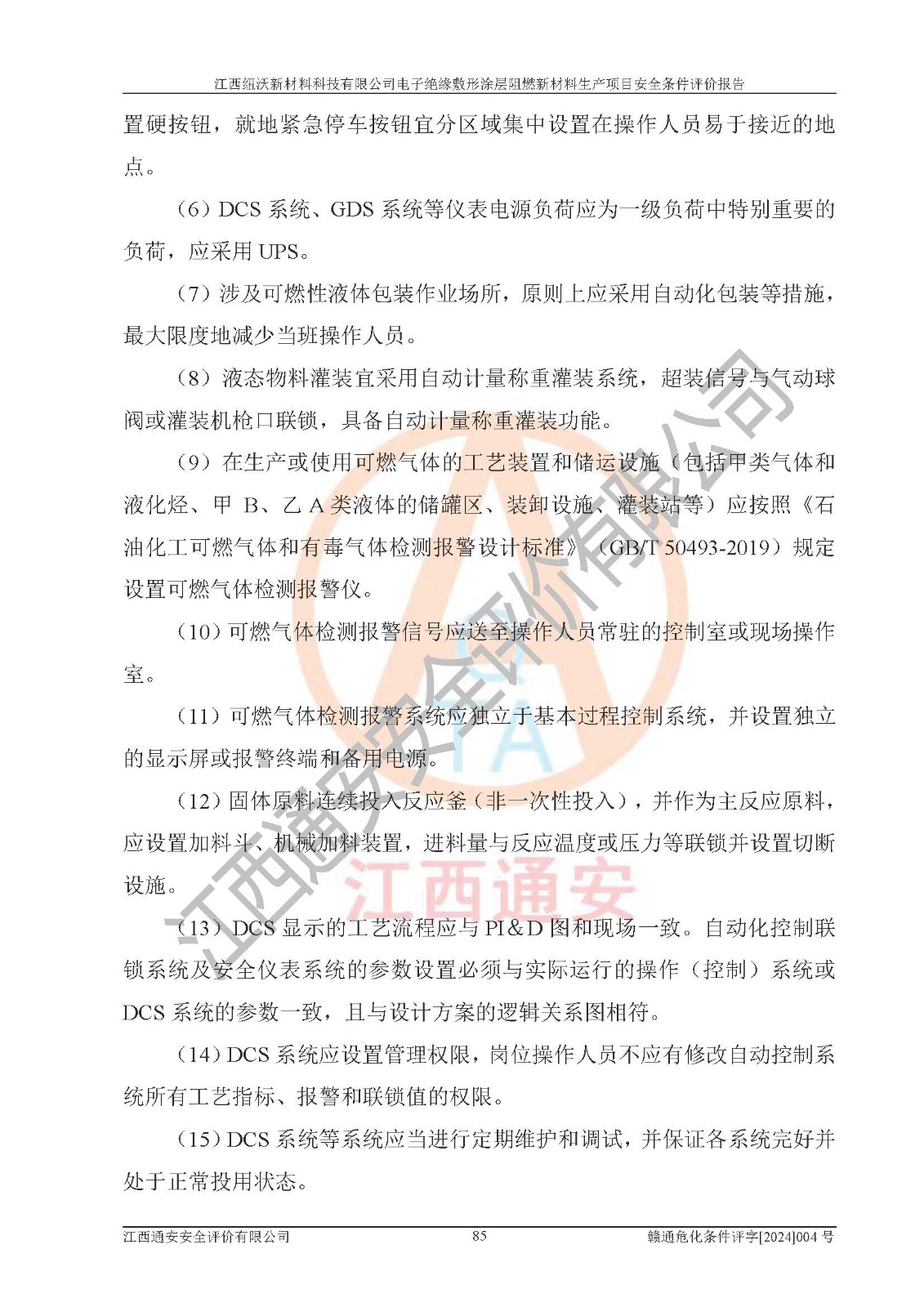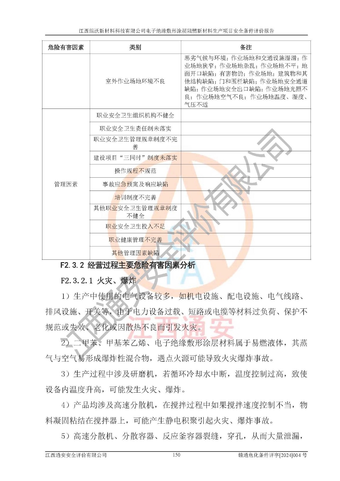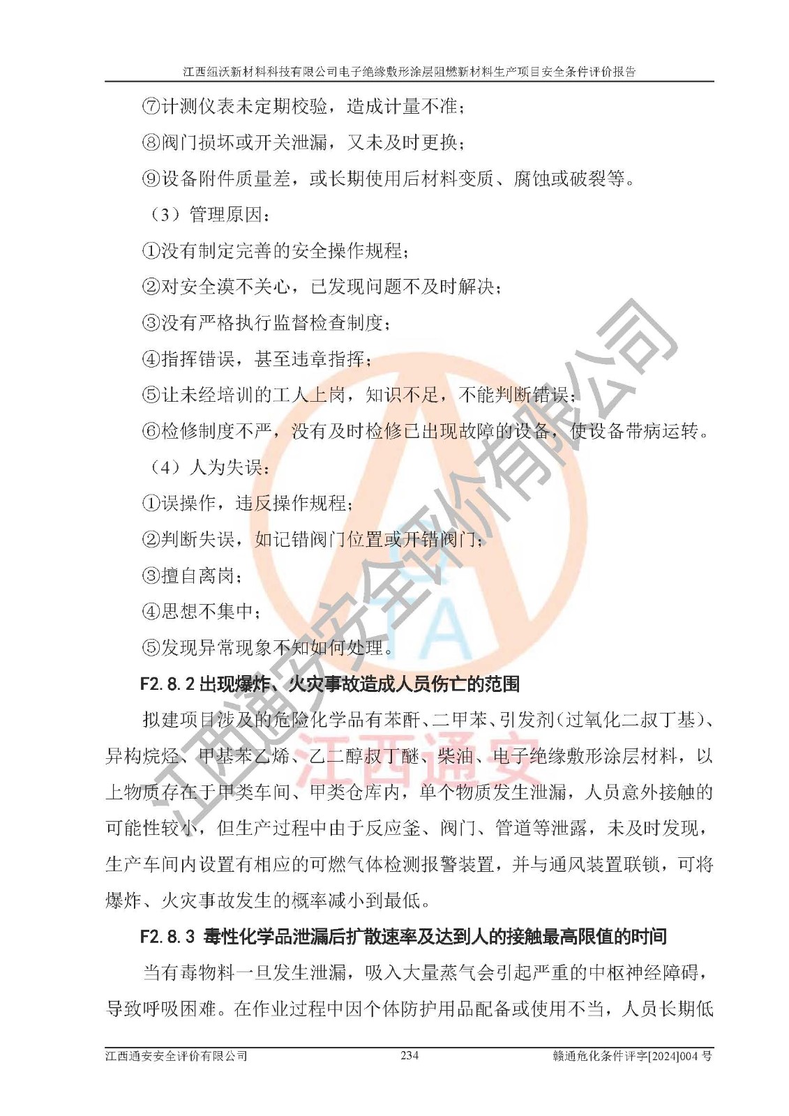 1)本項(xiàng)目依法取得了《江西省企業(yè)投資項(xiàng)目備案通知書》、《建設(shè)用地規(guī)劃許可證》,符合地方產(chǎn)業(yè)發(fā)展規(guī)劃的要求。 2)根據(jù)《**安全監(jiān)管總局關(guān)于公布首批重點(diǎn)監(jiān)管的危險(xiǎn)化工工藝目錄的通知》(安監(jiān)總管三[2009]116號(hào))和《**安全監(jiān)管總局關(guān)于公布第二批重點(diǎn)監(jiān)管危險(xiǎn)化工工藝目錄和調(diào)整首批重點(diǎn)監(jiān)管危險(xiǎn)化工工藝中部分典型工藝的通知》(安監(jiān)總管三[2013]3號(hào)),該項(xiàng)目未涉及重點(diǎn)監(jiān)管危險(xiǎn)化工工藝。 3)根據(jù)《危險(xiǎn)化學(xué)品重大危險(xiǎn)源辨識(shí)》(GB18218-2018),該項(xiàng)目未構(gòu)成危險(xiǎn)化學(xué)品重大危險(xiǎn)源。 4)項(xiàng)目存在的主要危險(xiǎn)因素有:火災(zāi)爆炸、容器爆炸、中毒窒息、灼燙、觸電、**傷害、機(jī)械傷害、高處墜落、物體打擊、淹溺等,存在的主要危害因素有:噪聲與振動(dòng)、高溫、有害化學(xué)物質(zhì)等;引起事故的原因有人的不安全行為、物的不安全狀態(tài)、管理缺陷和環(huán)境不良。其中*主要的危險(xiǎn)有害因素是火災(zāi)爆炸。 5)采用預(yù)先危險(xiǎn)性分析法評(píng)價(jià),結(jié)果為: (1)通過預(yù)先危險(xiǎn)(PHA)分析可知,項(xiàng)目廠址及總體布局單元存在周邊環(huán)境相互影響,發(fā)生異常情況,可對(duì)周邊企業(yè)生產(chǎn)經(jīng)營活動(dòng)、人員活動(dòng)產(chǎn)生影響;存在自然條件影響,可因雷擊、暴雨等引起事故;存在**傷害、建筑物危害,其固有的危險(xiǎn)性等級(jí)為Ⅱ級(jí),屬于“臨界的”,應(yīng)予以排除、采取控制措施因素。 (2)生產(chǎn)作業(yè)存在的危險(xiǎn)因素包括火災(zāi)爆炸、觸電、灼燙、中毒窒息固有的危險(xiǎn)等級(jí)為Ⅲ級(jí),屬于“危險(xiǎn)的”,可能導(dǎo)致人員傷亡和系統(tǒng)損壞的因素,需要采取防范和對(duì)策措施的因素;其它危險(xiǎn)因素固有的危險(xiǎn)等級(jí)為Ⅱ級(jí),屬于“臨界的”,應(yīng)予以排除、采取控制措施因素。 (3)生產(chǎn)作業(yè)存在的噪聲、粉塵、高溫、有害化學(xué)物質(zhì)的危險(xiǎn)有害因素等級(jí)為Ⅱ級(jí),屬于“臨界的”,應(yīng)予以排除、采取控制措施因素。 6)危險(xiǎn)度評(píng)價(jià)分析,結(jié)果為: 生產(chǎn)裝置危險(xiǎn)度評(píng)價(jià)分析:101生產(chǎn)車間為**危險(xiǎn)(Ⅰ級(jí))。 儲(chǔ)存單元危險(xiǎn)度評(píng)價(jià)分析:202甲類倉庫為**危險(xiǎn)(Ⅰ級(jí)),201丙類倉庫為低度危險(xiǎn)(Ⅲ級(jí))。 7)作業(yè)條件危險(xiǎn)性評(píng)價(jià)結(jié)果:在選定的評(píng)價(jià)單元中,其危險(xiǎn)分值均在70以下,危險(xiǎn)程度基本屬于“可能危險(xiǎn)”、“稍有危險(xiǎn)”范圍,作業(yè)條件相對(duì)安全。企業(yè)經(jīng)營過程中首先應(yīng)重點(diǎn)加強(qiáng)對(duì)甲類車間、甲類倉庫的危險(xiǎn)因素的嚴(yán)格控制,注重日常安全管理;其次要建立健全完善的安全生產(chǎn)責(zé)任制、安全管理制度、安全技術(shù)操作規(guī)程并**其貫徹落實(shí);第三要認(rèn)真抓好操作人員、管理人員的安全知識(shí)和操作技能的培訓(xùn),**人員具有與工程技術(shù)水平相適應(yīng)的技術(shù)素質(zhì)和安全素質(zhì),**安全作業(yè)。 8)項(xiàng)目建設(shè)場(chǎng)地符合當(dāng)?shù)匾?guī)劃要求,建設(shè)場(chǎng)地通過合理規(guī)劃,其選址、周邊環(huán)境、總平面布置、交通運(yùn)輸?shù)饶芊稀吨腥A人民共和國安全生產(chǎn)法》、《危險(xiǎn)化學(xué)品安全管理?xiàng)l例》、《建筑設(shè)計(jì)防火規(guī)范》、《精細(xì)化工企業(yè)工程設(shè)計(jì)防火標(biāo)準(zhǔn)》等法規(guī)、標(biāo)準(zhǔn)、規(guī)范要求。 廠址地區(qū)地震活動(dòng)相對(duì)較弱,災(zāi)害性天氣出現(xiàn)頻率稍高,自然災(zāi)害對(duì)項(xiàng)目建設(shè)具有**影響,通過采取相應(yīng)的防護(hù)措施,自然條件適宜建設(shè)。 9)建設(shè)項(xiàng)目符合**產(chǎn)業(yè)政策的要求;選擇工藝為現(xiàn)行成熟工藝,其安全可靠性可得到**。 10)本報(bào)告已根據(jù)有關(guān)安全生產(chǎn)法律、法規(guī)、規(guī)章和**標(biāo)準(zhǔn)、行業(yè)標(biāo)準(zhǔn),并嚴(yán)格執(zhí)行省委辦公廳省**辦公廳《關(guān)于全面加強(qiáng)危險(xiǎn)化學(xué)品安全生產(chǎn)工作的實(shí)施意見》(贛辦發(fā)[2020]32號(hào))及鄱陽湖生態(tài)經(jīng)濟(jì)區(qū)、長(zhǎng)江經(jīng)濟(jì)帶、“五河一湖”相關(guān)政策規(guī)定,客觀、公正、科學(xué)地進(jìn)行安全評(píng)價(jià),項(xiàng)目符合《江西省應(yīng)急管理廳關(guān)于印發(fā)《江西省危險(xiǎn)化學(xué)品建設(shè)項(xiàng)目安全監(jiān)督管理實(shí)施細(xì)則》(試行)的通知》(贛應(yīng)急字[2021]100號(hào))的要求。 11)本報(bào)告結(jié)合工藝特征,提出應(yīng)采取的對(duì)應(yīng)的自動(dòng)化控制系統(tǒng)及自動(dòng)化實(shí)施方案,滿足《江西省應(yīng)急管理廳關(guān)于印發(fā)《江西省化工企業(yè)自動(dòng)化提升實(shí)施方案》(試行)的通知》(贛應(yīng)急字[2021]190號(hào))的要求。 綜上所述:江西紐沃新材料科技有限公司電