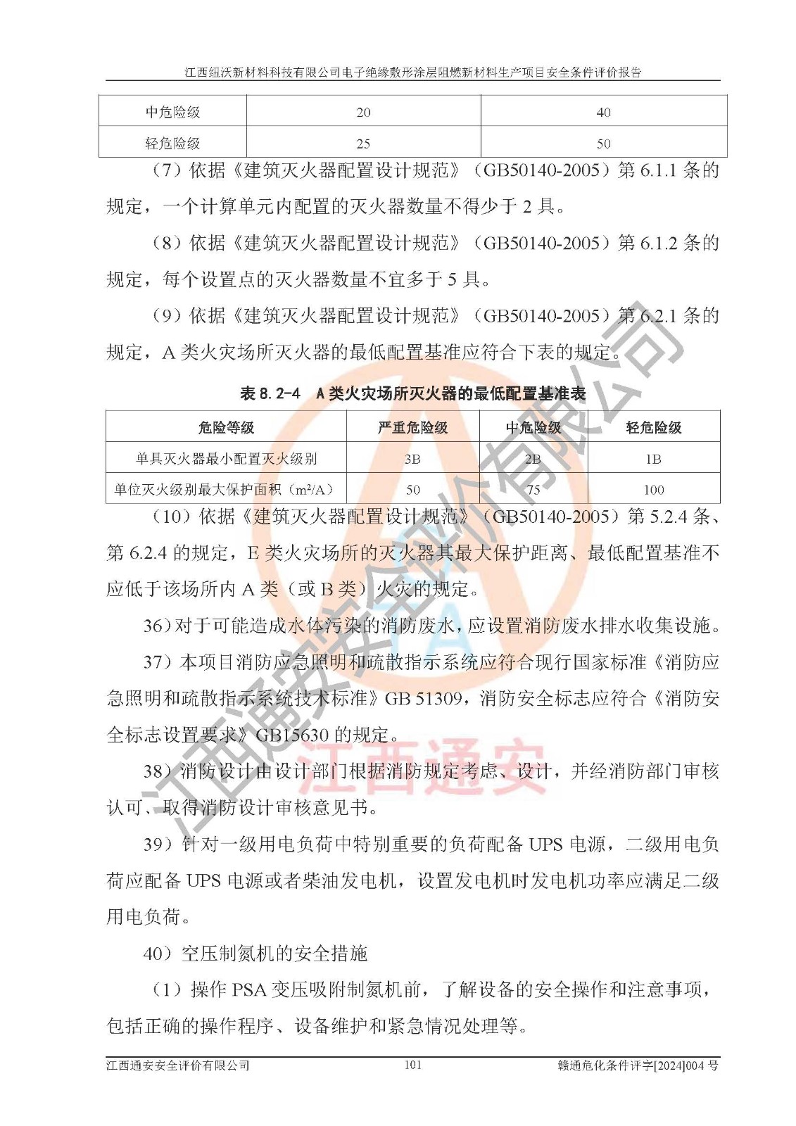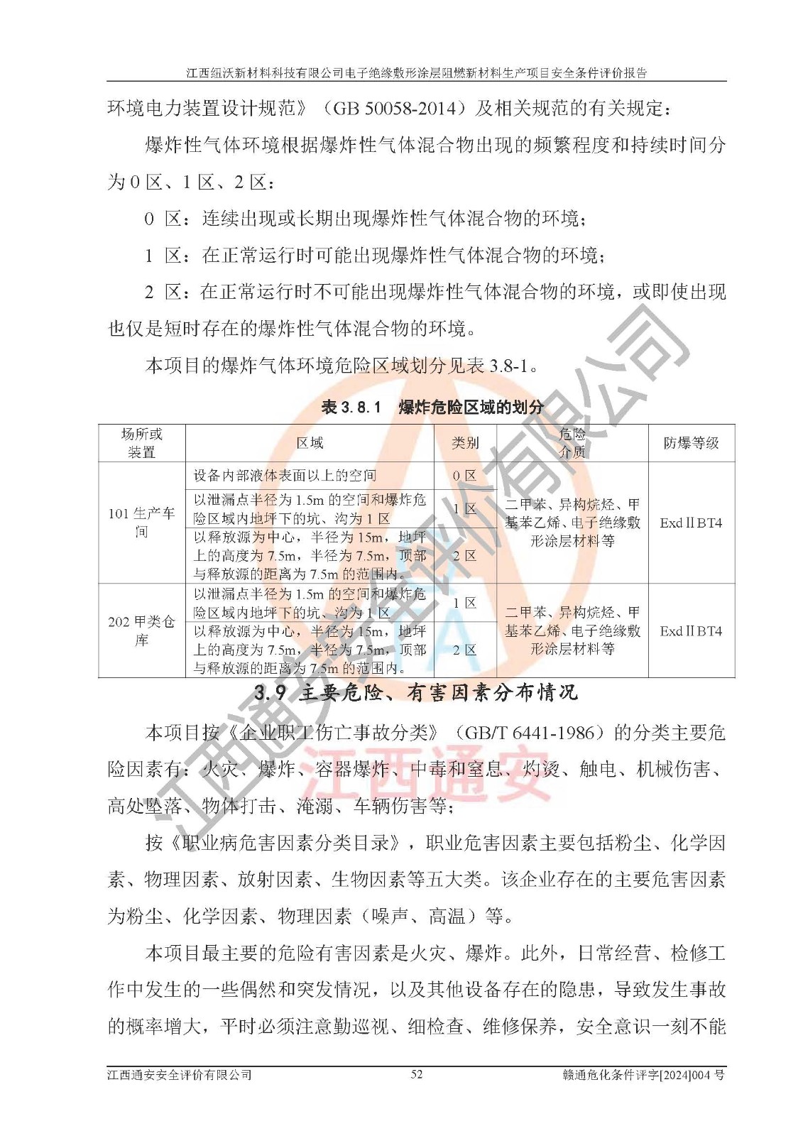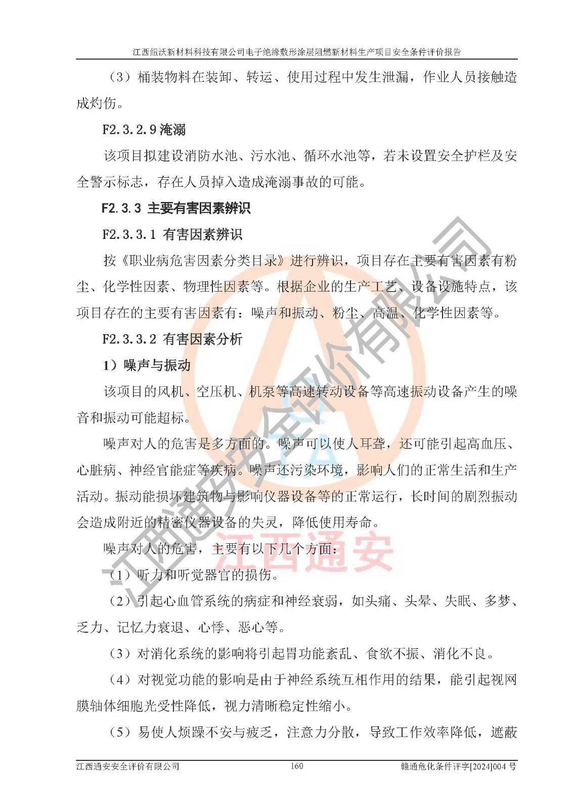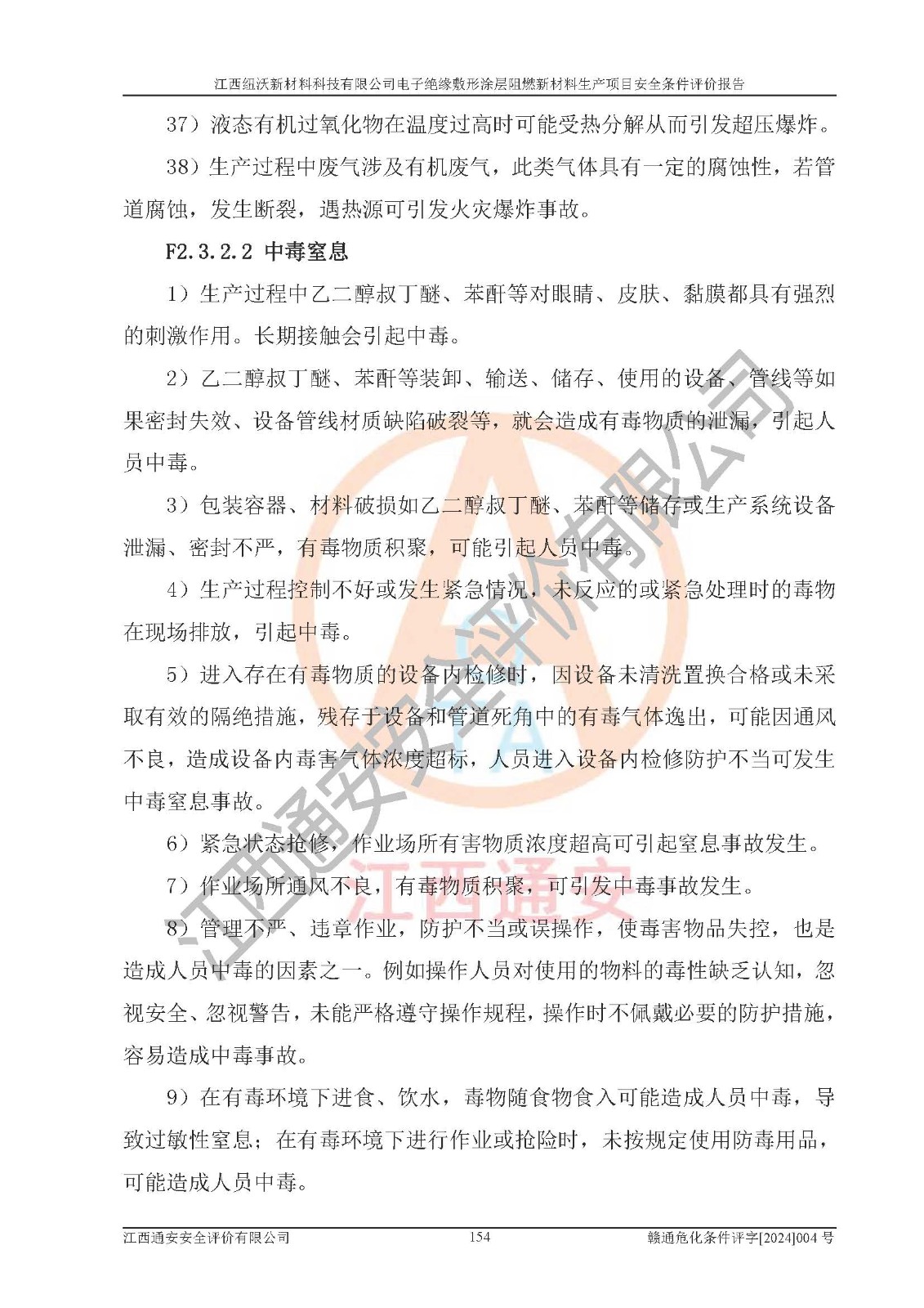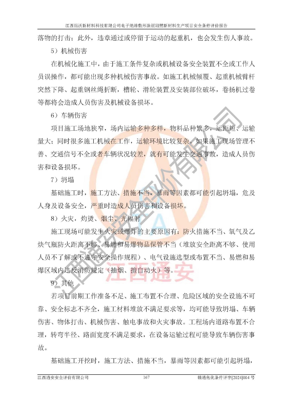 1)本項(xiàng)目依法取得了《江西省企業(yè)投資項(xiàng)目備案通知書》、《建設(shè)用地規(guī)劃許可證》,符合地方產(chǎn)業(yè)發(fā)展規(guī)劃的要求。 2)根據(jù)《**安全監(jiān)管總局關(guān)于公布首批重點(diǎn)監(jiān)管的危險(xiǎn)化工工藝目錄的通知》(安監(jiān)總管三[2009]116號(hào))和《**安全監(jiān)管總局關(guān)于公布第二批重點(diǎn)監(jiān)管危險(xiǎn)化工工藝目錄和調(diào)整首批重點(diǎn)監(jiān)管危險(xiǎn)化工工藝中部分典型工藝的通知》(安監(jiān)總管三[2013]3號(hào)),該項(xiàng)目未涉及重點(diǎn)監(jiān)管危險(xiǎn)化工工藝。 3)根據(jù)《危險(xiǎn)化學(xué)品重大危險(xiǎn)源辨識(shí)》(GB18218-2018),該項(xiàng)目未構(gòu)成危險(xiǎn)化學(xué)品重大危險(xiǎn)源。 4)項(xiàng)目存在的主要危險(xiǎn)因素有:火災(zāi)爆炸、容器爆炸、中毒窒息、灼燙、觸電、**傷害、機(jī)械傷害、高處墜落、物體打擊、淹溺等,存在的主要危害因素有:噪聲與振動(dòng)、高溫、有害化學(xué)物質(zhì)等;引起事故的原因有人的不安全行為、物的不安全狀態(tài)、管理缺陷和環(huán)境不良。其中*主要的危險(xiǎn)有害因素是火災(zāi)爆炸。 5)采用預(yù)先危險(xiǎn)性分析法評(píng)價(jià),結(jié)果為: (1)通過預(yù)先危險(xiǎn)(PHA)分析可知,項(xiàng)目廠址及總體布局單元存在周邊環(huán)境相互影響,發(fā)生異常情況,可對(duì)周邊企業(yè)生產(chǎn)經(jīng)營活動(dòng)、人員活動(dòng)產(chǎn)生影響;存在自然條件影響,可因雷擊、暴雨等引起事故;存在**傷害、建筑物危害,其固有的危險(xiǎn)性等級(jí)為Ⅱ級(jí),屬于“臨界的”,應(yīng)予以排除、采取控制措施因素。 (2)生產(chǎn)作業(yè)存在的危險(xiǎn)因素包括火災(zāi)爆炸、觸電、灼燙、中毒窒息固有的危險(xiǎn)等級(jí)為Ⅲ級(jí),屬于“危險(xiǎn)的”,可能導(dǎo)致人員傷亡和系統(tǒng)損壞的因素,需要采取防范和對(duì)策措施的因素;其它危險(xiǎn)因素固有的危險(xiǎn)等級(jí)為Ⅱ級(jí),屬于“臨界的”,應(yīng)予以排除、采取控制措施因素。 (3)生產(chǎn)作業(yè)存在的噪聲、粉塵、高溫、有害化學(xué)物質(zhì)的危險(xiǎn)有害因素等級(jí)為Ⅱ級(jí),屬于“臨界的”,應(yīng)予以排除、采取控制措施因素。 6)危險(xiǎn)度評(píng)價(jià)分析,結(jié)果為: 生產(chǎn)裝置危險(xiǎn)度評(píng)價(jià)分析:101生產(chǎn)車間為**危險(xiǎn)(Ⅰ級(jí))。 儲(chǔ)存單元危險(xiǎn)度評(píng)價(jià)分析:202甲類倉庫為**危險(xiǎn)(Ⅰ級(jí)),201丙類倉庫為低度危險(xiǎn)(Ⅲ級(jí))。 7)作業(yè)條件危險(xiǎn)性評(píng)價(jià)結(jié)果:在選定的評(píng)價(jià)單元中,其危險(xiǎn)分值均在70以下,危險(xiǎn)程度基本屬于“可能危險(xiǎn)”、“稍有危險(xiǎn)”范圍,作業(yè)條件相對(duì)安全。企業(yè)經(jīng)營過程中首先應(yīng)重點(diǎn)加強(qiáng)對(duì)甲類車間、甲類倉庫的危險(xiǎn)因素的嚴(yán)格控制,注重日常安全管理;其次要建立健全完善的安全生產(chǎn)責(zé)任制、安全管理制度、安全技術(shù)操作規(guī)程并**其貫徹落實(shí);第三要認(rèn)真抓好操作人員、管理人員的安全知識(shí)和操作技能的培訓(xùn),**人員具有與工程技術(shù)水平相適應(yīng)的技術(shù)素質(zhì)和安全素質(zhì),**安全作業(yè)。 8)項(xiàng)目建設(shè)場(chǎng)地符合當(dāng)?shù)匾?guī)劃要求,建設(shè)場(chǎng)地通過合理規(guī)劃,其選址、周邊環(huán)境、總平面布置、交通運(yùn)輸?shù)饶芊稀吨腥A人民共和國安全生產(chǎn)法》、《危險(xiǎn)化學(xué)品安全管理?xiàng)l例》、《建筑設(shè)計(jì)防火規(guī)范》、《精細(xì)化工企業(yè)工程設(shè)計(jì)防火標(biāo)準(zhǔn)》等法規(guī)、標(biāo)準(zhǔn)、規(guī)范要求。 廠址地區(qū)地震活動(dòng)相對(duì)較弱,災(zāi)害性天氣出現(xiàn)頻率稍高,自然災(zāi)害對(duì)項(xiàng)目建設(shè)具有**影響,通過采取相應(yīng)的防護(hù)措施,自然條件適宜建設(shè)。 9)建設(shè)項(xiàng)目符合**產(chǎn)業(yè)政策的要求;選擇工藝為現(xiàn)行成熟工藝,其安全可靠性可得到**。 10)本報(bào)告已根據(jù)有關(guān)安全生產(chǎn)法律、法規(guī)、規(guī)章和**標(biāo)準(zhǔn)、行業(yè)標(biāo)準(zhǔn),并嚴(yán)格執(zhí)行省委辦公廳省**辦公廳《關(guān)于全面加強(qiáng)危險(xiǎn)化學(xué)品安全生產(chǎn)工作的實(shí)施意見》(贛辦發(fā)[2020]32號(hào))及鄱陽湖生態(tài)經(jīng)濟(jì)區(qū)、長(zhǎng)江經(jīng)濟(jì)帶、“五河一湖”相關(guān)政策規(guī)定,客觀、公正、科學(xué)地進(jìn)行安全評(píng)價(jià),項(xiàng)目符合《江西省應(yīng)急管理廳關(guān)于印發(fā)《江西省危險(xiǎn)化學(xué)品建設(shè)項(xiàng)目安全監(jiān)督管理實(shí)施細(xì)則》(試行)的通知》(贛應(yīng)急字[2021]100號(hào))的要求。 11)本報(bào)告結(jié)合工藝特征,提出應(yīng)采取的對(duì)應(yīng)的自動(dòng)化控制系統(tǒng)及自動(dòng)化實(shí)施方案,滿足《江西省應(yīng)急管理廳關(guān)于印發(fā)《江西省化工企業(yè)自動(dòng)化提升實(shí)施方案》(試行)的通知》(贛應(yīng)急字[2021]190號(hào))的要求。 綜上所述:江西紐沃新材料科技有限公司電