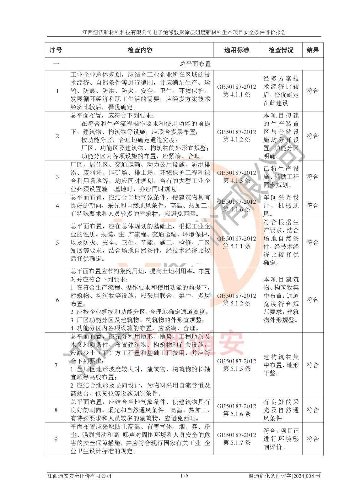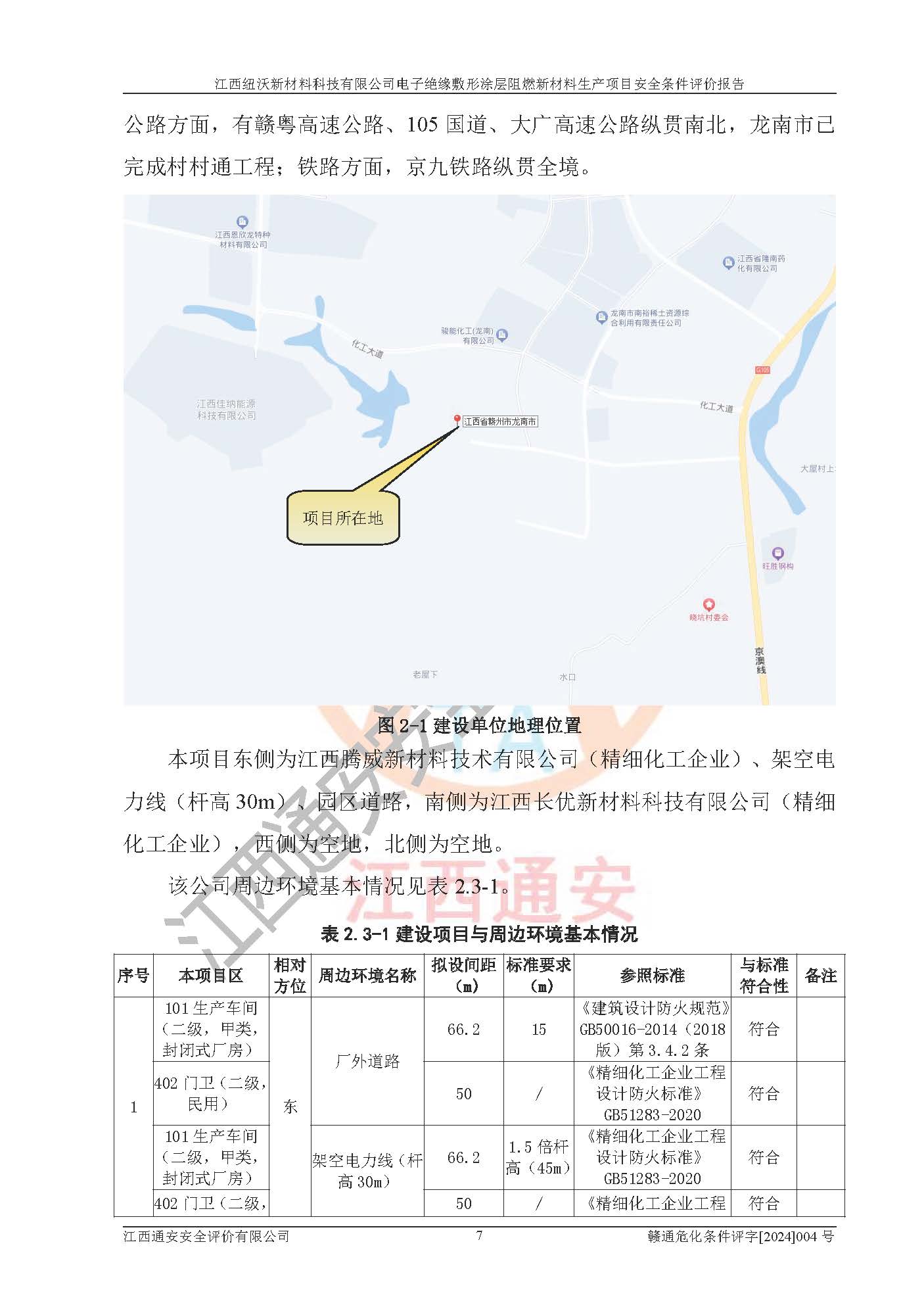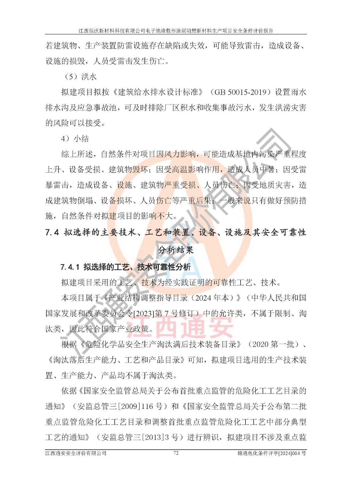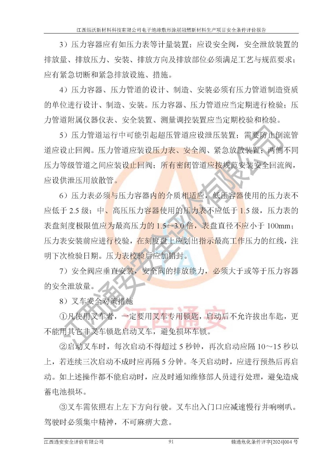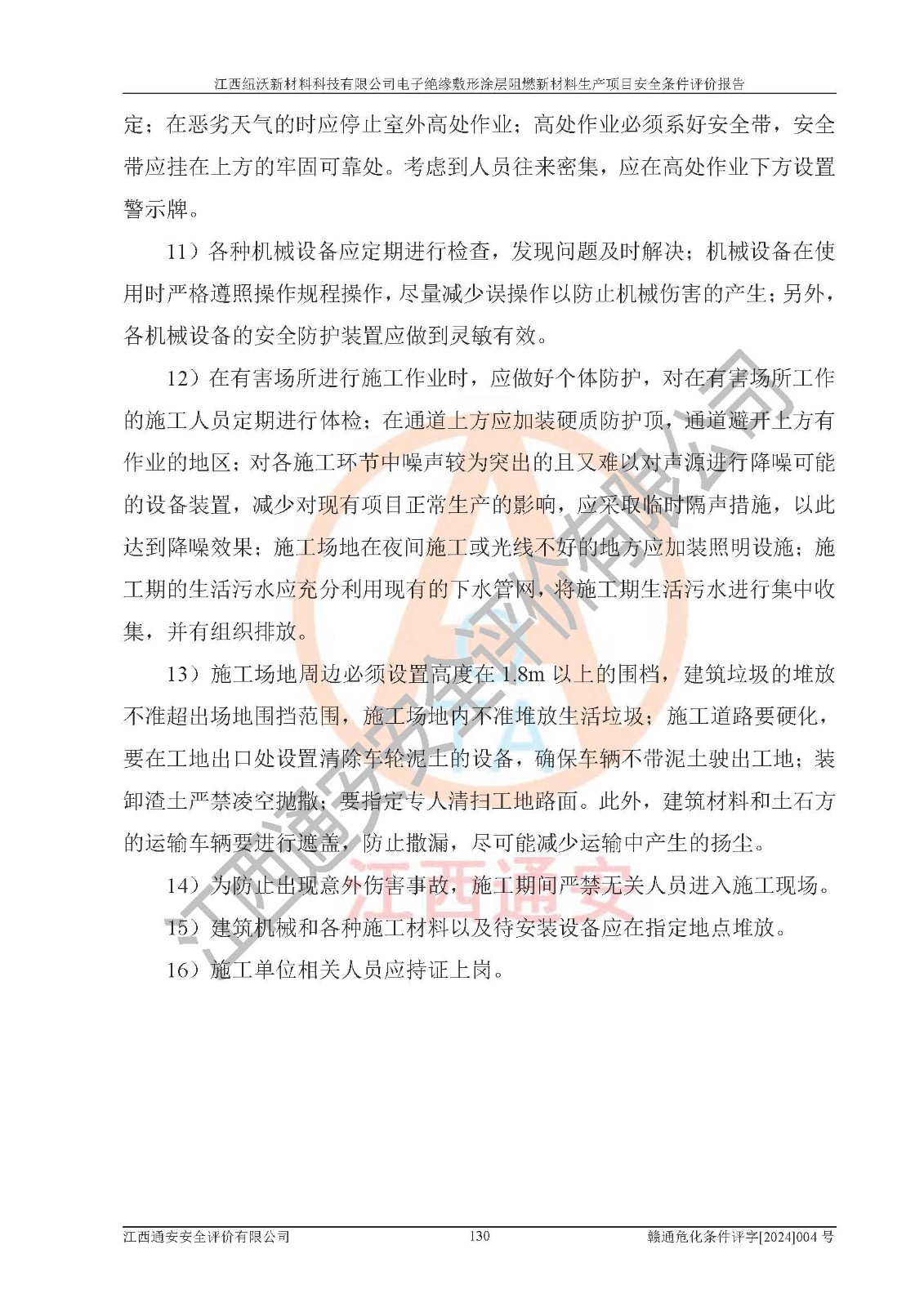 1)本項(xiàng)目依法取得了《江西省企業(yè)投資項(xiàng)目備案通知書》、《建設(shè)用地規(guī)劃許可證》,符合地方產(chǎn)業(yè)發(fā)展規(guī)劃的要求。 2)根據(jù)《**安全監(jiān)管總局關(guān)于公布首批重點(diǎn)監(jiān)管的危險(xiǎn)化工工藝目錄的通知》(安監(jiān)總管三[2009]116號(hào))和《**安全監(jiān)管總局關(guān)于公布第二批重點(diǎn)監(jiān)管危險(xiǎn)化工工藝目錄和調(diào)整首批重點(diǎn)監(jiān)管危險(xiǎn)化工工藝中部分典型工藝的通知》(安監(jiān)總管三[2013]3號(hào)),該項(xiàng)目未涉及重點(diǎn)監(jiān)管危險(xiǎn)化工工藝。 3)根據(jù)《危險(xiǎn)化學(xué)品重大危險(xiǎn)源辨識(shí)》(GB18218-2018),該項(xiàng)目未構(gòu)成危險(xiǎn)化學(xué)品重大危險(xiǎn)源。 4)項(xiàng)目存在的主要危險(xiǎn)因素有:火災(zāi)爆炸、容器爆炸、中毒窒息、灼燙、觸電、**傷害、機(jī)械傷害、高處墜落、物體打擊、淹溺等,存在的主要危害因素有:噪聲與振動(dòng)、高溫、有害化學(xué)物質(zhì)等;引起事故的原因有人的不安全行為、物的不安全狀態(tài)、管理缺陷和環(huán)境不良。其中*主要的危險(xiǎn)有害因素是火災(zāi)爆炸。 5)采用預(yù)先危險(xiǎn)性分析法評(píng)價(jià),結(jié)果為: (1)通過預(yù)先危險(xiǎn)(PHA)分析可知,項(xiàng)目廠址及總體布局單元存在周邊環(huán)境相互影響,發(fā)生異常情況,可對(duì)周邊企業(yè)生產(chǎn)經(jīng)營活動(dòng)、人員活動(dòng)產(chǎn)生影響;存在自然條件影響,可因雷擊、暴雨等引起事故;存在**傷害、建筑物危害,其固有的危險(xiǎn)性等級(jí)為Ⅱ級(jí),屬于“臨界的”,應(yīng)予以排除、采取控制措施因素。 (2)生產(chǎn)作業(yè)存在的危險(xiǎn)因素包括火災(zāi)爆炸、觸電、灼燙、中毒窒息固有的危險(xiǎn)等級(jí)為Ⅲ級(jí),屬于“危險(xiǎn)的”,可能導(dǎo)致人員傷亡和系統(tǒng)損壞的因素,需要采取防范和對(duì)策措施的因素;其它危險(xiǎn)因素固有的危險(xiǎn)等級(jí)為Ⅱ級(jí),屬于“臨界的”,應(yīng)予以排除、采取控制措施因素。 (3)生產(chǎn)作業(yè)存在的噪聲、粉塵、高溫、有害化學(xué)物質(zhì)的危險(xiǎn)有害因素等級(jí)為Ⅱ級(jí),屬于“臨界的”,應(yīng)予以排除、采取控制措施因素。 6)危險(xiǎn)度評(píng)價(jià)分析,結(jié)果為: 生產(chǎn)裝置危險(xiǎn)度評(píng)價(jià)分析:101生產(chǎn)車間為**危險(xiǎn)(Ⅰ級(jí))。 儲(chǔ)存單元危險(xiǎn)度評(píng)價(jià)分析:202甲類倉庫為**危險(xiǎn)(Ⅰ級(jí)),201丙類倉庫為低度危險(xiǎn)(Ⅲ級(jí))。 7)作業(yè)條件危險(xiǎn)性評(píng)價(jià)結(jié)果:在選定的評(píng)價(jià)單元中,其危險(xiǎn)分值均在70以下,危險(xiǎn)程度基本屬于“可能危險(xiǎn)”、“稍有危險(xiǎn)”范圍,作業(yè)條件相對(duì)安全。企業(yè)經(jīng)營過程中首先應(yīng)重點(diǎn)加強(qiáng)對(duì)甲類車間、甲類倉庫的危險(xiǎn)因素的嚴(yán)格控制,注重日常安全管理;其次要建立健全完善的安全生產(chǎn)責(zé)任制、安全管理制度、安全技術(shù)操作規(guī)程并**其貫徹落實(shí);第三要認(rèn)真抓好操作人員、管理人員的安全知識(shí)和操作技能的培訓(xùn),**人員具有與工程技術(shù)水平相適應(yīng)的技術(shù)素質(zhì)和安全素質(zhì),**安全作業(yè)。 8)項(xiàng)目建設(shè)場(chǎng)地符合當(dāng)?shù)匾?guī)劃要求,建設(shè)場(chǎng)地通過合理規(guī)劃,其選址、周邊環(huán)境、總平面布置、交通運(yùn)輸?shù)饶芊稀吨腥A人民共和國安全生產(chǎn)法》、《危險(xiǎn)化學(xué)品安全管理?xiàng)l例》、《建筑設(shè)計(jì)防火規(guī)范》、《精細(xì)化工企業(yè)工程設(shè)計(jì)防火標(biāo)準(zhǔn)》等法規(guī)、標(biāo)準(zhǔn)、規(guī)范要求。 廠址地區(qū)地震活動(dòng)相對(duì)較弱,災(zāi)害性天氣出現(xiàn)頻率稍高,自然災(zāi)害對(duì)項(xiàng)目建設(shè)具有**影響,通過采取相應(yīng)的防護(hù)措施,自然條件適宜建設(shè)。 9)建設(shè)項(xiàng)目符合**產(chǎn)業(yè)政策的要求;選擇工藝為現(xiàn)行成熟工藝,其安全可靠性可得到**。 10)本報(bào)告已根據(jù)有關(guān)安全生產(chǎn)法律、法規(guī)、規(guī)章和**標(biāo)準(zhǔn)、行業(yè)標(biāo)準(zhǔn),并嚴(yán)格執(zhí)行省委辦公廳省**辦公廳《關(guān)于全面加強(qiáng)危險(xiǎn)化學(xué)品安全生產(chǎn)工作的實(shí)施意見》(贛辦發(fā)[2020]32號(hào))及鄱陽湖生態(tài)經(jīng)濟(jì)區(qū)、長(zhǎng)江經(jīng)濟(jì)帶、“五河一湖”相關(guān)政策規(guī)定,客觀、公正、科學(xué)地進(jìn)行安全評(píng)價(jià),項(xiàng)目符合《江西省應(yīng)急管理廳關(guān)于印發(fā)《江西省危險(xiǎn)化學(xué)品建設(shè)項(xiàng)目安全監(jiān)督管理實(shí)施細(xì)則》(試行)的通知》(贛應(yīng)急字[2021]100號(hào))的要求。 11)本報(bào)告結(jié)合工藝特征,提出應(yīng)采取的對(duì)應(yīng)的自動(dòng)化控制系統(tǒng)及自動(dòng)化實(shí)施方案,滿足《江西省應(yīng)急管理廳關(guān)于印發(fā)《江西省化工企業(yè)自動(dòng)化提升實(shí)施方案》(試行)的通知》(贛應(yīng)急字[2021]190號(hào))的要求。 綜上所述:江西紐沃新材料科技有限公司電