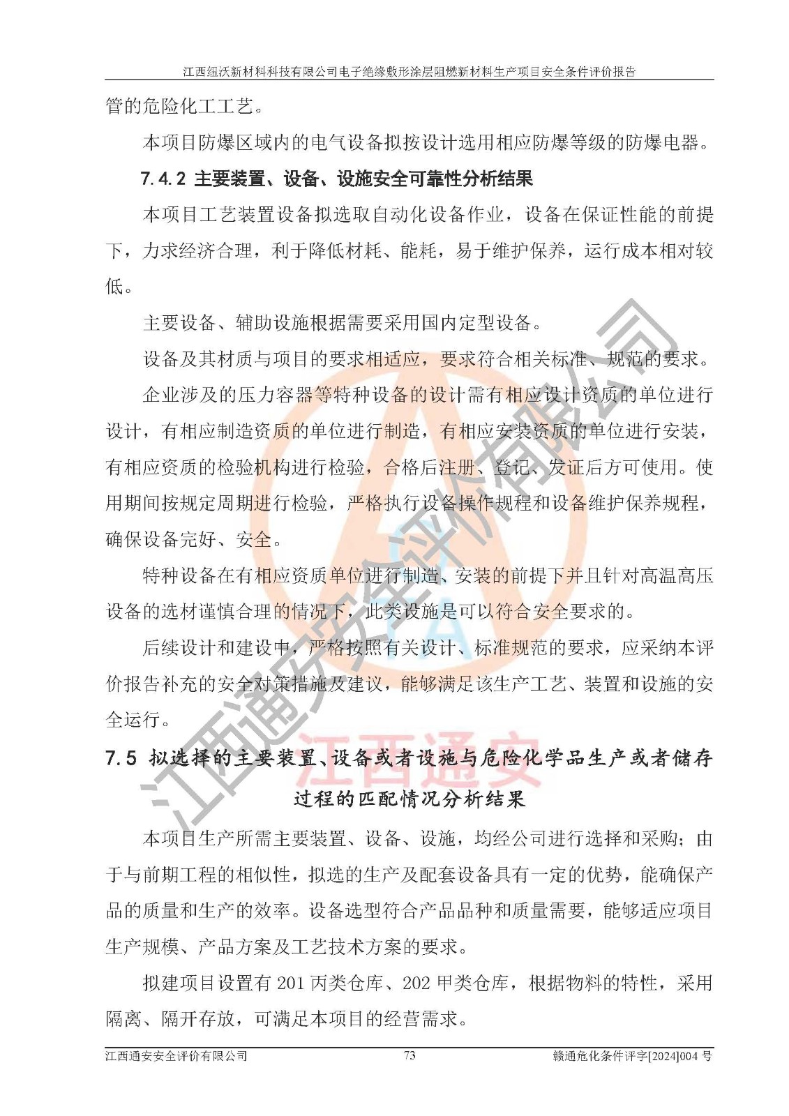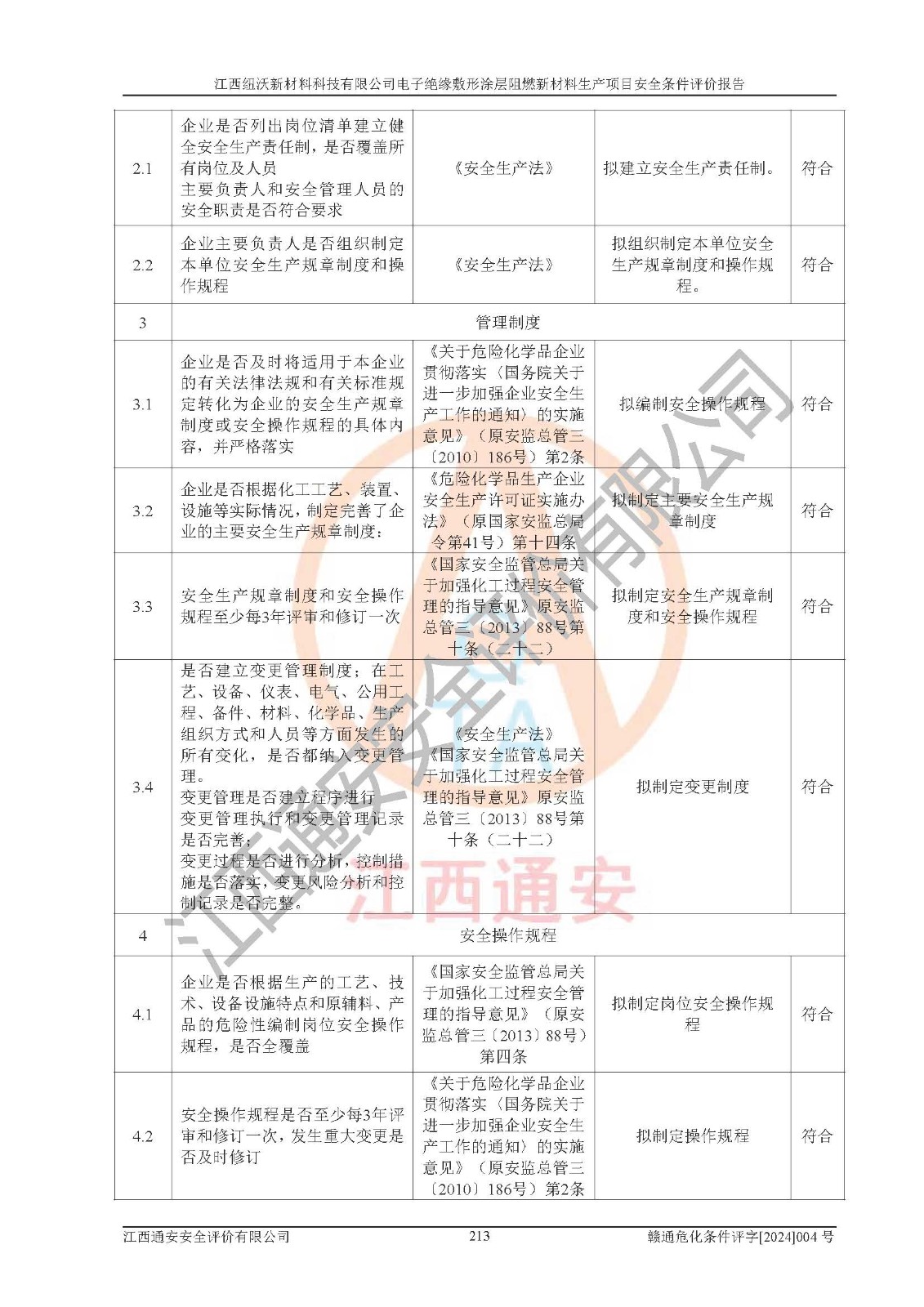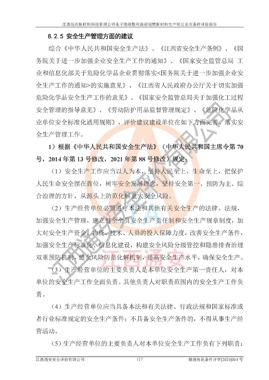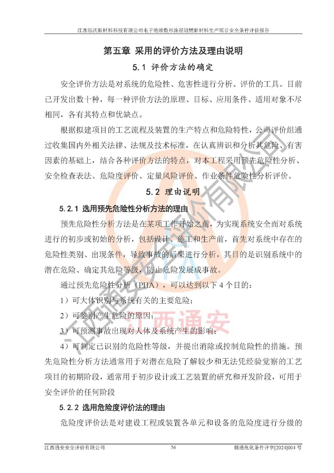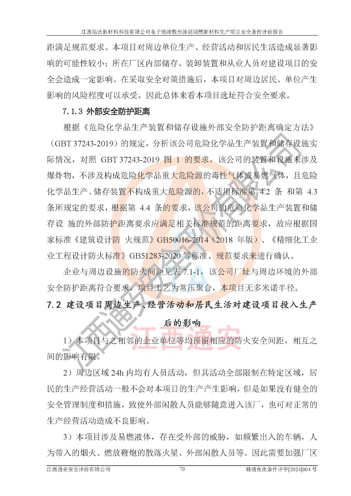 1)本項(xiàng)目依法取得了《江西省企業(yè)投資項(xiàng)目備案通知書》、《建設(shè)用地規(guī)劃許可證》,符合地方產(chǎn)業(yè)發(fā)展規(guī)劃的要求。 2)根據(jù)《**安全監(jiān)管總局關(guān)于公布首批重點(diǎn)監(jiān)管的危險(xiǎn)化工工藝目錄的通知》(安監(jiān)總管三[2009]116號(hào))和《**安全監(jiān)管總局關(guān)于公布第二批重點(diǎn)監(jiān)管危險(xiǎn)化工工藝目錄和調(diào)整首批重點(diǎn)監(jiān)管危險(xiǎn)化工工藝中部分典型工藝的通知》(安監(jiān)總管三[2013]3號(hào)),該項(xiàng)目未涉及重點(diǎn)監(jiān)管危險(xiǎn)化工工藝。 3)根據(jù)《危險(xiǎn)化學(xué)品重大危險(xiǎn)源辨識(shí)》(GB18218-2018),該項(xiàng)目未構(gòu)成危險(xiǎn)化學(xué)品重大危險(xiǎn)源。 4)項(xiàng)目存在的主要危險(xiǎn)因素有:火災(zāi)爆炸、容器爆炸、中毒窒息、灼燙、觸電、**傷害、機(jī)械傷害、高處墜落、物體打擊、淹溺等,存在的主要危害因素有:噪聲與振動(dòng)、高溫、有害化學(xué)物質(zhì)等;引起事故的原因有人的不安全行為、物的不安全狀態(tài)、管理缺陷和環(huán)境不良。其中*主要的危險(xiǎn)有害因素是火災(zāi)爆炸。 5)采用預(yù)先危險(xiǎn)性分析法評(píng)價(jià),結(jié)果為: (1)通過預(yù)先危險(xiǎn)(PHA)分析可知,項(xiàng)目廠址及總體布局單元存在周邊環(huán)境相互影響,發(fā)生異常情況,可對(duì)周邊企業(yè)生產(chǎn)經(jīng)營活動(dòng)、人員活動(dòng)產(chǎn)生影響;存在自然條件影響,可因雷擊、暴雨等引起事故;存在**傷害、建筑物危害,其固有的危險(xiǎn)性等級(jí)為Ⅱ級(jí),屬于“臨界的”,應(yīng)予以排除、采取控制措施因素。 (2)生產(chǎn)作業(yè)存在的危險(xiǎn)因素包括火災(zāi)爆炸、觸電、灼燙、中毒窒息固有的危險(xiǎn)等級(jí)為Ⅲ級(jí),屬于“危險(xiǎn)的”,可能導(dǎo)致人員傷亡和系統(tǒng)損壞的因素,需要采取防范和對(duì)策措施的因素;其它危險(xiǎn)因素固有的危險(xiǎn)等級(jí)為Ⅱ級(jí),屬于“臨界的”,應(yīng)予以排除、采取控制措施因素。 (3)生產(chǎn)作業(yè)存在的噪聲、粉塵、高溫、有害化學(xué)物質(zhì)的危險(xiǎn)有害因素等級(jí)為Ⅱ級(jí),屬于“臨界的”,應(yīng)予以排除、采取控制措施因素。 6)危險(xiǎn)度評(píng)價(jià)分析,結(jié)果為: 生產(chǎn)裝置危險(xiǎn)度評(píng)價(jià)分析:101生產(chǎn)車間為**危險(xiǎn)(Ⅰ級(jí))。 儲(chǔ)存單元危險(xiǎn)度評(píng)價(jià)分析:202甲類倉庫為**危險(xiǎn)(Ⅰ級(jí)),201丙類倉庫為低度危險(xiǎn)(Ⅲ級(jí))。 7)作業(yè)條件危險(xiǎn)性評(píng)價(jià)結(jié)果:在選定的評(píng)價(jià)單元中,其危險(xiǎn)分值均在70以下,危險(xiǎn)程度基本屬于“可能危險(xiǎn)”、“稍有危險(xiǎn)”范圍,作業(yè)條件相對(duì)安全。企業(yè)經(jīng)營過程中首先應(yīng)重點(diǎn)加強(qiáng)對(duì)甲類車間、甲類倉庫的危險(xiǎn)因素的嚴(yán)格控制,注重日常安全管理;其次要建立健全完善的安全生產(chǎn)責(zé)任制、安全管理制度、安全技術(shù)操作規(guī)程并**其貫徹落實(shí);第三要認(rèn)真抓好操作人員、管理人員的安全知識(shí)和操作技能的培訓(xùn),**人員具有與工程技術(shù)水平相適應(yīng)的技術(shù)素質(zhì)和安全素質(zhì),**安全作業(yè)。 8)項(xiàng)目建設(shè)場(chǎng)地符合當(dāng)?shù)匾?guī)劃要求,建設(shè)場(chǎng)地通過合理規(guī)劃,其選址、周邊環(huán)境、總平面布置、交通運(yùn)輸?shù)饶芊稀吨腥A人民共和國安全生產(chǎn)法》、《危險(xiǎn)化學(xué)品安全管理?xiàng)l例》、《建筑設(shè)計(jì)防火規(guī)范》、《精細(xì)化工企業(yè)工程設(shè)計(jì)防火標(biāo)準(zhǔn)》等法規(guī)、標(biāo)準(zhǔn)、規(guī)范要求。 廠址地區(qū)地震活動(dòng)相對(duì)較弱,災(zāi)害性天氣出現(xiàn)頻率稍高,自然災(zāi)害對(duì)項(xiàng)目建設(shè)具有**影響,通過采取相應(yīng)的防護(hù)措施,自然條件適宜建設(shè)。 9)建設(shè)項(xiàng)目符合**產(chǎn)業(yè)政策的要求;選擇工藝為現(xiàn)行成熟工藝,其安全可靠性可得到**。 10)本報(bào)告已根據(jù)有關(guān)安全生產(chǎn)法律、法規(guī)、規(guī)章和**標(biāo)準(zhǔn)、行業(yè)標(biāo)準(zhǔn),并嚴(yán)格執(zhí)行省委辦公廳省**辦公廳《關(guān)于全面加強(qiáng)危險(xiǎn)化學(xué)品安全生產(chǎn)工作的實(shí)施意見》(贛辦發(fā)[2020]32號(hào))及鄱陽湖生態(tài)經(jīng)濟(jì)區(qū)、長(zhǎng)江經(jīng)濟(jì)帶、“五河一湖”相關(guān)政策規(guī)定,客觀、公正、科學(xué)地進(jìn)行安全評(píng)價(jià),項(xiàng)目符合《江西省應(yīng)急管理廳關(guān)于印發(fā)《江西省危險(xiǎn)化學(xué)品建設(shè)項(xiàng)目安全監(jiān)督管理實(shí)施細(xì)則》(試行)的通知》(贛應(yīng)急字[2021]100號(hào))的要求。 11)本報(bào)告結(jié)合工藝特征,提出應(yīng)采取的對(duì)應(yīng)的自動(dòng)化控制系統(tǒng)及自動(dòng)化實(shí)施方案,滿足《江西省應(yīng)急管理廳關(guān)于印發(fā)《江西省化工企業(yè)自動(dòng)化提升實(shí)施方案》(試行)的通知》(贛應(yīng)急字[2021]190號(hào))的要求。 綜上所述:江西紐沃新材料科技有限公司電