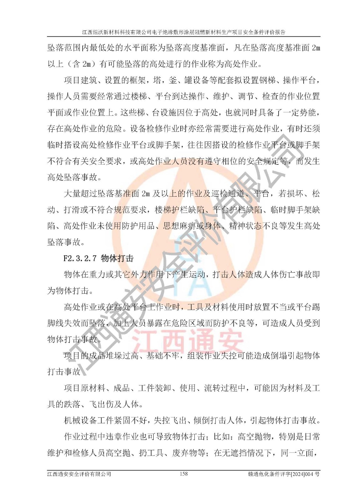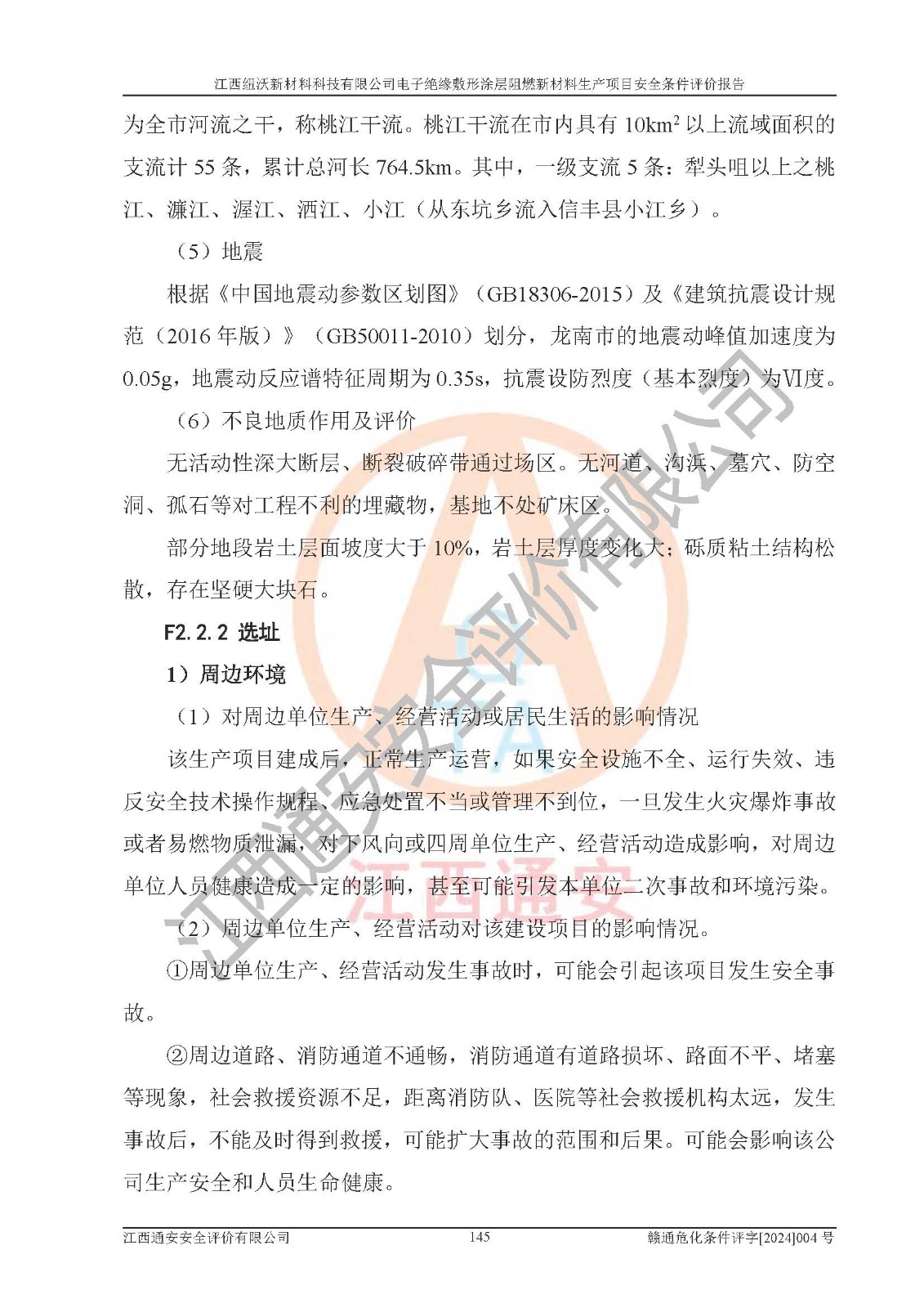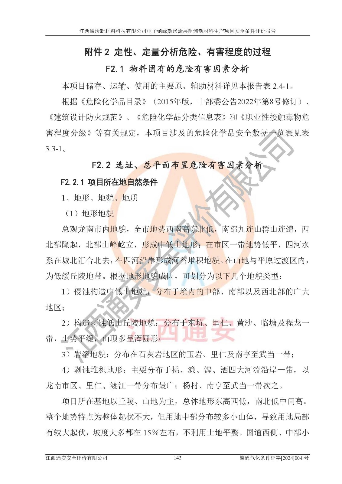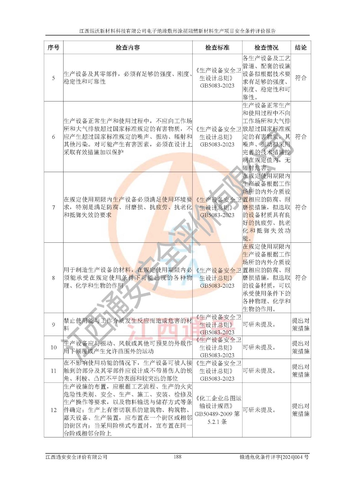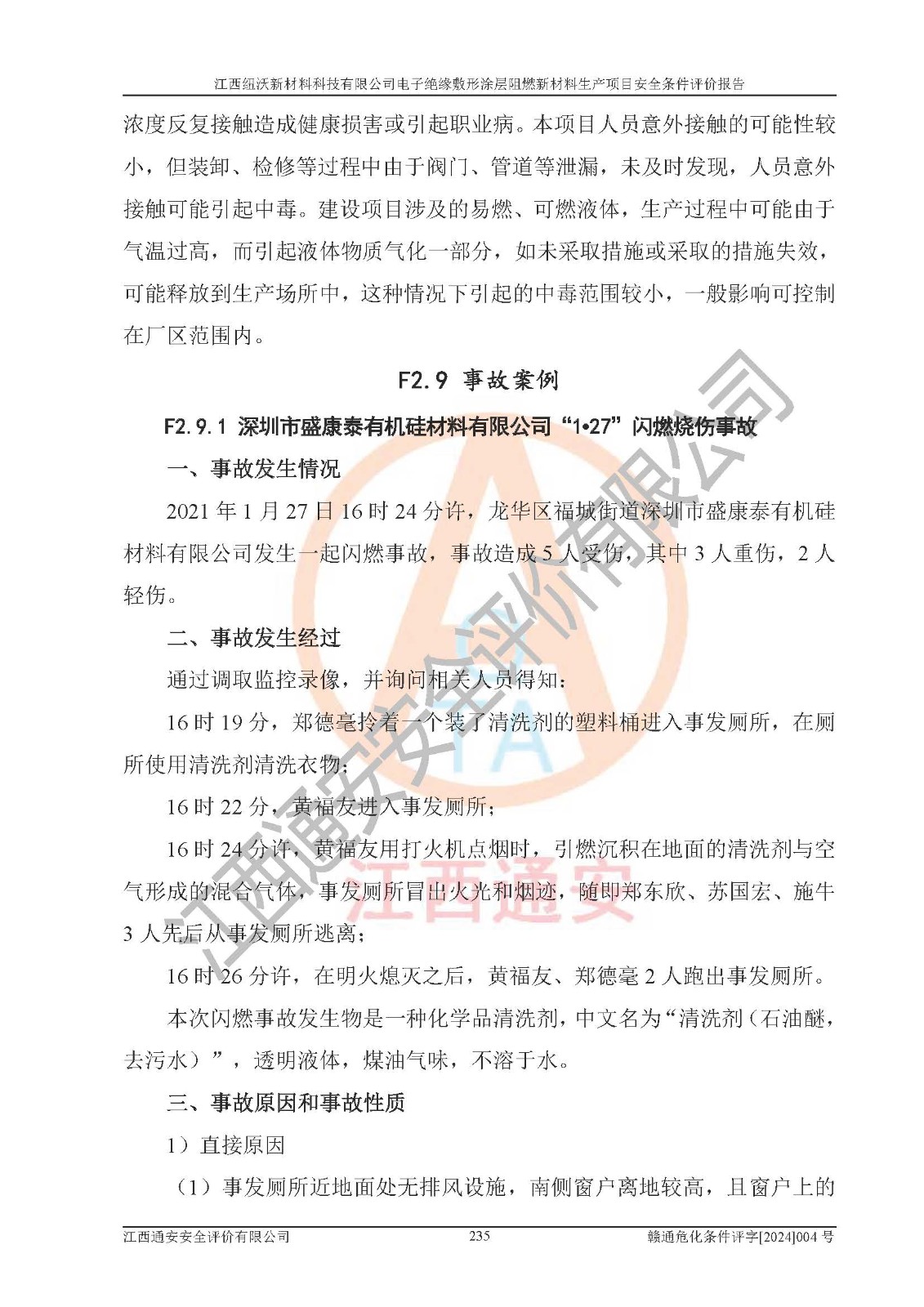 1)本項(xiàng)目依法取得了《江西省企業(yè)投資項(xiàng)目備案通知書》、《建設(shè)用地規(guī)劃許可證》,符合地方產(chǎn)業(yè)發(fā)展規(guī)劃的要求。 2)根據(jù)《**安全監(jiān)管總局關(guān)于公布首批重點(diǎn)監(jiān)管的危險(xiǎn)化工工藝目錄的通知》(安監(jiān)總管三[2009]116號(hào))和《**安全監(jiān)管總局關(guān)于公布第二批重點(diǎn)監(jiān)管危險(xiǎn)化工工藝目錄和調(diào)整首批重點(diǎn)監(jiān)管危險(xiǎn)化工工藝中部分典型工藝的通知》(安監(jiān)總管三[2013]3號(hào)),該項(xiàng)目未涉及重點(diǎn)監(jiān)管危險(xiǎn)化工工藝。 3)根據(jù)《危險(xiǎn)化學(xué)品重大危險(xiǎn)源辨識(shí)》(GB18218-2018),該項(xiàng)目未構(gòu)成危險(xiǎn)化學(xué)品重大危險(xiǎn)源。 4)項(xiàng)目存在的主要危險(xiǎn)因素有:火災(zāi)爆炸、容器爆炸、中毒窒息、灼燙、觸電、**傷害、機(jī)械傷害、高處墜落、物體打擊、淹溺等,存在的主要危害因素有:噪聲與振動(dòng)、高溫、有害化學(xué)物質(zhì)等;引起事故的原因有人的不安全行為、物的不安全狀態(tài)、管理缺陷和環(huán)境不良。其中*主要的危險(xiǎn)有害因素是火災(zāi)爆炸。 5)采用預(yù)先危險(xiǎn)性分析法評(píng)價(jià),結(jié)果為: (1)通過預(yù)先危險(xiǎn)(PHA)分析可知,項(xiàng)目廠址及總體布局單元存在周邊環(huán)境相互影響,發(fā)生異常情況,可對(duì)周邊企業(yè)生產(chǎn)經(jīng)營活動(dòng)、人員活動(dòng)產(chǎn)生影響;存在自然條件影響,可因雷擊、暴雨等引起事故;存在**傷害、建筑物危害,其固有的危險(xiǎn)性等級(jí)為Ⅱ級(jí),屬于“臨界的”,應(yīng)予以排除、采取控制措施因素。 (2)生產(chǎn)作業(yè)存在的危險(xiǎn)因素包括火災(zāi)爆炸、觸電、灼燙、中毒窒息固有的危險(xiǎn)等級(jí)為Ⅲ級(jí),屬于“危險(xiǎn)的”,可能導(dǎo)致人員傷亡和系統(tǒng)損壞的因素,需要采取防范和對(duì)策措施的因素;其它危險(xiǎn)因素固有的危險(xiǎn)等級(jí)為Ⅱ級(jí),屬于“臨界的”,應(yīng)予以排除、采取控制措施因素。 (3)生產(chǎn)作業(yè)存在的噪聲、粉塵、高溫、有害化學(xué)物質(zhì)的危險(xiǎn)有害因素等級(jí)為Ⅱ級(jí),屬于“臨界的”,應(yīng)予以排除、采取控制措施因素。 6)危險(xiǎn)度評(píng)價(jià)分析,結(jié)果為: 生產(chǎn)裝置危險(xiǎn)度評(píng)價(jià)分析:101生產(chǎn)車間為**危險(xiǎn)(Ⅰ級(jí))。 儲(chǔ)存單元危險(xiǎn)度評(píng)價(jià)分析:202甲類倉庫為**危險(xiǎn)(Ⅰ級(jí)),201丙類倉庫為低度危險(xiǎn)(Ⅲ級(jí))。 7)作業(yè)條件危險(xiǎn)性評(píng)價(jià)結(jié)果:在選定的評(píng)價(jià)單元中,其危險(xiǎn)分值均在70以下,危險(xiǎn)程度基本屬于“可能危險(xiǎn)”、“稍有危險(xiǎn)”范圍,作業(yè)條件相對(duì)安全。企業(yè)經(jīng)營過程中首先應(yīng)重點(diǎn)加強(qiáng)對(duì)甲類車間、甲類倉庫的危險(xiǎn)因素的嚴(yán)格控制,注重日常安全管理;其次要建立健全完善的安全生產(chǎn)責(zé)任制、安全管理制度、安全技術(shù)操作規(guī)程并**其貫徹落實(shí);第三要認(rèn)真抓好操作人員、管理人員的安全知識(shí)和操作技能的培訓(xùn),**人員具有與工程技術(shù)水平相適應(yīng)的技術(shù)素質(zhì)和安全素質(zhì),**安全作業(yè)。 8)項(xiàng)目建設(shè)場(chǎng)地符合當(dāng)?shù)匾?guī)劃要求,建設(shè)場(chǎng)地通過合理規(guī)劃,其選址、周邊環(huán)境、總平面布置、交通運(yùn)輸?shù)饶芊稀吨腥A人民共和國安全生產(chǎn)法》、《危險(xiǎn)化學(xué)品安全管理?xiàng)l例》、《建筑設(shè)計(jì)防火規(guī)范》、《精細(xì)化工企業(yè)工程設(shè)計(jì)防火標(biāo)準(zhǔn)》等法規(guī)、標(biāo)準(zhǔn)、規(guī)范要求。 廠址地區(qū)地震活動(dòng)相對(duì)較弱,災(zāi)害性天氣出現(xiàn)頻率稍高,自然災(zāi)害對(duì)項(xiàng)目建設(shè)具有**影響,通過采取相應(yīng)的防護(hù)措施,自然條件適宜建設(shè)。 9)建設(shè)項(xiàng)目符合**產(chǎn)業(yè)政策的要求;選擇工藝為現(xiàn)行成熟工藝,其安全可靠性可得到**。 10)本報(bào)告已根據(jù)有關(guān)安全生產(chǎn)法律、法規(guī)、規(guī)章和**標(biāo)準(zhǔn)、行業(yè)標(biāo)準(zhǔn),并嚴(yán)格執(zhí)行省委辦公廳省**辦公廳《關(guān)于全面加強(qiáng)危險(xiǎn)化學(xué)品安全生產(chǎn)工作的實(shí)施意見》(贛辦發(fā)[2020]32號(hào))及鄱陽湖生態(tài)經(jīng)濟(jì)區(qū)、長(zhǎng)江經(jīng)濟(jì)帶、“五河一湖”相關(guān)政策規(guī)定,客觀、公正、科學(xué)地進(jìn)行安全評(píng)價(jià),項(xiàng)目符合《江西省應(yīng)急管理廳關(guān)于印發(fā)《江西省危險(xiǎn)化學(xué)品建設(shè)項(xiàng)目安全監(jiān)督管理實(shí)施細(xì)則》(試行)的通知》(贛應(yīng)急字[2021]100號(hào))的要求。 11)本報(bào)告結(jié)合工藝特征,提出應(yīng)采取的對(duì)應(yīng)的自動(dòng)化控制系統(tǒng)及自動(dòng)化實(shí)施方案,滿足《江西省應(yīng)急管理廳關(guān)于印發(fā)《江西省化工企業(yè)自動(dòng)化提升實(shí)施方案》(試行)的通知》(贛應(yīng)急字[2021]190號(hào))的要求。 綜上所述:江西紐沃新材料科技有限公司電