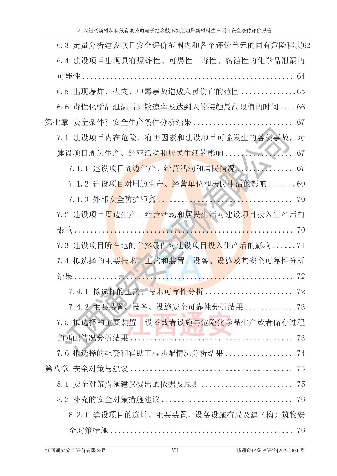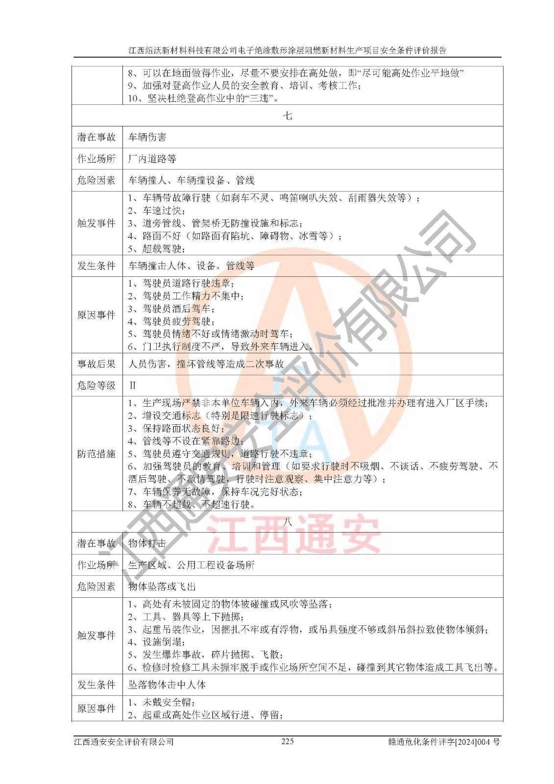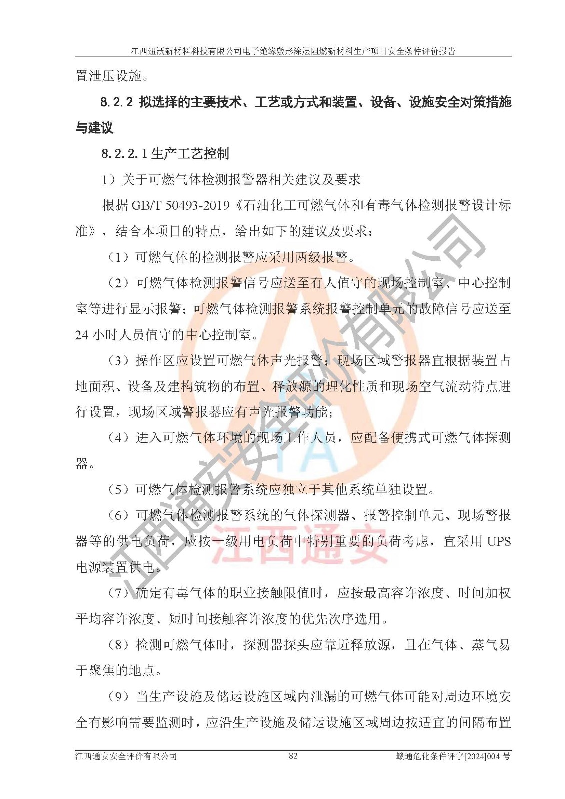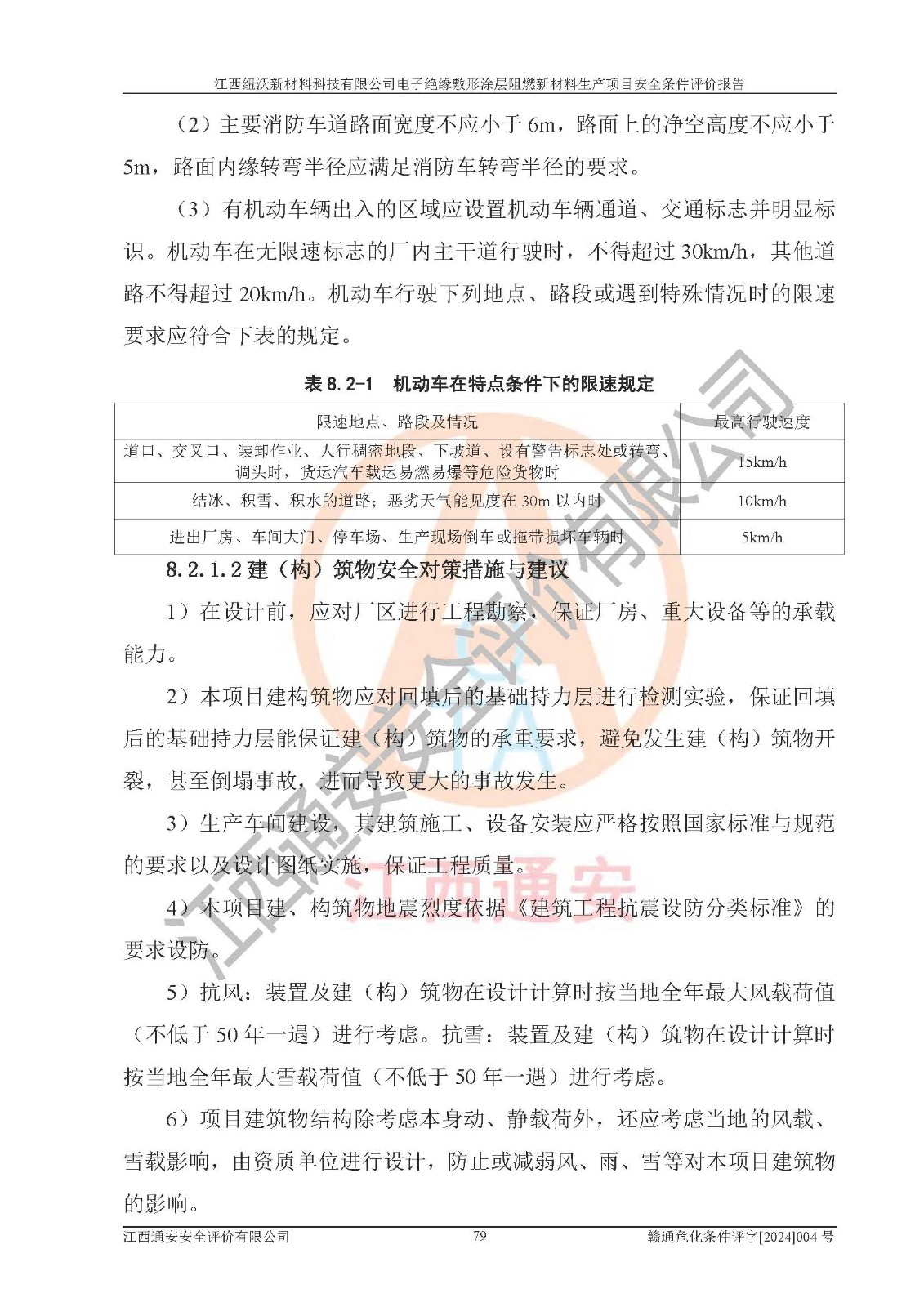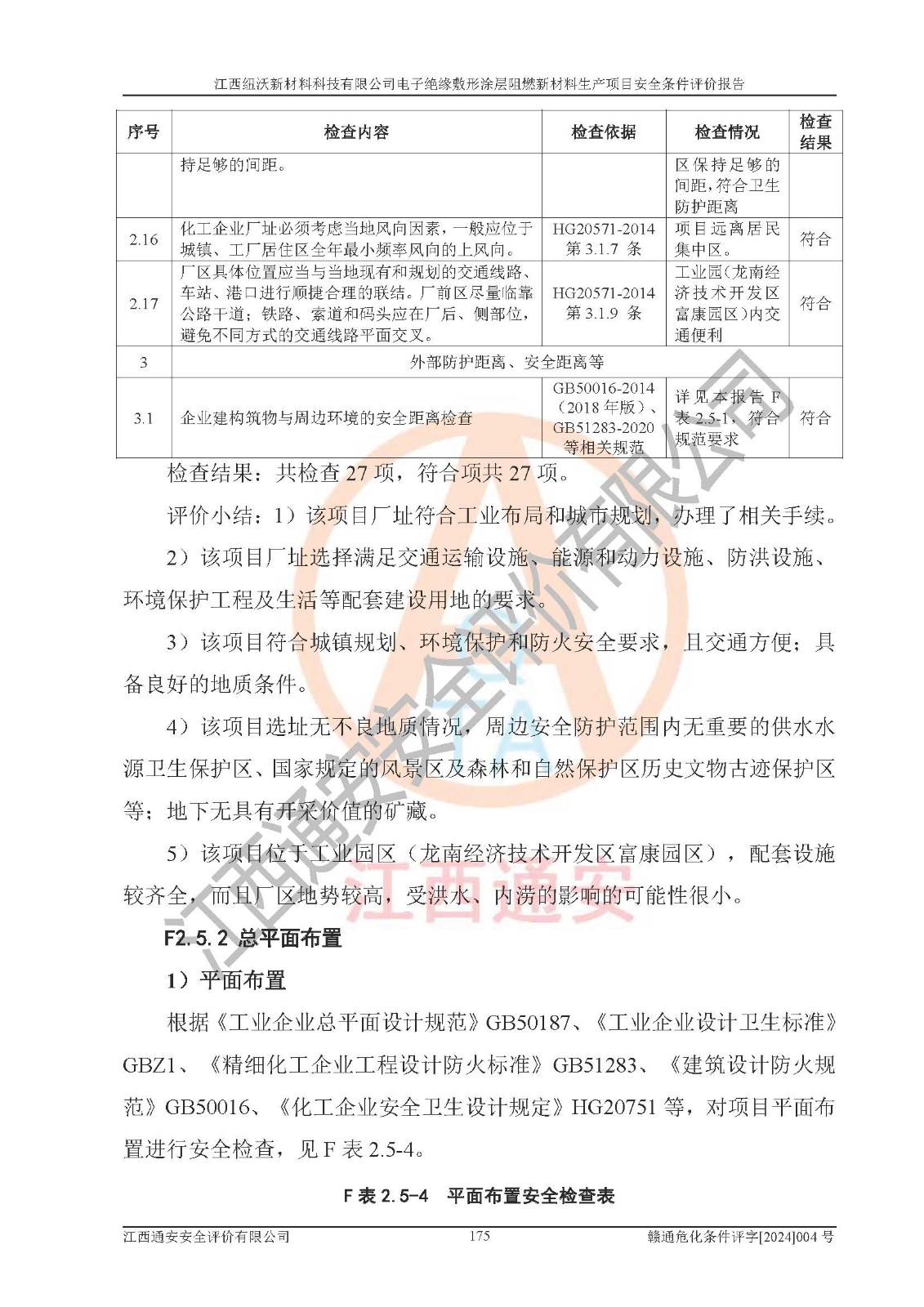 1)本項(xiàng)目依法取得了《江西省企業(yè)投資項(xiàng)目備案通知書》、《建設(shè)用地規(guī)劃許可證》,符合地方產(chǎn)業(yè)發(fā)展規(guī)劃的要求。 2)根據(jù)《**安全監(jiān)管總局關(guān)于公布首批重點(diǎn)監(jiān)管的危險(xiǎn)化工工藝目錄的通知》(安監(jiān)總管三[2009]116號(hào))和《**安全監(jiān)管總局關(guān)于公布第二批重點(diǎn)監(jiān)管危險(xiǎn)化工工藝目錄和調(diào)整首批重點(diǎn)監(jiān)管危險(xiǎn)化工工藝中部分典型工藝的通知》(安監(jiān)總管三[2013]3號(hào)),該項(xiàng)目未涉及重點(diǎn)監(jiān)管危險(xiǎn)化工工藝。 3)根據(jù)《危險(xiǎn)化學(xué)品重大危險(xiǎn)源辨識(shí)》(GB18218-2018),該項(xiàng)目未構(gòu)成危險(xiǎn)化學(xué)品重大危險(xiǎn)源。 4)項(xiàng)目存在的主要危險(xiǎn)因素有:火災(zāi)爆炸、容器爆炸、中毒窒息、灼燙、觸電、**傷害、機(jī)械傷害、高處墜落、物體打擊、淹溺等,存在的主要危害因素有:噪聲與振動(dòng)、高溫、有害化學(xué)物質(zhì)等;引起事故的原因有人的不安全行為、物的不安全狀態(tài)、管理缺陷和環(huán)境不良。其中*主要的危險(xiǎn)有害因素是火災(zāi)爆炸。 5)采用預(yù)先危險(xiǎn)性分析法評(píng)價(jià),結(jié)果為: (1)通過預(yù)先危險(xiǎn)(PHA)分析可知,項(xiàng)目廠址及總體布局單元存在周邊環(huán)境相互影響,發(fā)生異常情況,可對(duì)周邊企業(yè)生產(chǎn)經(jīng)營活動(dòng)、人員活動(dòng)產(chǎn)生影響;存在自然條件影響,可因雷擊、暴雨等引起事故;存在**傷害、建筑物危害,其固有的危險(xiǎn)性等級(jí)為Ⅱ級(jí),屬于“臨界的”,應(yīng)予以排除、采取控制措施因素。 (2)生產(chǎn)作業(yè)存在的危險(xiǎn)因素包括火災(zāi)爆炸、觸電、灼燙、中毒窒息固有的危險(xiǎn)等級(jí)為Ⅲ級(jí),屬于“危險(xiǎn)的”,可能導(dǎo)致人員傷亡和系統(tǒng)損壞的因素,需要采取防范和對(duì)策措施的因素;其它危險(xiǎn)因素固有的危險(xiǎn)等級(jí)為Ⅱ級(jí),屬于“臨界的”,應(yīng)予以排除、采取控制措施因素。 (3)生產(chǎn)作業(yè)存在的噪聲、粉塵、高溫、有害化學(xué)物質(zhì)的危險(xiǎn)有害因素等級(jí)為Ⅱ級(jí),屬于“臨界的”,應(yīng)予以排除、采取控制措施因素。 6)危險(xiǎn)度評(píng)價(jià)分析,結(jié)果為: 生產(chǎn)裝置危險(xiǎn)度評(píng)價(jià)分析:101生產(chǎn)車間為**危險(xiǎn)(Ⅰ級(jí))。 儲(chǔ)存單元危險(xiǎn)度評(píng)價(jià)分析:202甲類倉庫為**危險(xiǎn)(Ⅰ級(jí)),201丙類倉庫為低度危險(xiǎn)(Ⅲ級(jí))。 7)作業(yè)條件危險(xiǎn)性評(píng)價(jià)結(jié)果:在選定的評(píng)價(jià)單元中,其危險(xiǎn)分值均在70以下,危險(xiǎn)程度基本屬于“可能危險(xiǎn)”、“稍有危險(xiǎn)”范圍,作業(yè)條件相對(duì)安全。企業(yè)經(jīng)營過程中首先應(yīng)重點(diǎn)加強(qiáng)對(duì)甲類車間、甲類倉庫的危險(xiǎn)因素的嚴(yán)格控制,注重日常安全管理;其次要建立健全完善的安全生產(chǎn)責(zé)任制、安全管理制度、安全技術(shù)操作規(guī)程并**其貫徹落實(shí);第三要認(rèn)真抓好操作人員、管理人員的安全知識(shí)和操作技能的培訓(xùn),**人員具有與工程技術(shù)水平相適應(yīng)的技術(shù)素質(zhì)和安全素質(zhì),**安全作業(yè)。 8)項(xiàng)目建設(shè)場(chǎng)地符合當(dāng)?shù)匾?guī)劃要求,建設(shè)場(chǎng)地通過合理規(guī)劃,其選址、周邊環(huán)境、總平面布置、交通運(yùn)輸?shù)饶芊稀吨腥A人民共和國安全生產(chǎn)法》、《危險(xiǎn)化學(xué)品安全管理?xiàng)l例》、《建筑設(shè)計(jì)防火規(guī)范》、《精細(xì)化工企業(yè)工程設(shè)計(jì)防火標(biāo)準(zhǔn)》等法規(guī)、標(biāo)準(zhǔn)、規(guī)范要求。 廠址地區(qū)地震活動(dòng)相對(duì)較弱,災(zāi)害性天氣出現(xiàn)頻率稍高,自然災(zāi)害對(duì)項(xiàng)目建設(shè)具有**影響,通過采取相應(yīng)的防護(hù)措施,自然條件適宜建設(shè)。 9)建設(shè)項(xiàng)目符合**產(chǎn)業(yè)政策的要求;選擇工藝為現(xiàn)行成熟工藝,其安全可靠性可得到**。 10)本報(bào)告已根據(jù)有關(guān)安全生產(chǎn)法律、法規(guī)、規(guī)章和**標(biāo)準(zhǔn)、行業(yè)標(biāo)準(zhǔn),并嚴(yán)格執(zhí)行省委辦公廳省**辦公廳《關(guān)于全面加強(qiáng)危險(xiǎn)化學(xué)品安全生產(chǎn)工作的實(shí)施意見》(贛辦發(fā)[2020]32號(hào))及鄱陽湖生態(tài)經(jīng)濟(jì)區(qū)、長(zhǎng)江經(jīng)濟(jì)帶、“五河一湖”相關(guān)政策規(guī)定,客觀、公正、科學(xué)地進(jìn)行安全評(píng)價(jià),項(xiàng)目符合《江西省應(yīng)急管理廳關(guān)于印發(fā)《江西省危險(xiǎn)化學(xué)品建設(shè)項(xiàng)目安全監(jiān)督管理實(shí)施細(xì)則》(試行)的通知》(贛應(yīng)急字[2021]100號(hào))的要求。 11)本報(bào)告結(jié)合工藝特征,提出應(yīng)采取的對(duì)應(yīng)的自動(dòng)化控制系統(tǒng)及自動(dòng)化實(shí)施方案,滿足《江西省應(yīng)急管理廳關(guān)于印發(fā)《江西省化工企業(yè)自動(dòng)化提升實(shí)施方案》(試行)的通知》(贛應(yīng)急字[2021]190號(hào))的要求。 綜上所述:江西紐沃新材料科技有限公司電