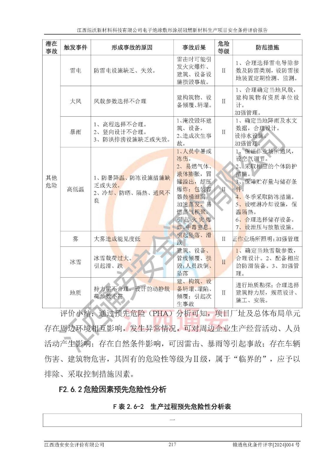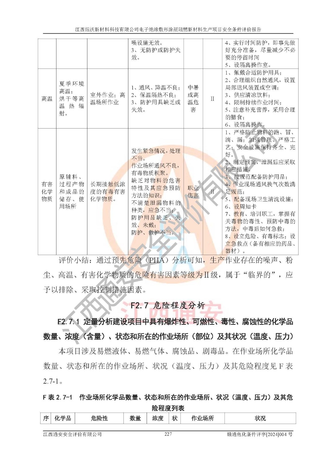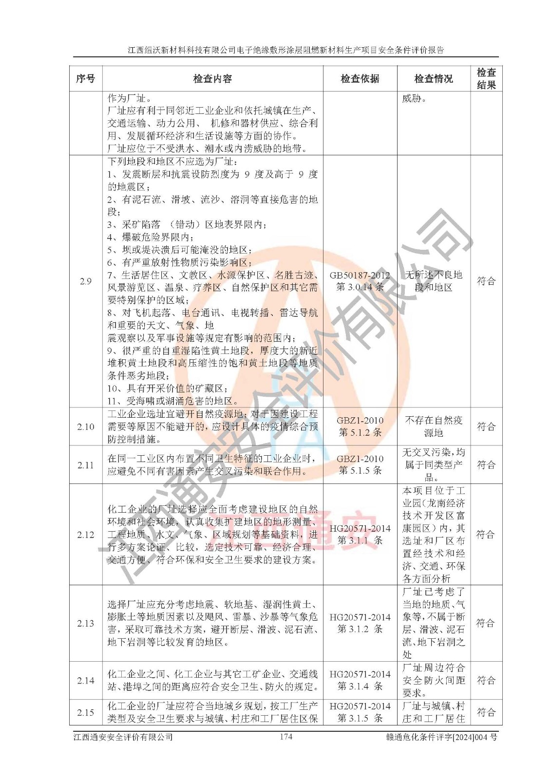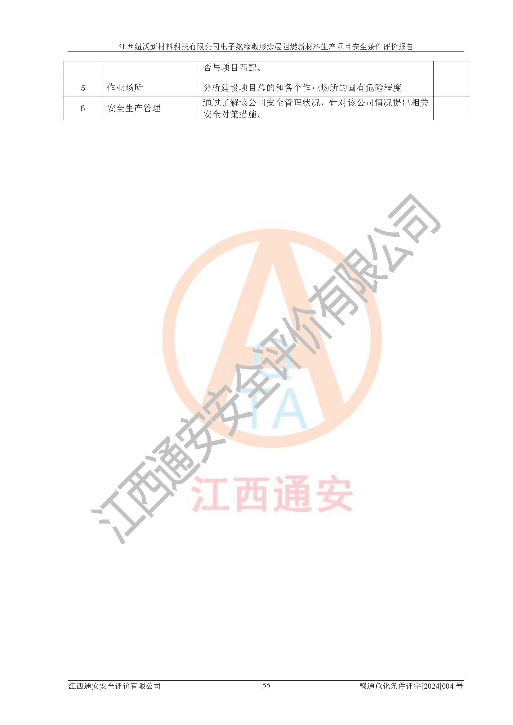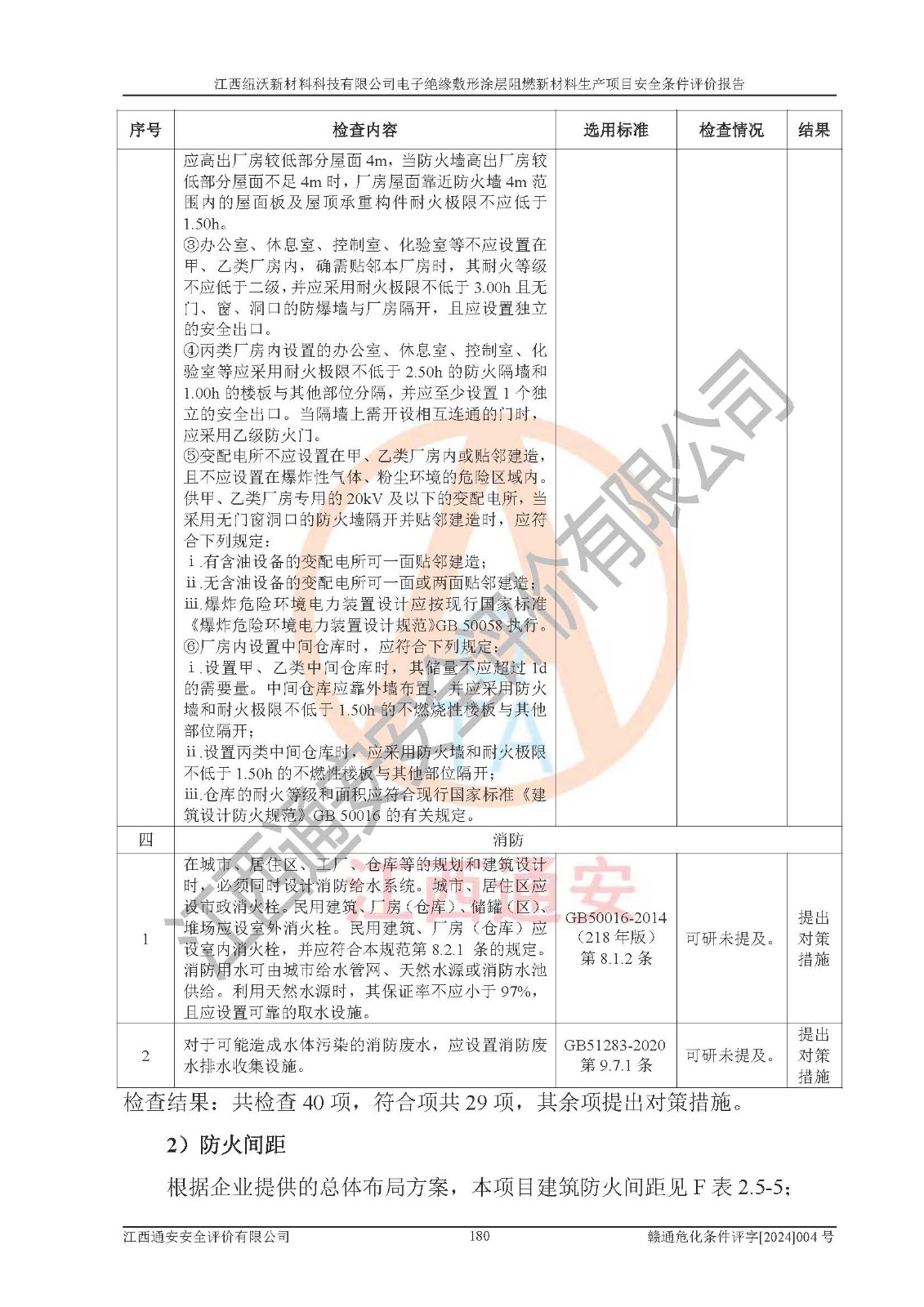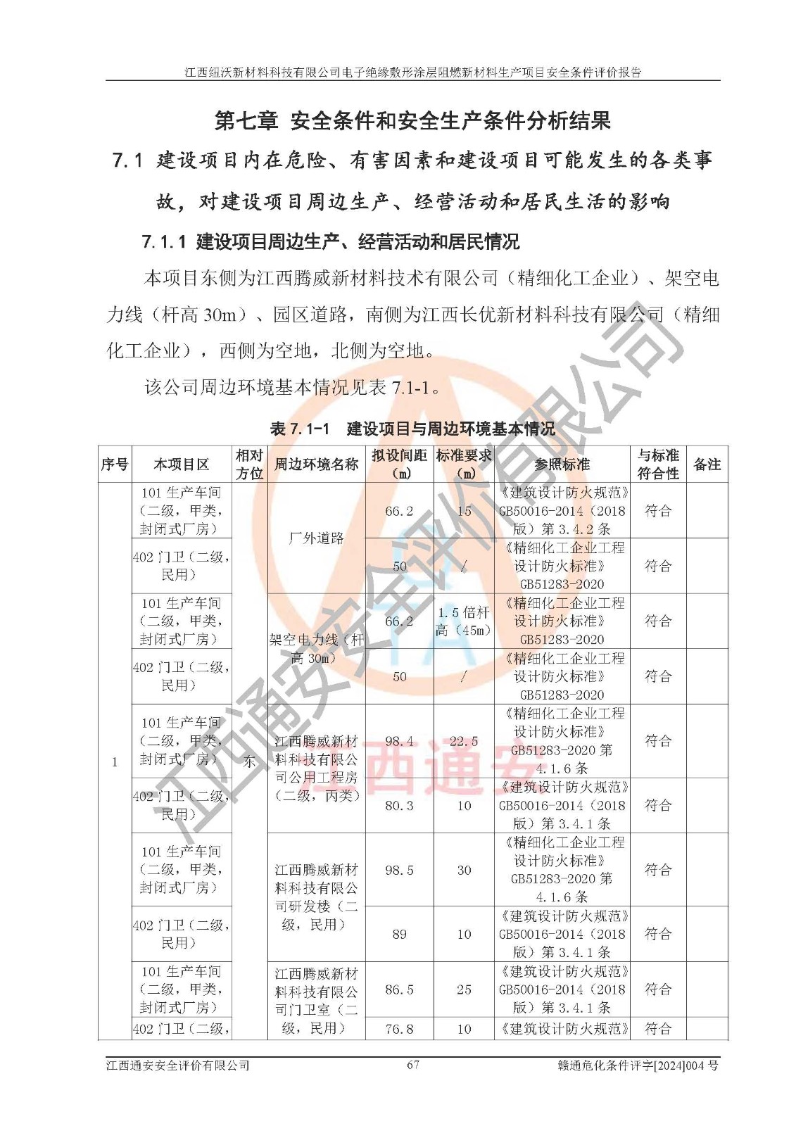1)本項(xiàng)目依法取得了《江西省企業(yè)投資項(xiàng)目備案通知書》、《建設(shè)用地規(guī)劃許可證》,符合地方產(chǎn)業(yè)發(fā)展規(guī)劃的要求。 2)根據(jù)《**安全監(jiān)管總局關(guān)于公布首批重點(diǎn)監(jiān)管的危險(xiǎn)化工工藝目錄的通知》(安監(jiān)總管三[2009]116號(hào))和《**安全監(jiān)管總局關(guān)于公布第二批重點(diǎn)監(jiān)管危險(xiǎn)化工工藝目錄和調(diào)整首批重點(diǎn)監(jiān)管危險(xiǎn)化工工藝中部分典型工藝的通知》(安監(jiān)總管三[2013]3號(hào)),該項(xiàng)目未涉及重點(diǎn)監(jiān)管危險(xiǎn)化工工藝。 3)根據(jù)《危險(xiǎn)化學(xué)品重大危險(xiǎn)源辨識(shí)》(GB18218-2018),該項(xiàng)目未構(gòu)成危險(xiǎn)化學(xué)品重大危險(xiǎn)源。 4)項(xiàng)目存在的主要危險(xiǎn)因素有:火災(zāi)爆炸、容器爆炸、中毒窒息、灼燙、觸電、**傷害、機(jī)械傷害、高處墜落、物體打擊、淹溺等,存在的主要危害因素有:噪聲與振動(dòng)、高溫、有害化學(xué)物質(zhì)等;引起事故的原因有人的不安全行為、物的不安全狀態(tài)、管理缺陷和環(huán)境不良。其中*主要的危險(xiǎn)有害因素是火災(zāi)爆炸。 5)采用預(yù)先危險(xiǎn)性分析法評(píng)價(jià),結(jié)果為: (1)通過預(yù)先危險(xiǎn)(PHA)分析可知,項(xiàng)目廠址及總體布局單元存在周邊環(huán)境相互影響,發(fā)生異常情況,可對(duì)周邊企業(yè)生產(chǎn)經(jīng)營活動(dòng)、人員活動(dòng)產(chǎn)生影響;存在自然條件影響,可因雷擊、暴雨等引起事故;存在**傷害、建筑物危害,其固有的危險(xiǎn)性等級(jí)為Ⅱ級(jí),屬于“臨界的”,應(yīng)予以排除、采取控制措施因素。 (2)生產(chǎn)作業(yè)存在的危險(xiǎn)因素包括火災(zāi)爆炸、觸電、灼燙、中毒窒息固有的危險(xiǎn)等級(jí)為Ⅲ級(jí),屬于“危險(xiǎn)的”,可能導(dǎo)致人員傷亡和系統(tǒng)損壞的因素,需要采取防范和對(duì)策措施的因素;其它危險(xiǎn)因素固有的危險(xiǎn)等級(jí)為Ⅱ級(jí),屬于“臨界的”,應(yīng)予以排除、采取控制措施因素。 (3)生產(chǎn)作業(yè)存在的噪聲、粉塵、高溫、有害化學(xué)物質(zhì)的危險(xiǎn)有害因素等級(jí)為Ⅱ級(jí),屬于“臨界的”,應(yīng)予以排除、采取控制措施因素。 6)危險(xiǎn)度評(píng)價(jià)分析,結(jié)果為: 生產(chǎn)裝置危險(xiǎn)度評(píng)價(jià)分析:101生產(chǎn)車間為**危險(xiǎn)(Ⅰ級(jí))。 儲(chǔ)存單元危險(xiǎn)度評(píng)價(jià)分析:202甲類倉庫為**危險(xiǎn)(Ⅰ級(jí)),201丙類倉庫為低度危險(xiǎn)(Ⅲ級(jí))。 7)作業(yè)條件危險(xiǎn)性評(píng)價(jià)結(jié)果:在選定的評(píng)價(jià)單元中,其危險(xiǎn)分值均在70以下,危險(xiǎn)程度基本屬于“可能危險(xiǎn)”、“稍有危險(xiǎn)”范圍,作業(yè)條件相對(duì)安全。企業(yè)經(jīng)營過程中首先應(yīng)重點(diǎn)加強(qiáng)對(duì)甲類車間、甲類倉庫的危險(xiǎn)因素的嚴(yán)格控制,注重日常安全管理;其次要建立健全完善的安全生產(chǎn)責(zé)任制、安全管理制度、安全技術(shù)操作規(guī)程并**其貫徹落實(shí);第三要認(rèn)真抓好操作人員、管理人員的安全知識(shí)和操作技能的培訓(xùn),**人員具有與工程技術(shù)水平相適應(yīng)的技術(shù)素質(zhì)和安全素質(zhì),**安全作業(yè)。 8)項(xiàng)目建設(shè)場(chǎng)地符合當(dāng)?shù)匾?guī)劃要求,建設(shè)場(chǎng)地通過合理規(guī)劃,其選址、周邊環(huán)境、總平面布置、交通運(yùn)輸?shù)饶芊稀吨腥A人民共和國安全生產(chǎn)法》、《危險(xiǎn)化學(xué)品安全管理?xiàng)l例》、《建筑設(shè)計(jì)防火規(guī)范》、《精細(xì)化工企業(yè)工程設(shè)計(jì)防火標(biāo)準(zhǔn)》等法規(guī)、標(biāo)準(zhǔn)、規(guī)范要求。 廠址地區(qū)地震活動(dòng)相對(duì)較弱,災(zāi)害性天氣出現(xiàn)頻率稍高,自然災(zāi)害對(duì)項(xiàng)目建設(shè)具有**影響,通過采取相應(yīng)的防護(hù)措施,自然條件適宜建設(shè)。 9)建設(shè)項(xiàng)目符合**產(chǎn)業(yè)政策的要求;選擇工藝為現(xiàn)行成熟工藝,其安全可靠性可得到**。 10)本報(bào)告已根據(jù)有關(guān)安全生產(chǎn)法律、法規(guī)、規(guī)章和**標(biāo)準(zhǔn)、行業(yè)標(biāo)準(zhǔn),并嚴(yán)格執(zhí)行省委辦公廳省**辦公廳《關(guān)于全面加強(qiáng)危險(xiǎn)化學(xué)品安全生產(chǎn)工作的實(shí)施意見》(贛辦發(fā)[2020]32號(hào))及鄱陽湖生態(tài)經(jīng)濟(jì)區(qū)、長(zhǎng)江經(jīng)濟(jì)帶、“五河一湖”相關(guān)政策規(guī)定,客觀、公正、科學(xué)地進(jìn)行安全評(píng)價(jià),項(xiàng)目符合《江西省應(yīng)急管理廳關(guān)于印發(fā)《江西省危險(xiǎn)化學(xué)品建設(shè)項(xiàng)目安全監(jiān)督管理實(shí)施細(xì)則》(試行)的通知》(贛應(yīng)急字[2021]100號(hào))的要求。 11)本報(bào)告結(jié)合工藝特征,提出應(yīng)采取的對(duì)應(yīng)的自動(dòng)化控制系統(tǒng)及自動(dòng)化實(shí)施方案,滿足《江西省應(yīng)急管理廳關(guān)于印發(fā)《江西省化工企業(yè)自動(dòng)化提升實(shí)施方案》(試行)的通知》(贛應(yīng)急字[2021]190號(hào))的要求。 綜上所述:江西紐沃新材料科技有限公司電