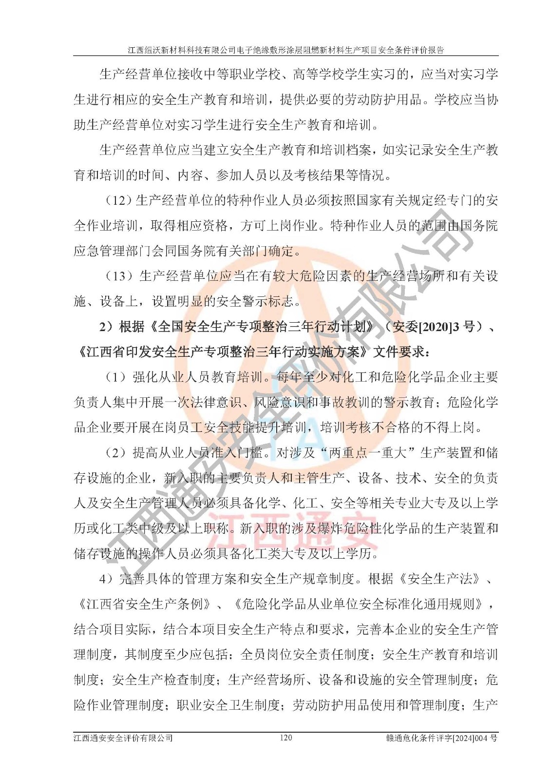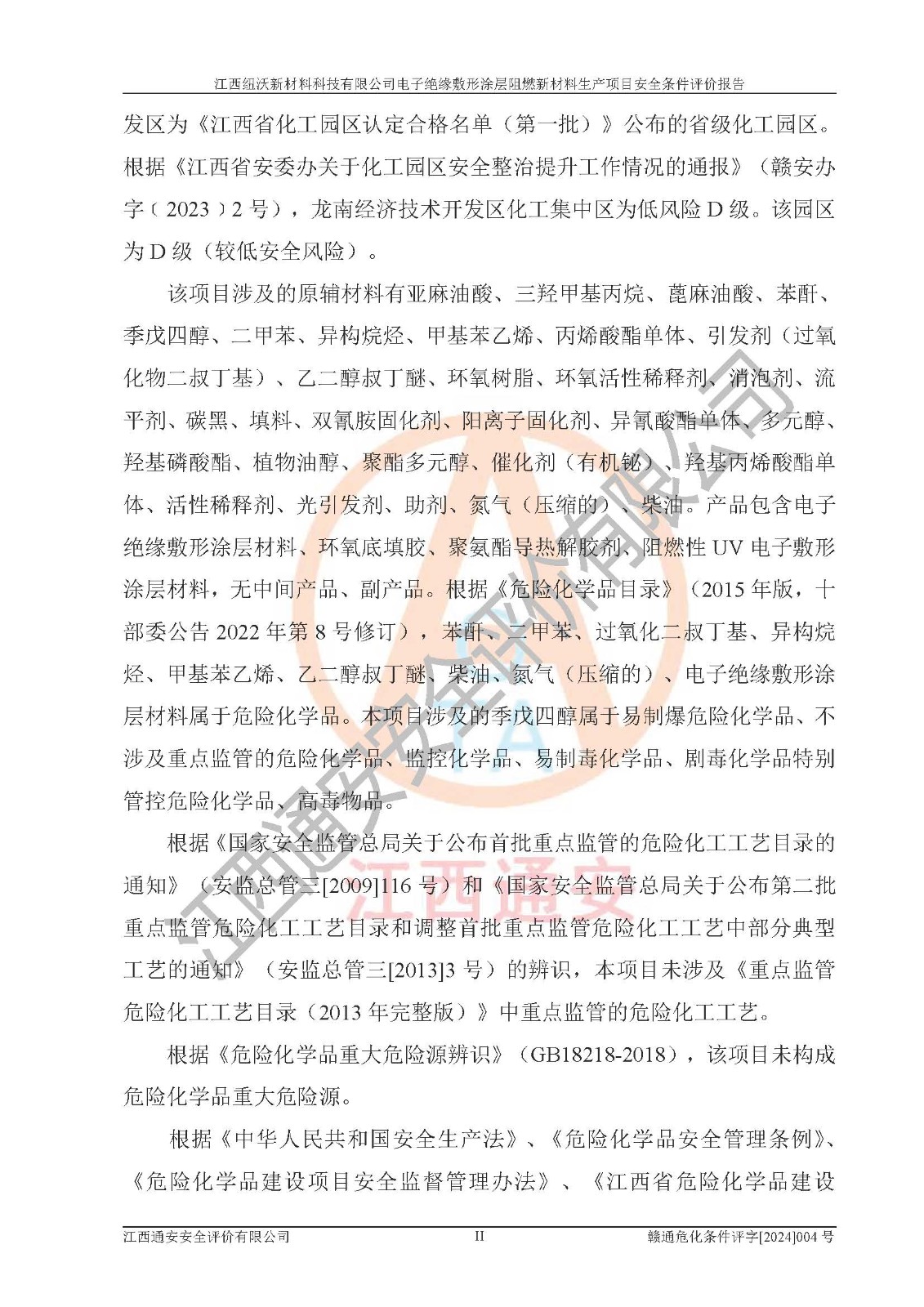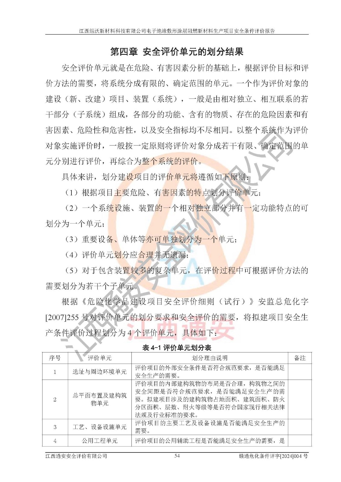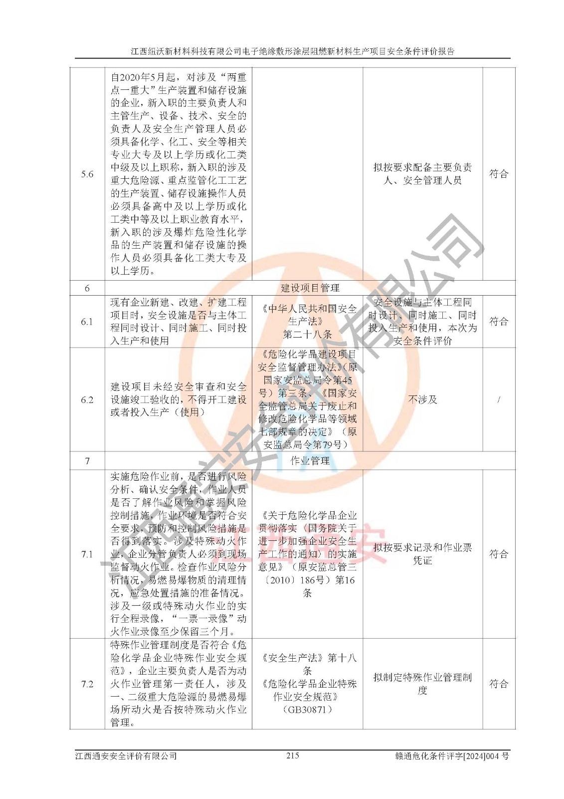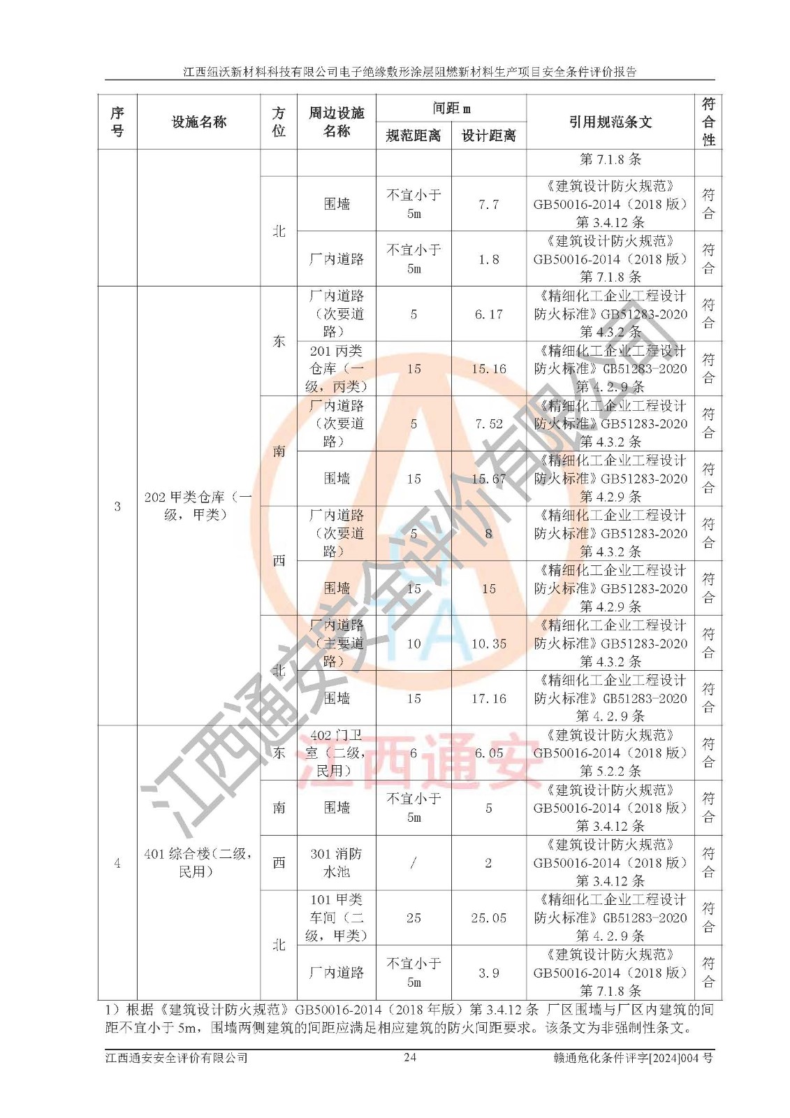 1)本項(xiàng)目依法取得了《江西省企業(yè)投資項(xiàng)目備案通知書》、《建設(shè)用地規(guī)劃許可證》,符合地方產(chǎn)業(yè)發(fā)展規(guī)劃的要求。 2)根據(jù)《**安全監(jiān)管總局關(guān)于公布首批重點(diǎn)監(jiān)管的危險(xiǎn)化工工藝目錄的通知》(安監(jiān)總管三[2009]116號(hào))和《**安全監(jiān)管總局關(guān)于公布第二批重點(diǎn)監(jiān)管危險(xiǎn)化工工藝目錄和調(diào)整首批重點(diǎn)監(jiān)管危險(xiǎn)化工工藝中部分典型工藝的通知》(安監(jiān)總管三[2013]3號(hào)),該項(xiàng)目未涉及重點(diǎn)監(jiān)管危險(xiǎn)化工工藝。 3)根據(jù)《危險(xiǎn)化學(xué)品重大危險(xiǎn)源辨識(shí)》(GB18218-2018),該項(xiàng)目未構(gòu)成危險(xiǎn)化學(xué)品重大危險(xiǎn)源。 4)項(xiàng)目存在的主要危險(xiǎn)因素有:火災(zāi)爆炸、容器爆炸、中毒窒息、灼燙、觸電、**傷害、機(jī)械傷害、高處墜落、物體打擊、淹溺等,存在的主要危害因素有:噪聲與振動(dòng)、高溫、有害化學(xué)物質(zhì)等;引起事故的原因有人的不安全行為、物的不安全狀態(tài)、管理缺陷和環(huán)境不良。其中*主要的危險(xiǎn)有害因素是火災(zāi)爆炸。 5)采用預(yù)先危險(xiǎn)性分析法評(píng)價(jià),結(jié)果為: (1)通過預(yù)先危險(xiǎn)(PHA)分析可知,項(xiàng)目廠址及總體布局單元存在周邊環(huán)境相互影響,發(fā)生異常情況,可對(duì)周邊企業(yè)生產(chǎn)經(jīng)營活動(dòng)、人員活動(dòng)產(chǎn)生影響;存在自然條件影響,可因雷擊、暴雨等引起事故;存在**傷害、建筑物危害,其固有的危險(xiǎn)性等級(jí)為Ⅱ級(jí),屬于“臨界的”,應(yīng)予以排除、采取控制措施因素。 (2)生產(chǎn)作業(yè)存在的危險(xiǎn)因素包括火災(zāi)爆炸、觸電、灼燙、中毒窒息固有的危險(xiǎn)等級(jí)為Ⅲ級(jí),屬于“危險(xiǎn)的”,可能導(dǎo)致人員傷亡和系統(tǒng)損壞的因素,需要采取防范和對(duì)策措施的因素;其它危險(xiǎn)因素固有的危險(xiǎn)等級(jí)為Ⅱ級(jí),屬于“臨界的”,應(yīng)予以排除、采取控制措施因素。 (3)生產(chǎn)作業(yè)存在的噪聲、粉塵、高溫、有害化學(xué)物質(zhì)的危險(xiǎn)有害因素等級(jí)為Ⅱ級(jí),屬于“臨界的”,應(yīng)予以排除、采取控制措施因素。 6)危險(xiǎn)度評(píng)價(jià)分析,結(jié)果為: 生產(chǎn)裝置危險(xiǎn)度評(píng)價(jià)分析:101生產(chǎn)車間為**危險(xiǎn)(Ⅰ級(jí))。 儲(chǔ)存單元危險(xiǎn)度評(píng)價(jià)分析:202甲類倉庫為**危險(xiǎn)(Ⅰ級(jí)),201丙類倉庫為低度危險(xiǎn)(Ⅲ級(jí))。 7)作業(yè)條件危險(xiǎn)性評(píng)價(jià)結(jié)果:在選定的評(píng)價(jià)單元中,其危險(xiǎn)分值均在70以下,危險(xiǎn)程度基本屬于“可能危險(xiǎn)”、“稍有危險(xiǎn)”范圍,作業(yè)條件相對(duì)安全。企業(yè)經(jīng)營過程中首先應(yīng)重點(diǎn)加強(qiáng)對(duì)甲類車間、甲類倉庫的危險(xiǎn)因素的嚴(yán)格控制,注重日常安全管理;其次要建立健全完善的安全生產(chǎn)責(zé)任制、安全管理制度、安全技術(shù)操作規(guī)程并**其貫徹落實(shí);第三要認(rèn)真抓好操作人員、管理人員的安全知識(shí)和操作技能的培訓(xùn),**人員具有與工程技術(shù)水平相適應(yīng)的技術(shù)素質(zhì)和安全素質(zhì),**安全作業(yè)。 8)項(xiàng)目建設(shè)場(chǎng)地符合當(dāng)?shù)匾?guī)劃要求,建設(shè)場(chǎng)地通過合理規(guī)劃,其選址、周邊環(huán)境、總平面布置、交通運(yùn)輸?shù)饶芊稀吨腥A人民共和國安全生產(chǎn)法》、《危險(xiǎn)化學(xué)品安全管理?xiàng)l例》、《建筑設(shè)計(jì)防火規(guī)范》、《精細(xì)化工企業(yè)工程設(shè)計(jì)防火標(biāo)準(zhǔn)》等法規(guī)、標(biāo)準(zhǔn)、規(guī)范要求。 廠址地區(qū)地震活動(dòng)相對(duì)較弱,災(zāi)害性天氣出現(xiàn)頻率稍高,自然災(zāi)害對(duì)項(xiàng)目建設(shè)具有**影響,通過采取相應(yīng)的防護(hù)措施,自然條件適宜建設(shè)。 9)建設(shè)項(xiàng)目符合**產(chǎn)業(yè)政策的要求;選擇工藝為現(xiàn)行成熟工藝,其安全可靠性可得到**。 10)本報(bào)告已根據(jù)有關(guān)安全生產(chǎn)法律、法規(guī)、規(guī)章和**標(biāo)準(zhǔn)、行業(yè)標(biāo)準(zhǔn),并嚴(yán)格執(zhí)行省委辦公廳省**辦公廳《關(guān)于全面加強(qiáng)危險(xiǎn)化學(xué)品安全生產(chǎn)工作的實(shí)施意見》(贛辦發(fā)[2020]32號(hào))及鄱陽湖生態(tài)經(jīng)濟(jì)區(qū)、長(zhǎng)江經(jīng)濟(jì)帶、“五河一湖”相關(guān)政策規(guī)定,客觀、公正、科學(xué)地進(jìn)行安全評(píng)價(jià),項(xiàng)目符合《江西省應(yīng)急管理廳關(guān)于印發(fā)《江西省危險(xiǎn)化學(xué)品建設(shè)項(xiàng)目安全監(jiān)督管理實(shí)施細(xì)則》(試行)的通知》(贛應(yīng)急字[2021]100號(hào))的要求。 11)本報(bào)告結(jié)合工藝特征,提出應(yīng)采取的對(duì)應(yīng)的自動(dòng)化控制系統(tǒng)及自動(dòng)化實(shí)施方案,滿足《江西省應(yīng)急管理廳關(guān)于印發(fā)《江西省化工企業(yè)自動(dòng)化提升實(shí)施方案》(試行)的通知》(贛應(yīng)急字[2021]190號(hào))的要求。 綜上所述:江西紐沃新材料科技有限公司電