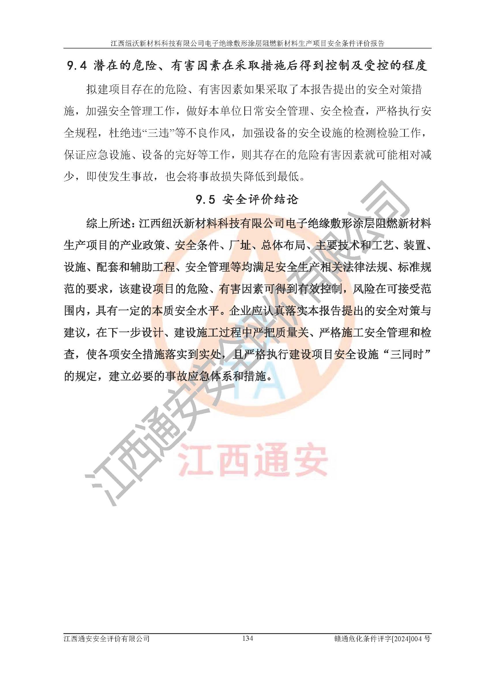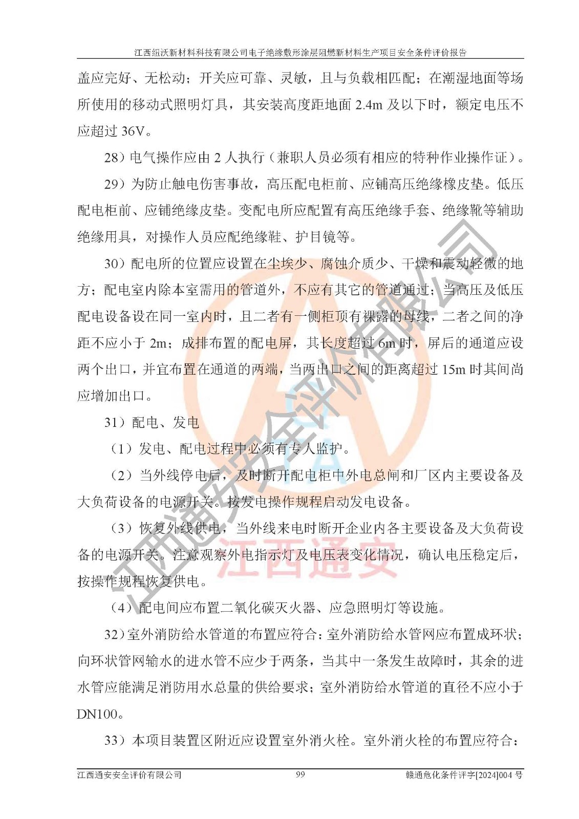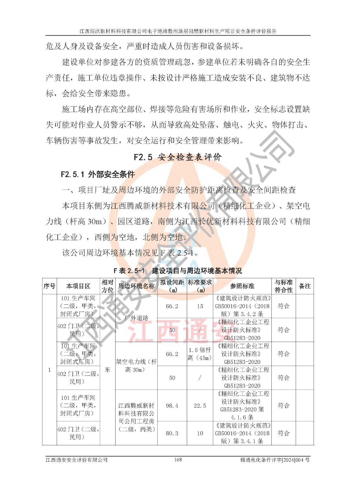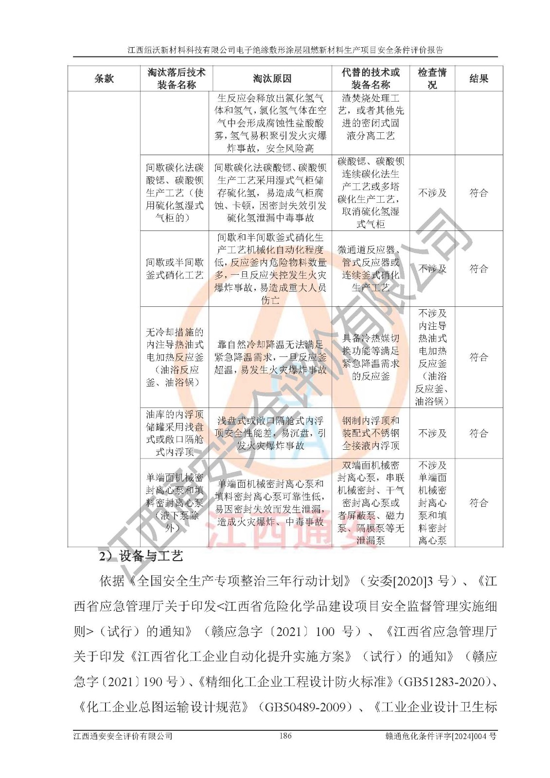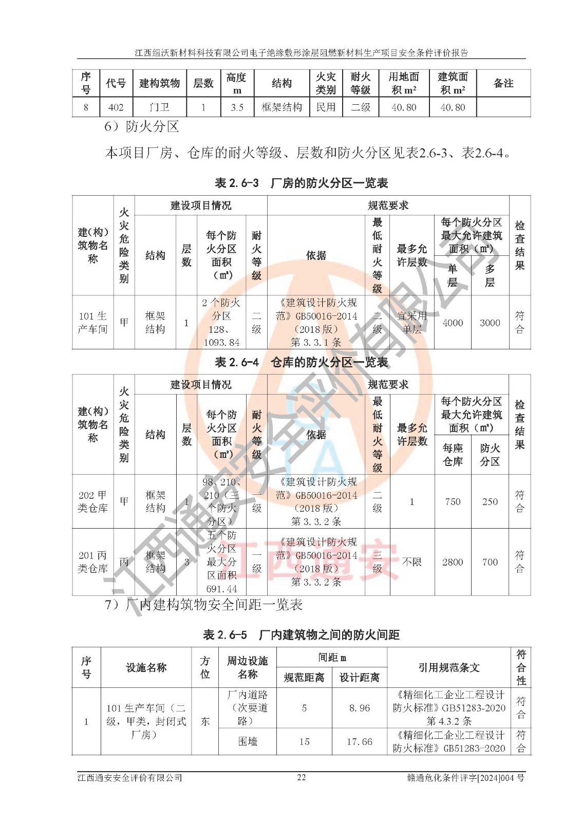 1)本項(xiàng)目依法取得了《江西省企業(yè)投資項(xiàng)目備案通知書》、《建設(shè)用地規(guī)劃許可證》,符合地方產(chǎn)業(yè)發(fā)展規(guī)劃的要求。 2)根據(jù)《**安全監(jiān)管總局關(guān)于公布首批重點(diǎn)監(jiān)管的危險(xiǎn)化工工藝目錄的通知》(安監(jiān)總管三[2009]116號(hào))和《**安全監(jiān)管總局關(guān)于公布第二批重點(diǎn)監(jiān)管危險(xiǎn)化工工藝目錄和調(diào)整首批重點(diǎn)監(jiān)管危險(xiǎn)化工工藝中部分典型工藝的通知》(安監(jiān)總管三[2013]3號(hào)),該項(xiàng)目未涉及重點(diǎn)監(jiān)管危險(xiǎn)化工工藝。 3)根據(jù)《危險(xiǎn)化學(xué)品重大危險(xiǎn)源辨識(shí)》(GB18218-2018),該項(xiàng)目未構(gòu)成危險(xiǎn)化學(xué)品重大危險(xiǎn)源。 4)項(xiàng)目存在的主要危險(xiǎn)因素有:火災(zāi)爆炸、容器爆炸、中毒窒息、灼燙、觸電、**傷害、機(jī)械傷害、高處墜落、物體打擊、淹溺等,存在的主要危害因素有:噪聲與振動(dòng)、高溫、有害化學(xué)物質(zhì)等;引起事故的原因有人的不安全行為、物的不安全狀態(tài)、管理缺陷和環(huán)境不良。其中*主要的危險(xiǎn)有害因素是火災(zāi)爆炸。 5)采用預(yù)先危險(xiǎn)性分析法評(píng)價(jià),結(jié)果為: (1)通過預(yù)先危險(xiǎn)(PHA)分析可知,項(xiàng)目廠址及總體布局單元存在周邊環(huán)境相互影響,發(fā)生異常情況,可對(duì)周邊企業(yè)生產(chǎn)經(jīng)營活動(dòng)、人員活動(dòng)產(chǎn)生影響;存在自然條件影響,可因雷擊、暴雨等引起事故;存在**傷害、建筑物危害,其固有的危險(xiǎn)性等級(jí)為Ⅱ級(jí),屬于“臨界的”,應(yīng)予以排除、采取控制措施因素。 (2)生產(chǎn)作業(yè)存在的危險(xiǎn)因素包括火災(zāi)爆炸、觸電、灼燙、中毒窒息固有的危險(xiǎn)等級(jí)為Ⅲ級(jí),屬于“危險(xiǎn)的”,可能導(dǎo)致人員傷亡和系統(tǒng)損壞的因素,需要采取防范和對(duì)策措施的因素;其它危險(xiǎn)因素固有的危險(xiǎn)等級(jí)為Ⅱ級(jí),屬于“臨界的”,應(yīng)予以排除、采取控制措施因素。 (3)生產(chǎn)作業(yè)存在的噪聲、粉塵、高溫、有害化學(xué)物質(zhì)的危險(xiǎn)有害因素等級(jí)為Ⅱ級(jí),屬于“臨界的”,應(yīng)予以排除、采取控制措施因素。 6)危險(xiǎn)度評(píng)價(jià)分析,結(jié)果為: 生產(chǎn)裝置危險(xiǎn)度評(píng)價(jià)分析:101生產(chǎn)車間為**危險(xiǎn)(Ⅰ級(jí))。 儲(chǔ)存單元危險(xiǎn)度評(píng)價(jià)分析:202甲類倉庫為**危險(xiǎn)(Ⅰ級(jí)),201丙類倉庫為低度危險(xiǎn)(Ⅲ級(jí))。 7)作業(yè)條件危險(xiǎn)性評(píng)價(jià)結(jié)果:在選定的評(píng)價(jià)單元中,其危險(xiǎn)分值均在70以下,危險(xiǎn)程度基本屬于“可能危險(xiǎn)”、“稍有危險(xiǎn)”范圍,作業(yè)條件相對(duì)安全。企業(yè)經(jīng)營過程中首先應(yīng)重點(diǎn)加強(qiáng)對(duì)甲類車間、甲類倉庫的危險(xiǎn)因素的嚴(yán)格控制,注重日常安全管理;其次要建立健全完善的安全生產(chǎn)責(zé)任制、安全管理制度、安全技術(shù)操作規(guī)程并**其貫徹落實(shí);第三要認(rèn)真抓好操作人員、管理人員的安全知識(shí)和操作技能的培訓(xùn),**人員具有與工程技術(shù)水平相適應(yīng)的技術(shù)素質(zhì)和安全素質(zhì),**安全作業(yè)。 8)項(xiàng)目建設(shè)場(chǎng)地符合當(dāng)?shù)匾?guī)劃要求,建設(shè)場(chǎng)地通過合理規(guī)劃,其選址、周邊環(huán)境、總平面布置、交通運(yùn)輸?shù)饶芊稀吨腥A人民共和國安全生產(chǎn)法》、《危險(xiǎn)化學(xué)品安全管理?xiàng)l例》、《建筑設(shè)計(jì)防火規(guī)范》、《精細(xì)化工企業(yè)工程設(shè)計(jì)防火標(biāo)準(zhǔn)》等法規(guī)、標(biāo)準(zhǔn)、規(guī)范要求。 廠址地區(qū)地震活動(dòng)相對(duì)較弱,災(zāi)害性天氣出現(xiàn)頻率稍高,自然災(zāi)害對(duì)項(xiàng)目建設(shè)具有**影響,通過采取相應(yīng)的防護(hù)措施,自然條件適宜建設(shè)。 9)建設(shè)項(xiàng)目符合**產(chǎn)業(yè)政策的要求;選擇工藝為現(xiàn)行成熟工藝,其安全可靠性可得到**。 10)本報(bào)告已根據(jù)有關(guān)安全生產(chǎn)法律、法規(guī)、規(guī)章和**標(biāo)準(zhǔn)、行業(yè)標(biāo)準(zhǔn),并嚴(yán)格執(zhí)行省委辦公廳省**辦公廳《關(guān)于全面加強(qiáng)危險(xiǎn)化學(xué)品安全生產(chǎn)工作的實(shí)施意見》(贛辦發(fā)[2020]32號(hào))及鄱陽湖生態(tài)經(jīng)濟(jì)區(qū)、長(zhǎng)江經(jīng)濟(jì)帶、“五河一湖”相關(guān)政策規(guī)定,客觀、公正、科學(xué)地進(jìn)行安全評(píng)價(jià),項(xiàng)目符合《江西省應(yīng)急管理廳關(guān)于印發(fā)《江西省危險(xiǎn)化學(xué)品建設(shè)項(xiàng)目安全監(jiān)督管理實(shí)施細(xì)則》(試行)的通知》(贛應(yīng)急字[2021]100號(hào))的要求。 11)本報(bào)告結(jié)合工藝特征,提出應(yīng)采取的對(duì)應(yīng)的自動(dòng)化控制系統(tǒng)及自動(dòng)化實(shí)施方案,滿足《江西省應(yīng)急管理廳關(guān)于印發(fā)《江西省化工企業(yè)自動(dòng)化提升實(shí)施方案》(試行)的通知》(贛應(yīng)急字[2021]190號(hào))的要求。 綜上所述:江西紐沃新材料科技有限公司電