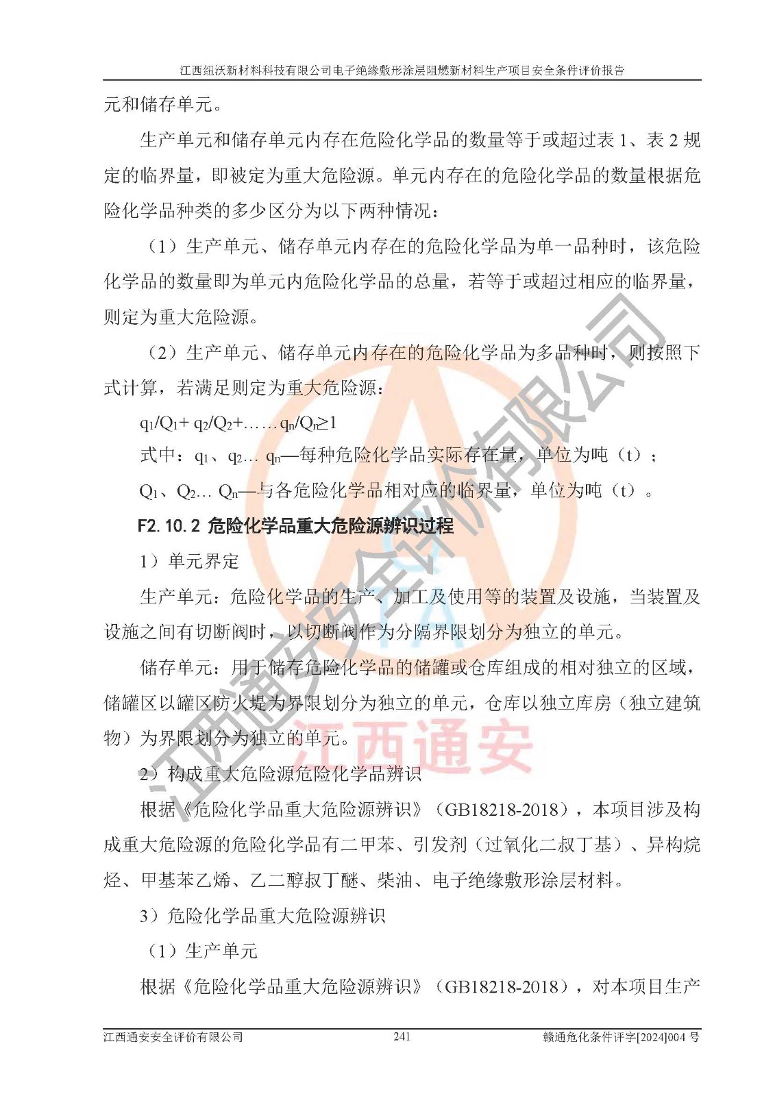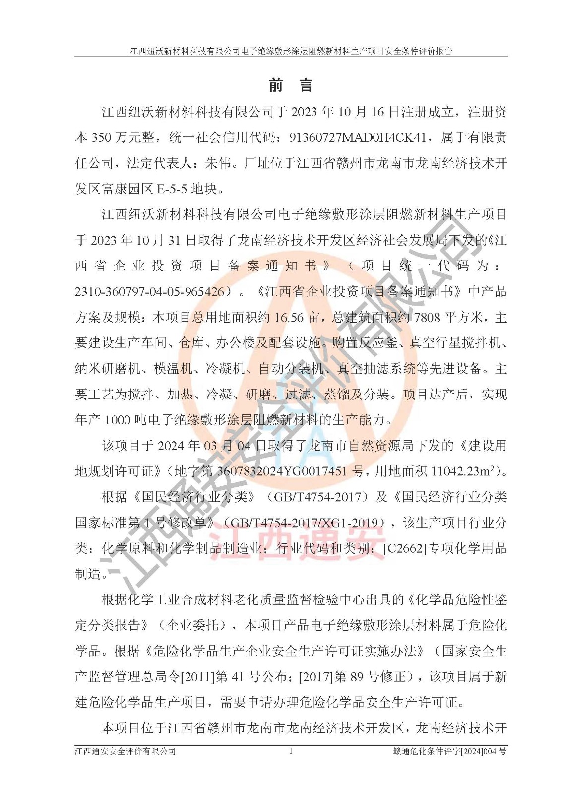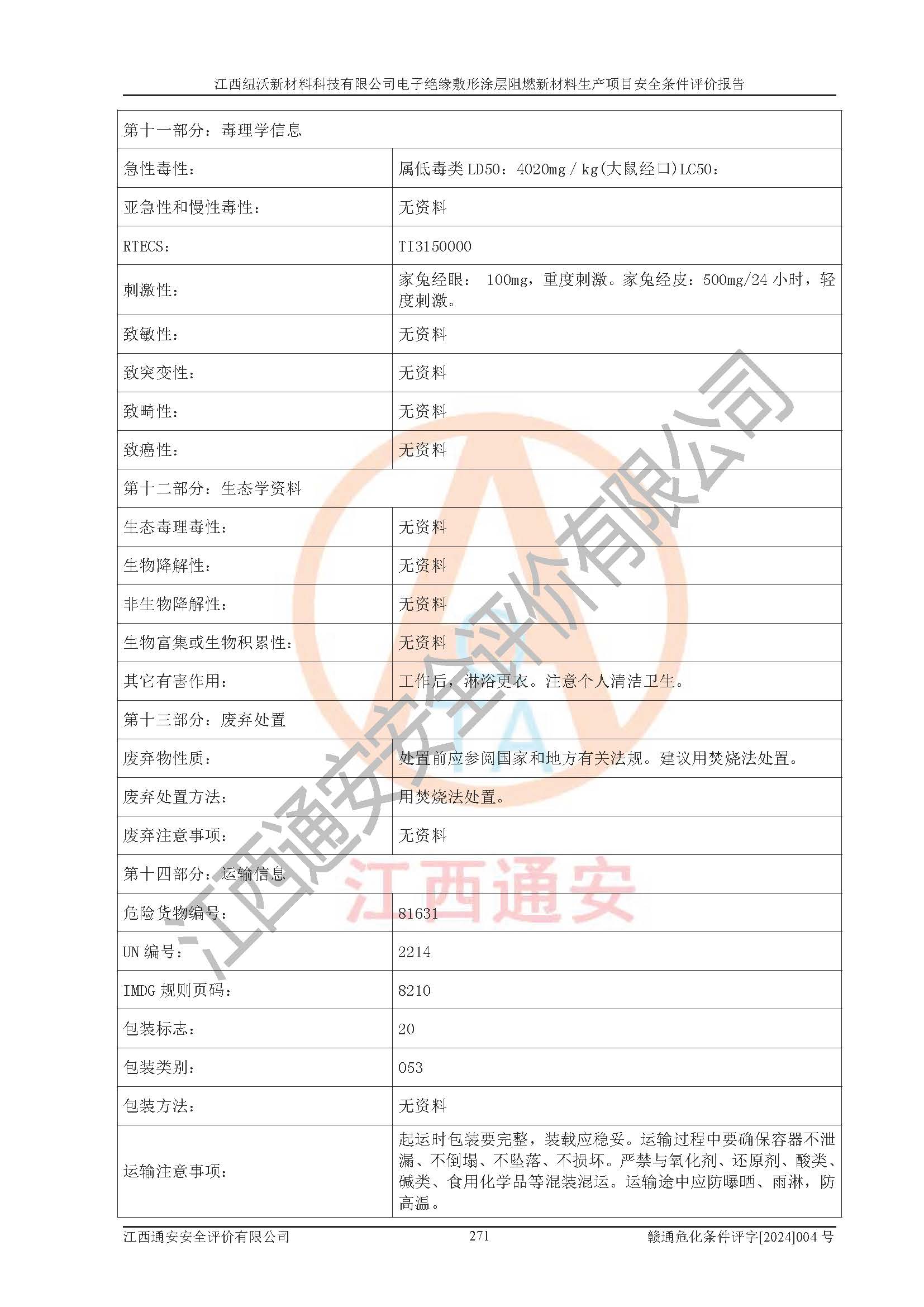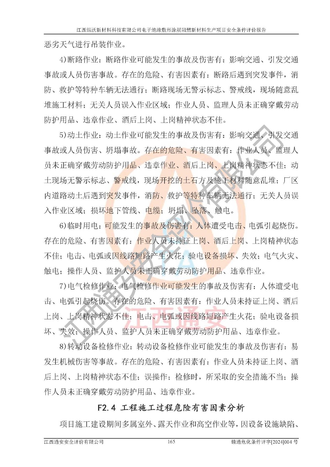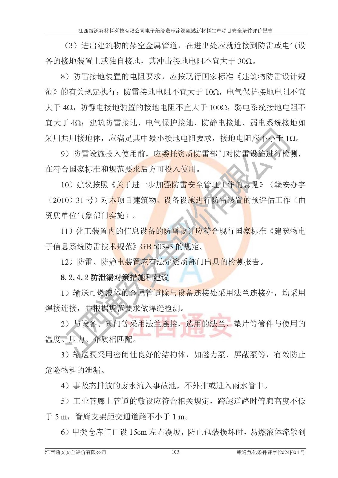 1)本項(xiàng)目依法取得了《江西省企業(yè)投資項(xiàng)目備案通知書》、《建設(shè)用地規(guī)劃許可證》,符合地方產(chǎn)業(yè)發(fā)展規(guī)劃的要求。 2)根據(jù)《**安全監(jiān)管總局關(guān)于公布首批重點(diǎn)監(jiān)管的危險(xiǎn)化工工藝目錄的通知》(安監(jiān)總管三[2009]116號(hào))和《**安全監(jiān)管總局關(guān)于公布第二批重點(diǎn)監(jiān)管危險(xiǎn)化工工藝目錄和調(diào)整首批重點(diǎn)監(jiān)管危險(xiǎn)化工工藝中部分典型工藝的通知》(安監(jiān)總管三[2013]3號(hào)),該項(xiàng)目未涉及重點(diǎn)監(jiān)管危險(xiǎn)化工工藝。 3)根據(jù)《危險(xiǎn)化學(xué)品重大危險(xiǎn)源辨識(shí)》(GB18218-2018),該項(xiàng)目未構(gòu)成危險(xiǎn)化學(xué)品重大危險(xiǎn)源。 4)項(xiàng)目存在的主要危險(xiǎn)因素有:火災(zāi)爆炸、容器爆炸、中毒窒息、灼燙、觸電、**傷害、機(jī)械傷害、高處墜落、物體打擊、淹溺等,存在的主要危害因素有:噪聲與振動(dòng)、高溫、有害化學(xué)物質(zhì)等;引起事故的原因有人的不安全行為、物的不安全狀態(tài)、管理缺陷和環(huán)境不良。其中*主要的危險(xiǎn)有害因素是火災(zāi)爆炸。 5)采用預(yù)先危險(xiǎn)性分析法評(píng)價(jià),結(jié)果為: (1)通過預(yù)先危險(xiǎn)(PHA)分析可知,項(xiàng)目廠址及總體布局單元存在周邊環(huán)境相互影響,發(fā)生異常情況,可對(duì)周邊企業(yè)生產(chǎn)經(jīng)營活動(dòng)、人員活動(dòng)產(chǎn)生影響;存在自然條件影響,可因雷擊、暴雨等引起事故;存在**傷害、建筑物危害,其固有的危險(xiǎn)性等級(jí)為Ⅱ級(jí),屬于“臨界的”,應(yīng)予以排除、采取控制措施因素。 (2)生產(chǎn)作業(yè)存在的危險(xiǎn)因素包括火災(zāi)爆炸、觸電、灼燙、中毒窒息固有的危險(xiǎn)等級(jí)為Ⅲ級(jí),屬于“危險(xiǎn)的”,可能導(dǎo)致人員傷亡和系統(tǒng)損壞的因素,需要采取防范和對(duì)策措施的因素;其它危險(xiǎn)因素固有的危險(xiǎn)等級(jí)為Ⅱ級(jí),屬于“臨界的”,應(yīng)予以排除、采取控制措施因素。 (3)生產(chǎn)作業(yè)存在的噪聲、粉塵、高溫、有害化學(xué)物質(zhì)的危險(xiǎn)有害因素等級(jí)為Ⅱ級(jí),屬于“臨界的”,應(yīng)予以排除、采取控制措施因素。 6)危險(xiǎn)度評(píng)價(jià)分析,結(jié)果為: 生產(chǎn)裝置危險(xiǎn)度評(píng)價(jià)分析:101生產(chǎn)車間為**危險(xiǎn)(Ⅰ級(jí))。 儲(chǔ)存單元危險(xiǎn)度評(píng)價(jià)分析:202甲類倉庫為**危險(xiǎn)(Ⅰ級(jí)),201丙類倉庫為低度危險(xiǎn)(Ⅲ級(jí))。 7)作業(yè)條件危險(xiǎn)性評(píng)價(jià)結(jié)果:在選定的評(píng)價(jià)單元中,其危險(xiǎn)分值均在70以下,危險(xiǎn)程度基本屬于“可能危險(xiǎn)”、“稍有危險(xiǎn)”范圍,作業(yè)條件相對(duì)安全。企業(yè)經(jīng)營過程中首先應(yīng)重點(diǎn)加強(qiáng)對(duì)甲類車間、甲類倉庫的危險(xiǎn)因素的嚴(yán)格控制,注重日常安全管理;其次要建立健全完善的安全生產(chǎn)責(zé)任制、安全管理制度、安全技術(shù)操作規(guī)程并**其貫徹落實(shí);第三要認(rèn)真抓好操作人員、管理人員的安全知識(shí)和操作技能的培訓(xùn),**人員具有與工程技術(shù)水平相適應(yīng)的技術(shù)素質(zhì)和安全素質(zhì),**安全作業(yè)。 8)項(xiàng)目建設(shè)場(chǎng)地符合當(dāng)?shù)匾?guī)劃要求,建設(shè)場(chǎng)地通過合理規(guī)劃,其選址、周邊環(huán)境、總平面布置、交通運(yùn)輸?shù)饶芊稀吨腥A人民共和國安全生產(chǎn)法》、《危險(xiǎn)化學(xué)品安全管理?xiàng)l例》、《建筑設(shè)計(jì)防火規(guī)范》、《精細(xì)化工企業(yè)工程設(shè)計(jì)防火標(biāo)準(zhǔn)》等法規(guī)、標(biāo)準(zhǔn)、規(guī)范要求。 廠址地區(qū)地震活動(dòng)相對(duì)較弱,災(zāi)害性天氣出現(xiàn)頻率稍高,自然災(zāi)害對(duì)項(xiàng)目建設(shè)具有**影響,通過采取相應(yīng)的防護(hù)措施,自然條件適宜建設(shè)。 9)建設(shè)項(xiàng)目符合**產(chǎn)業(yè)政策的要求;選擇工藝為現(xiàn)行成熟工藝,其安全可靠性可得到**。 10)本報(bào)告已根據(jù)有關(guān)安全生產(chǎn)法律、法規(guī)、規(guī)章和**標(biāo)準(zhǔn)、行業(yè)標(biāo)準(zhǔn),并嚴(yán)格執(zhí)行省委辦公廳省**辦公廳《關(guān)于全面加強(qiáng)危險(xiǎn)化學(xué)品安全生產(chǎn)工作的實(shí)施意見》(贛辦發(fā)[2020]32號(hào))及鄱陽湖生態(tài)經(jīng)濟(jì)區(qū)、長(zhǎng)江經(jīng)濟(jì)帶、“五河一湖”相關(guān)政策規(guī)定,客觀、公正、科學(xué)地進(jìn)行安全評(píng)價(jià),項(xiàng)目符合《江西省應(yīng)急管理廳關(guān)于印發(fā)《江西省危險(xiǎn)化學(xué)品建設(shè)項(xiàng)目安全監(jiān)督管理實(shí)施細(xì)則》(試行)的通知》(贛應(yīng)急字[2021]100號(hào))的要求。 11)本報(bào)告結(jié)合工藝特征,提出應(yīng)采取的對(duì)應(yīng)的自動(dòng)化控制系統(tǒng)及自動(dòng)化實(shí)施方案,滿足《江西省應(yīng)急管理廳關(guān)于印發(fā)《江西省化工企業(yè)自動(dòng)化提升實(shí)施方案》(試行)的通知》(贛應(yīng)急字[2021]190號(hào))的要求。 綜上所述:江西紐沃新材料科技有限公司電