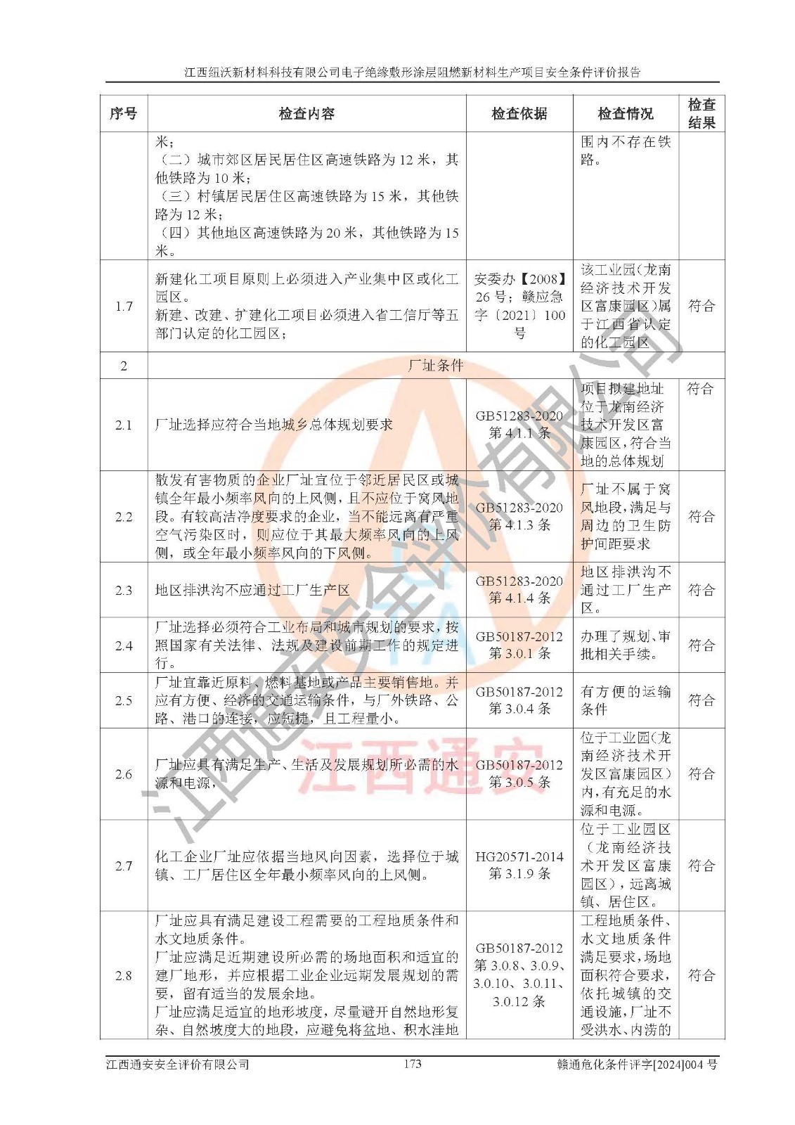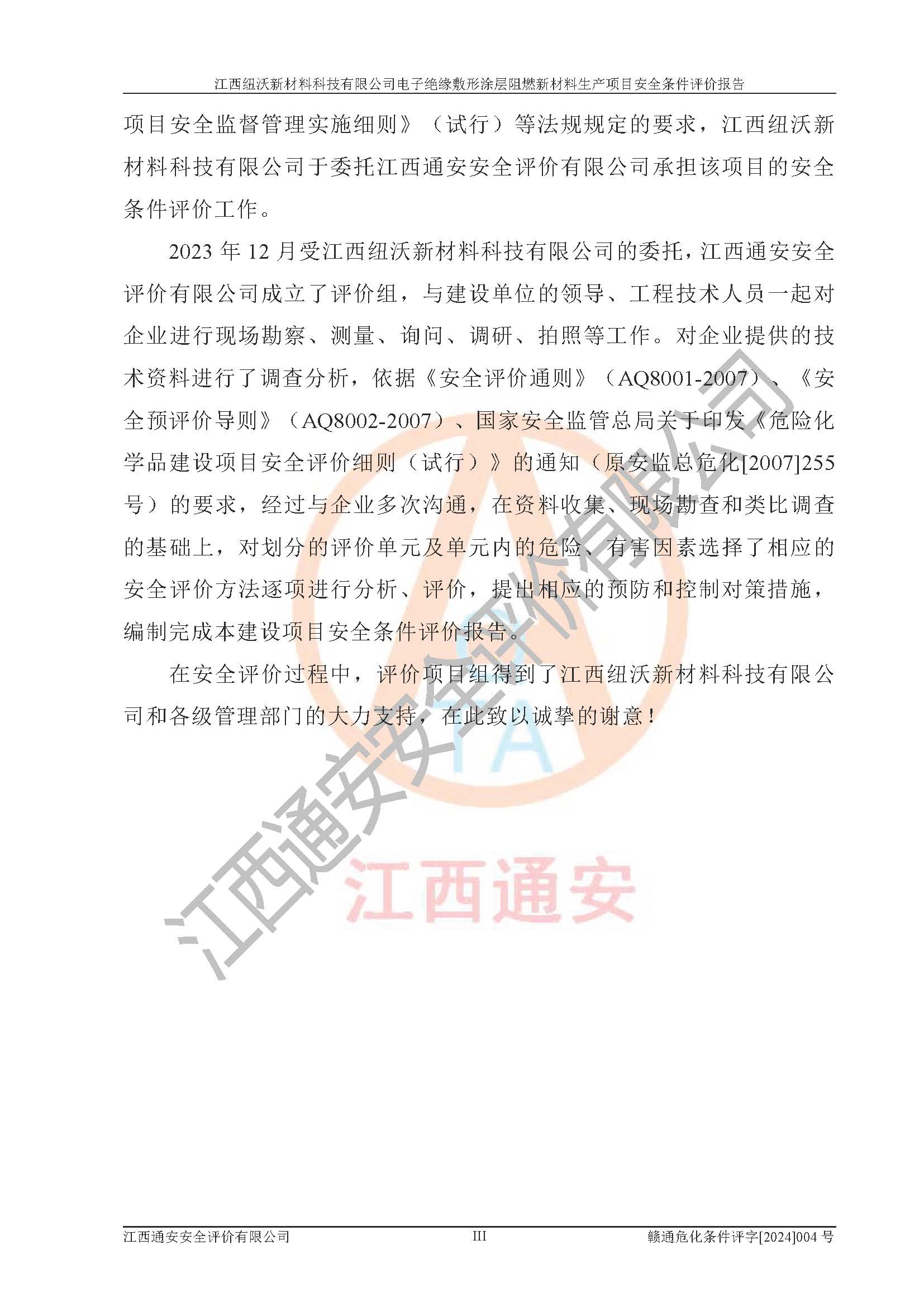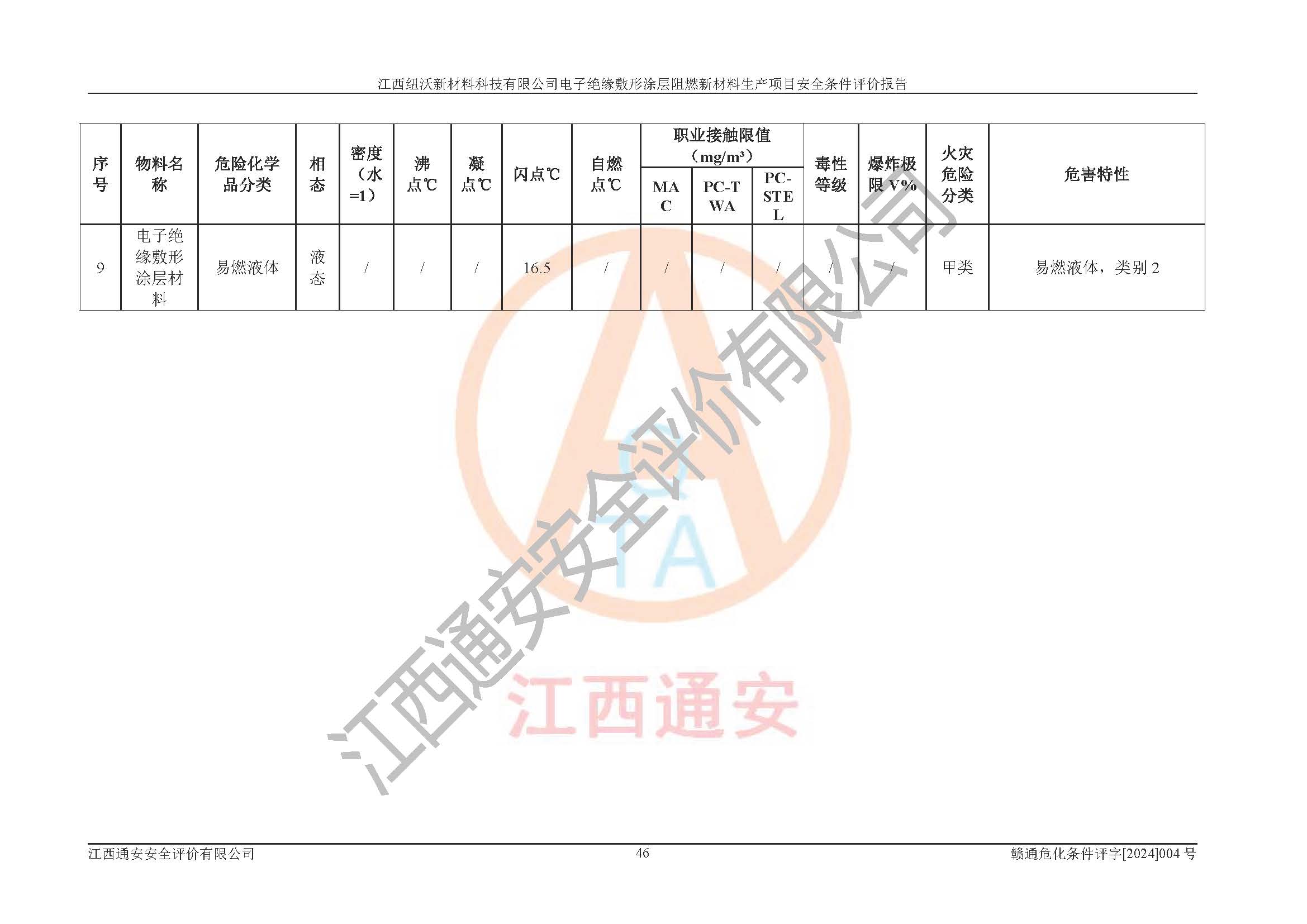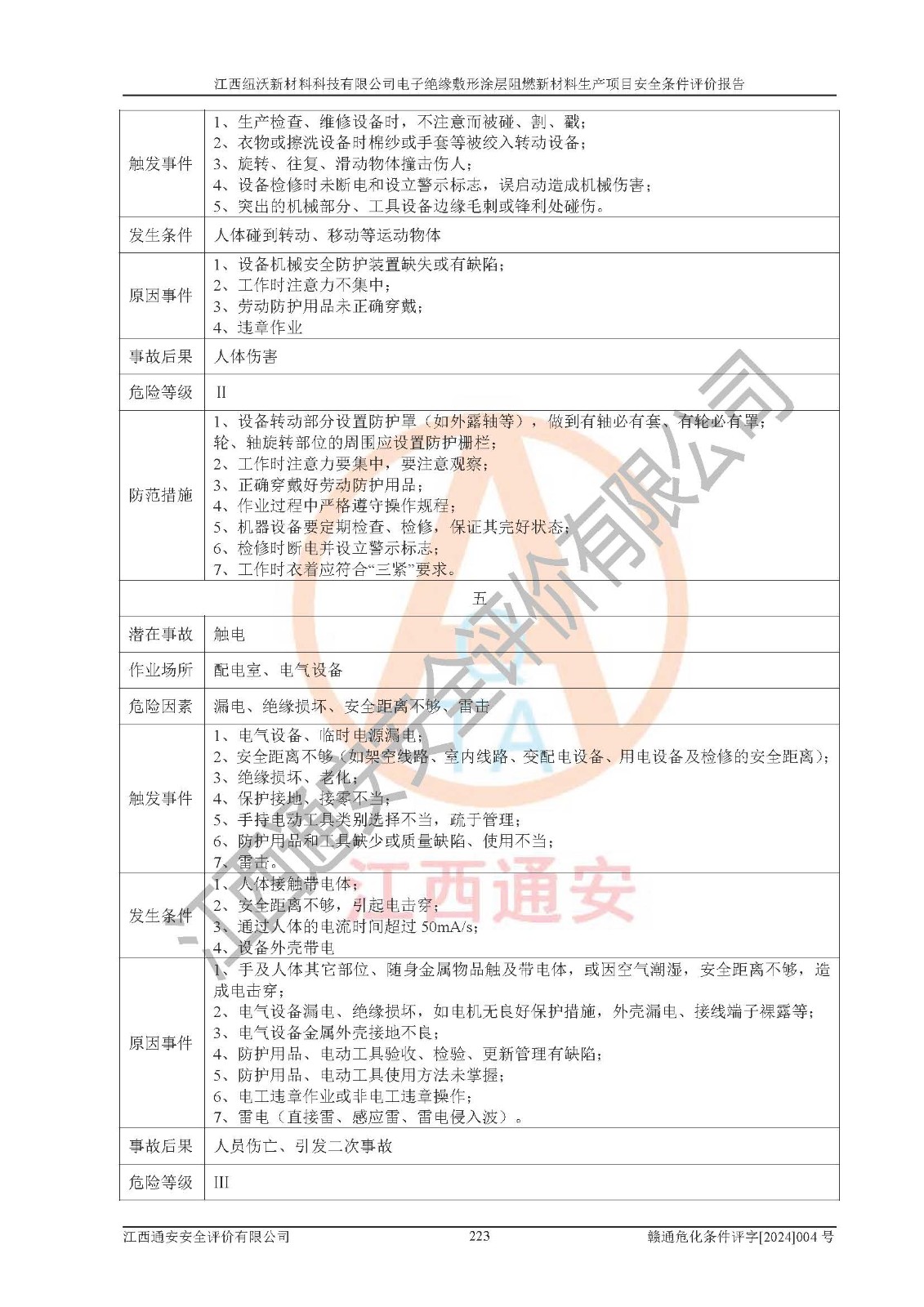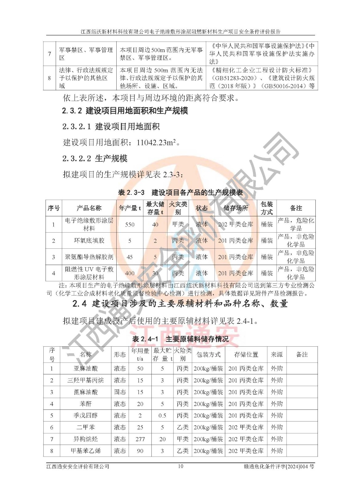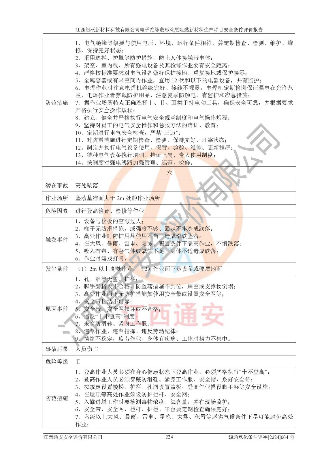 1)本項(xiàng)目依法取得了《江西省企業(yè)投資項(xiàng)目備案通知書》、《建設(shè)用地規(guī)劃許可證》,符合地方產(chǎn)業(yè)發(fā)展規(guī)劃的要求。 2)根據(jù)《**安全監(jiān)管總局關(guān)于公布首批重點(diǎn)監(jiān)管的危險(xiǎn)化工工藝目錄的通知》(安監(jiān)總管三[2009]116號(hào))和《**安全監(jiān)管總局關(guān)于公布第二批重點(diǎn)監(jiān)管危險(xiǎn)化工工藝目錄和調(diào)整首批重點(diǎn)監(jiān)管危險(xiǎn)化工工藝中部分典型工藝的通知》(安監(jiān)總管三[2013]3號(hào)),該項(xiàng)目未涉及重點(diǎn)監(jiān)管危險(xiǎn)化工工藝。 3)根據(jù)《危險(xiǎn)化學(xué)品重大危險(xiǎn)源辨識(shí)》(GB18218-2018),該項(xiàng)目未構(gòu)成危險(xiǎn)化學(xué)品重大危險(xiǎn)源。 4)項(xiàng)目存在的主要危險(xiǎn)因素有:火災(zāi)爆炸、容器爆炸、中毒窒息、灼燙、觸電、**傷害、機(jī)械傷害、高處墜落、物體打擊、淹溺等,存在的主要危害因素有:噪聲與振動(dòng)、高溫、有害化學(xué)物質(zhì)等;引起事故的原因有人的不安全行為、物的不安全狀態(tài)、管理缺陷和環(huán)境不良。其中*主要的危險(xiǎn)有害因素是火災(zāi)爆炸。 5)采用預(yù)先危險(xiǎn)性分析法評(píng)價(jià),結(jié)果為: (1)通過預(yù)先危險(xiǎn)(PHA)分析可知,項(xiàng)目廠址及總體布局單元存在周邊環(huán)境相互影響,發(fā)生異常情況,可對(duì)周邊企業(yè)生產(chǎn)經(jīng)營活動(dòng)、人員活動(dòng)產(chǎn)生影響;存在自然條件影響,可因雷擊、暴雨等引起事故;存在**傷害、建筑物危害,其固有的危險(xiǎn)性等級(jí)為Ⅱ級(jí),屬于“臨界的”,應(yīng)予以排除、采取控制措施因素。 (2)生產(chǎn)作業(yè)存在的危險(xiǎn)因素包括火災(zāi)爆炸、觸電、灼燙、中毒窒息固有的危險(xiǎn)等級(jí)為Ⅲ級(jí),屬于“危險(xiǎn)的”,可能導(dǎo)致人員傷亡和系統(tǒng)損壞的因素,需要采取防范和對(duì)策措施的因素;其它危險(xiǎn)因素固有的危險(xiǎn)等級(jí)為Ⅱ級(jí),屬于“臨界的”,應(yīng)予以排除、采取控制措施因素。 (3)生產(chǎn)作業(yè)存在的噪聲、粉塵、高溫、有害化學(xué)物質(zhì)的危險(xiǎn)有害因素等級(jí)為Ⅱ級(jí),屬于“臨界的”,應(yīng)予以排除、采取控制措施因素。 6)危險(xiǎn)度評(píng)價(jià)分析,結(jié)果為: 生產(chǎn)裝置危險(xiǎn)度評(píng)價(jià)分析:101生產(chǎn)車間為**危險(xiǎn)(Ⅰ級(jí))。 儲(chǔ)存單元危險(xiǎn)度評(píng)價(jià)分析:202甲類倉庫為**危險(xiǎn)(Ⅰ級(jí)),201丙類倉庫為低度危險(xiǎn)(Ⅲ級(jí))。 7)作業(yè)條件危險(xiǎn)性評(píng)價(jià)結(jié)果:在選定的評(píng)價(jià)單元中,其危險(xiǎn)分值均在70以下,危險(xiǎn)程度基本屬于“可能危險(xiǎn)”、“稍有危險(xiǎn)”范圍,作業(yè)條件相對(duì)安全。企業(yè)經(jīng)營過程中首先應(yīng)重點(diǎn)加強(qiáng)對(duì)甲類車間、甲類倉庫的危險(xiǎn)因素的嚴(yán)格控制,注重日常安全管理;其次要建立健全完善的安全生產(chǎn)責(zé)任制、安全管理制度、安全技術(shù)操作規(guī)程并**其貫徹落實(shí);第三要認(rèn)真抓好操作人員、管理人員的安全知識(shí)和操作技能的培訓(xùn),**人員具有與工程技術(shù)水平相適應(yīng)的技術(shù)素質(zhì)和安全素質(zhì),**安全作業(yè)。 8)項(xiàng)目建設(shè)場(chǎng)地符合當(dāng)?shù)匾?guī)劃要求,建設(shè)場(chǎng)地通過合理規(guī)劃,其選址、周邊環(huán)境、總平面布置、交通運(yùn)輸?shù)饶芊稀吨腥A人民共和國安全生產(chǎn)法》、《危險(xiǎn)化學(xué)品安全管理?xiàng)l例》、《建筑設(shè)計(jì)防火規(guī)范》、《精細(xì)化工企業(yè)工程設(shè)計(jì)防火標(biāo)準(zhǔn)》等法規(guī)、標(biāo)準(zhǔn)、規(guī)范要求。 廠址地區(qū)地震活動(dòng)相對(duì)較弱,災(zāi)害性天氣出現(xiàn)頻率稍高,自然災(zāi)害對(duì)項(xiàng)目建設(shè)具有**影響,通過采取相應(yīng)的防護(hù)措施,自然條件適宜建設(shè)。 9)建設(shè)項(xiàng)目符合**產(chǎn)業(yè)政策的要求;選擇工藝為現(xiàn)行成熟工藝,其安全可靠性可得到**。 10)本報(bào)告已根據(jù)有關(guān)安全生產(chǎn)法律、法規(guī)、規(guī)章和**標(biāo)準(zhǔn)、行業(yè)標(biāo)準(zhǔn),并嚴(yán)格執(zhí)行省委辦公廳省**辦公廳《關(guān)于全面加強(qiáng)危險(xiǎn)化學(xué)品安全生產(chǎn)工作的實(shí)施意見》(贛辦發(fā)[2020]32號(hào))及鄱陽湖生態(tài)經(jīng)濟(jì)區(qū)、長(zhǎng)江經(jīng)濟(jì)帶、“五河一湖”相關(guān)政策規(guī)定,客觀、公正、科學(xué)地進(jìn)行安全評(píng)價(jià),項(xiàng)目符合《江西省應(yīng)急管理廳關(guān)于印發(fā)《江西省危險(xiǎn)化學(xué)品建設(shè)項(xiàng)目安全監(jiān)督管理實(shí)施細(xì)則》(試行)的通知》(贛應(yīng)急字[2021]100號(hào))的要求。 11)本報(bào)告結(jié)合工藝特征,提出應(yīng)采取的對(duì)應(yīng)的自動(dòng)化控制系統(tǒng)及自動(dòng)化實(shí)施方案,滿足《江西省應(yīng)急管理廳關(guān)于印發(fā)《江西省化工企業(yè)自動(dòng)化提升實(shí)施方案》(試行)的通知》(贛應(yīng)急字[2021]190號(hào))的要求。 綜上所述:江西紐沃新材料科技有限公司電
