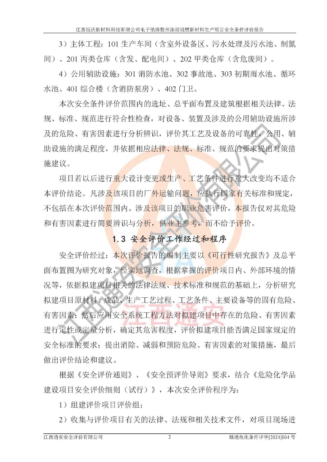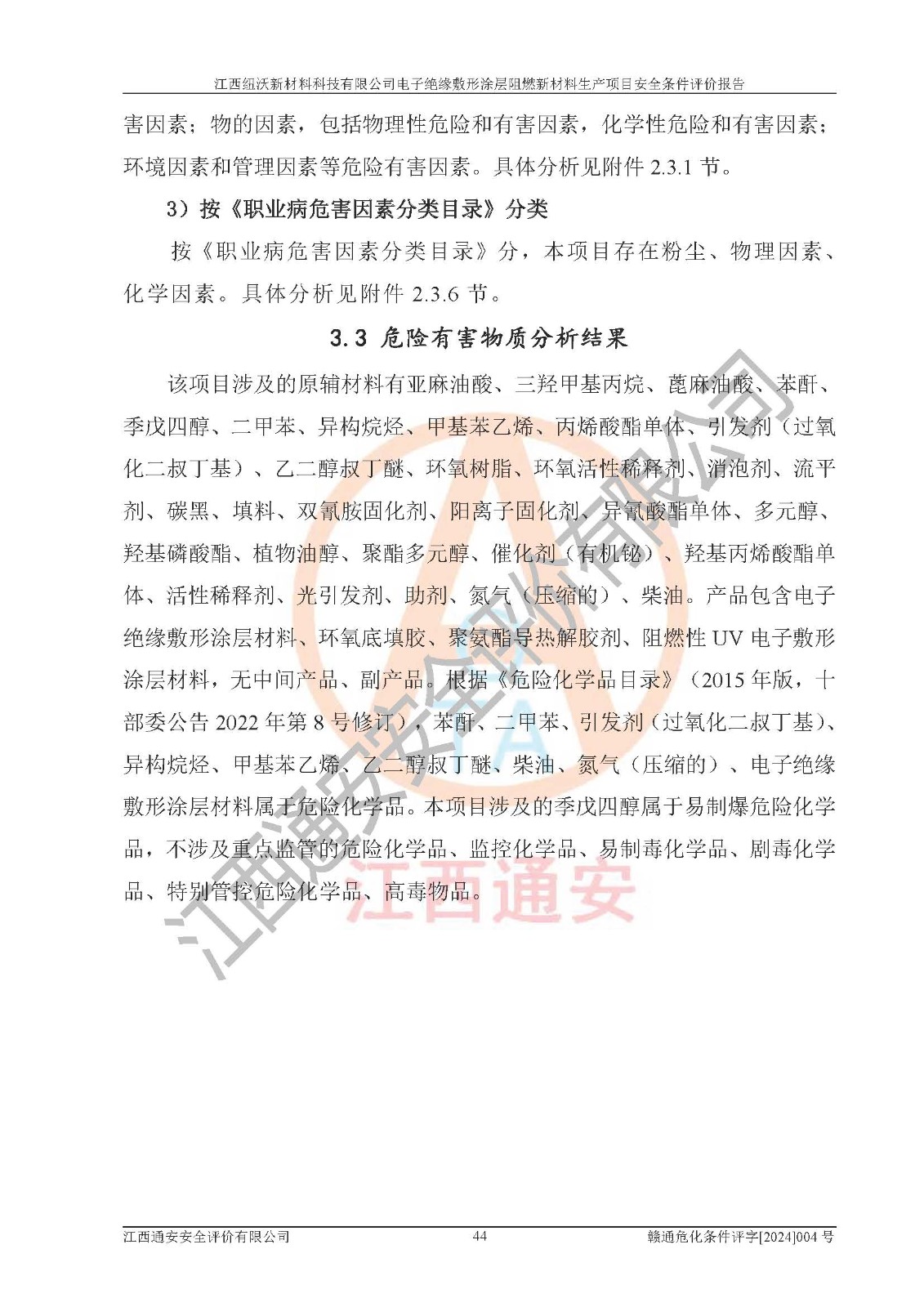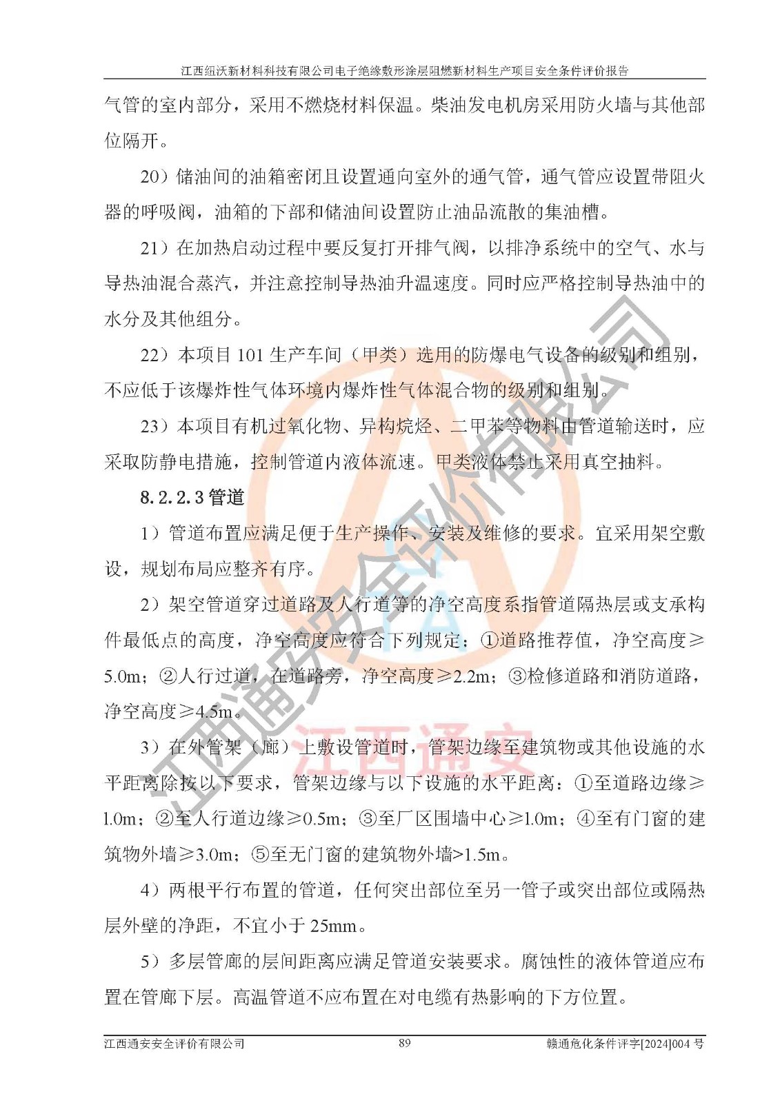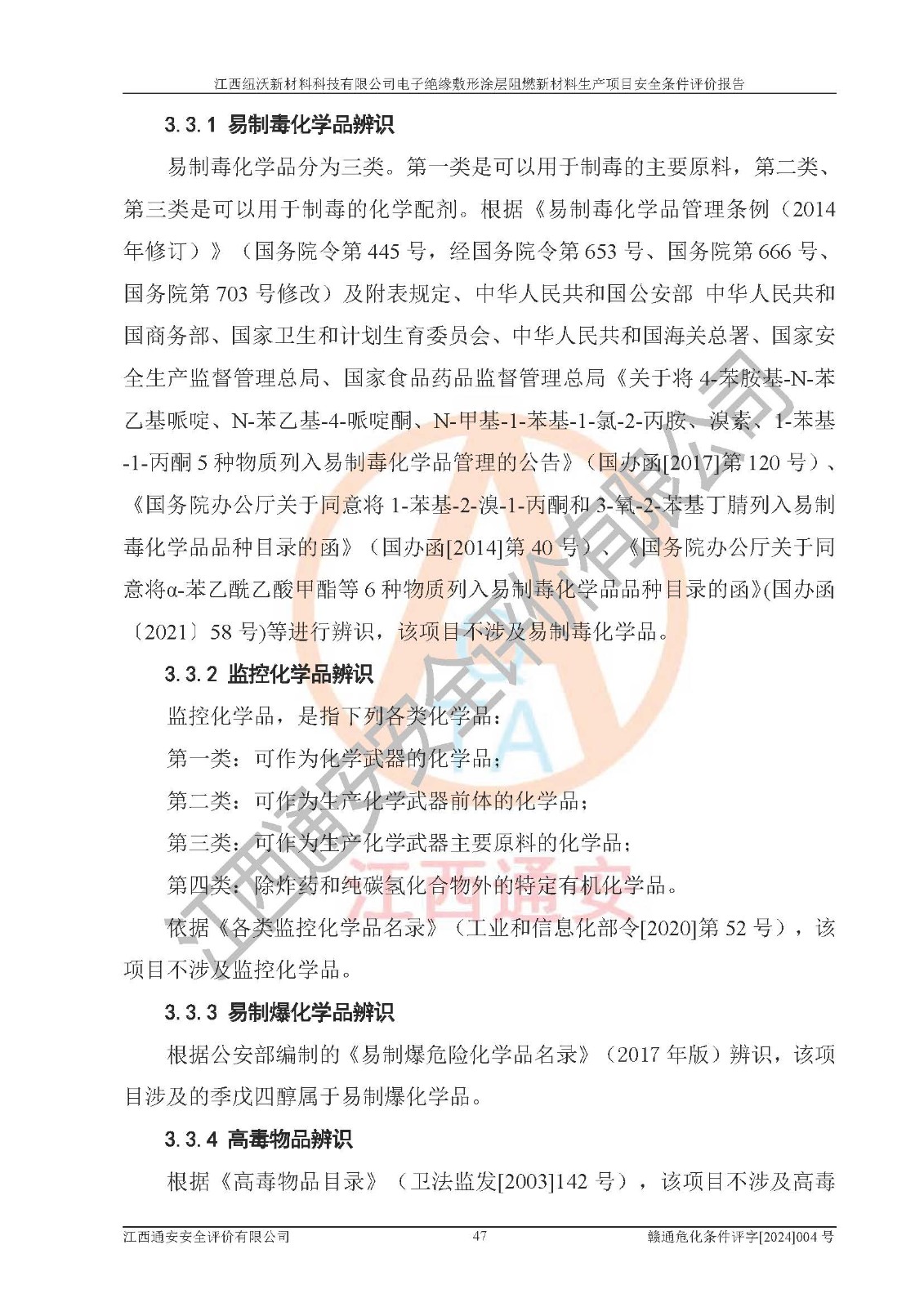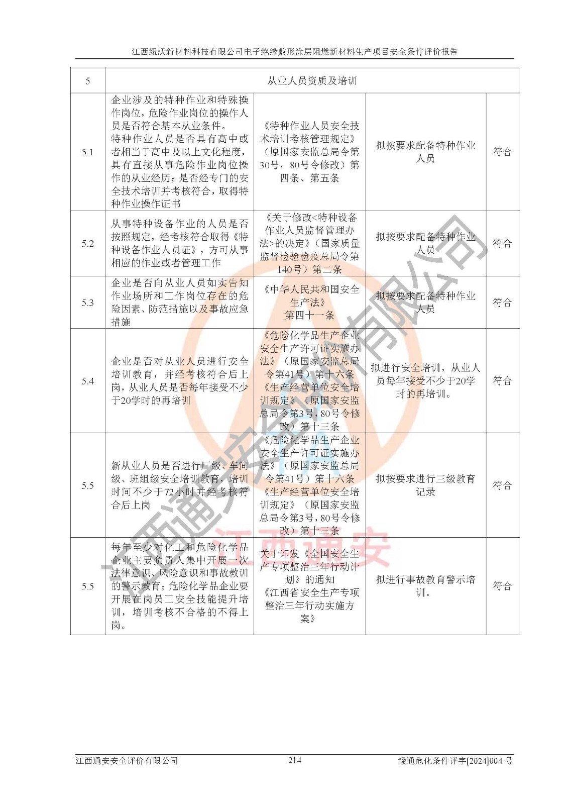 1)本項(xiàng)目依法取得了《江西省企業(yè)投資項(xiàng)目備案通知書》、《建設(shè)用地規(guī)劃許可證》,符合地方產(chǎn)業(yè)發(fā)展規(guī)劃的要求。 2)根據(jù)《**安全監(jiān)管總局關(guān)于公布首批重點(diǎn)監(jiān)管的危險(xiǎn)化工工藝目錄的通知》(安監(jiān)總管三[2009]116號(hào))和《**安全監(jiān)管總局關(guān)于公布第二批重點(diǎn)監(jiān)管危險(xiǎn)化工工藝目錄和調(diào)整首批重點(diǎn)監(jiān)管危險(xiǎn)化工工藝中部分典型工藝的通知》(安監(jiān)總管三[2013]3號(hào)),該項(xiàng)目未涉及重點(diǎn)監(jiān)管危險(xiǎn)化工工藝。 3)根據(jù)《危險(xiǎn)化學(xué)品重大危險(xiǎn)源辨識(shí)》(GB18218-2018),該項(xiàng)目未構(gòu)成危險(xiǎn)化學(xué)品重大危險(xiǎn)源。 4)項(xiàng)目存在的主要危險(xiǎn)因素有:火災(zāi)爆炸、容器爆炸、中毒窒息、灼燙、觸電、**傷害、機(jī)械傷害、高處墜落、物體打擊、淹溺等,存在的主要危害因素有:噪聲與振動(dòng)、高溫、有害化學(xué)物質(zhì)等;引起事故的原因有人的不安全行為、物的不安全狀態(tài)、管理缺陷和環(huán)境不良。其中*主要的危險(xiǎn)有害因素是火災(zāi)爆炸。 5)采用預(yù)先危險(xiǎn)性分析法評(píng)價(jià),結(jié)果為: (1)通過預(yù)先危險(xiǎn)(PHA)分析可知,項(xiàng)目廠址及總體布局單元存在周邊環(huán)境相互影響,發(fā)生異常情況,可對(duì)周邊企業(yè)生產(chǎn)經(jīng)營活動(dòng)、人員活動(dòng)產(chǎn)生影響;存在自然條件影響,可因雷擊、暴雨等引起事故;存在**傷害、建筑物危害,其固有的危險(xiǎn)性等級(jí)為Ⅱ級(jí),屬于“臨界的”,應(yīng)予以排除、采取控制措施因素。 (2)生產(chǎn)作業(yè)存在的危險(xiǎn)因素包括火災(zāi)爆炸、觸電、灼燙、中毒窒息固有的危險(xiǎn)等級(jí)為Ⅲ級(jí),屬于“危險(xiǎn)的”,可能導(dǎo)致人員傷亡和系統(tǒng)損壞的因素,需要采取防范和對(duì)策措施的因素;其它危險(xiǎn)因素固有的危險(xiǎn)等級(jí)為Ⅱ級(jí),屬于“臨界的”,應(yīng)予以排除、采取控制措施因素。 (3)生產(chǎn)作業(yè)存在的噪聲、粉塵、高溫、有害化學(xué)物質(zhì)的危險(xiǎn)有害因素等級(jí)為Ⅱ級(jí),屬于“臨界的”,應(yīng)予以排除、采取控制措施因素。 6)危險(xiǎn)度評(píng)價(jià)分析,結(jié)果為: 生產(chǎn)裝置危險(xiǎn)度評(píng)價(jià)分析:101生產(chǎn)車間為**危險(xiǎn)(Ⅰ級(jí))。 儲(chǔ)存單元危險(xiǎn)度評(píng)價(jià)分析:202甲類倉庫為**危險(xiǎn)(Ⅰ級(jí)),201丙類倉庫為低度危險(xiǎn)(Ⅲ級(jí))。 7)作業(yè)條件危險(xiǎn)性評(píng)價(jià)結(jié)果:在選定的評(píng)價(jià)單元中,其危險(xiǎn)分值均在70以下,危險(xiǎn)程度基本屬于“可能危險(xiǎn)”、“稍有危險(xiǎn)”范圍,作業(yè)條件相對(duì)安全。企業(yè)經(jīng)營過程中首先應(yīng)重點(diǎn)加強(qiáng)對(duì)甲類車間、甲類倉庫的危險(xiǎn)因素的嚴(yán)格控制,注重日常安全管理;其次要建立健全完善的安全生產(chǎn)責(zé)任制、安全管理制度、安全技術(shù)操作規(guī)程并**其貫徹落實(shí);第三要認(rèn)真抓好操作人員、管理人員的安全知識(shí)和操作技能的培訓(xùn),**人員具有與工程技術(shù)水平相適應(yīng)的技術(shù)素質(zhì)和安全素質(zhì),**安全作業(yè)。 8)項(xiàng)目建設(shè)場(chǎng)地符合當(dāng)?shù)匾?guī)劃要求,建設(shè)場(chǎng)地通過合理規(guī)劃,其選址、周邊環(huán)境、總平面布置、交通運(yùn)輸?shù)饶芊稀吨腥A人民共和國安全生產(chǎn)法》、《危險(xiǎn)化學(xué)品安全管理?xiàng)l例》、《建筑設(shè)計(jì)防火規(guī)范》、《精細(xì)化工企業(yè)工程設(shè)計(jì)防火標(biāo)準(zhǔn)》等法規(guī)、標(biāo)準(zhǔn)、規(guī)范要求。 廠址地區(qū)地震活動(dòng)相對(duì)較弱,災(zāi)害性天氣出現(xiàn)頻率稍高,自然災(zāi)害對(duì)項(xiàng)目建設(shè)具有**影響,通過采取相應(yīng)的防護(hù)措施,自然條件適宜建設(shè)。 9)建設(shè)項(xiàng)目符合**產(chǎn)業(yè)政策的要求;選擇工藝為現(xiàn)行成熟工藝,其安全可靠性可得到**。 10)本報(bào)告已根據(jù)有關(guān)安全生產(chǎn)法律、法規(guī)、規(guī)章和**標(biāo)準(zhǔn)、行業(yè)標(biāo)準(zhǔn),并嚴(yán)格執(zhí)行省委辦公廳省**辦公廳《關(guān)于全面加強(qiáng)危險(xiǎn)化學(xué)品安全生產(chǎn)工作的實(shí)施意見》(贛辦發(fā)[2020]32號(hào))及鄱陽湖生態(tài)經(jīng)濟(jì)區(qū)、長(zhǎng)江經(jīng)濟(jì)帶、“五河一湖”相關(guān)政策規(guī)定,客觀、公正、科學(xué)地進(jìn)行安全評(píng)價(jià),項(xiàng)目符合《江西省應(yīng)急管理廳關(guān)于印發(fā)《江西省危險(xiǎn)化學(xué)品建設(shè)項(xiàng)目安全監(jiān)督管理實(shí)施細(xì)則》(試行)的通知》(贛應(yīng)急字[2021]100號(hào))的要求。 11)本報(bào)告結(jié)合工藝特征,提出應(yīng)采取的對(duì)應(yīng)的自動(dòng)化控制系統(tǒng)及自動(dòng)化實(shí)施方案,滿足《江西省應(yīng)急管理廳關(guān)于印發(fā)《江西省化工企業(yè)自動(dòng)化提升實(shí)施方案》(試行)的通知》(贛應(yīng)急字[2021]190號(hào))的要求。 綜上所述:江西紐沃新材料科技有限公司電