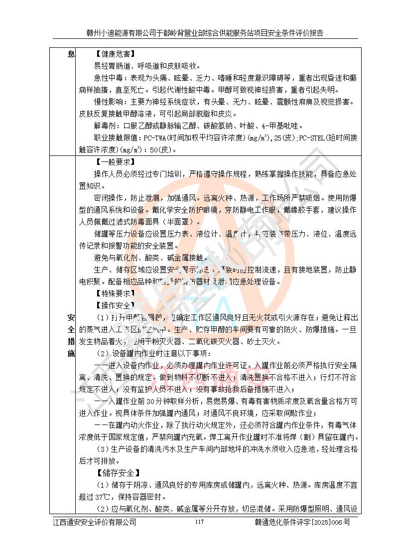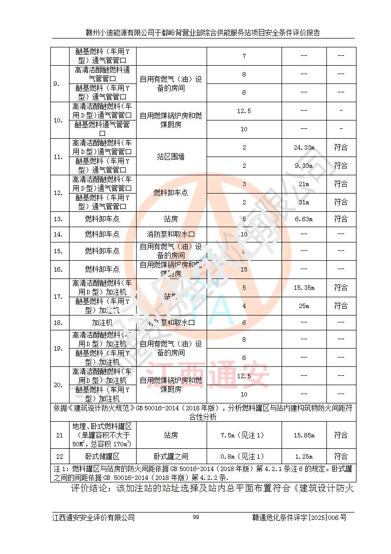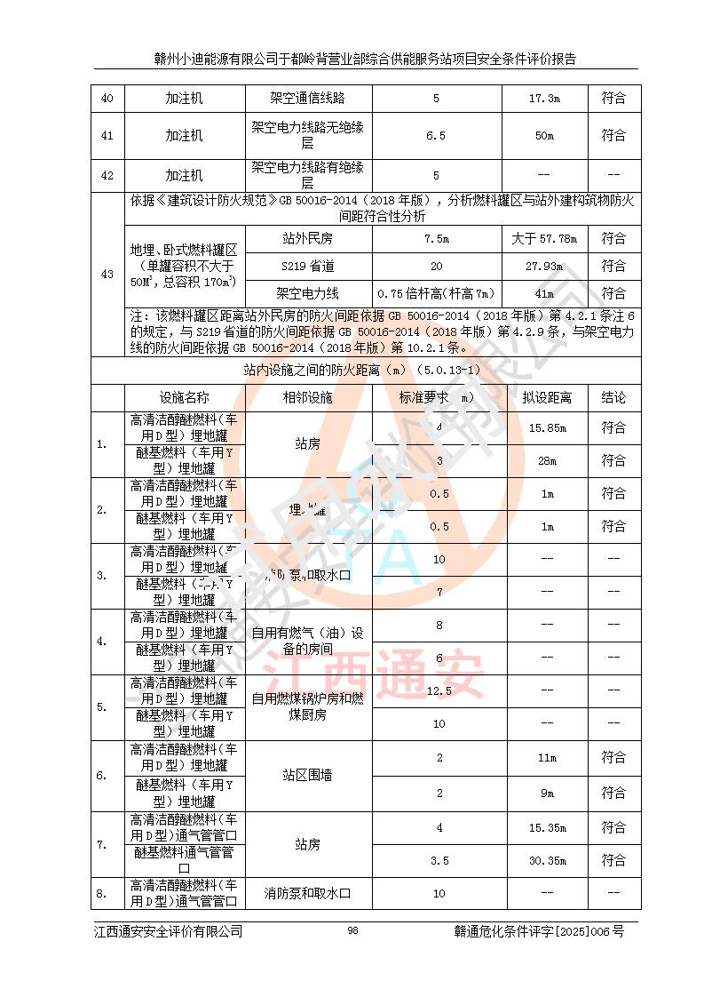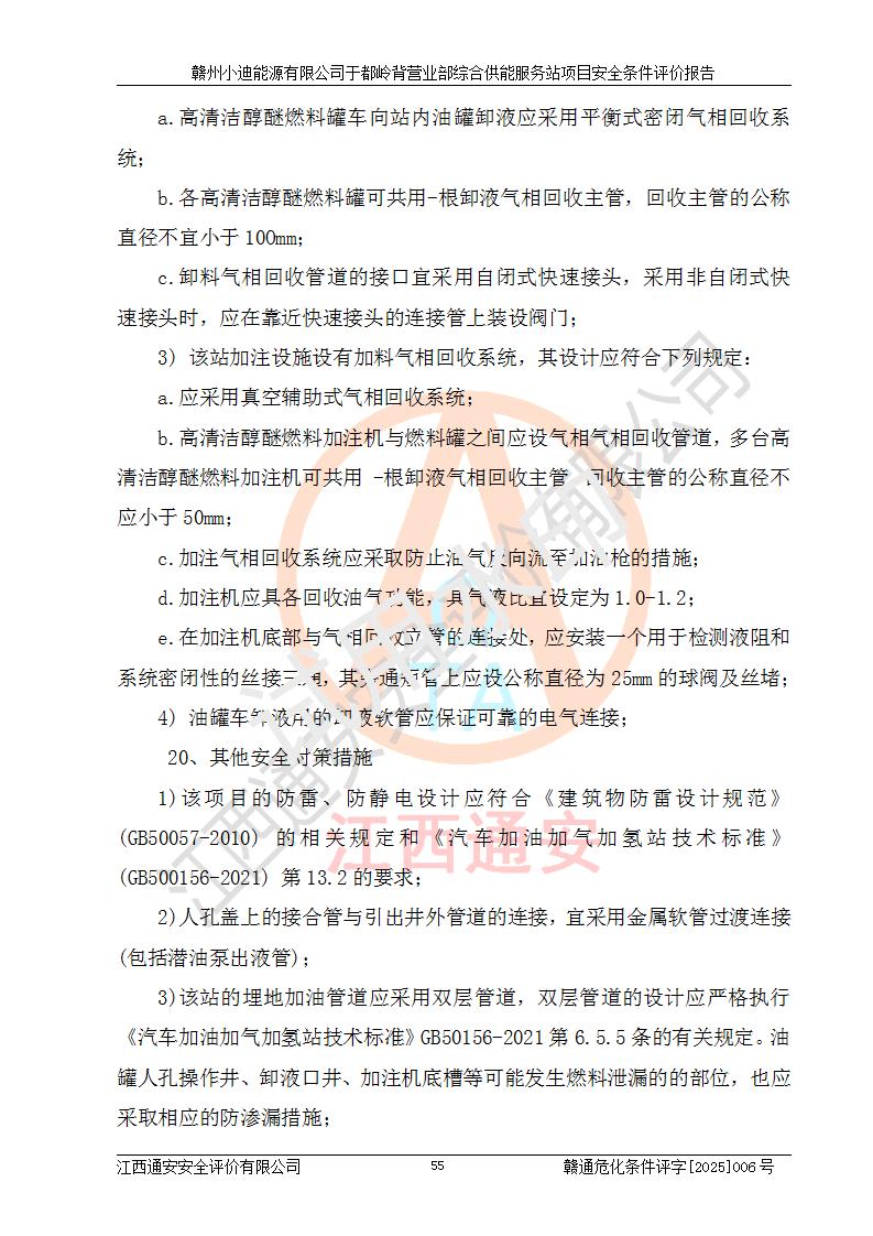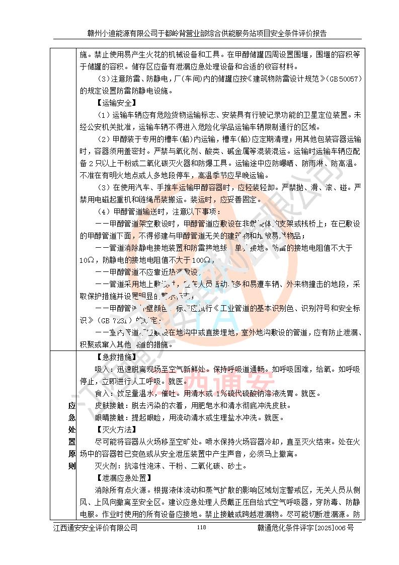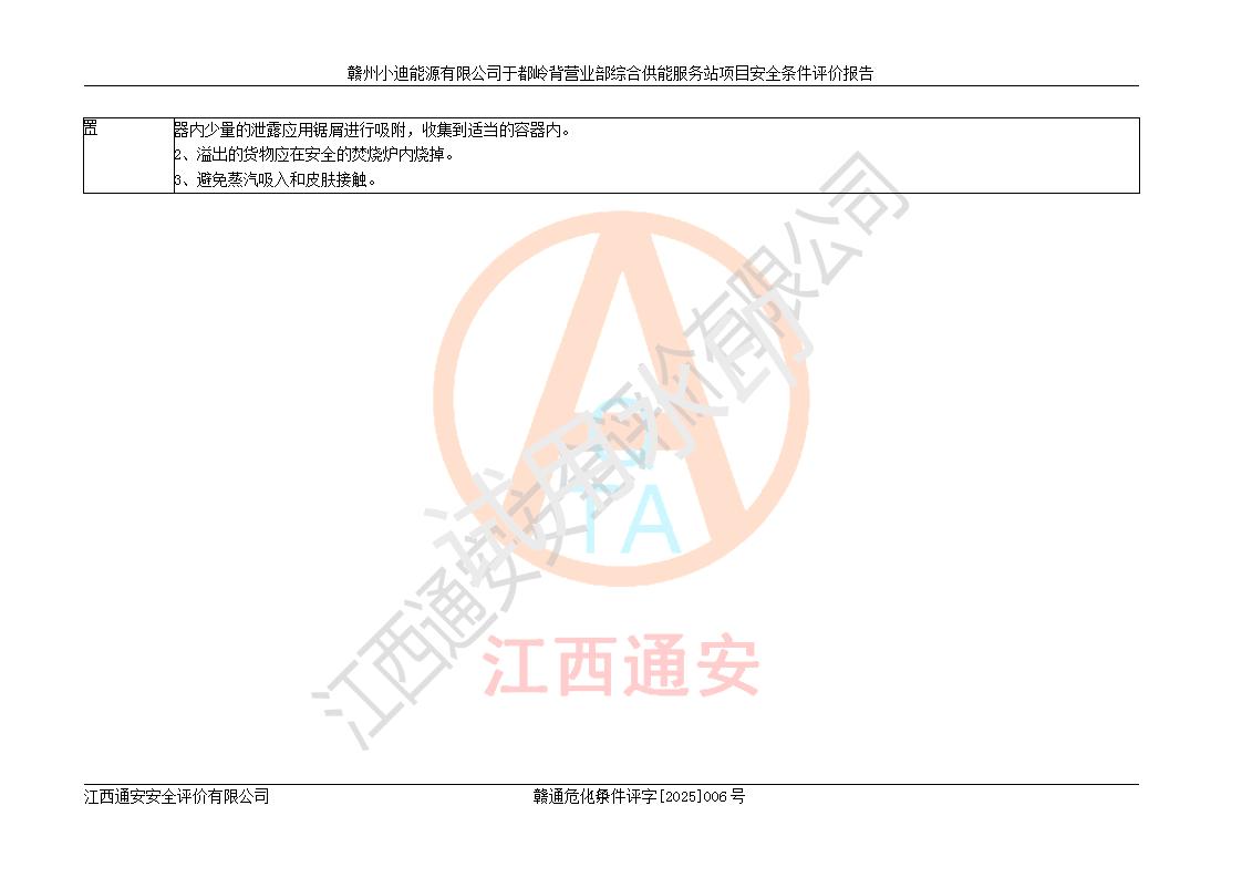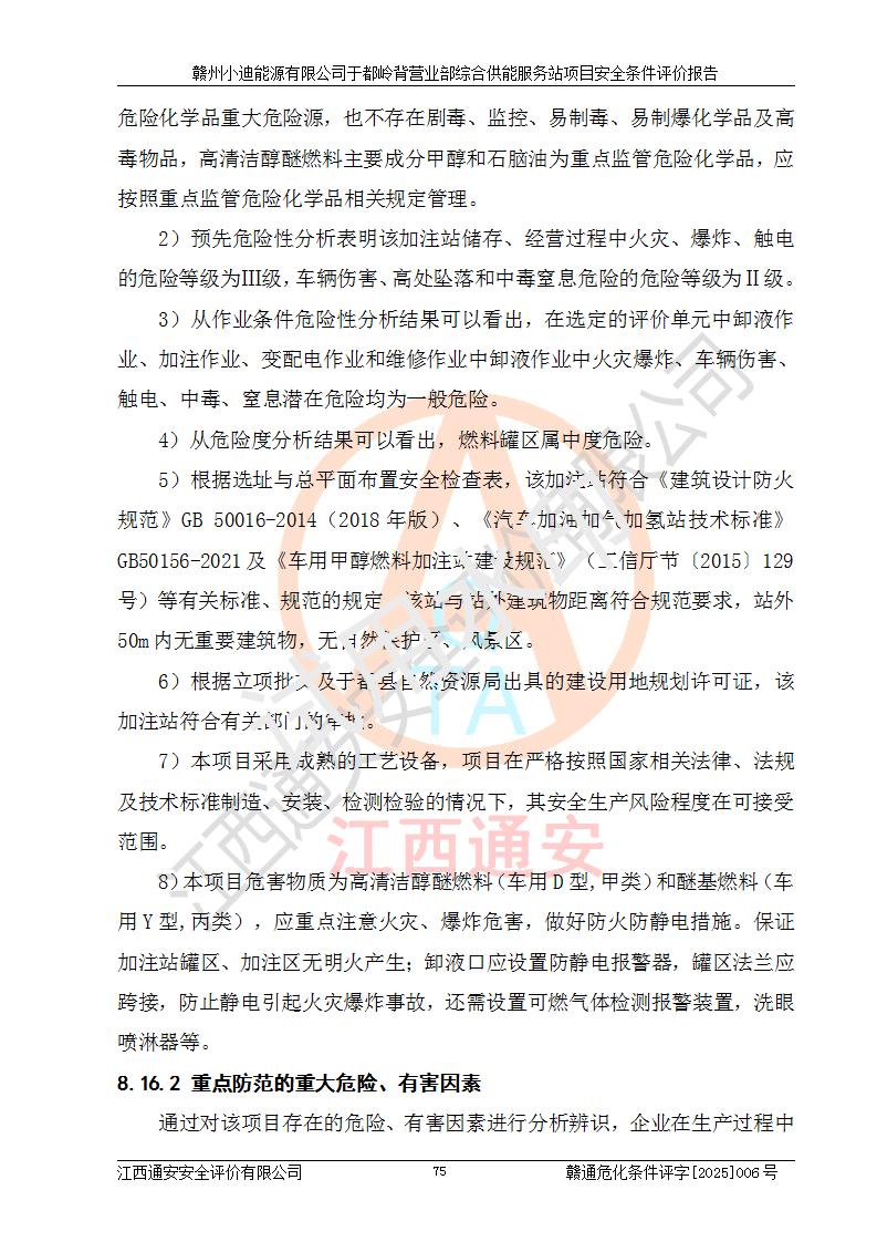 一、安全狀況綜合評(píng)述 通過(guò)對(duì)本項(xiàng)目的危險(xiǎn)、有害因素分析及定性、定量評(píng)價(jià),結(jié)果為: 1)本項(xiàng)目存在的危險(xiǎn)有害因素是火災(zāi)爆炸、**傷害、高處墜落、物體打擊、觸電、機(jī)械傷害、中毒窒息、坍塌等,主要危險(xiǎn)有害因素為火災(zāi)、爆炸等危險(xiǎn)因素。需重點(diǎn)防范的危險(xiǎn)有害因素為火災(zāi)、爆炸。本項(xiàng)目未構(gòu)成危險(xiǎn)化學(xué)品重大危險(xiǎn)源,也不存在劇毒、監(jiān)控、易制毒、易制爆化學(xué)品及高毒物品,高清潔醇醚燃料主要成分甲醇和石腦油為重點(diǎn)監(jiān)管危險(xiǎn)化學(xué)品,應(yīng)按照重點(diǎn)監(jiān)管危險(xiǎn)化學(xué)品相關(guān)規(guī)定管理。 2)預(yù)先危險(xiǎn)性分析表明該加注站儲(chǔ)存、經(jīng)營(yíng)過(guò)程中火災(zāi)、爆炸、觸電的危險(xiǎn)等級(jí)為Ⅲ級(jí),**傷害、高處墜落和中毒窒息等危險(xiǎn)等級(jí)為Ⅱ級(jí)。 3)從作業(yè)條件危險(xiǎn)性分析結(jié)果可以看出,在選定的評(píng)價(jià)單元中卸液作業(yè)、加注作業(yè)、變配電作業(yè)和維修作業(yè)中卸液作業(yè)中火災(zāi)爆炸、**傷害、觸電、中毒、窒息潛在危險(xiǎn)均為一般危險(xiǎn)。 4)從危險(xiǎn)度分析結(jié)果可以看出,燃料罐區(qū)屬中度危險(xiǎn)。 5)根據(jù)選址與總平面布置安全檢查表,該加注站符合《建筑設(shè)計(jì)防火規(guī)范》GB 50016-2014(2018年版)、《汽車(chē)加油加氣加氫站技術(shù)標(biāo)準(zhǔn)》GB50156-2021及《車(chē)用甲醇燃料加注站建設(shè)規(guī)范》(工信廳節(jié)〔2015〕129號(hào))等有關(guān)標(biāo)準(zhǔn)、規(guī)范的規(guī)定。該站與站外建筑物距離符合規(guī)范要求,站外50m內(nèi)無(wú)重要建筑物和明火設(shè)施。 6)根據(jù)立項(xiàng)批文及于都縣自然資源局出具的建設(shè)用地規(guī)劃許可證,該加注站符合有關(guān)部門(mén)的審批。 7)本項(xiàng)目采用成熟的工藝設(shè)備,項(xiàng)目在嚴(yán)格按照**相關(guān)法律、法規(guī)及技術(shù)標(biāo)準(zhǔn)制造、安裝、檢測(cè)檢驗(yàn)的情況下,其安全生產(chǎn)風(fēng)險(xiǎn)程度在可接受范圍。 8)本項(xiàng)目危害物質(zhì)為高清潔醇醚燃料(車(chē)用D型,甲類)和醚基燃料(車(chē)用Y型,丙類),應(yīng)重點(diǎn)注意火災(zāi)、爆炸危害,做好防火防靜電措施。**加注站罐區(qū)、加注區(qū)無(wú)明火產(chǎn)生;卸液口應(yīng)設(shè)置防靜電報(bào)警器,罐區(qū)法蘭應(yīng)跨接,防止靜電引起火災(zāi)爆炸事故。 四、評(píng)價(jià)結(jié)論 贛州小迪能源有限公司于都嶺背營(yíng)業(yè)部綜合供能服務(wù)站項(xiàng)目總平面布置符合相關(guān)規(guī)范的要求。在項(xiàng)目建設(shè)和運(yùn)行階段,總平面布置設(shè)計(jì)、施工圖設(shè)計(jì)和建設(shè)施工、安裝調(diào)試及生產(chǎn)運(yùn)行中,應(yīng)嚴(yán)格執(zhí)行**有關(guān)安全生產(chǎn)法律、法規(guī)和有關(guān)標(biāo)準(zhǔn)、規(guī)范,將本報(bào)告中提出的安全對(duì)策措施落實(shí)到位,真正做到安全設(shè)施與主體工程同時(shí)設(shè)計(jì)、同時(shí)施工、同時(shí)投入生產(chǎn)和使用,項(xiàng)目建成后危險(xiǎn)、有害因素可以得到**控制,安全風(fēng)險(xiǎn)在可接受范圍,擬建的贛州小迪能源有限公司于都嶺背營(yíng)業(yè)部綜合供能服務(wù)站項(xiàng)目符合法律法規(guī)、標(biāo)準(zhǔn)、規(guī)章和規(guī)范的要求。 |