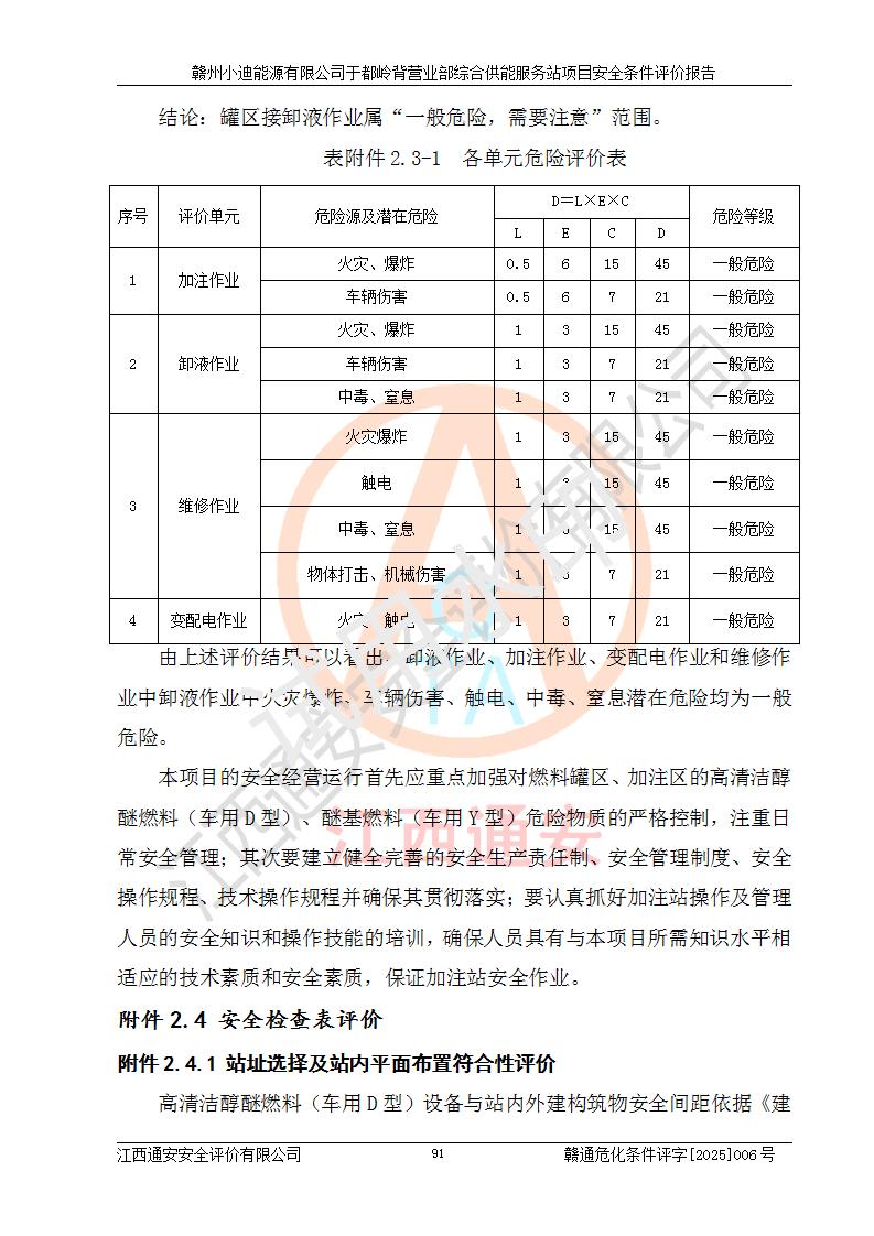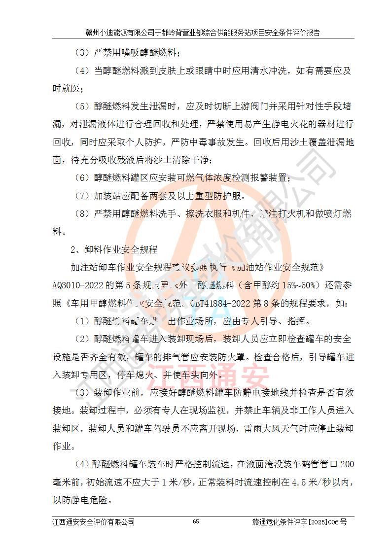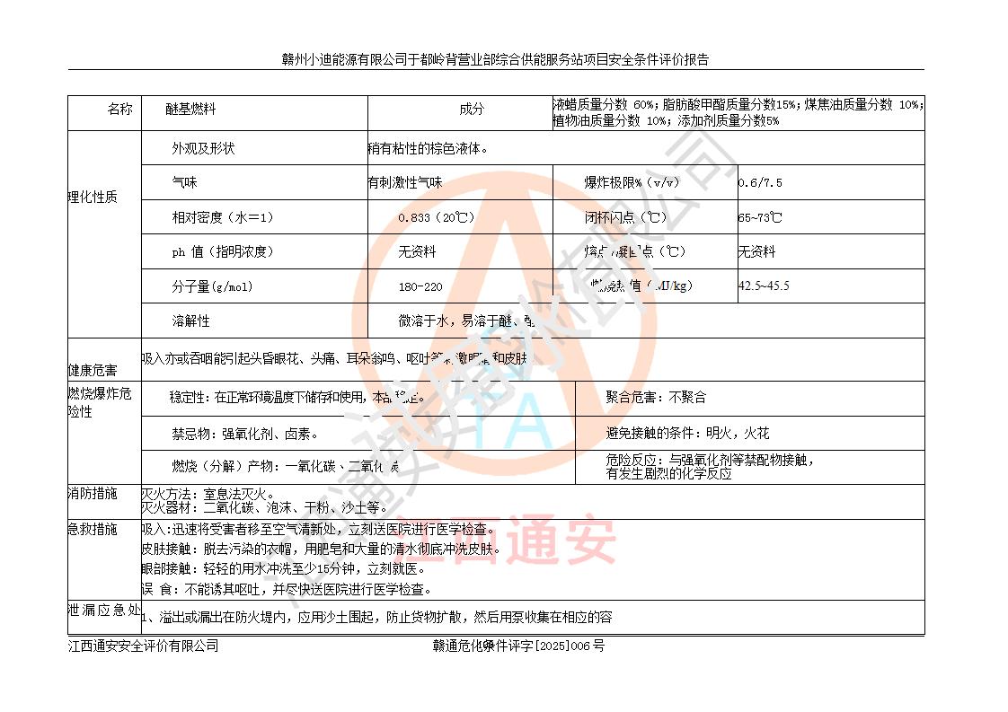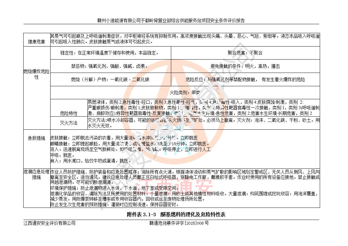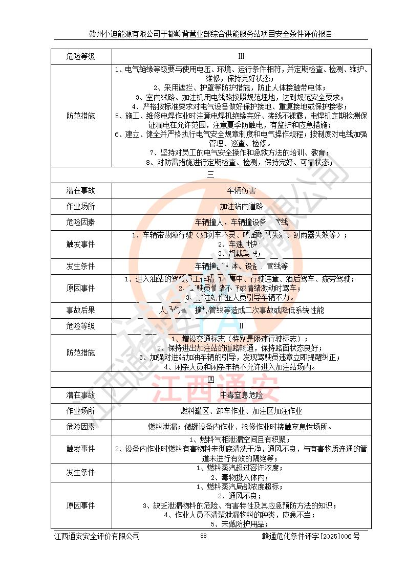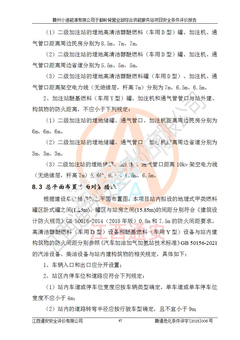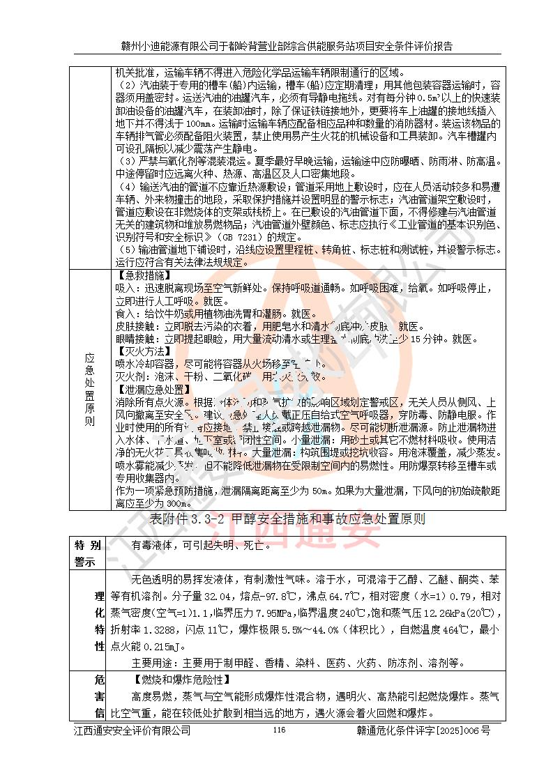 一、安全狀況綜合評(píng)述 通過(guò)對(duì)本項(xiàng)目的危險(xiǎn)、有害因素分析及定性、定量評(píng)價(jià),結(jié)果為: 1)本項(xiàng)目存在的危險(xiǎn)有害因素是火災(zāi)爆炸、**傷害、高處墜落、物體打擊、觸電、機(jī)械傷害、中毒窒息、坍塌等,主要危險(xiǎn)有害因素為火災(zāi)、爆炸等危險(xiǎn)因素。需重點(diǎn)防范的危險(xiǎn)有害因素為火災(zāi)、爆炸。本項(xiàng)目未構(gòu)成危險(xiǎn)化學(xué)品重大危險(xiǎn)源,也不存在劇毒、監(jiān)控、易制毒、易制爆化學(xué)品及高毒物品,高清潔醇醚燃料主要成分甲醇和石腦油為重點(diǎn)監(jiān)管危險(xiǎn)化學(xué)品,應(yīng)按照重點(diǎn)監(jiān)管危險(xiǎn)化學(xué)品相關(guān)規(guī)定管理。 2)預(yù)先危險(xiǎn)性分析表明該加注站儲(chǔ)存、經(jīng)營(yíng)過(guò)程中火災(zāi)、爆炸、觸電的危險(xiǎn)等級(jí)為Ⅲ級(jí),**傷害、高處墜落和中毒窒息等危險(xiǎn)等級(jí)為Ⅱ級(jí)。 3)從作業(yè)條件危險(xiǎn)性分析結(jié)果可以看出,在選定的評(píng)價(jià)單元中卸液作業(yè)、加注作業(yè)、變配電作業(yè)和維修作業(yè)中卸液作業(yè)中火災(zāi)爆炸、**傷害、觸電、中毒、窒息潛在危險(xiǎn)均為一般危險(xiǎn)。 4)從危險(xiǎn)度分析結(jié)果可以看出,燃料罐區(qū)屬中度危險(xiǎn)。 5)根據(jù)選址與總平面布置安全檢查表,該加注站符合《建筑設(shè)計(jì)防火規(guī)范》GB 50016-2014(2018年版)、《汽車(chē)加油加氣加氫站技術(shù)標(biāo)準(zhǔn)》GB50156-2021及《車(chē)用甲醇燃料加注站建設(shè)規(guī)范》(工信廳節(jié)〔2015〕129號(hào))等有關(guān)標(biāo)準(zhǔn)、規(guī)范的規(guī)定。該站與站外建筑物距離符合規(guī)范要求,站外50m內(nèi)無(wú)重要建筑物和明火設(shè)施。 6)根據(jù)立項(xiàng)批文及于都縣自然資源局出具的建設(shè)用地規(guī)劃許可證,該加注站符合有關(guān)部門(mén)的審批。 7)本項(xiàng)目采用成熟的工藝設(shè)備,項(xiàng)目在嚴(yán)格按照**相關(guān)法律、法規(guī)及技術(shù)標(biāo)準(zhǔn)制造、安裝、檢測(cè)檢驗(yàn)的情況下,其安全生產(chǎn)風(fēng)險(xiǎn)程度在可接受范圍。 8)本項(xiàng)目危害物質(zhì)為高清潔醇醚燃料(車(chē)用D型,甲類)和醚基燃料(車(chē)用Y型,丙類),應(yīng)重點(diǎn)注意火災(zāi)、爆炸危害,做好防火防靜電措施。**加注站罐區(qū)、加注區(qū)無(wú)明火產(chǎn)生;卸液口應(yīng)設(shè)置防靜電報(bào)警器,罐區(qū)法蘭應(yīng)跨接,防止靜電引起火災(zāi)爆炸事故。 四、評(píng)價(jià)結(jié)論 贛州小迪能源有限公司于都嶺背營(yíng)業(yè)部綜合供能服務(wù)站項(xiàng)目總平面布置符合相關(guān)規(guī)范的要求。在項(xiàng)目建設(shè)和運(yùn)行階段,總平面布置設(shè)計(jì)、施工圖設(shè)計(jì)和建設(shè)施工、安裝調(diào)試及生產(chǎn)運(yùn)行中,應(yīng)嚴(yán)格執(zhí)行**有關(guān)安全生產(chǎn)法律、法規(guī)和有關(guān)標(biāo)準(zhǔn)、規(guī)范,將本報(bào)告中提出的安全對(duì)策措施落實(shí)到位,真正做到安全設(shè)施與主體工程同時(shí)設(shè)計(jì)、同時(shí)施工、同時(shí)投入生產(chǎn)和使用,項(xiàng)目建成后危險(xiǎn)、有害因素可以得到**控制,安全風(fēng)險(xiǎn)在可接受范圍,擬建的贛州小迪能源有限公司于都嶺背營(yíng)業(yè)部綜合供能服務(wù)站項(xiàng)目符合法律法規(guī)、標(biāo)準(zhǔn)、規(guī)章和規(guī)范的要求。 |