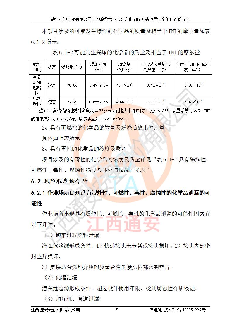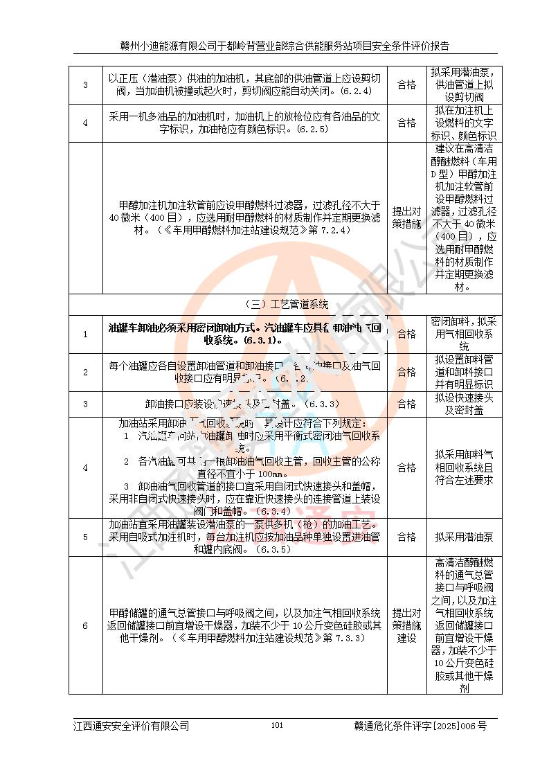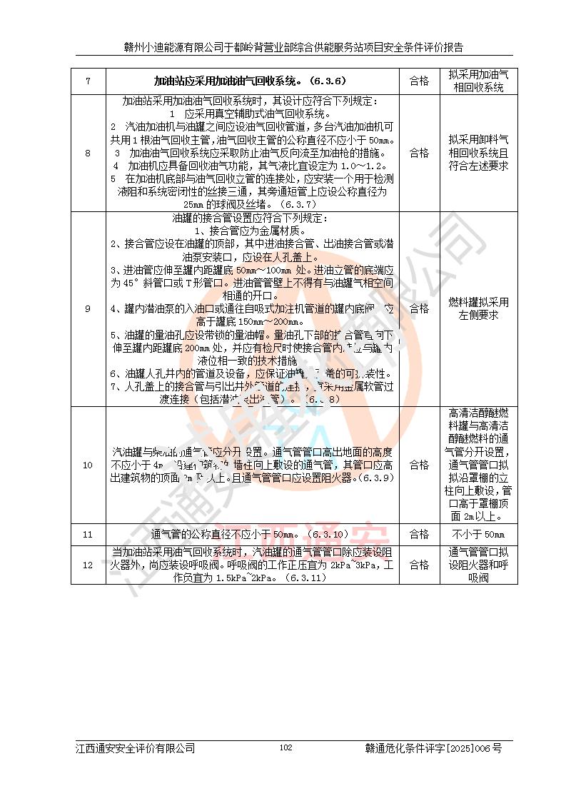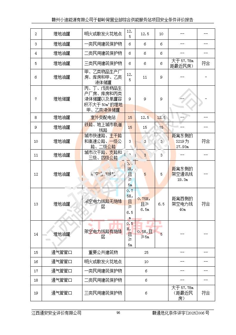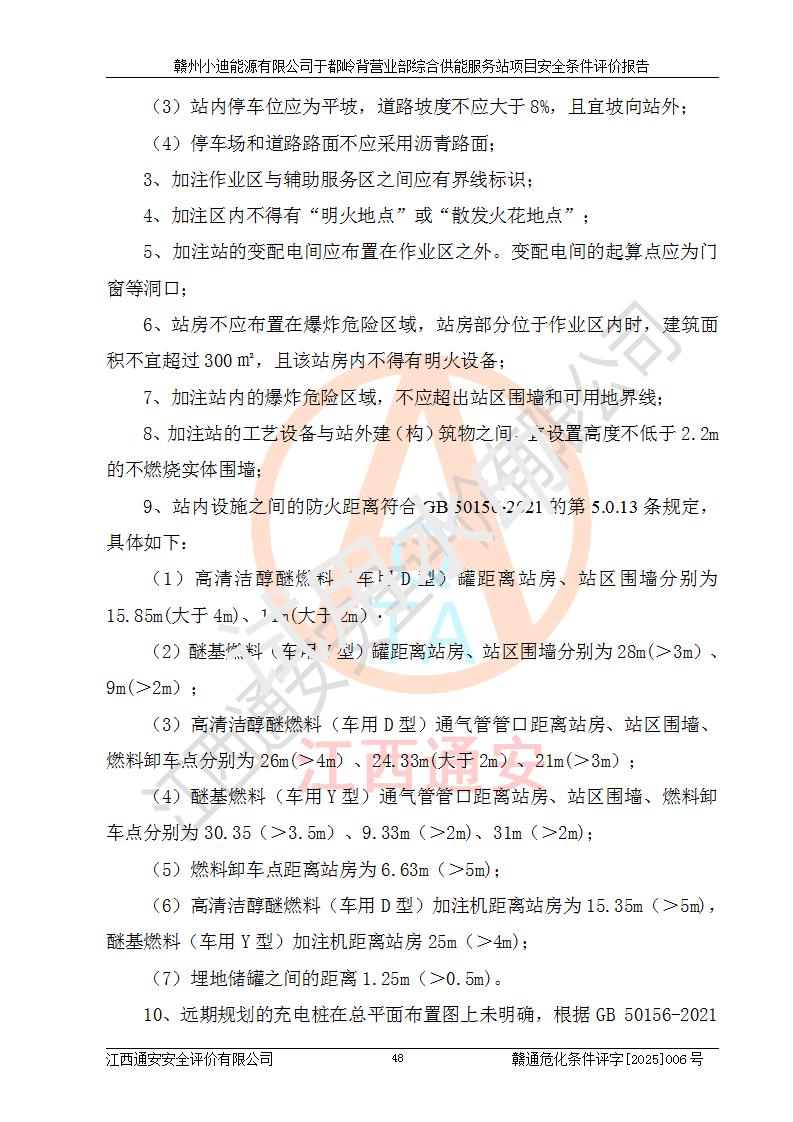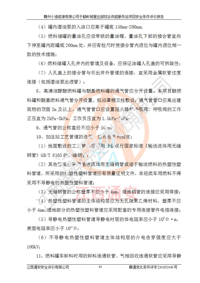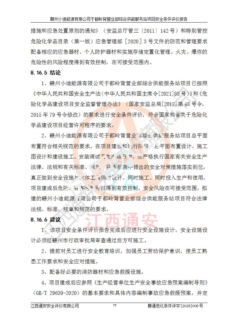 一、安全狀況綜合評(píng)述 通過(guò)對(duì)本項(xiàng)目的危險(xiǎn)、有害因素分析及定性、定量評(píng)價(jià),結(jié)果為: 1)本項(xiàng)目存在的危險(xiǎn)有害因素是火災(zāi)爆炸、**傷害、高處墜落、物體打擊、觸電、機(jī)械傷害、中毒窒息、坍塌等,主要危險(xiǎn)有害因素為火災(zāi)、爆炸等危險(xiǎn)因素。需重點(diǎn)防范的危險(xiǎn)有害因素為火災(zāi)、爆炸。本項(xiàng)目未構(gòu)成危險(xiǎn)化學(xué)品重大危險(xiǎn)源,也不存在劇毒、監(jiān)控、易制毒、易制爆化學(xué)品及高毒物品,高清潔醇醚燃料主要成分甲醇和石腦油為重點(diǎn)監(jiān)管危險(xiǎn)化學(xué)品,應(yīng)按照重點(diǎn)監(jiān)管危險(xiǎn)化學(xué)品相關(guān)規(guī)定管理。 2)預(yù)先危險(xiǎn)性分析表明該加注站儲(chǔ)存、經(jīng)營(yíng)過(guò)程中火災(zāi)、爆炸、觸電的危險(xiǎn)等級(jí)為Ⅲ級(jí),**傷害、高處墜落和中毒窒息等危險(xiǎn)等級(jí)為Ⅱ級(jí)。 3)從作業(yè)條件危險(xiǎn)性分析結(jié)果可以看出,在選定的評(píng)價(jià)單元中卸液作業(yè)、加注作業(yè)、變配電作業(yè)和維修作業(yè)中卸液作業(yè)中火災(zāi)爆炸、**傷害、觸電、中毒、窒息潛在危險(xiǎn)均為一般危險(xiǎn)。 4)從危險(xiǎn)度分析結(jié)果可以看出,燃料罐區(qū)屬中度危險(xiǎn)。 5)根據(jù)選址與總平面布置安全檢查表,該加注站符合《建筑設(shè)計(jì)防火規(guī)范》GB 50016-2014(2018年版)、《汽車(chē)加油加氣加氫站技術(shù)標(biāo)準(zhǔn)》GB50156-2021及《車(chē)用甲醇燃料加注站建設(shè)規(guī)范》(工信廳節(jié)〔2015〕129號(hào))等有關(guān)標(biāo)準(zhǔn)、規(guī)范的規(guī)定。該站與站外建筑物距離符合規(guī)范要求,站外50m內(nèi)無(wú)重要建筑物和明火設(shè)施。 6)根據(jù)立項(xiàng)批文及于都縣自然資源局出具的建設(shè)用地規(guī)劃許可證,該加注站符合有關(guān)部門(mén)的審批。 7)本項(xiàng)目采用成熟的工藝設(shè)備,項(xiàng)目在嚴(yán)格按照**相關(guān)法律、法規(guī)及技術(shù)標(biāo)準(zhǔn)制造、安裝、檢測(cè)檢驗(yàn)的情況下,其安全生產(chǎn)風(fēng)險(xiǎn)程度在可接受范圍。 8)本項(xiàng)目危害物質(zhì)為高清潔醇醚燃料(車(chē)用D型,甲類)和醚基燃料(車(chē)用Y型,丙類),應(yīng)重點(diǎn)注意火災(zāi)、爆炸危害,做好防火防靜電措施。**加注站罐區(qū)、加注區(qū)無(wú)明火產(chǎn)生;卸液口應(yīng)設(shè)置防靜電報(bào)警器,罐區(qū)法蘭應(yīng)跨接,防止靜電引起火災(zāi)爆炸事故。 四、評(píng)價(jià)結(jié)論 贛州小迪能源有限公司于都嶺背營(yíng)業(yè)部綜合供能服務(wù)站項(xiàng)目總平面布置符合相關(guān)規(guī)范的要求。在項(xiàng)目建設(shè)和運(yùn)行階段,總平面布置設(shè)計(jì)、施工圖設(shè)計(jì)和建設(shè)施工、安裝調(diào)試及生產(chǎn)運(yùn)行中,應(yīng)嚴(yán)格執(zhí)行**有關(guān)安全生產(chǎn)法律、法規(guī)和有關(guān)標(biāo)準(zhǔn)、規(guī)范,將本報(bào)告中提出的安全對(duì)策措施落實(shí)到位,真正做到安全設(shè)施與主體工程同時(shí)設(shè)計(jì)、同時(shí)施工、同時(shí)投入生產(chǎn)和使用,項(xiàng)目建成后危險(xiǎn)、有害因素可以得到**控制,安全風(fēng)險(xiǎn)在可接受范圍,擬建的贛州小迪能源有限公司于都嶺背營(yíng)業(yè)部綜合供能服務(wù)站項(xiàng)目符合法律法規(guī)、標(biāo)準(zhǔn)、規(guī)章和規(guī)范的要求。 |
