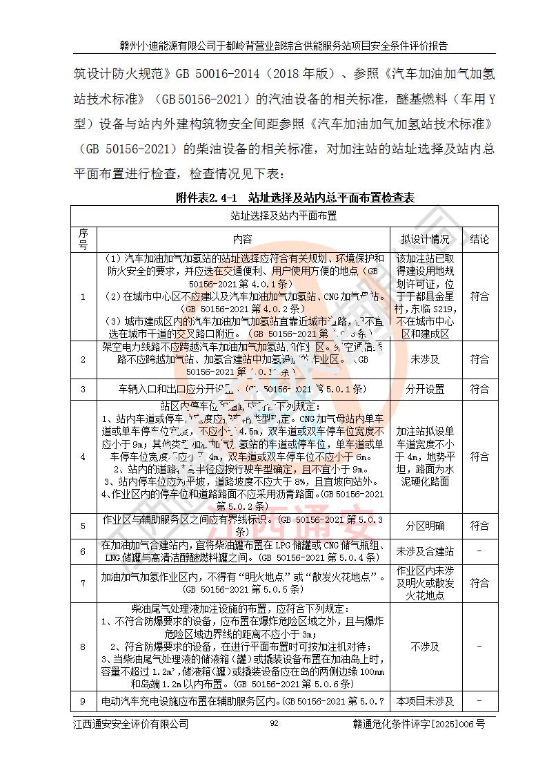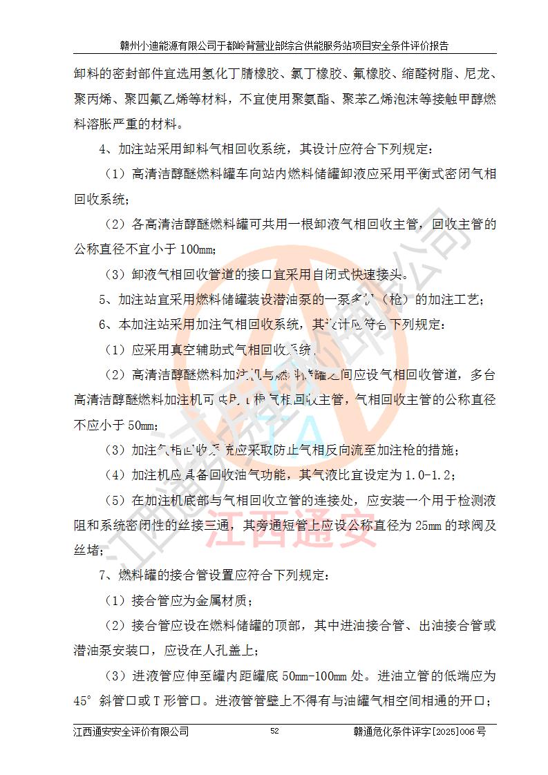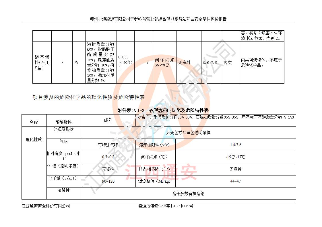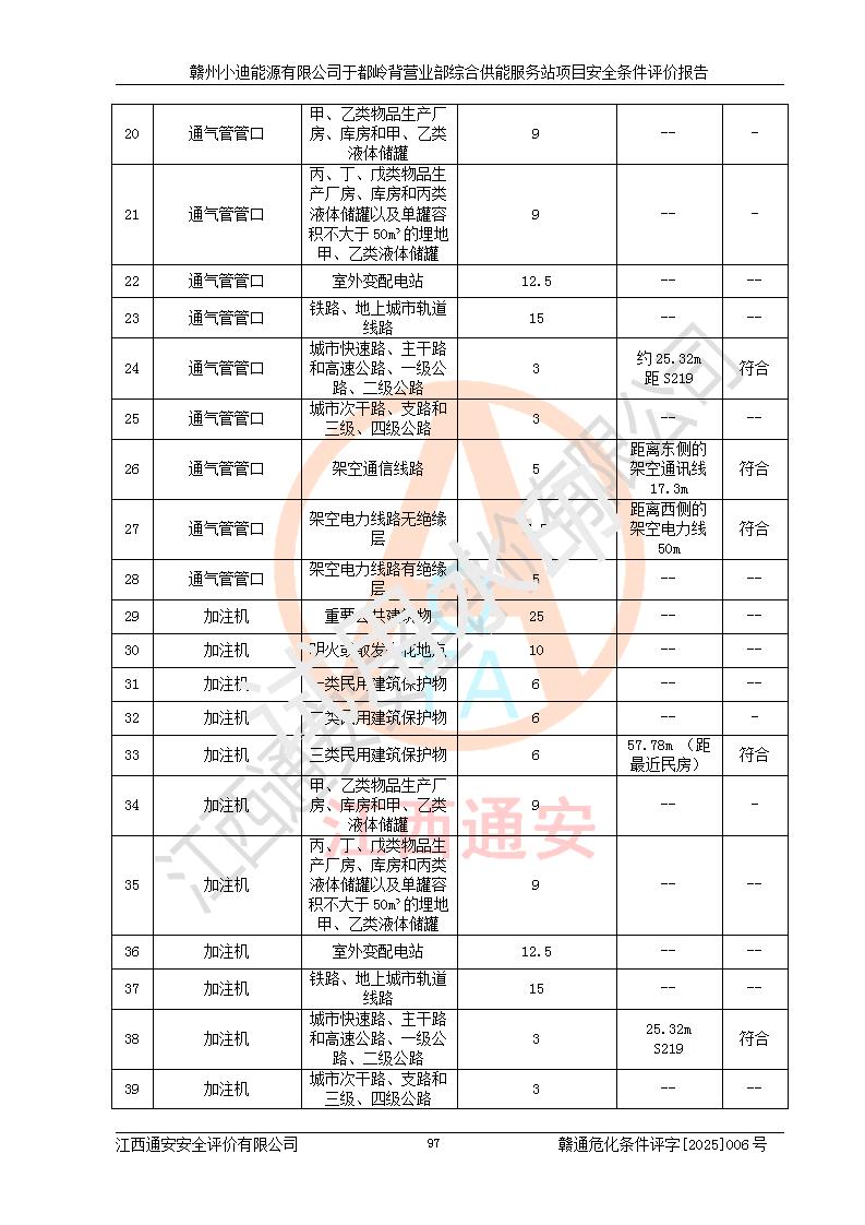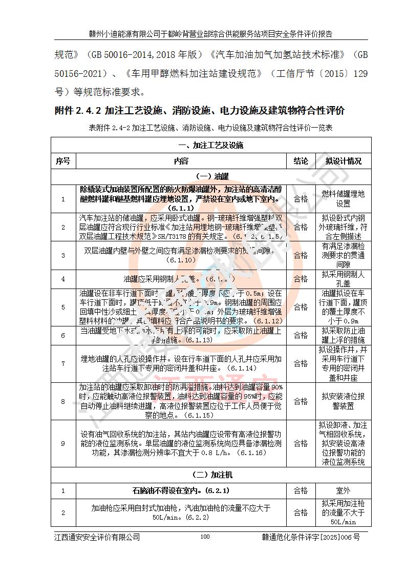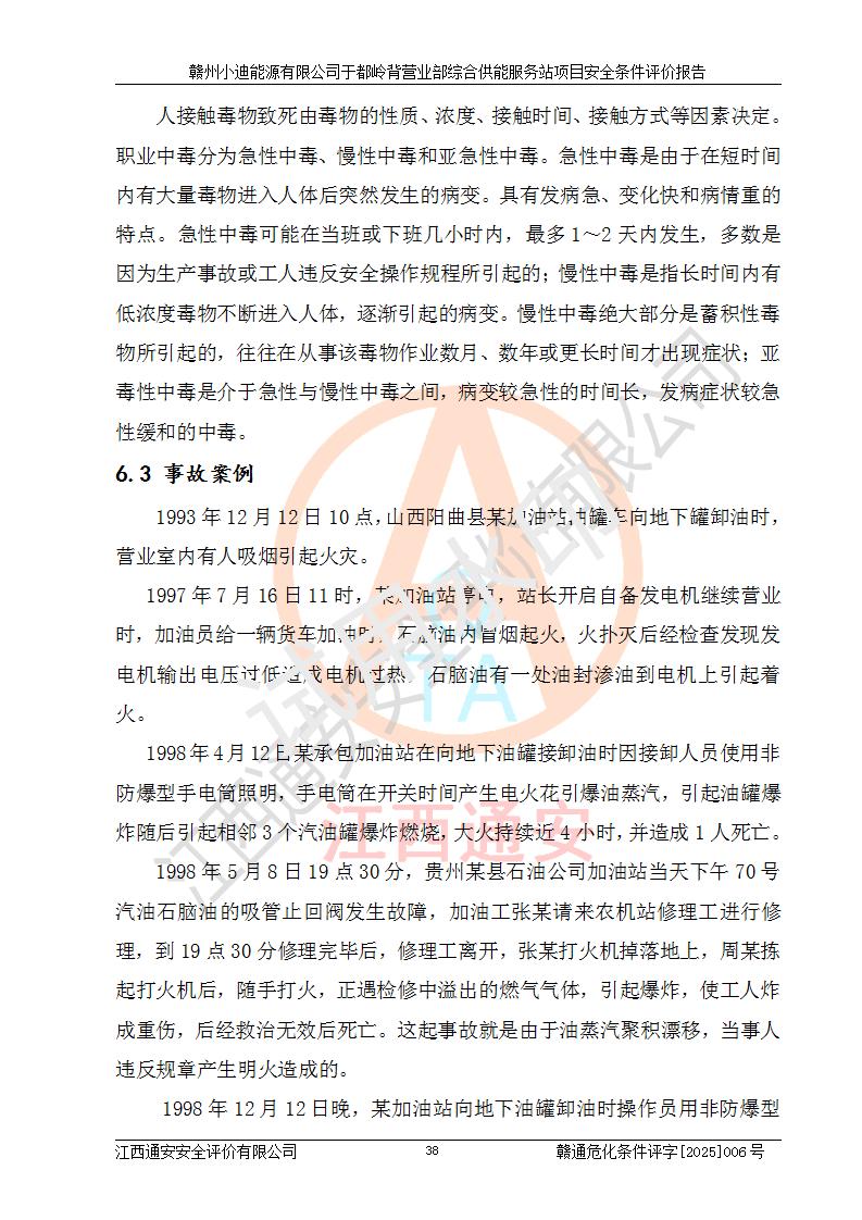 一、安全狀況綜合評(píng)述 通過(guò)對(duì)本項(xiàng)目的危險(xiǎn)、有害因素分析及定性、定量評(píng)價(jià),結(jié)果為: 1)本項(xiàng)目存在的危險(xiǎn)有害因素是火災(zāi)爆炸、**傷害、高處墜落、物體打擊、觸電、機(jī)械傷害、中毒窒息、坍塌等,主要危險(xiǎn)有害因素為火災(zāi)、爆炸等危險(xiǎn)因素。需重點(diǎn)防范的危險(xiǎn)有害因素為火災(zāi)、爆炸。本項(xiàng)目未構(gòu)成危險(xiǎn)化學(xué)品重大危險(xiǎn)源,也不存在劇毒、監(jiān)控、易制毒、易制爆化學(xué)品及高毒物品,高清潔醇醚燃料主要成分甲醇和石腦油為重點(diǎn)監(jiān)管危險(xiǎn)化學(xué)品,應(yīng)按照重點(diǎn)監(jiān)管危險(xiǎn)化學(xué)品相關(guān)規(guī)定管理。 2)預(yù)先危險(xiǎn)性分析表明該加注站儲(chǔ)存、經(jīng)營(yíng)過(guò)程中火災(zāi)、爆炸、觸電的危險(xiǎn)等級(jí)為Ⅲ級(jí),**傷害、高處墜落和中毒窒息等危險(xiǎn)等級(jí)為Ⅱ級(jí)。 3)從作業(yè)條件危險(xiǎn)性分析結(jié)果可以看出,在選定的評(píng)價(jià)單元中卸液作業(yè)、加注作業(yè)、變配電作業(yè)和維修作業(yè)中卸液作業(yè)中火災(zāi)爆炸、**傷害、觸電、中毒、窒息潛在危險(xiǎn)均為一般危險(xiǎn)。 4)從危險(xiǎn)度分析結(jié)果可以看出,燃料罐區(qū)屬中度危險(xiǎn)。 5)根據(jù)選址與總平面布置安全檢查表,該加注站符合《建筑設(shè)計(jì)防火規(guī)范》GB 50016-2014(2018年版)、《汽車(chē)加油加氣加氫站技術(shù)標(biāo)準(zhǔn)》GB50156-2021及《車(chē)用甲醇燃料加注站建設(shè)規(guī)范》(工信廳節(jié)〔2015〕129號(hào))等有關(guān)標(biāo)準(zhǔn)、規(guī)范的規(guī)定。該站與站外建筑物距離符合規(guī)范要求,站外50m內(nèi)無(wú)重要建筑物和明火設(shè)施。 6)根據(jù)立項(xiàng)批文及于都縣自然資源局出具的建設(shè)用地規(guī)劃許可證,該加注站符合有關(guān)部門(mén)的審批。 7)本項(xiàng)目采用成熟的工藝設(shè)備,項(xiàng)目在嚴(yán)格按照**相關(guān)法律、法規(guī)及技術(shù)標(biāo)準(zhǔn)制造、安裝、檢測(cè)檢驗(yàn)的情況下,其安全生產(chǎn)風(fēng)險(xiǎn)程度在可接受范圍。 8)本項(xiàng)目危害物質(zhì)為高清潔醇醚燃料(車(chē)用D型,甲類)和醚基燃料(車(chē)用Y型,丙類),應(yīng)重點(diǎn)注意火災(zāi)、爆炸危害,做好防火防靜電措施。**加注站罐區(qū)、加注區(qū)無(wú)明火產(chǎn)生;卸液口應(yīng)設(shè)置防靜電報(bào)警器,罐區(qū)法蘭應(yīng)跨接,防止靜電引起火災(zāi)爆炸事故。 四、評(píng)價(jià)結(jié)論 贛州小迪能源有限公司于都嶺背營(yíng)業(yè)部綜合供能服務(wù)站項(xiàng)目總平面布置符合相關(guān)規(guī)范的要求。在項(xiàng)目建設(shè)和運(yùn)行階段,總平面布置設(shè)計(jì)、施工圖設(shè)計(jì)和建設(shè)施工、安裝調(diào)試及生產(chǎn)運(yùn)行中,應(yīng)嚴(yán)格執(zhí)行**有關(guān)安全生產(chǎn)法律、法規(guī)和有關(guān)標(biāo)準(zhǔn)、規(guī)范,將本報(bào)告中提出的安全對(duì)策措施落實(shí)到位,真正做到安全設(shè)施與主體工程同時(shí)設(shè)計(jì)、同時(shí)施工、同時(shí)投入生產(chǎn)和使用,項(xiàng)目建成后危險(xiǎn)、有害因素可以得到**控制,安全風(fēng)險(xiǎn)在可接受范圍,擬建的贛州小迪能源有限公司于都嶺背營(yíng)業(yè)部綜合供能服務(wù)站項(xiàng)目符合法律法規(guī)、標(biāo)準(zhǔn)、規(guī)章和規(guī)范的要求。 |