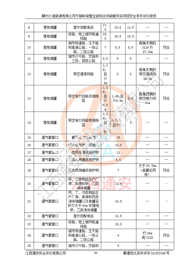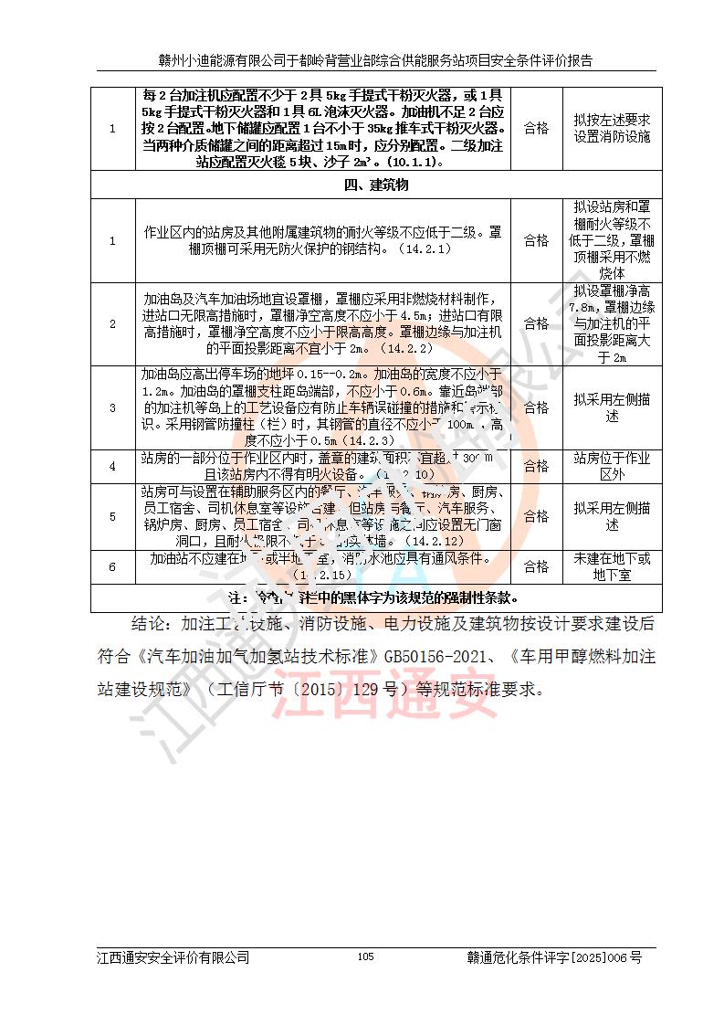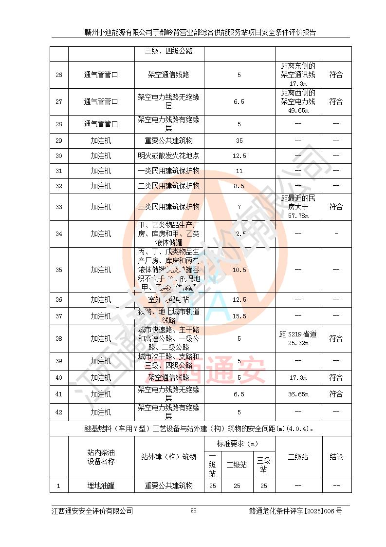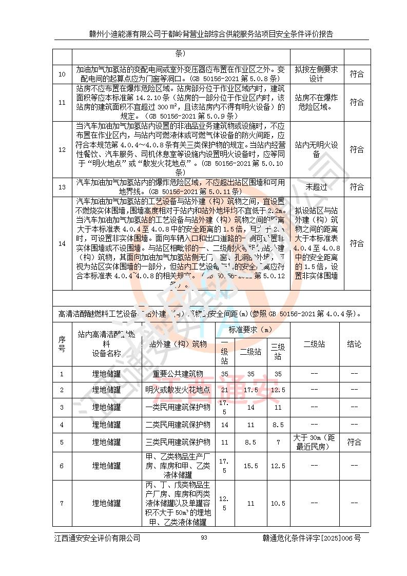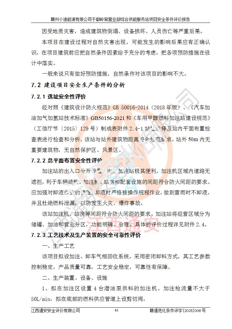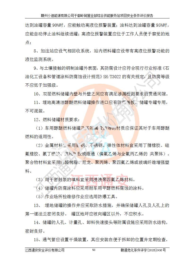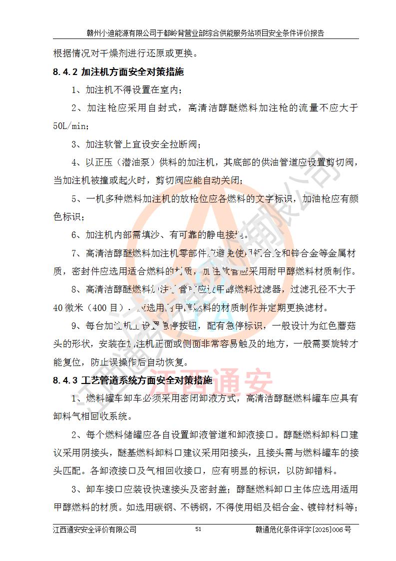 一、安全狀況綜合評(píng)述 通過(guò)對(duì)本項(xiàng)目的危險(xiǎn)、有害因素分析及定性、定量評(píng)價(jià),結(jié)果為: 1)本項(xiàng)目存在的危險(xiǎn)有害因素是火災(zāi)爆炸、**傷害、高處墜落、物體打擊、觸電、機(jī)械傷害、中毒窒息、坍塌等,主要危險(xiǎn)有害因素為火災(zāi)、爆炸等危險(xiǎn)因素。需重點(diǎn)防范的危險(xiǎn)有害因素為火災(zāi)、爆炸。本項(xiàng)目未構(gòu)成危險(xiǎn)化學(xué)品重大危險(xiǎn)源,也不存在劇毒、監(jiān)控、易制毒、易制爆化學(xué)品及高毒物品,高清潔醇醚燃料主要成分甲醇和石腦油為重點(diǎn)監(jiān)管危險(xiǎn)化學(xué)品,應(yīng)按照重點(diǎn)監(jiān)管危險(xiǎn)化學(xué)品相關(guān)規(guī)定管理。 2)預(yù)先危險(xiǎn)性分析表明該加注站儲(chǔ)存、經(jīng)營(yíng)過(guò)程中火災(zāi)、爆炸、觸電的危險(xiǎn)等級(jí)為Ⅲ級(jí),**傷害、高處墜落和中毒窒息等危險(xiǎn)等級(jí)為Ⅱ級(jí)。 3)從作業(yè)條件危險(xiǎn)性分析結(jié)果可以看出,在選定的評(píng)價(jià)單元中卸液作業(yè)、加注作業(yè)、變配電作業(yè)和維修作業(yè)中卸液作業(yè)中火災(zāi)爆炸、**傷害、觸電、中毒、窒息潛在危險(xiǎn)均為一般危險(xiǎn)。 4)從危險(xiǎn)度分析結(jié)果可以看出,燃料罐區(qū)屬中度危險(xiǎn)。 5)根據(jù)選址與總平面布置安全檢查表,該加注站符合《建筑設(shè)計(jì)防火規(guī)范》GB 50016-2014(2018年版)、《汽車(chē)加油加氣加氫站技術(shù)標(biāo)準(zhǔn)》GB50156-2021及《車(chē)用甲醇燃料加注站建設(shè)規(guī)范》(工信廳節(jié)〔2015〕129號(hào))等有關(guān)標(biāo)準(zhǔn)、規(guī)范的規(guī)定。該站與站外建筑物距離符合規(guī)范要求,站外50m內(nèi)無(wú)重要建筑物和明火設(shè)施。 6)根據(jù)立項(xiàng)批文及于都縣自然資源局出具的建設(shè)用地規(guī)劃許可證,該加注站符合有關(guān)部門(mén)的審批。 7)本項(xiàng)目采用成熟的工藝設(shè)備,項(xiàng)目在嚴(yán)格按照**相關(guān)法律、法規(guī)及技術(shù)標(biāo)準(zhǔn)制造、安裝、檢測(cè)檢驗(yàn)的情況下,其安全生產(chǎn)風(fēng)險(xiǎn)程度在可接受范圍。 8)本項(xiàng)目危害物質(zhì)為高清潔醇醚燃料(車(chē)用D型,甲類)和醚基燃料(車(chē)用Y型,丙類),應(yīng)重點(diǎn)注意火災(zāi)、爆炸危害,做好防火防靜電措施。**加注站罐區(qū)、加注區(qū)無(wú)明火產(chǎn)生;卸液口應(yīng)設(shè)置防靜電報(bào)警器,罐區(qū)法蘭應(yīng)跨接,防止靜電引起火災(zāi)爆炸事故。 四、評(píng)價(jià)結(jié)論 贛州小迪能源有限公司于都嶺背營(yíng)業(yè)部綜合供能服務(wù)站項(xiàng)目總平面布置符合相關(guān)規(guī)范的要求。在項(xiàng)目建設(shè)和運(yùn)行階段,總平面布置設(shè)計(jì)、施工圖設(shè)計(jì)和建設(shè)施工、安裝調(diào)試及生產(chǎn)運(yùn)行中,應(yīng)嚴(yán)格執(zhí)行**有關(guān)安全生產(chǎn)法律、法規(guī)和有關(guān)標(biāo)準(zhǔn)、規(guī)范,將本報(bào)告中提出的安全對(duì)策措施落實(shí)到位,真正做到安全設(shè)施與主體工程同時(shí)設(shè)計(jì)、同時(shí)施工、同時(shí)投入生產(chǎn)和使用,項(xiàng)目建成后危險(xiǎn)、有害因素可以得到**控制,安全風(fēng)險(xiǎn)在可接受范圍,擬建的贛州小迪能源有限公司于都嶺背營(yíng)業(yè)部綜合供能服務(wù)站項(xiàng)目符合法律法規(guī)、標(biāo)準(zhǔn)、規(guī)章和規(guī)范的要求。 |
