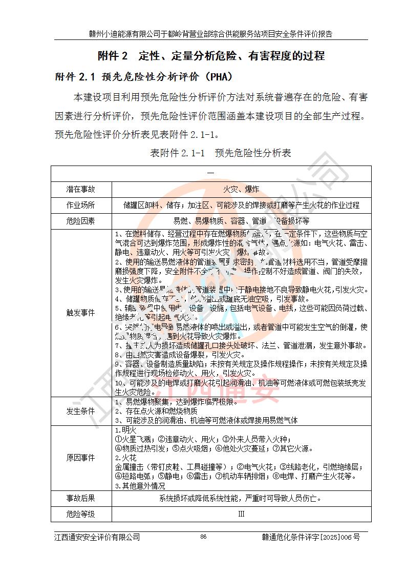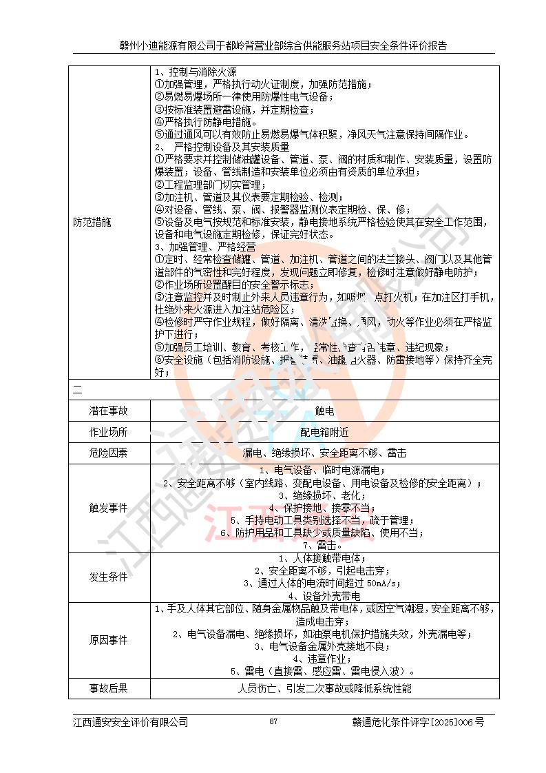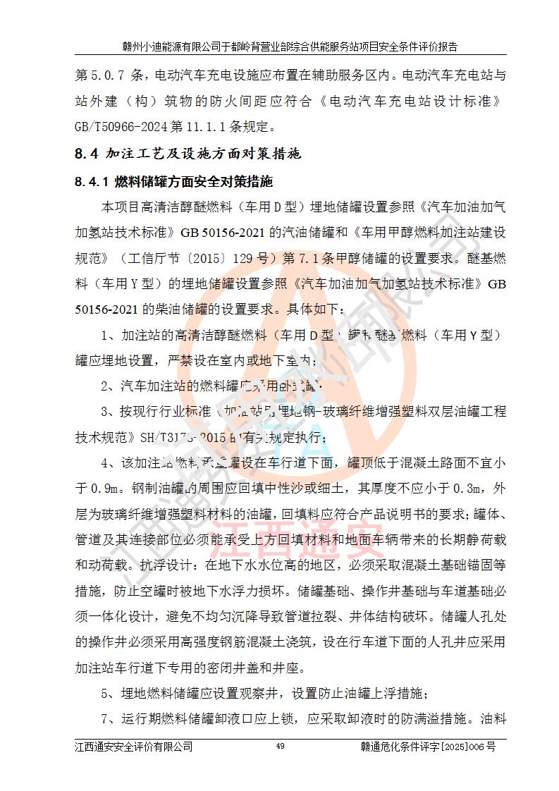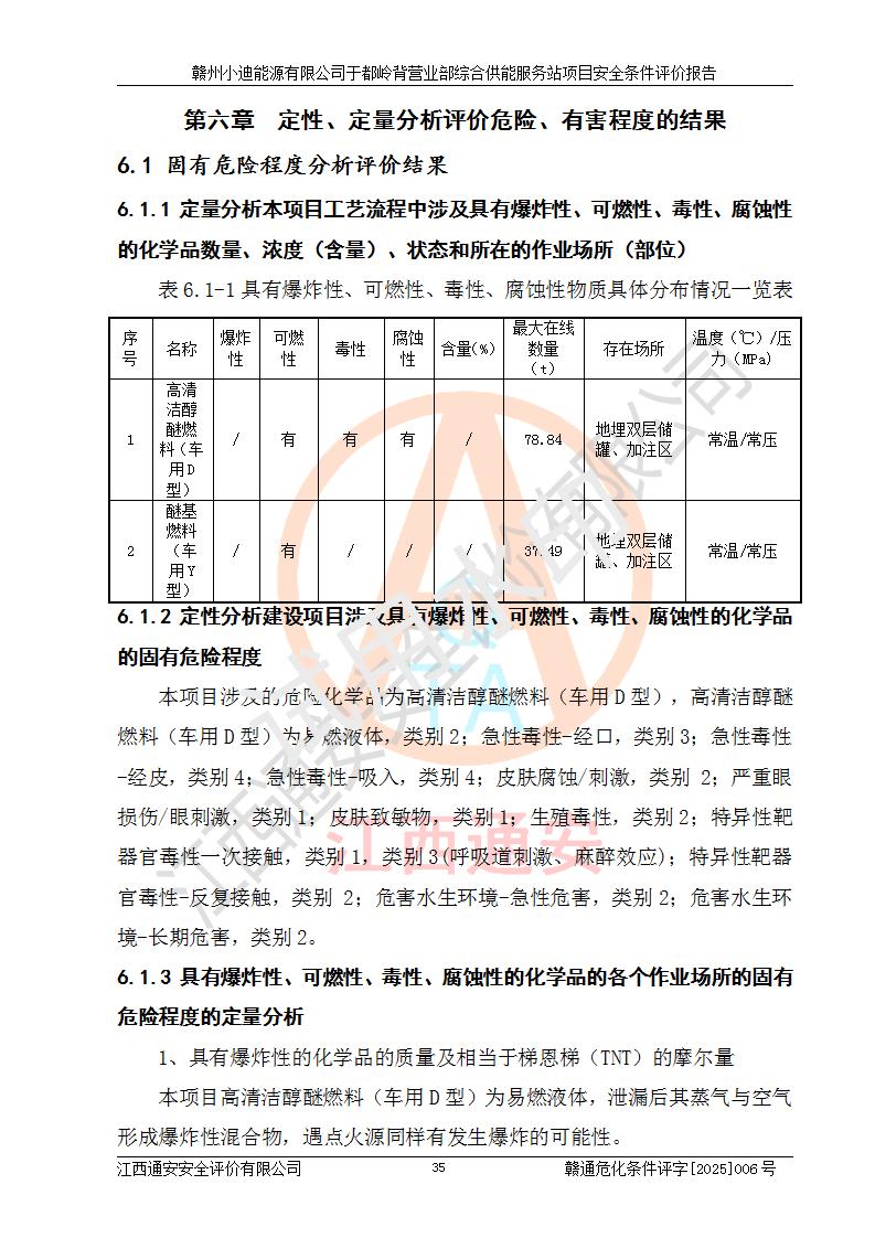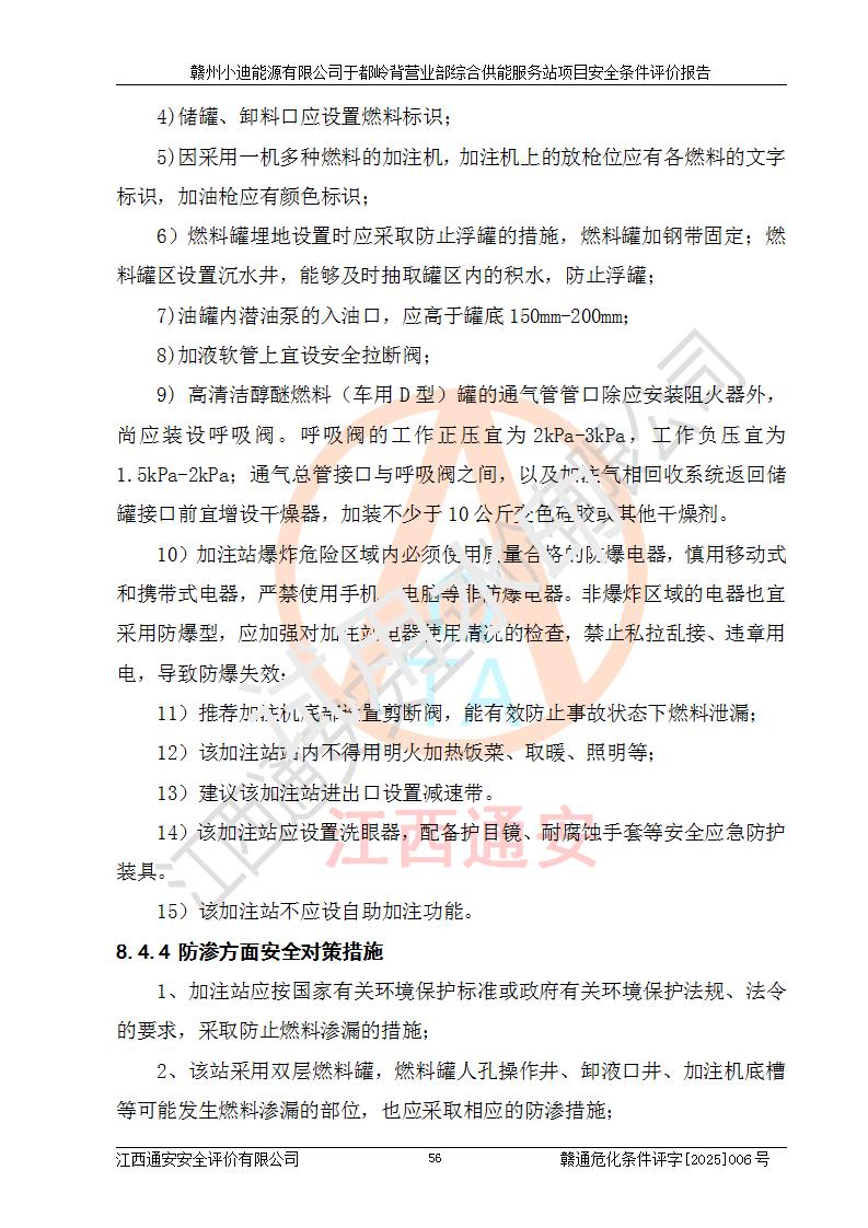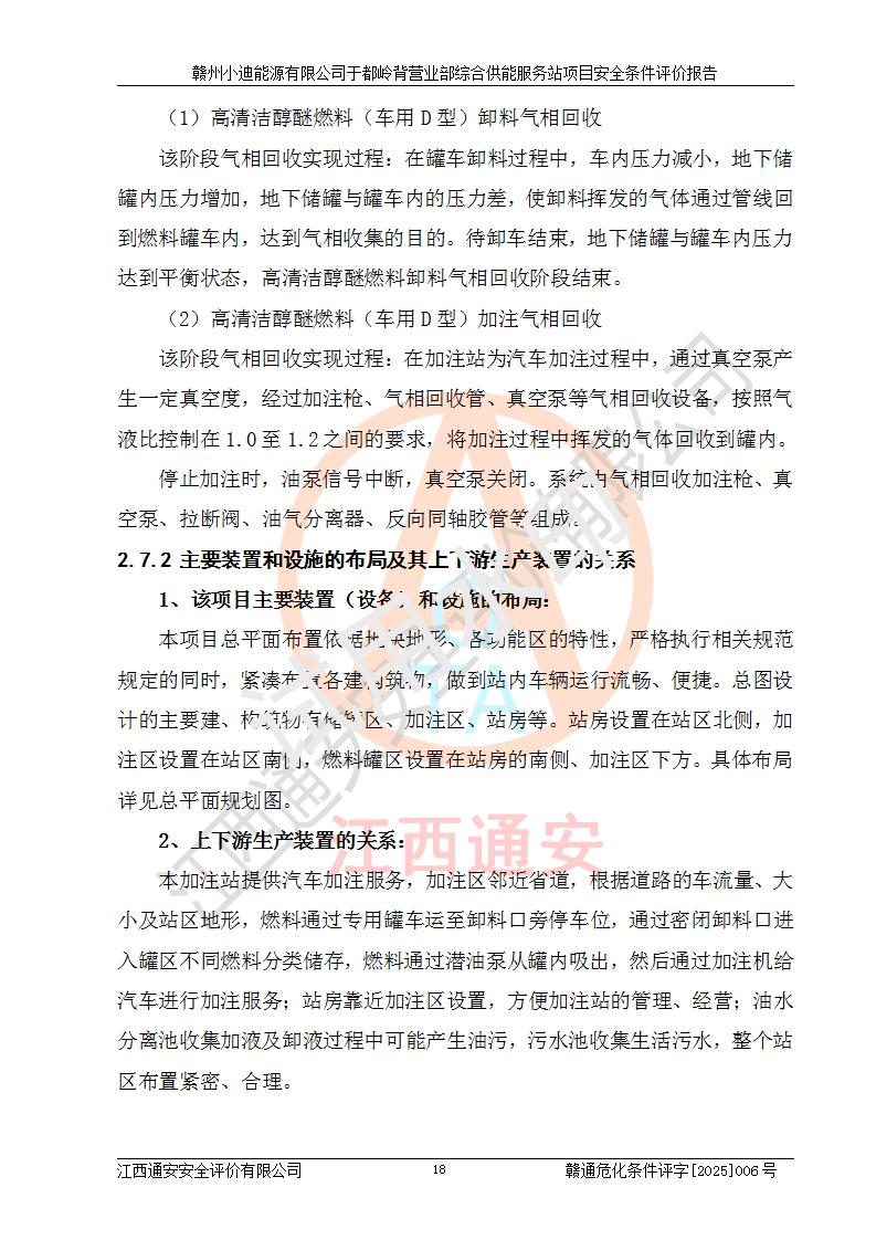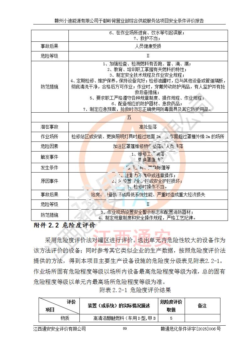 一、安全狀況綜合評(píng)述 通過(guò)對(duì)本項(xiàng)目的危險(xiǎn)、有害因素分析及定性、定量評(píng)價(jià),結(jié)果為: 1)本項(xiàng)目存在的危險(xiǎn)有害因素是火災(zāi)爆炸、**傷害、高處墜落、物體打擊、觸電、機(jī)械傷害、中毒窒息、坍塌等,主要危險(xiǎn)有害因素為火災(zāi)、爆炸等危險(xiǎn)因素。需重點(diǎn)防范的危險(xiǎn)有害因素為火災(zāi)、爆炸。本項(xiàng)目未構(gòu)成危險(xiǎn)化學(xué)品重大危險(xiǎn)源,也不存在劇毒、監(jiān)控、易制毒、易制爆化學(xué)品及高毒物品,高清潔醇醚燃料主要成分甲醇和石腦油為重點(diǎn)監(jiān)管危險(xiǎn)化學(xué)品,應(yīng)按照重點(diǎn)監(jiān)管危險(xiǎn)化學(xué)品相關(guān)規(guī)定管理。 2)預(yù)先危險(xiǎn)性分析表明該加注站儲(chǔ)存、經(jīng)營(yíng)過(guò)程中火災(zāi)、爆炸、觸電的危險(xiǎn)等級(jí)為Ⅲ級(jí),**傷害、高處墜落和中毒窒息等危險(xiǎn)等級(jí)為Ⅱ級(jí)。 3)從作業(yè)條件危險(xiǎn)性分析結(jié)果可以看出,在選定的評(píng)價(jià)單元中卸液作業(yè)、加注作業(yè)、變配電作業(yè)和維修作業(yè)中卸液作業(yè)中火災(zāi)爆炸、**傷害、觸電、中毒、窒息潛在危險(xiǎn)均為一般危險(xiǎn)。 4)從危險(xiǎn)度分析結(jié)果可以看出,燃料罐區(qū)屬中度危險(xiǎn)。 5)根據(jù)選址與總平面布置安全檢查表,該加注站符合《建筑設(shè)計(jì)防火規(guī)范》GB 50016-2014(2018年版)、《汽車(chē)加油加氣加氫站技術(shù)標(biāo)準(zhǔn)》GB50156-2021及《車(chē)用甲醇燃料加注站建設(shè)規(guī)范》(工信廳節(jié)〔2015〕129號(hào))等有關(guān)標(biāo)準(zhǔn)、規(guī)范的規(guī)定。該站與站外建筑物距離符合規(guī)范要求,站外50m內(nèi)無(wú)重要建筑物和明火設(shè)施。 6)根據(jù)立項(xiàng)批文及于都縣自然資源局出具的建設(shè)用地規(guī)劃許可證,該加注站符合有關(guān)部門(mén)的審批。 7)本項(xiàng)目采用成熟的工藝設(shè)備,項(xiàng)目在嚴(yán)格按照**相關(guān)法律、法規(guī)及技術(shù)標(biāo)準(zhǔn)制造、安裝、檢測(cè)檢驗(yàn)的情況下,其安全生產(chǎn)風(fēng)險(xiǎn)程度在可接受范圍。 8)本項(xiàng)目危害物質(zhì)為高清潔醇醚燃料(車(chē)用D型,甲類)和醚基燃料(車(chē)用Y型,丙類),應(yīng)重點(diǎn)注意火災(zāi)、爆炸危害,做好防火防靜電措施。**加注站罐區(qū)、加注區(qū)無(wú)明火產(chǎn)生;卸液口應(yīng)設(shè)置防靜電報(bào)警器,罐區(qū)法蘭應(yīng)跨接,防止靜電引起火災(zāi)爆炸事故。 四、評(píng)價(jià)結(jié)論 贛州小迪能源有限公司于都嶺背營(yíng)業(yè)部綜合供能服務(wù)站項(xiàng)目總平面布置符合相關(guān)規(guī)范的要求。在項(xiàng)目建設(shè)和運(yùn)行階段,總平面布置設(shè)計(jì)、施工圖設(shè)計(jì)和建設(shè)施工、安裝調(diào)試及生產(chǎn)運(yùn)行中,應(yīng)嚴(yán)格執(zhí)行**有關(guān)安全生產(chǎn)法律、法規(guī)和有關(guān)標(biāo)準(zhǔn)、規(guī)范,將本報(bào)告中提出的安全對(duì)策措施落實(shí)到位,真正做到安全設(shè)施與主體工程同時(shí)設(shè)計(jì)、同時(shí)施工、同時(shí)投入生產(chǎn)和使用,項(xiàng)目建成后危險(xiǎn)、有害因素可以得到**控制,安全風(fēng)險(xiǎn)在可接受范圍,擬建的贛州小迪能源有限公司于都嶺背營(yíng)業(yè)部綜合供能服務(wù)站項(xiàng)目符合法律法規(guī)、標(biāo)準(zhǔn)、規(guī)章和規(guī)范的要求。 |