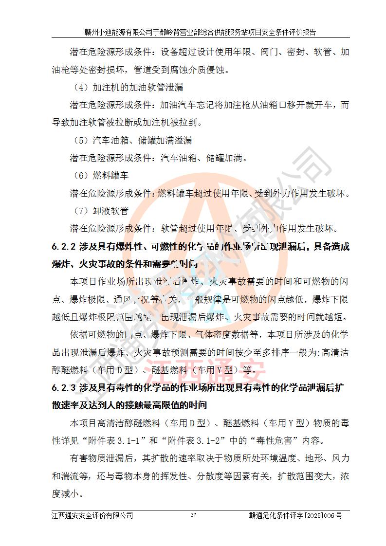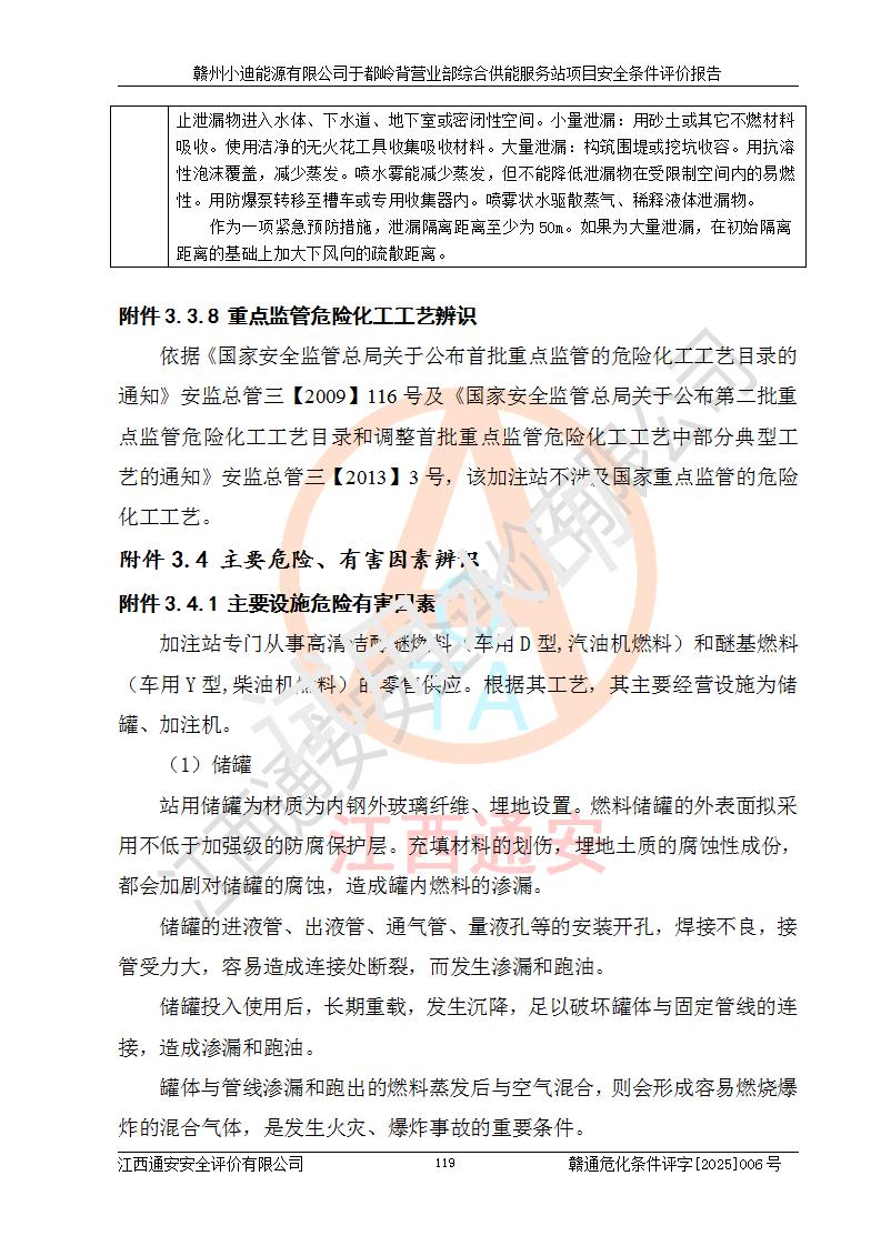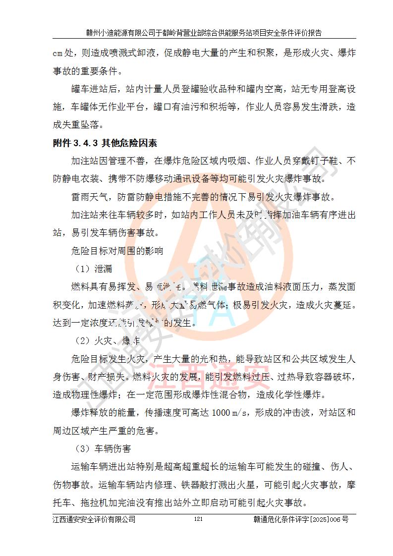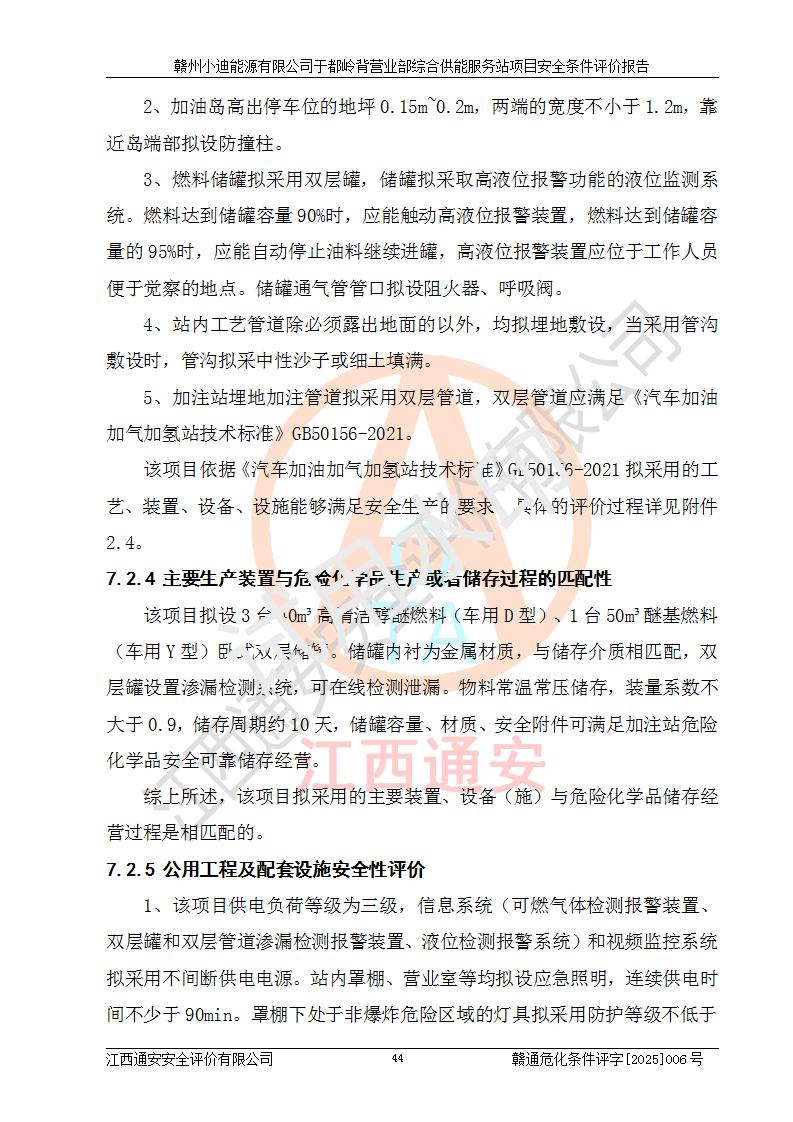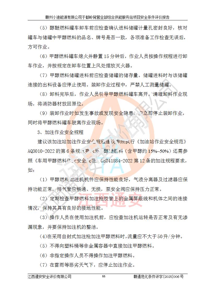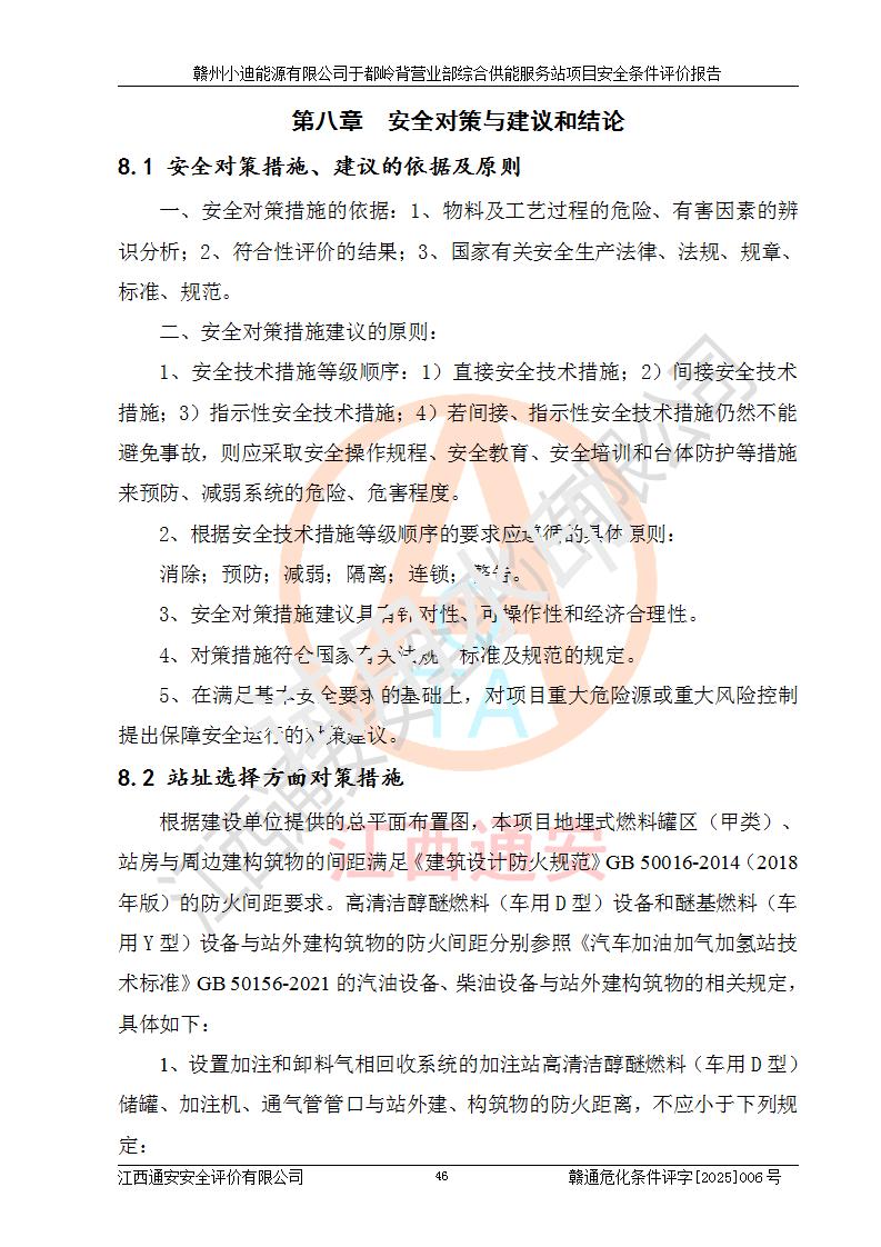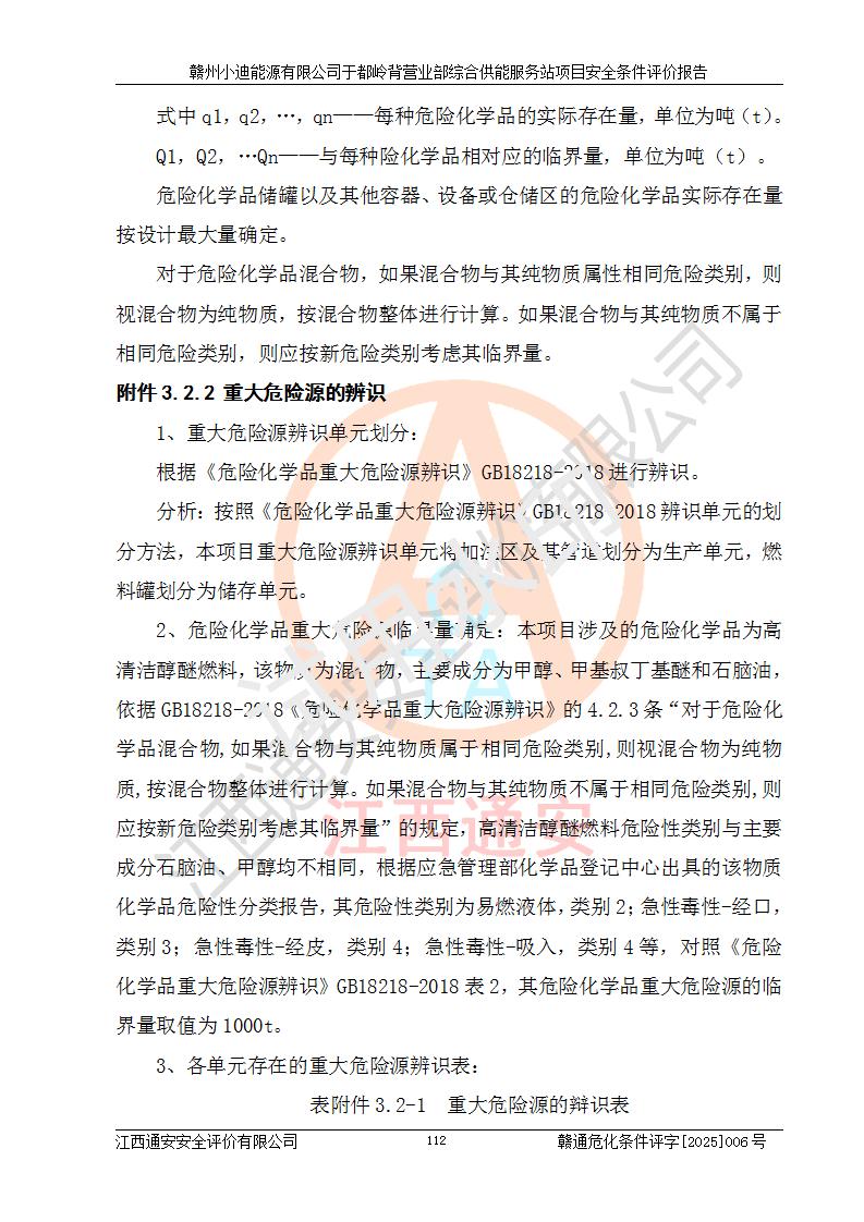 一、安全狀況綜合評(píng)述 通過(guò)對(duì)本項(xiàng)目的危險(xiǎn)、有害因素分析及定性、定量評(píng)價(jià),結(jié)果為: 1)本項(xiàng)目存在的危險(xiǎn)有害因素是火災(zāi)爆炸、**傷害、高處墜落、物體打擊、觸電、機(jī)械傷害、中毒窒息、坍塌等,主要危險(xiǎn)有害因素為火災(zāi)、爆炸等危險(xiǎn)因素。需重點(diǎn)防范的危險(xiǎn)有害因素為火災(zāi)、爆炸。本項(xiàng)目未構(gòu)成危險(xiǎn)化學(xué)品重大危險(xiǎn)源,也不存在劇毒、監(jiān)控、易制毒、易制爆化學(xué)品及高毒物品,高清潔醇醚燃料主要成分甲醇和石腦油為重點(diǎn)監(jiān)管危險(xiǎn)化學(xué)品,應(yīng)按照重點(diǎn)監(jiān)管危險(xiǎn)化學(xué)品相關(guān)規(guī)定管理。 2)預(yù)先危險(xiǎn)性分析表明該加注站儲(chǔ)存、經(jīng)營(yíng)過(guò)程中火災(zāi)、爆炸、觸電的危險(xiǎn)等級(jí)為Ⅲ級(jí),**傷害、高處墜落和中毒窒息等危險(xiǎn)等級(jí)為Ⅱ級(jí)。 3)從作業(yè)條件危險(xiǎn)性分析結(jié)果可以看出,在選定的評(píng)價(jià)單元中卸液作業(yè)、加注作業(yè)、變配電作業(yè)和維修作業(yè)中卸液作業(yè)中火災(zāi)爆炸、**傷害、觸電、中毒、窒息潛在危險(xiǎn)均為一般危險(xiǎn)。 4)從危險(xiǎn)度分析結(jié)果可以看出,燃料罐區(qū)屬中度危險(xiǎn)。 5)根據(jù)選址與總平面布置安全檢查表,該加注站符合《建筑設(shè)計(jì)防火規(guī)范》GB 50016-2014(2018年版)、《汽車(chē)加油加氣加氫站技術(shù)標(biāo)準(zhǔn)》GB50156-2021及《車(chē)用甲醇燃料加注站建設(shè)規(guī)范》(工信廳節(jié)〔2015〕129號(hào))等有關(guān)標(biāo)準(zhǔn)、規(guī)范的規(guī)定。該站與站外建筑物距離符合規(guī)范要求,站外50m內(nèi)無(wú)重要建筑物和明火設(shè)施。 6)根據(jù)立項(xiàng)批文及于都縣自然資源局出具的建設(shè)用地規(guī)劃許可證,該加注站符合有關(guān)部門(mén)的審批。 7)本項(xiàng)目采用成熟的工藝設(shè)備,項(xiàng)目在嚴(yán)格按照**相關(guān)法律、法規(guī)及技術(shù)標(biāo)準(zhǔn)制造、安裝、檢測(cè)檢驗(yàn)的情況下,其安全生產(chǎn)風(fēng)險(xiǎn)程度在可接受范圍。 8)本項(xiàng)目危害物質(zhì)為高清潔醇醚燃料(車(chē)用D型,甲類)和醚基燃料(車(chē)用Y型,丙類),應(yīng)重點(diǎn)注意火災(zāi)、爆炸危害,做好防火防靜電措施。**加注站罐區(qū)、加注區(qū)無(wú)明火產(chǎn)生;卸液口應(yīng)設(shè)置防靜電報(bào)警器,罐區(qū)法蘭應(yīng)跨接,防止靜電引起火災(zāi)爆炸事故。 四、評(píng)價(jià)結(jié)論 贛州小迪能源有限公司于都嶺背營(yíng)業(yè)部綜合供能服務(wù)站項(xiàng)目總平面布置符合相關(guān)規(guī)范的要求。在項(xiàng)目建設(shè)和運(yùn)行階段,總平面布置設(shè)計(jì)、施工圖設(shè)計(jì)和建設(shè)施工、安裝調(diào)試及生產(chǎn)運(yùn)行中,應(yīng)嚴(yán)格執(zhí)行**有關(guān)安全生產(chǎn)法律、法規(guī)和有關(guān)標(biāo)準(zhǔn)、規(guī)范,將本報(bào)告中提出的安全對(duì)策措施落實(shí)到位,真正做到安全設(shè)施與主體工程同時(shí)設(shè)計(jì)、同時(shí)施工、同時(shí)投入生產(chǎn)和使用,項(xiàng)目建成后危險(xiǎn)、有害因素可以得到**控制,安全風(fēng)險(xiǎn)在可接受范圍,擬建的贛州小迪能源有限公司于都嶺背營(yíng)業(yè)部綜合供能服務(wù)站項(xiàng)目符合法律法規(guī)、標(biāo)準(zhǔn)、規(guī)章和規(guī)范的要求。 |