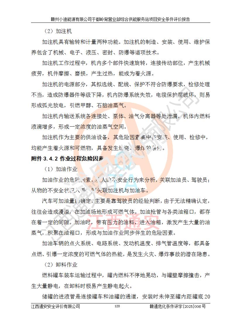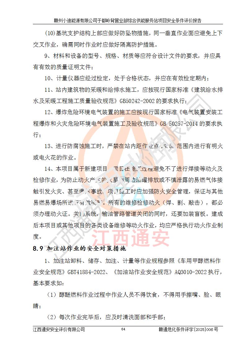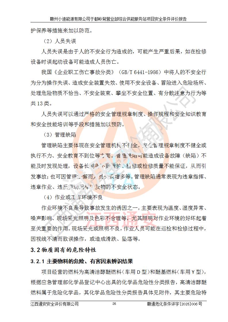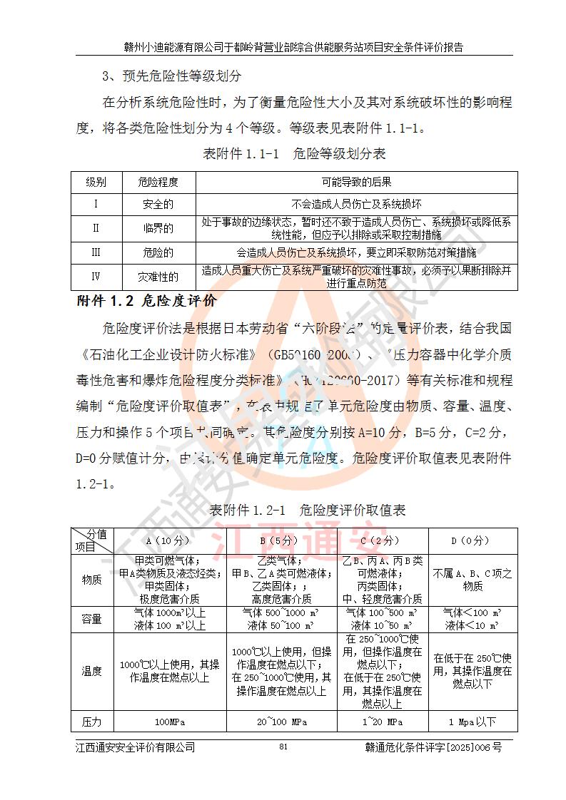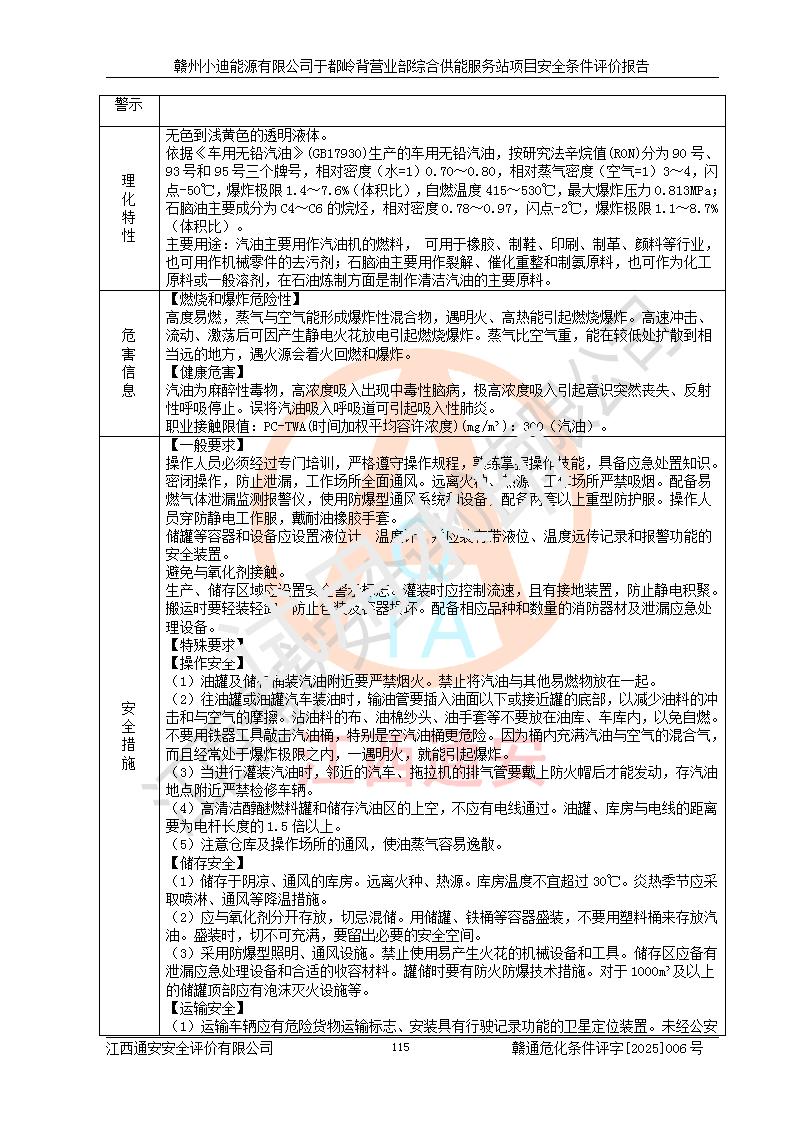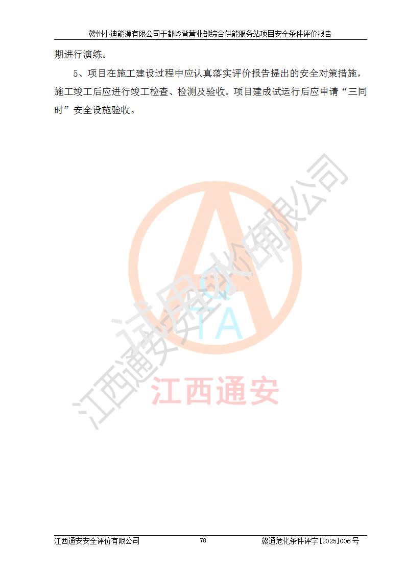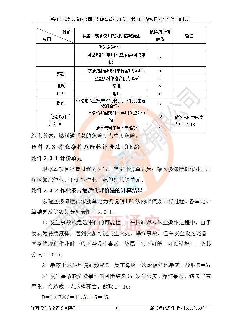 一、安全狀況綜合評(píng)述 通過(guò)對(duì)本項(xiàng)目的危險(xiǎn)、有害因素分析及定性、定量評(píng)價(jià),結(jié)果為: 1)本項(xiàng)目存在的危險(xiǎn)有害因素是火災(zāi)爆炸、**傷害、高處墜落、物體打擊、觸電、機(jī)械傷害、中毒窒息、坍塌等,主要危險(xiǎn)有害因素為火災(zāi)、爆炸等危險(xiǎn)因素。需重點(diǎn)防范的危險(xiǎn)有害因素為火災(zāi)、爆炸。本項(xiàng)目未構(gòu)成危險(xiǎn)化學(xué)品重大危險(xiǎn)源,也不存在劇毒、監(jiān)控、易制毒、易制爆化學(xué)品及高毒物品,高清潔醇醚燃料主要成分甲醇和石腦油為重點(diǎn)監(jiān)管危險(xiǎn)化學(xué)品,應(yīng)按照重點(diǎn)監(jiān)管危險(xiǎn)化學(xué)品相關(guān)規(guī)定管理。 2)預(yù)先危險(xiǎn)性分析表明該加注站儲(chǔ)存、經(jīng)營(yíng)過(guò)程中火災(zāi)、爆炸、觸電的危險(xiǎn)等級(jí)為Ⅲ級(jí),**傷害、高處墜落和中毒窒息等危險(xiǎn)等級(jí)為Ⅱ級(jí)。 3)從作業(yè)條件危險(xiǎn)性分析結(jié)果可以看出,在選定的評(píng)價(jià)單元中卸液作業(yè)、加注作業(yè)、變配電作業(yè)和維修作業(yè)中卸液作業(yè)中火災(zāi)爆炸、**傷害、觸電、中毒、窒息潛在危險(xiǎn)均為一般危險(xiǎn)。 4)從危險(xiǎn)度分析結(jié)果可以看出,燃料罐區(qū)屬中度危險(xiǎn)。 5)根據(jù)選址與總平面布置安全檢查表,該加注站符合《建筑設(shè)計(jì)防火規(guī)范》GB 50016-2014(2018年版)、《汽車(chē)加油加氣加氫站技術(shù)標(biāo)準(zhǔn)》GB50156-2021及《車(chē)用甲醇燃料加注站建設(shè)規(guī)范》(工信廳節(jié)〔2015〕129號(hào))等有關(guān)標(biāo)準(zhǔn)、規(guī)范的規(guī)定。該站與站外建筑物距離符合規(guī)范要求,站外50m內(nèi)無(wú)重要建筑物和明火設(shè)施。 6)根據(jù)立項(xiàng)批文及于都縣自然資源局出具的建設(shè)用地規(guī)劃許可證,該加注站符合有關(guān)部門(mén)的審批。 7)本項(xiàng)目采用成熟的工藝設(shè)備,項(xiàng)目在嚴(yán)格按照**相關(guān)法律、法規(guī)及技術(shù)標(biāo)準(zhǔn)制造、安裝、檢測(cè)檢驗(yàn)的情況下,其安全生產(chǎn)風(fēng)險(xiǎn)程度在可接受范圍。 8)本項(xiàng)目危害物質(zhì)為高清潔醇醚燃料(車(chē)用D型,甲類)和醚基燃料(車(chē)用Y型,丙類),應(yīng)重點(diǎn)注意火災(zāi)、爆炸危害,做好防火防靜電措施。**加注站罐區(qū)、加注區(qū)無(wú)明火產(chǎn)生;卸液口應(yīng)設(shè)置防靜電報(bào)警器,罐區(qū)法蘭應(yīng)跨接,防止靜電引起火災(zāi)爆炸事故。 四、評(píng)價(jià)結(jié)論 贛州小迪能源有限公司于都嶺背營(yíng)業(yè)部綜合供能服務(wù)站項(xiàng)目總平面布置符合相關(guān)規(guī)范的要求。在項(xiàng)目建設(shè)和運(yùn)行階段,總平面布置設(shè)計(jì)、施工圖設(shè)計(jì)和建設(shè)施工、安裝調(diào)試及生產(chǎn)運(yùn)行中,應(yīng)嚴(yán)格執(zhí)行**有關(guān)安全生產(chǎn)法律、法規(guī)和有關(guān)標(biāo)準(zhǔn)、規(guī)范,將本報(bào)告中提出的安全對(duì)策措施落實(shí)到位,真正做到安全設(shè)施與主體工程同時(shí)設(shè)計(jì)、同時(shí)施工、同時(shí)投入生產(chǎn)和使用,項(xiàng)目建成后危險(xiǎn)、有害因素可以得到**控制,安全風(fēng)險(xiǎn)在可接受范圍,擬建的贛州小迪能源有限公司于都嶺背營(yíng)業(yè)部綜合供能服務(wù)站項(xiàng)目符合法律法規(guī)、標(biāo)準(zhǔn)、規(guī)章和規(guī)范的要求。 |