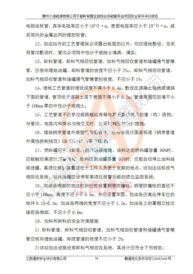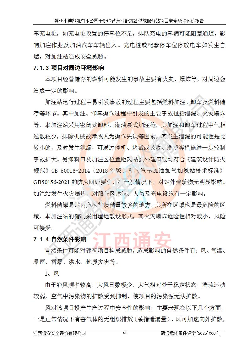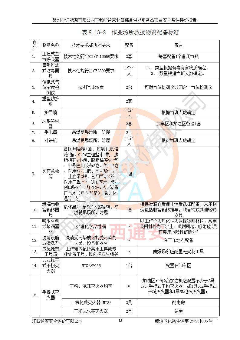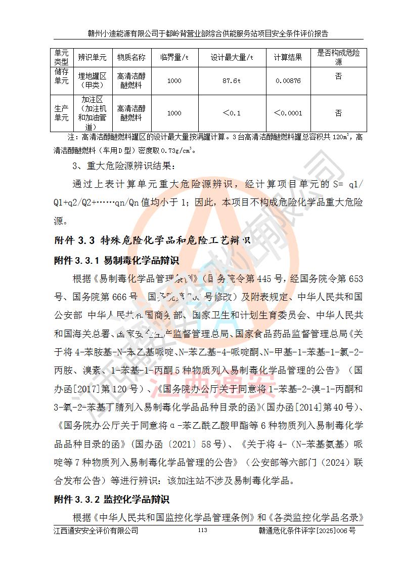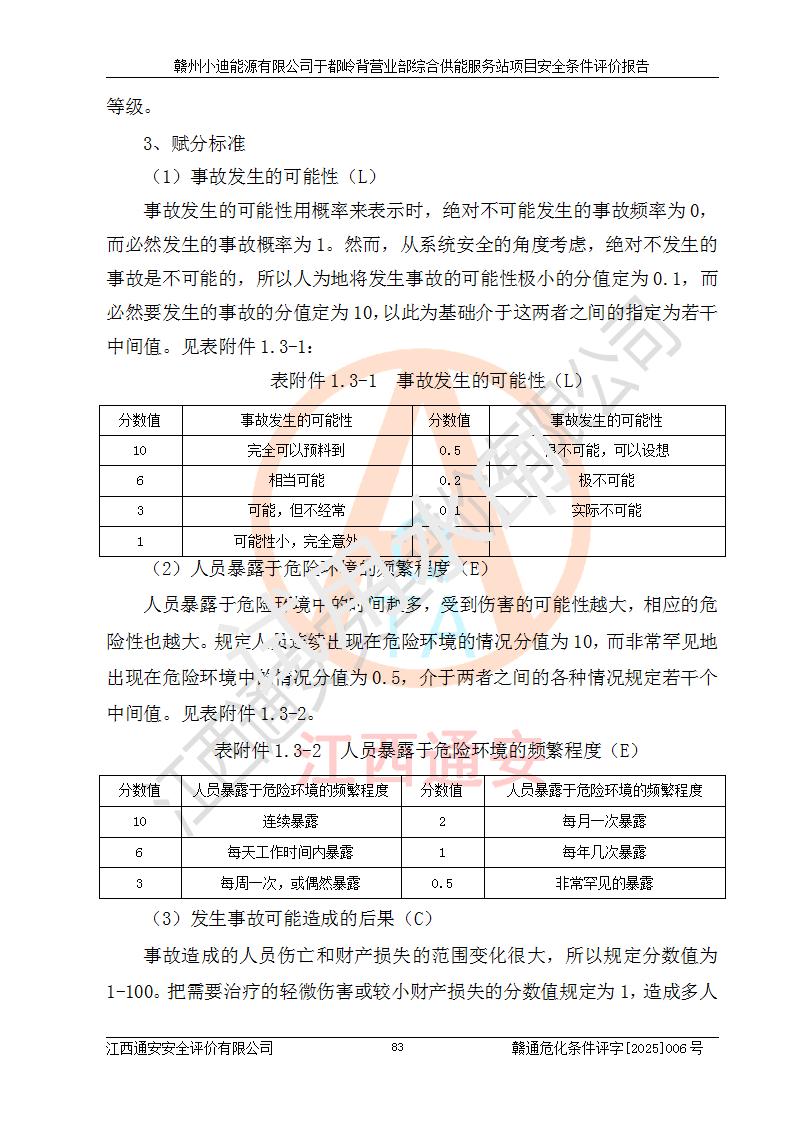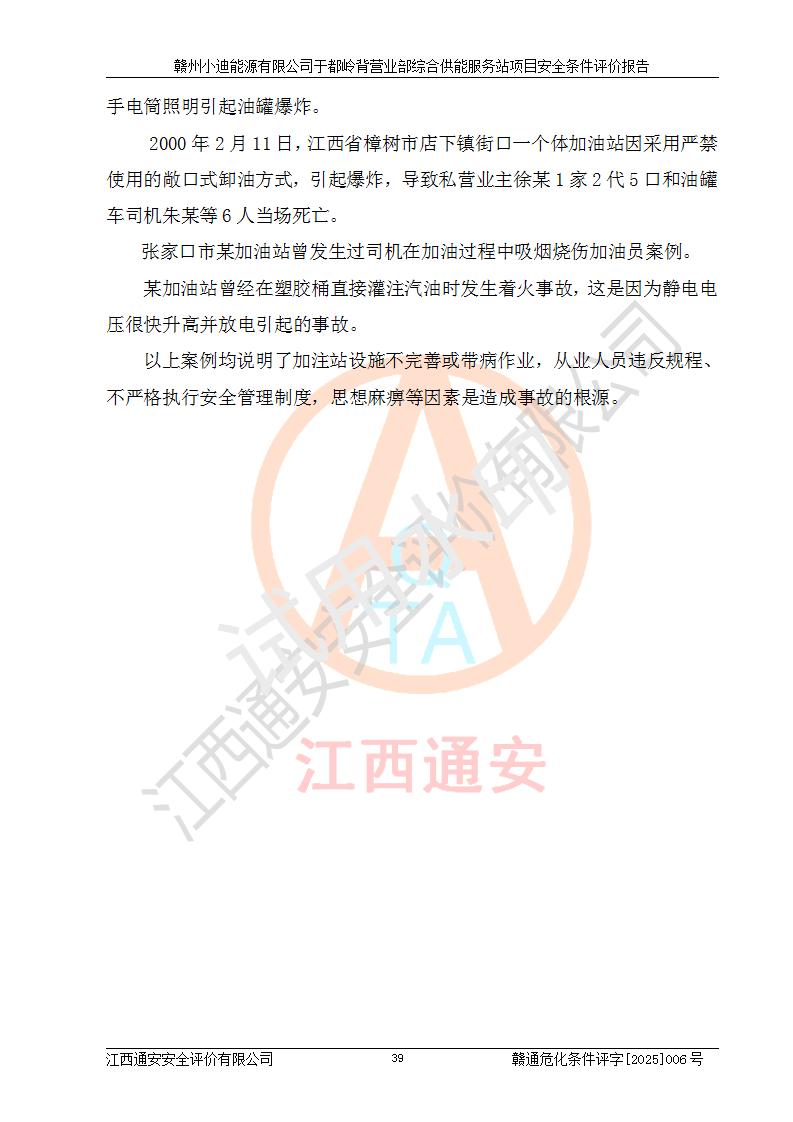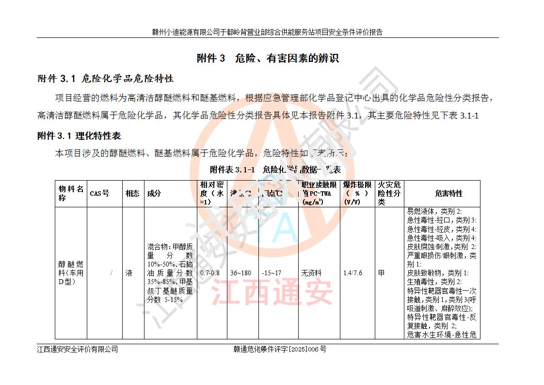 一、安全狀況綜合評(píng)述 通過(guò)對(duì)本項(xiàng)目的危險(xiǎn)、有害因素分析及定性、定量評(píng)價(jià),結(jié)果為: 1)本項(xiàng)目存在的危險(xiǎn)有害因素是火災(zāi)爆炸、**傷害、高處墜落、物體打擊、觸電、機(jī)械傷害、中毒窒息、坍塌等,主要危險(xiǎn)有害因素為火災(zāi)、爆炸等危險(xiǎn)因素。需重點(diǎn)防范的危險(xiǎn)有害因素為火災(zāi)、爆炸。本項(xiàng)目未構(gòu)成危險(xiǎn)化學(xué)品重大危險(xiǎn)源,也不存在劇毒、監(jiān)控、易制毒、易制爆化學(xué)品及高毒物品,高清潔醇醚燃料主要成分甲醇和石腦油為重點(diǎn)監(jiān)管危險(xiǎn)化學(xué)品,應(yīng)按照重點(diǎn)監(jiān)管危險(xiǎn)化學(xué)品相關(guān)規(guī)定管理。 2)預(yù)先危險(xiǎn)性分析表明該加注站儲(chǔ)存、經(jīng)營(yíng)過(guò)程中火災(zāi)、爆炸、觸電的危險(xiǎn)等級(jí)為Ⅲ級(jí),**傷害、高處墜落和中毒窒息等危險(xiǎn)等級(jí)為Ⅱ級(jí)。 3)從作業(yè)條件危險(xiǎn)性分析結(jié)果可以看出,在選定的評(píng)價(jià)單元中卸液作業(yè)、加注作業(yè)、變配電作業(yè)和維修作業(yè)中卸液作業(yè)中火災(zāi)爆炸、**傷害、觸電、中毒、窒息潛在危險(xiǎn)均為一般危險(xiǎn)。 4)從危險(xiǎn)度分析結(jié)果可以看出,燃料罐區(qū)屬中度危險(xiǎn)。 5)根據(jù)選址與總平面布置安全檢查表,該加注站符合《建筑設(shè)計(jì)防火規(guī)范》GB 50016-2014(2018年版)、《汽車(chē)加油加氣加氫站技術(shù)標(biāo)準(zhǔn)》GB50156-2021及《車(chē)用甲醇燃料加注站建設(shè)規(guī)范》(工信廳節(jié)〔2015〕129號(hào))等有關(guān)標(biāo)準(zhǔn)、規(guī)范的規(guī)定。該站與站外建筑物距離符合規(guī)范要求,站外50m內(nèi)無(wú)重要建筑物和明火設(shè)施。 6)根據(jù)立項(xiàng)批文及于都縣自然資源局出具的建設(shè)用地規(guī)劃許可證,該加注站符合有關(guān)部門(mén)的審批。 7)本項(xiàng)目采用成熟的工藝設(shè)備,項(xiàng)目在嚴(yán)格按照**相關(guān)法律、法規(guī)及技術(shù)標(biāo)準(zhǔn)制造、安裝、檢測(cè)檢驗(yàn)的情況下,其安全生產(chǎn)風(fēng)險(xiǎn)程度在可接受范圍。 8)本項(xiàng)目危害物質(zhì)為高清潔醇醚燃料(車(chē)用D型,甲類)和醚基燃料(車(chē)用Y型,丙類),應(yīng)重點(diǎn)注意火災(zāi)、爆炸危害,做好防火防靜電措施。**加注站罐區(qū)、加注區(qū)無(wú)明火產(chǎn)生;卸液口應(yīng)設(shè)置防靜電報(bào)警器,罐區(qū)法蘭應(yīng)跨接,防止靜電引起火災(zāi)爆炸事故。 四、評(píng)價(jià)結(jié)論 贛州小迪能源有限公司于都嶺背營(yíng)業(yè)部綜合供能服務(wù)站項(xiàng)目總平面布置符合相關(guān)規(guī)范的要求。在項(xiàng)目建設(shè)和運(yùn)行階段,總平面布置設(shè)計(jì)、施工圖設(shè)計(jì)和建設(shè)施工、安裝調(diào)試及生產(chǎn)運(yùn)行中,應(yīng)嚴(yán)格執(zhí)行**有關(guān)安全生產(chǎn)法律、法規(guī)和有關(guān)標(biāo)準(zhǔn)、規(guī)范,將本報(bào)告中提出的安全對(duì)策措施落實(shí)到位,真正做到安全設(shè)施與主體工程同時(shí)設(shè)計(jì)、同時(shí)施工、同時(shí)投入生產(chǎn)和使用,項(xiàng)目建成后危險(xiǎn)、有害因素可以得到**控制,安全風(fēng)險(xiǎn)在可接受范圍,擬建的贛州小迪能源有限公司于都嶺背營(yíng)業(yè)部綜合供能服務(wù)站項(xiàng)目符合法律法規(guī)、標(biāo)準(zhǔn)、規(guī)章和規(guī)范的要求。 |