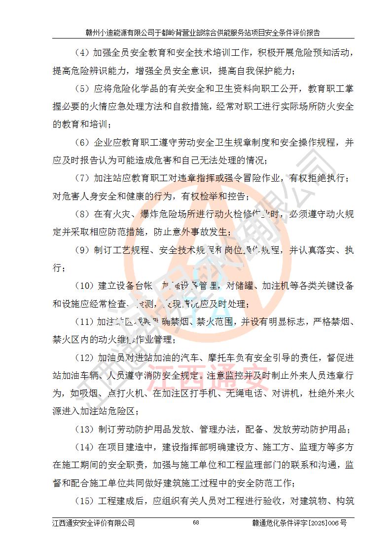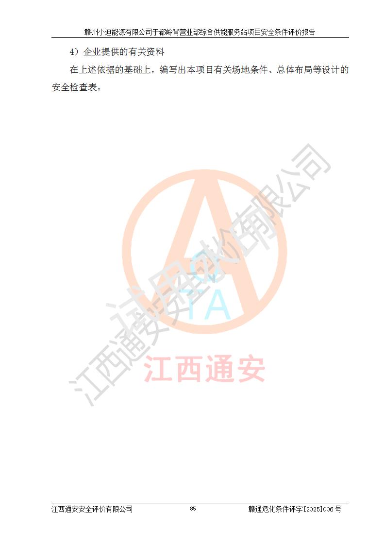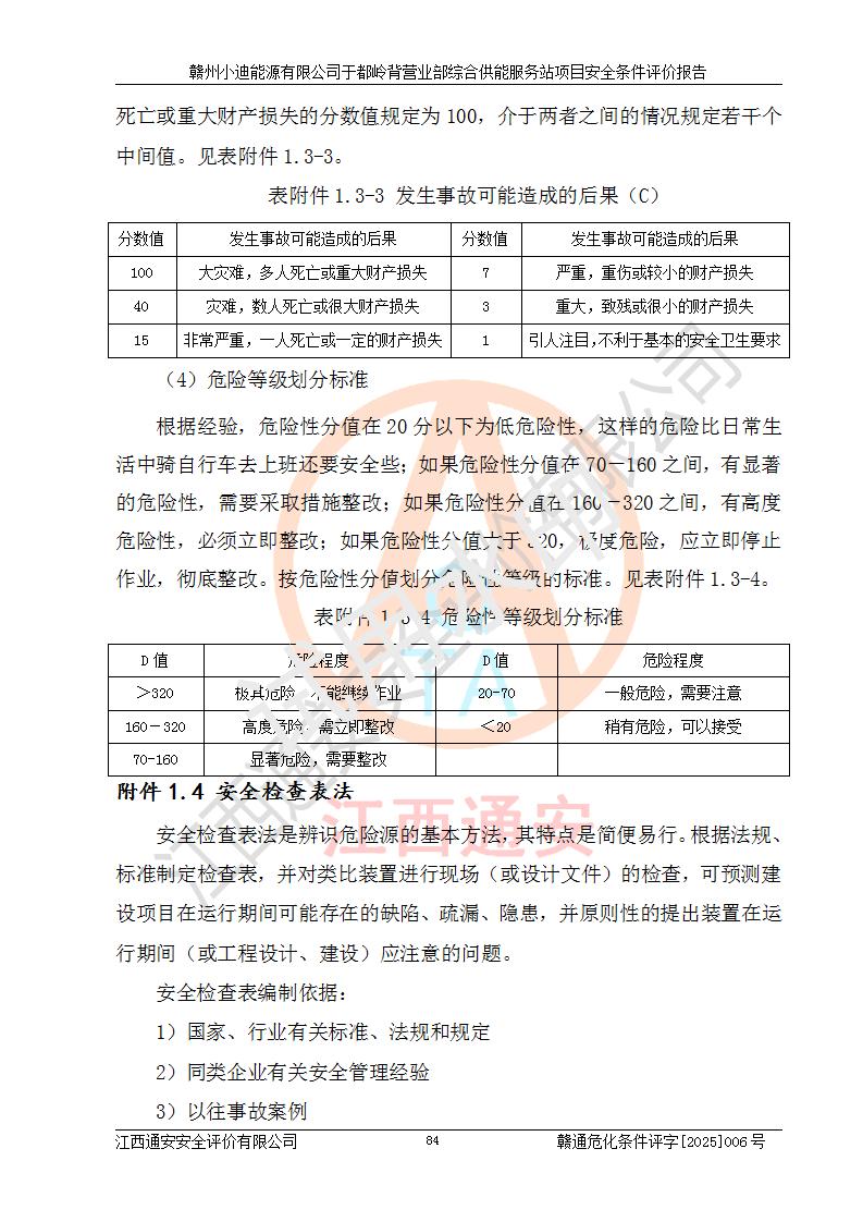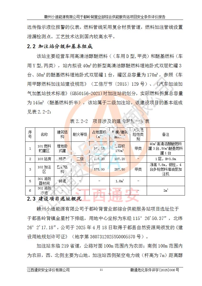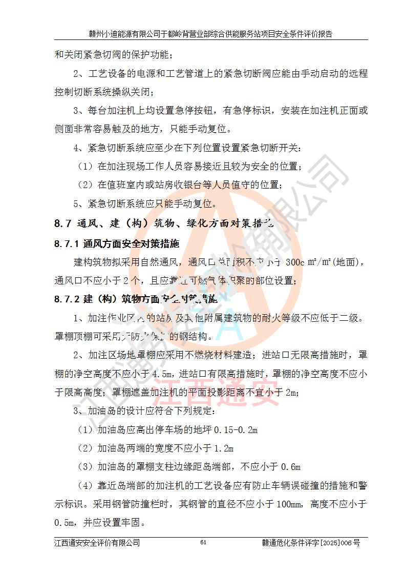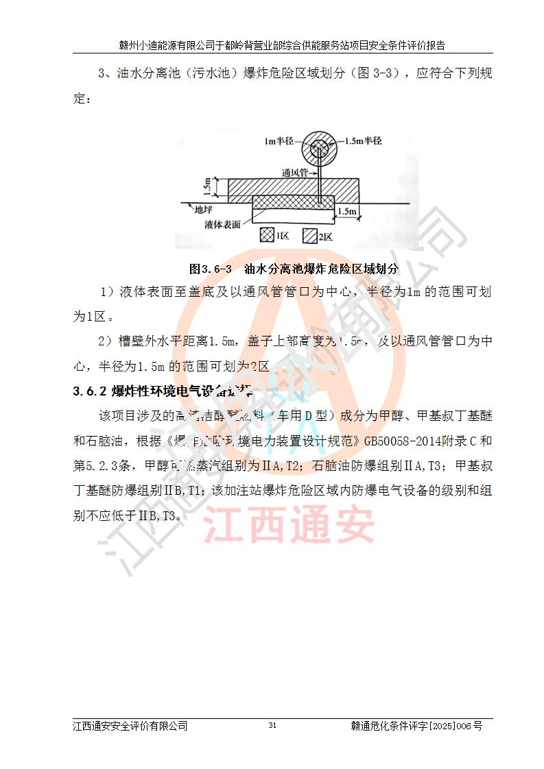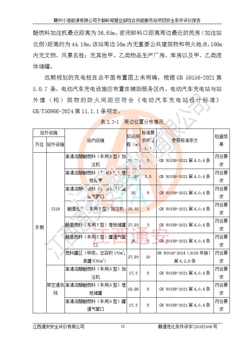 一、安全狀況綜合評(píng)述 通過(guò)對(duì)本項(xiàng)目的危險(xiǎn)、有害因素分析及定性、定量評(píng)價(jià),結(jié)果為: 1)本項(xiàng)目存在的危險(xiǎn)有害因素是火災(zāi)爆炸、**傷害、高處墜落、物體打擊、觸電、機(jī)械傷害、中毒窒息、坍塌等,主要危險(xiǎn)有害因素為火災(zāi)、爆炸等危險(xiǎn)因素。需重點(diǎn)防范的危險(xiǎn)有害因素為火災(zāi)、爆炸。本項(xiàng)目未構(gòu)成危險(xiǎn)化學(xué)品重大危險(xiǎn)源,也不存在劇毒、監(jiān)控、易制毒、易制爆化學(xué)品及高毒物品,高清潔醇醚燃料主要成分甲醇和石腦油為重點(diǎn)監(jiān)管危險(xiǎn)化學(xué)品,應(yīng)按照重點(diǎn)監(jiān)管危險(xiǎn)化學(xué)品相關(guān)規(guī)定管理。 2)預(yù)先危險(xiǎn)性分析表明該加注站儲(chǔ)存、經(jīng)營(yíng)過(guò)程中火災(zāi)、爆炸、觸電的危險(xiǎn)等級(jí)為Ⅲ級(jí),**傷害、高處墜落和中毒窒息等危險(xiǎn)等級(jí)為Ⅱ級(jí)。 3)從作業(yè)條件危險(xiǎn)性分析結(jié)果可以看出,在選定的評(píng)價(jià)單元中卸液作業(yè)、加注作業(yè)、變配電作業(yè)和維修作業(yè)中卸液作業(yè)中火災(zāi)爆炸、**傷害、觸電、中毒、窒息潛在危險(xiǎn)均為一般危險(xiǎn)。 4)從危險(xiǎn)度分析結(jié)果可以看出,燃料罐區(qū)屬中度危險(xiǎn)。 5)根據(jù)選址與總平面布置安全檢查表,該加注站符合《建筑設(shè)計(jì)防火規(guī)范》GB 50016-2014(2018年版)、《汽車(chē)加油加氣加氫站技術(shù)標(biāo)準(zhǔn)》GB50156-2021及《車(chē)用甲醇燃料加注站建設(shè)規(guī)范》(工信廳節(jié)〔2015〕129號(hào))等有關(guān)標(biāo)準(zhǔn)、規(guī)范的規(guī)定。該站與站外建筑物距離符合規(guī)范要求,站外50m內(nèi)無(wú)重要建筑物和明火設(shè)施。 6)根據(jù)立項(xiàng)批文及于都縣自然資源局出具的建設(shè)用地規(guī)劃許可證,該加注站符合有關(guān)部門(mén)的審批。 7)本項(xiàng)目采用成熟的工藝設(shè)備,項(xiàng)目在嚴(yán)格按照**相關(guān)法律、法規(guī)及技術(shù)標(biāo)準(zhǔn)制造、安裝、檢測(cè)檢驗(yàn)的情況下,其安全生產(chǎn)風(fēng)險(xiǎn)程度在可接受范圍。 8)本項(xiàng)目危害物質(zhì)為高清潔醇醚燃料(車(chē)用D型,甲類)和醚基燃料(車(chē)用Y型,丙類),應(yīng)重點(diǎn)注意火災(zāi)、爆炸危害,做好防火防靜電措施。**加注站罐區(qū)、加注區(qū)無(wú)明火產(chǎn)生;卸液口應(yīng)設(shè)置防靜電報(bào)警器,罐區(qū)法蘭應(yīng)跨接,防止靜電引起火災(zāi)爆炸事故。 四、評(píng)價(jià)結(jié)論 贛州小迪能源有限公司于都嶺背營(yíng)業(yè)部綜合供能服務(wù)站項(xiàng)目總平面布置符合相關(guān)規(guī)范的要求。在項(xiàng)目建設(shè)和運(yùn)行階段,總平面布置設(shè)計(jì)、施工圖設(shè)計(jì)和建設(shè)施工、安裝調(diào)試及生產(chǎn)運(yùn)行中,應(yīng)嚴(yán)格執(zhí)行**有關(guān)安全生產(chǎn)法律、法規(guī)和有關(guān)標(biāo)準(zhǔn)、規(guī)范,將本報(bào)告中提出的安全對(duì)策措施落實(shí)到位,真正做到安全設(shè)施與主體工程同時(shí)設(shè)計(jì)、同時(shí)施工、同時(shí)投入生產(chǎn)和使用,項(xiàng)目建成后危險(xiǎn)、有害因素可以得到**控制,安全風(fēng)險(xiǎn)在可接受范圍,擬建的贛州小迪能源有限公司于都嶺背營(yíng)業(yè)部綜合供能服務(wù)站項(xiàng)目符合法律法規(guī)、標(biāo)準(zhǔn)、規(guī)章和規(guī)范的要求。 |