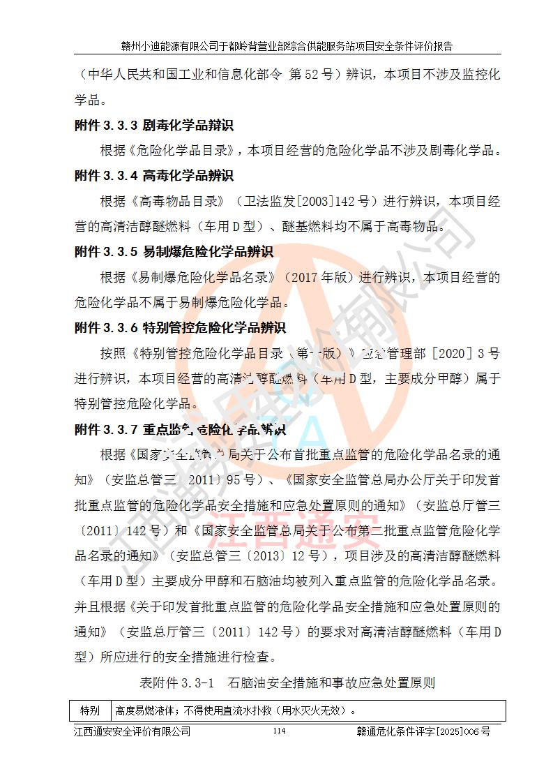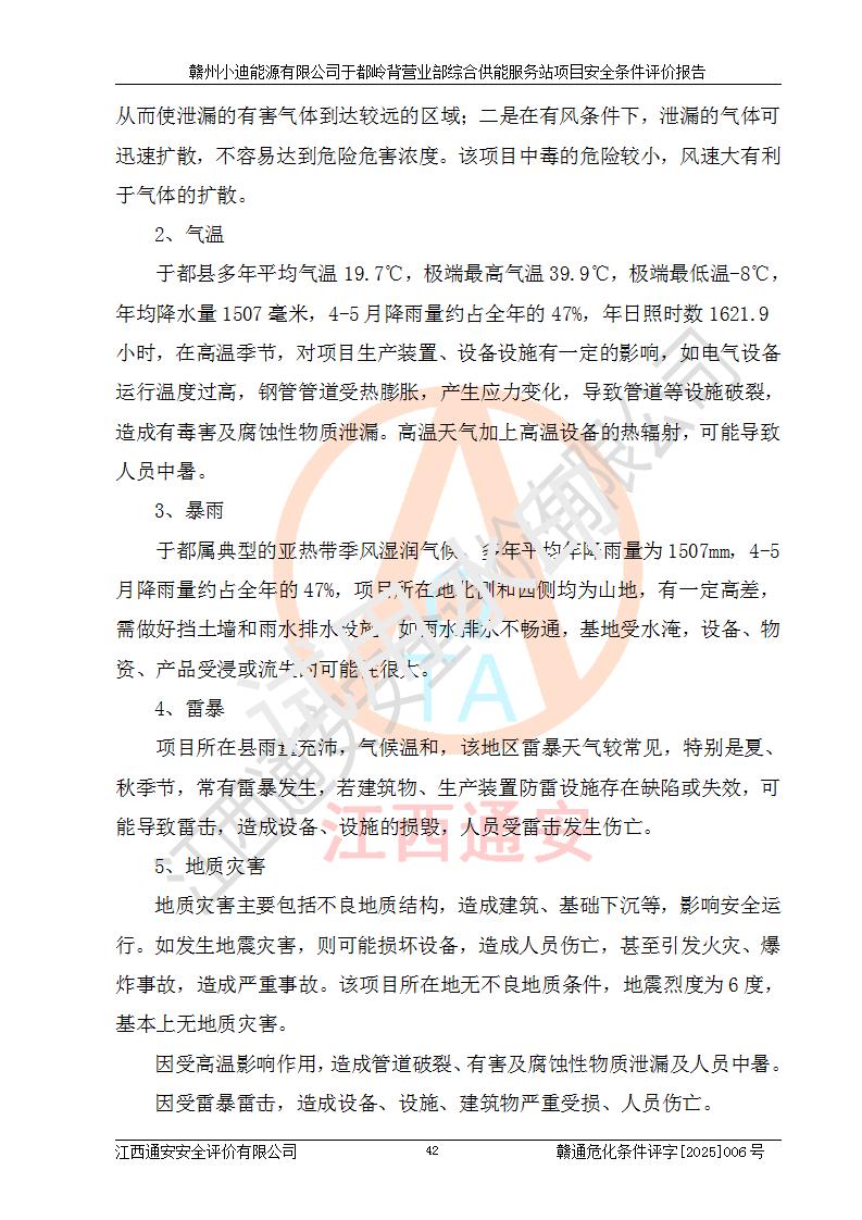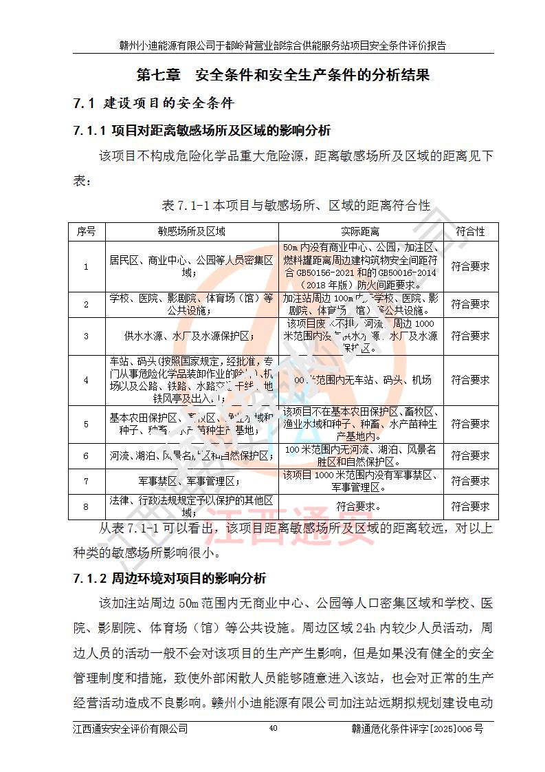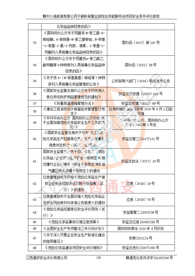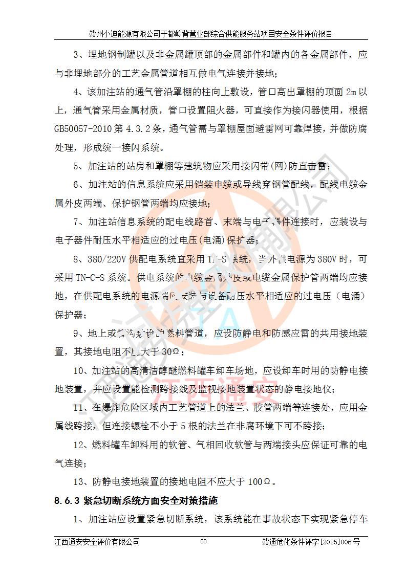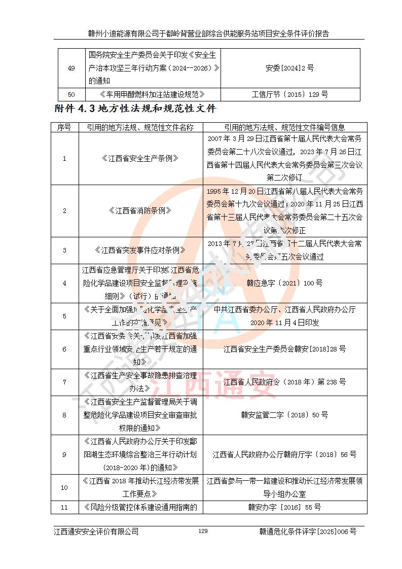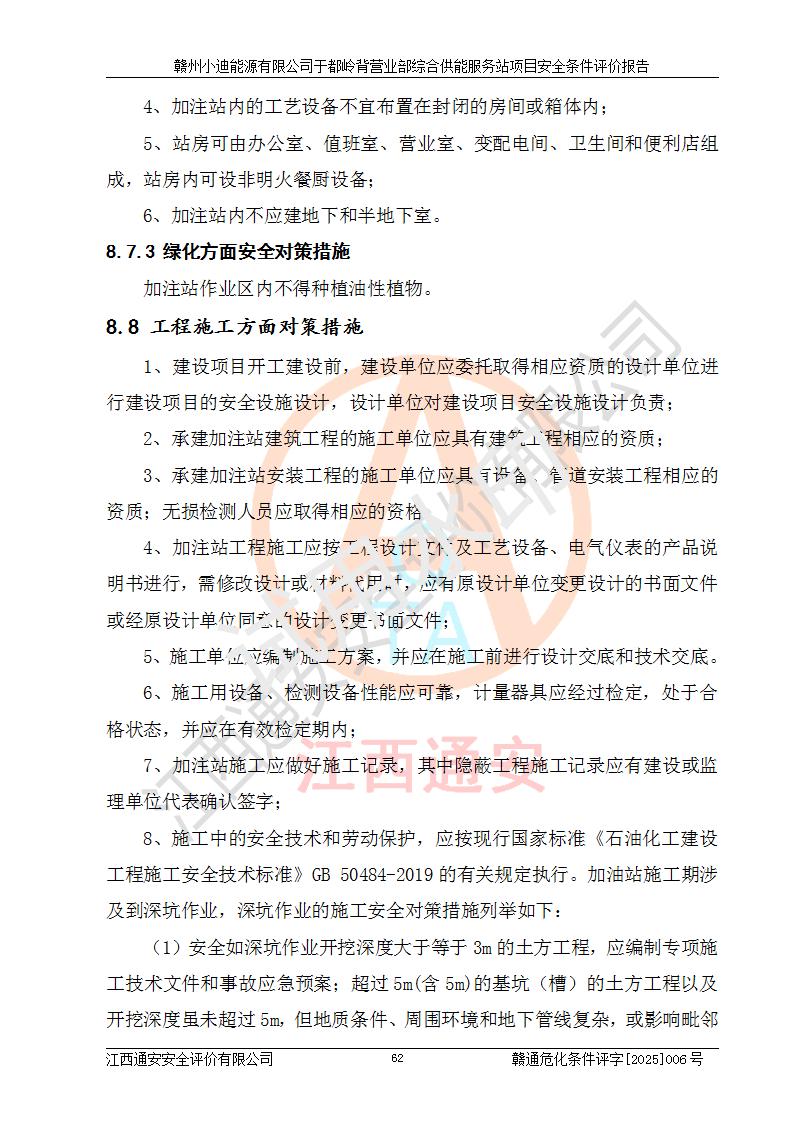 一、安全狀況綜合評(píng)述 通過(guò)對(duì)本項(xiàng)目的危險(xiǎn)、有害因素分析及定性、定量評(píng)價(jià),結(jié)果為: 1)本項(xiàng)目存在的危險(xiǎn)有害因素是火災(zāi)爆炸、**傷害、高處墜落、物體打擊、觸電、機(jī)械傷害、中毒窒息、坍塌等,主要危險(xiǎn)有害因素為火災(zāi)、爆炸等危險(xiǎn)因素。需重點(diǎn)防范的危險(xiǎn)有害因素為火災(zāi)、爆炸。本項(xiàng)目未構(gòu)成危險(xiǎn)化學(xué)品重大危險(xiǎn)源,也不存在劇毒、監(jiān)控、易制毒、易制爆化學(xué)品及高毒物品,高清潔醇醚燃料主要成分甲醇和石腦油為重點(diǎn)監(jiān)管危險(xiǎn)化學(xué)品,應(yīng)按照重點(diǎn)監(jiān)管危險(xiǎn)化學(xué)品相關(guān)規(guī)定管理。 2)預(yù)先危險(xiǎn)性分析表明該加注站儲(chǔ)存、經(jīng)營(yíng)過(guò)程中火災(zāi)、爆炸、觸電的危險(xiǎn)等級(jí)為Ⅲ級(jí),**傷害、高處墜落和中毒窒息等危險(xiǎn)等級(jí)為Ⅱ級(jí)。 3)從作業(yè)條件危險(xiǎn)性分析結(jié)果可以看出,在選定的評(píng)價(jià)單元中卸液作業(yè)、加注作業(yè)、變配電作業(yè)和維修作業(yè)中卸液作業(yè)中火災(zāi)爆炸、**傷害、觸電、中毒、窒息潛在危險(xiǎn)均為一般危險(xiǎn)。 4)從危險(xiǎn)度分析結(jié)果可以看出,燃料罐區(qū)屬中度危險(xiǎn)。 5)根據(jù)選址與總平面布置安全檢查表,該加注站符合《建筑設(shè)計(jì)防火規(guī)范》GB 50016-2014(2018年版)、《汽車(chē)加油加氣加氫站技術(shù)標(biāo)準(zhǔn)》GB50156-2021及《車(chē)用甲醇燃料加注站建設(shè)規(guī)范》(工信廳節(jié)〔2015〕129號(hào))等有關(guān)標(biāo)準(zhǔn)、規(guī)范的規(guī)定。該站與站外建筑物距離符合規(guī)范要求,站外50m內(nèi)無(wú)重要建筑物和明火設(shè)施。 6)根據(jù)立項(xiàng)批文及于都縣自然資源局出具的建設(shè)用地規(guī)劃許可證,該加注站符合有關(guān)部門(mén)的審批。 7)本項(xiàng)目采用成熟的工藝設(shè)備,項(xiàng)目在嚴(yán)格按照**相關(guān)法律、法規(guī)及技術(shù)標(biāo)準(zhǔn)制造、安裝、檢測(cè)檢驗(yàn)的情況下,其安全生產(chǎn)風(fēng)險(xiǎn)程度在可接受范圍。 8)本項(xiàng)目危害物質(zhì)為高清潔醇醚燃料(車(chē)用D型,甲類)和醚基燃料(車(chē)用Y型,丙類),應(yīng)重點(diǎn)注意火災(zāi)、爆炸危害,做好防火防靜電措施。**加注站罐區(qū)、加注區(qū)無(wú)明火產(chǎn)生;卸液口應(yīng)設(shè)置防靜電報(bào)警器,罐區(qū)法蘭應(yīng)跨接,防止靜電引起火災(zāi)爆炸事故。 四、評(píng)價(jià)結(jié)論 贛州小迪能源有限公司于都嶺背營(yíng)業(yè)部綜合供能服務(wù)站項(xiàng)目總平面布置符合相關(guān)規(guī)范的要求。在項(xiàng)目建設(shè)和運(yùn)行階段,總平面布置設(shè)計(jì)、施工圖設(shè)計(jì)和建設(shè)施工、安裝調(diào)試及生產(chǎn)運(yùn)行中,應(yīng)嚴(yán)格執(zhí)行**有關(guān)安全生產(chǎn)法律、法規(guī)和有關(guān)標(biāo)準(zhǔn)、規(guī)范,將本報(bào)告中提出的安全對(duì)策措施落實(shí)到位,真正做到安全設(shè)施與主體工程同時(shí)設(shè)計(jì)、同時(shí)施工、同時(shí)投入生產(chǎn)和使用,項(xiàng)目建成后危險(xiǎn)、有害因素可以得到**控制,安全風(fēng)險(xiǎn)在可接受范圍,擬建的贛州小迪能源有限公司于都嶺背營(yíng)業(yè)部綜合供能服務(wù)站項(xiàng)目符合法律法規(guī)、標(biāo)準(zhǔn)、規(guī)章和規(guī)范的要求。 |