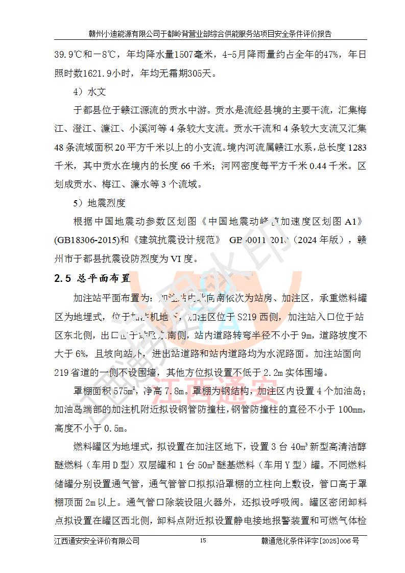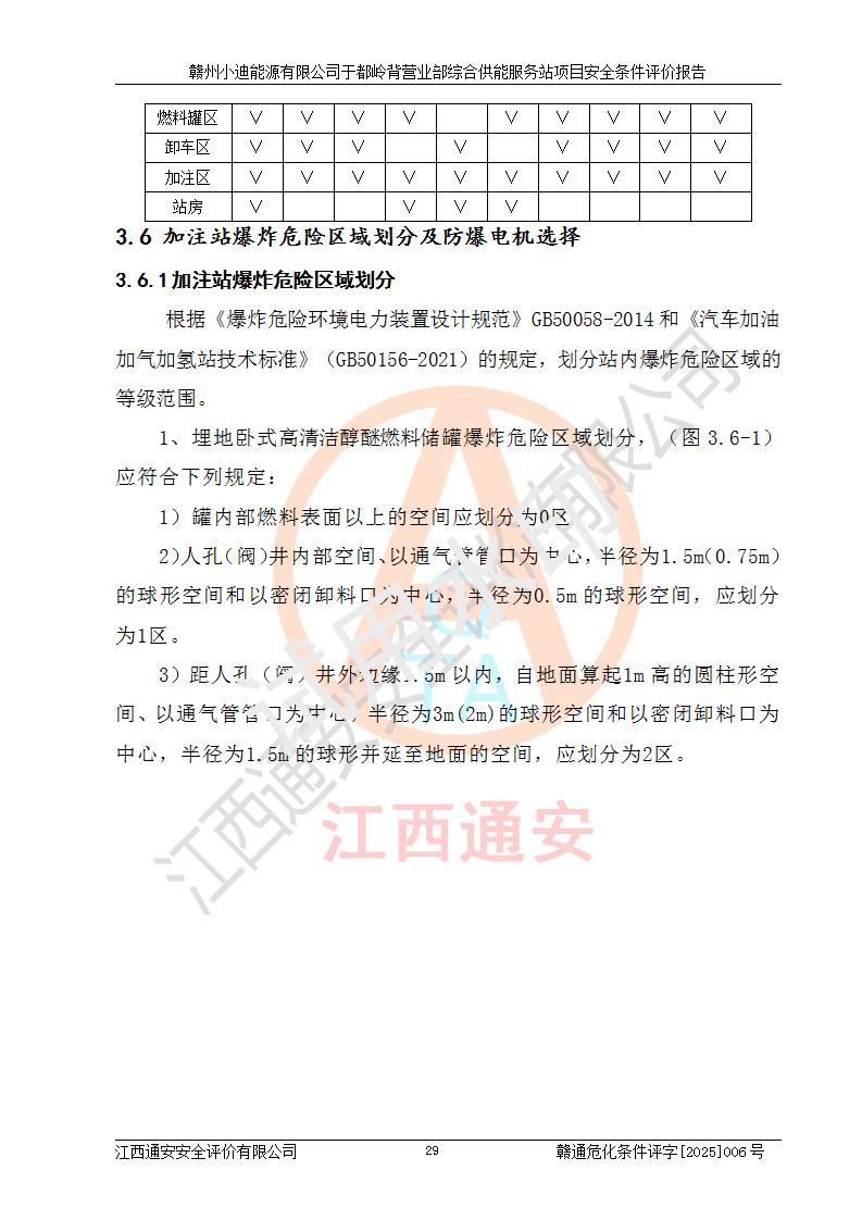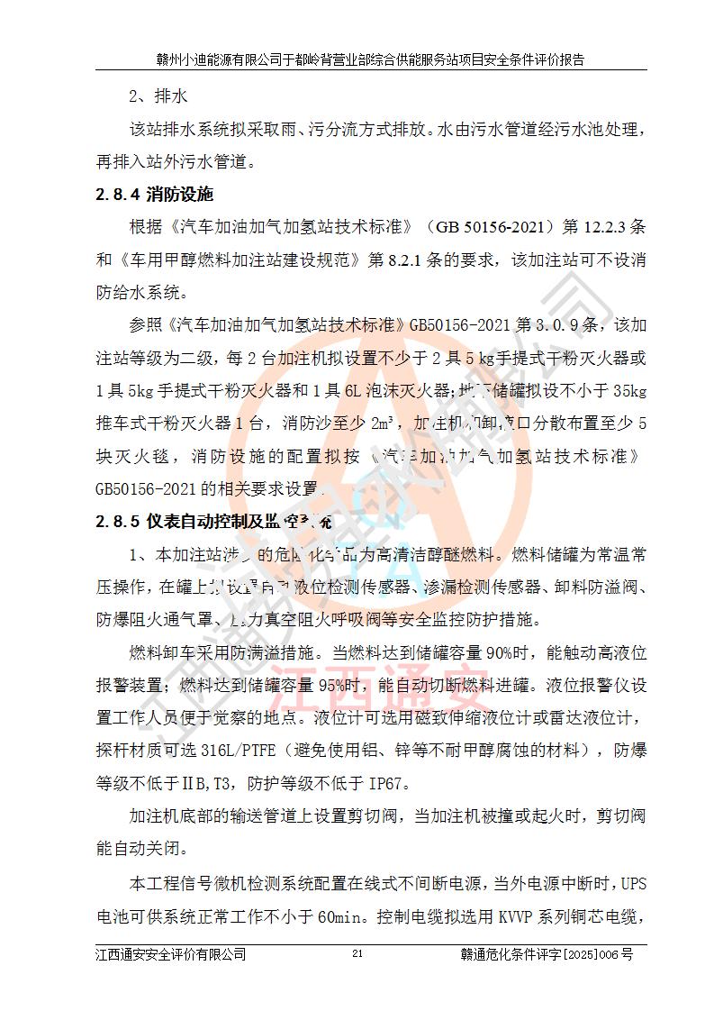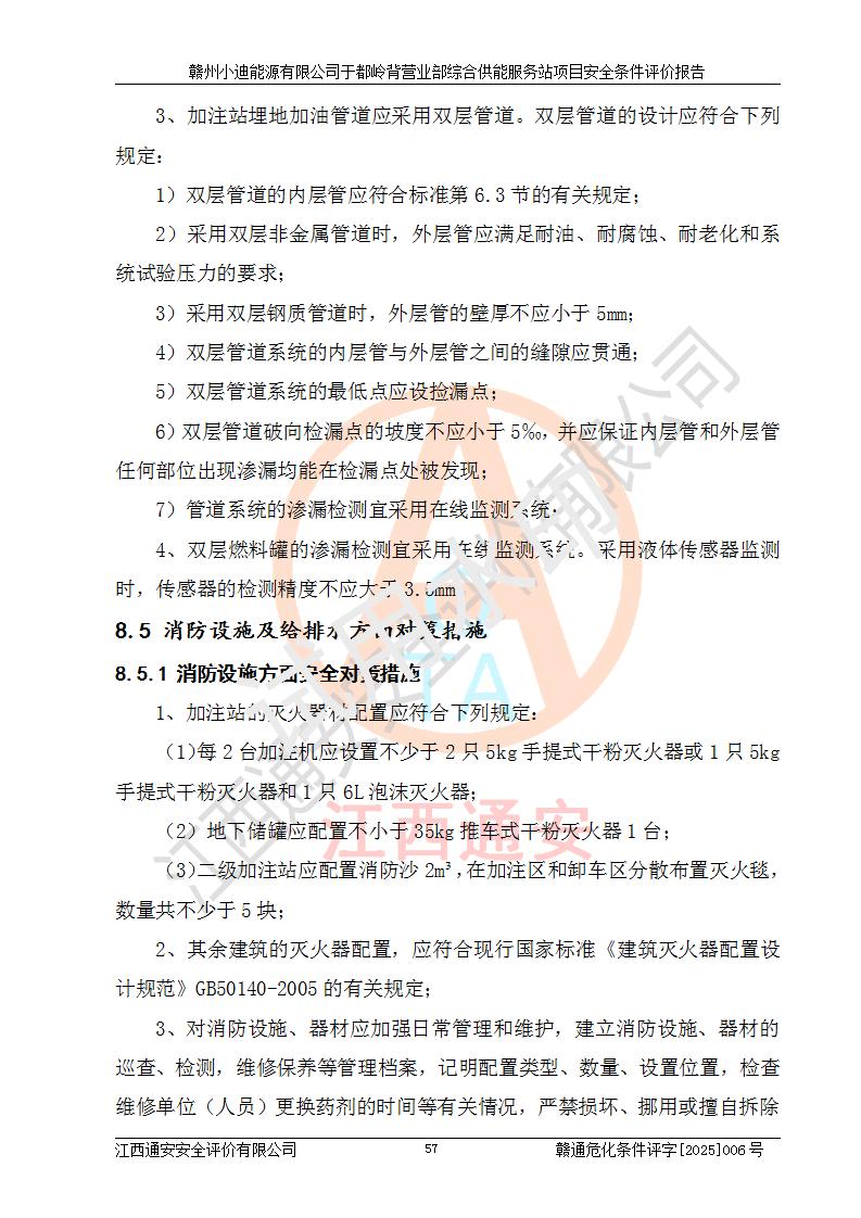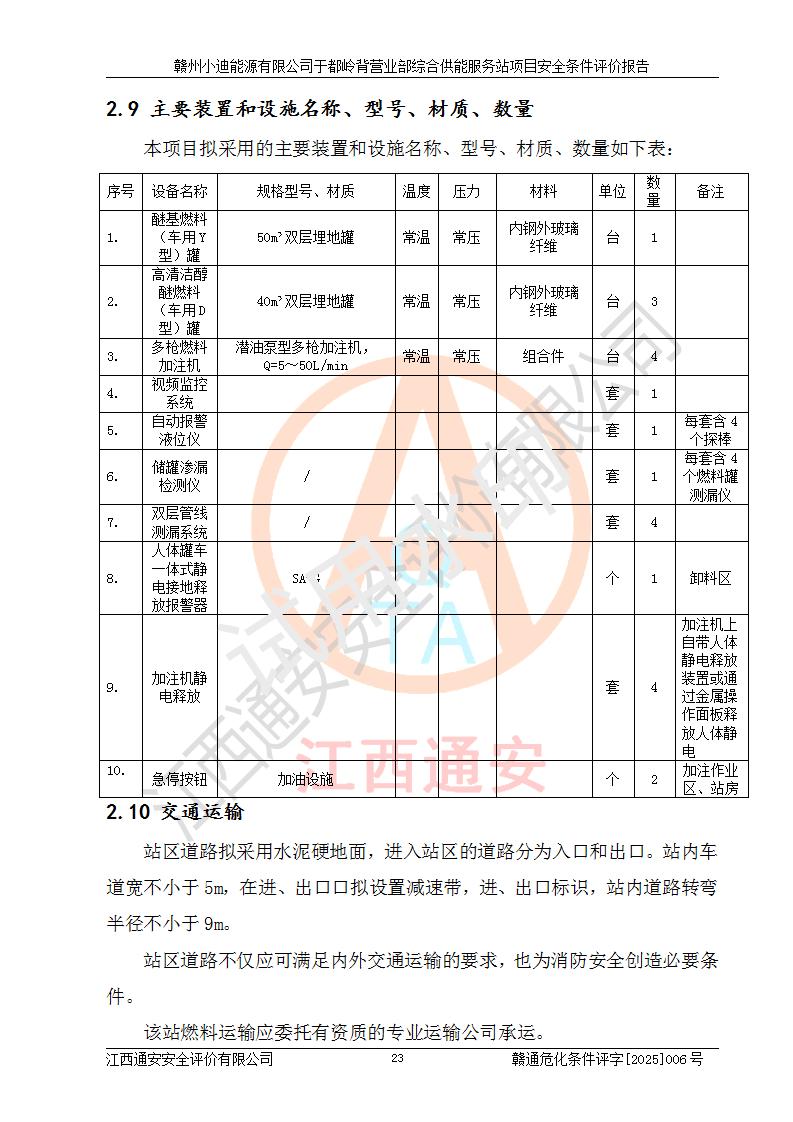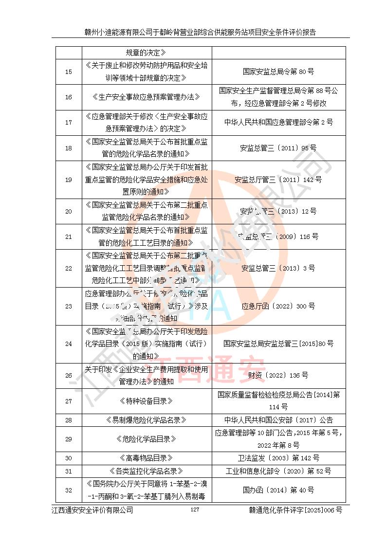 一、安全狀況綜合評(píng)述 通過(guò)對(duì)本項(xiàng)目的危險(xiǎn)、有害因素分析及定性、定量評(píng)價(jià),結(jié)果為: 1)本項(xiàng)目存在的危險(xiǎn)有害因素是火災(zāi)爆炸、**傷害、高處墜落、物體打擊、觸電、機(jī)械傷害、中毒窒息、坍塌等,主要危險(xiǎn)有害因素為火災(zāi)、爆炸等危險(xiǎn)因素。需重點(diǎn)防范的危險(xiǎn)有害因素為火災(zāi)、爆炸。本項(xiàng)目未構(gòu)成危險(xiǎn)化學(xué)品重大危險(xiǎn)源,也不存在劇毒、監(jiān)控、易制毒、易制爆化學(xué)品及高毒物品,高清潔醇醚燃料主要成分甲醇和石腦油為重點(diǎn)監(jiān)管危險(xiǎn)化學(xué)品,應(yīng)按照重點(diǎn)監(jiān)管危險(xiǎn)化學(xué)品相關(guān)規(guī)定管理。 2)預(yù)先危險(xiǎn)性分析表明該加注站儲(chǔ)存、經(jīng)營(yíng)過(guò)程中火災(zāi)、爆炸、觸電的危險(xiǎn)等級(jí)為Ⅲ級(jí),**傷害、高處墜落和中毒窒息等危險(xiǎn)等級(jí)為Ⅱ級(jí)。 3)從作業(yè)條件危險(xiǎn)性分析結(jié)果可以看出,在選定的評(píng)價(jià)單元中卸液作業(yè)、加注作業(yè)、變配電作業(yè)和維修作業(yè)中卸液作業(yè)中火災(zāi)爆炸、**傷害、觸電、中毒、窒息潛在危險(xiǎn)均為一般危險(xiǎn)。 4)從危險(xiǎn)度分析結(jié)果可以看出,燃料罐區(qū)屬中度危險(xiǎn)。 5)根據(jù)選址與總平面布置安全檢查表,該加注站符合《建筑設(shè)計(jì)防火規(guī)范》GB 50016-2014(2018年版)、《汽車(chē)加油加氣加氫站技術(shù)標(biāo)準(zhǔn)》GB50156-2021及《車(chē)用甲醇燃料加注站建設(shè)規(guī)范》(工信廳節(jié)〔2015〕129號(hào))等有關(guān)標(biāo)準(zhǔn)、規(guī)范的規(guī)定。該站與站外建筑物距離符合規(guī)范要求,站外50m內(nèi)無(wú)重要建筑物和明火設(shè)施。 6)根據(jù)立項(xiàng)批文及于都縣自然資源局出具的建設(shè)用地規(guī)劃許可證,該加注站符合有關(guān)部門(mén)的審批。 7)本項(xiàng)目采用成熟的工藝設(shè)備,項(xiàng)目在嚴(yán)格按照**相關(guān)法律、法規(guī)及技術(shù)標(biāo)準(zhǔn)制造、安裝、檢測(cè)檢驗(yàn)的情況下,其安全生產(chǎn)風(fēng)險(xiǎn)程度在可接受范圍。 8)本項(xiàng)目危害物質(zhì)為高清潔醇醚燃料(車(chē)用D型,甲類)和醚基燃料(車(chē)用Y型,丙類),應(yīng)重點(diǎn)注意火災(zāi)、爆炸危害,做好防火防靜電措施。**加注站罐區(qū)、加注區(qū)無(wú)明火產(chǎn)生;卸液口應(yīng)設(shè)置防靜電報(bào)警器,罐區(qū)法蘭應(yīng)跨接,防止靜電引起火災(zāi)爆炸事故。 四、評(píng)價(jià)結(jié)論 贛州小迪能源有限公司于都嶺背營(yíng)業(yè)部綜合供能服務(wù)站項(xiàng)目總平面布置符合相關(guān)規(guī)范的要求。在項(xiàng)目建設(shè)和運(yùn)行階段,總平面布置設(shè)計(jì)、施工圖設(shè)計(jì)和建設(shè)施工、安裝調(diào)試及生產(chǎn)運(yùn)行中,應(yīng)嚴(yán)格執(zhí)行**有關(guān)安全生產(chǎn)法律、法規(guī)和有關(guān)標(biāo)準(zhǔn)、規(guī)范,將本報(bào)告中提出的安全對(duì)策措施落實(shí)到位,真正做到安全設(shè)施與主體工程同時(shí)設(shè)計(jì)、同時(shí)施工、同時(shí)投入生產(chǎn)和使用,項(xiàng)目建成后危險(xiǎn)、有害因素可以得到**控制,安全風(fēng)險(xiǎn)在可接受范圍,擬建的贛州小迪能源有限公司于都嶺背營(yíng)業(yè)部綜合供能服務(wù)站項(xiàng)目符合法律法規(guī)、標(biāo)準(zhǔn)、規(guī)章和規(guī)范的要求。 |