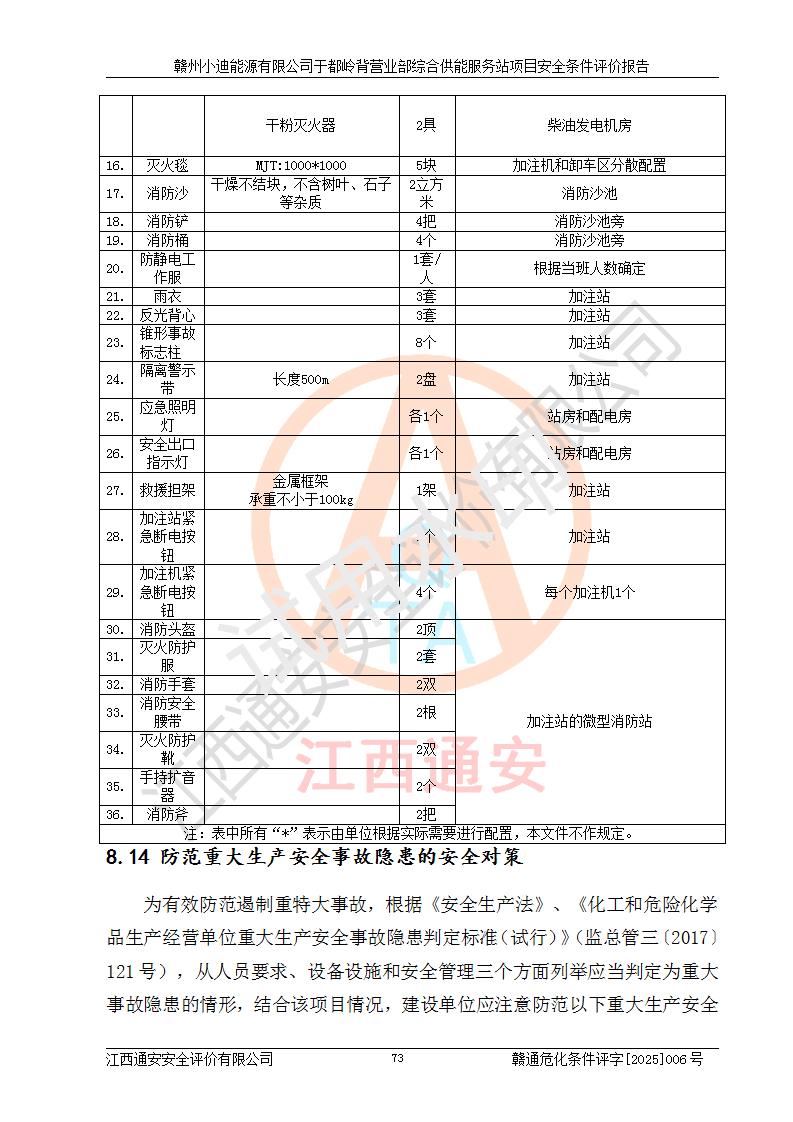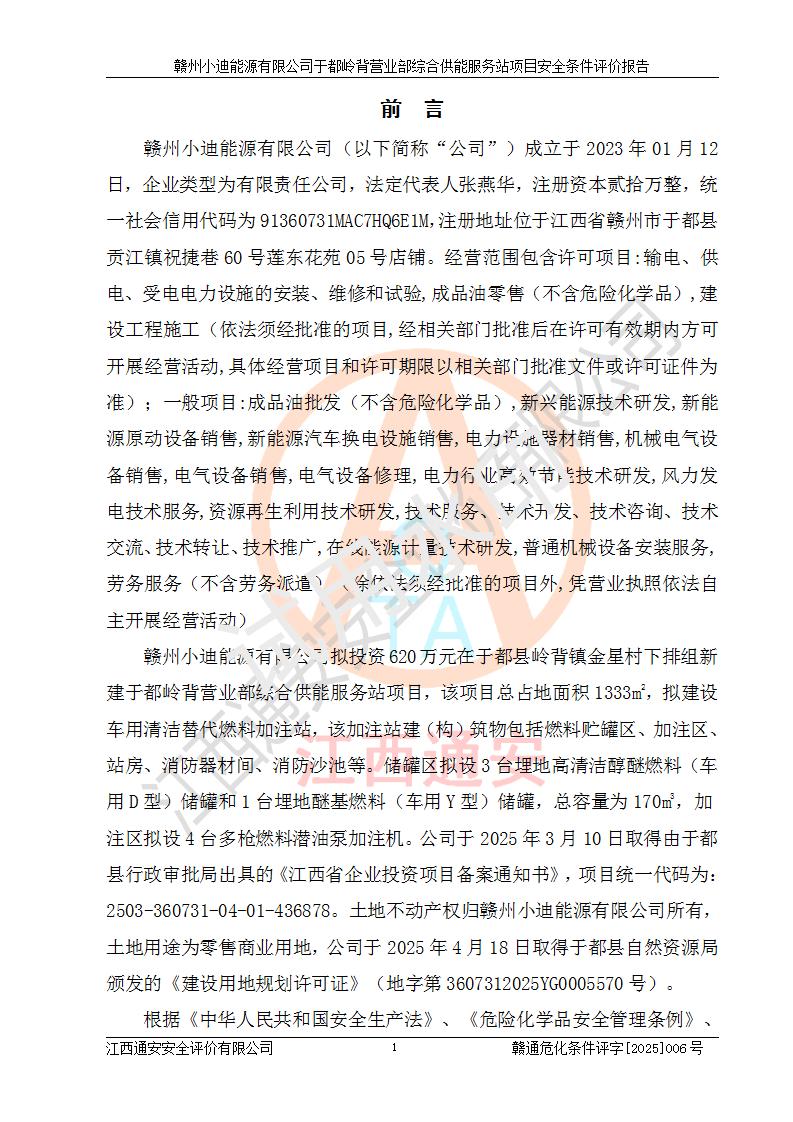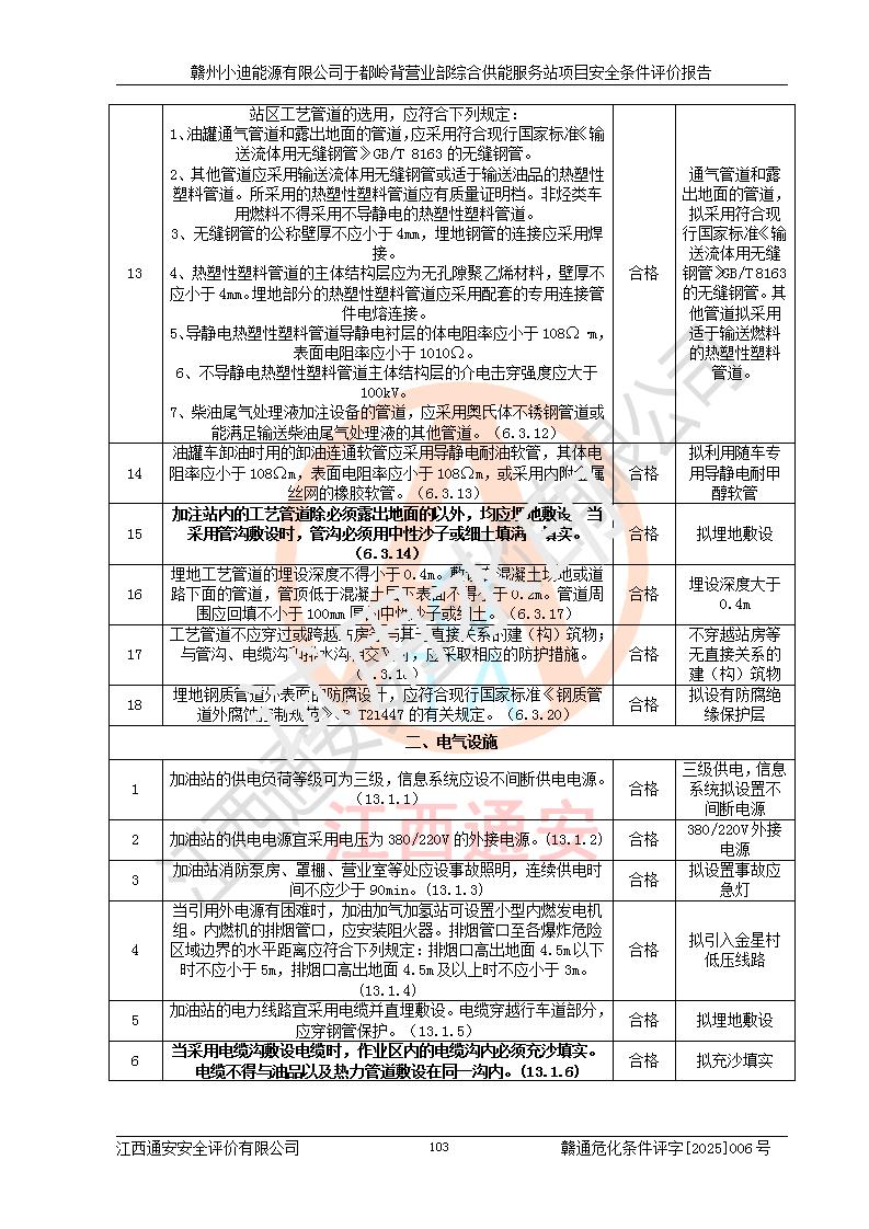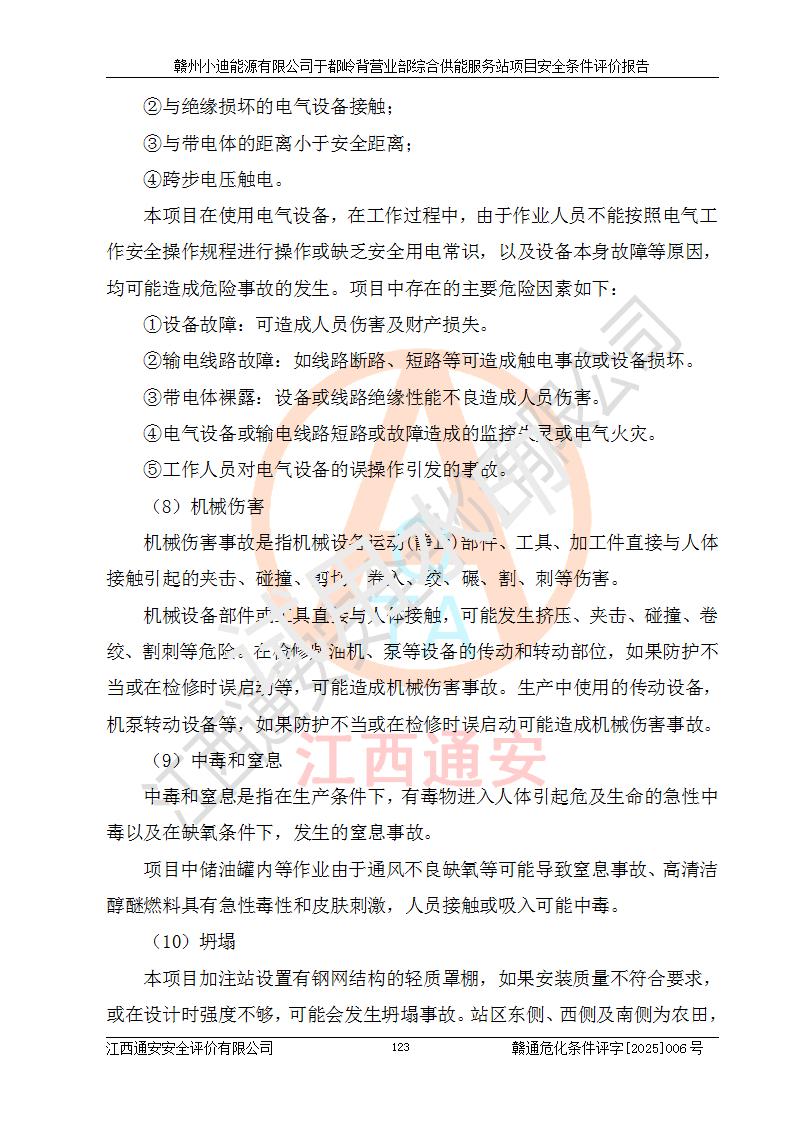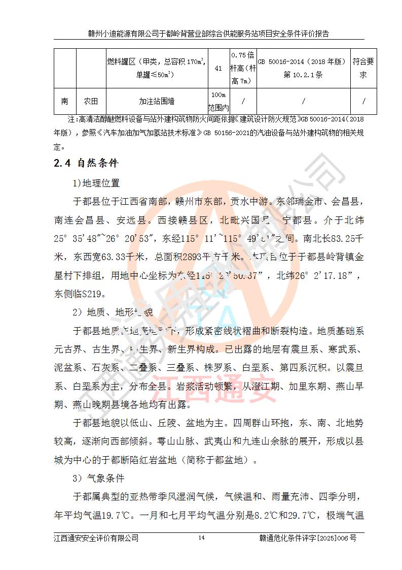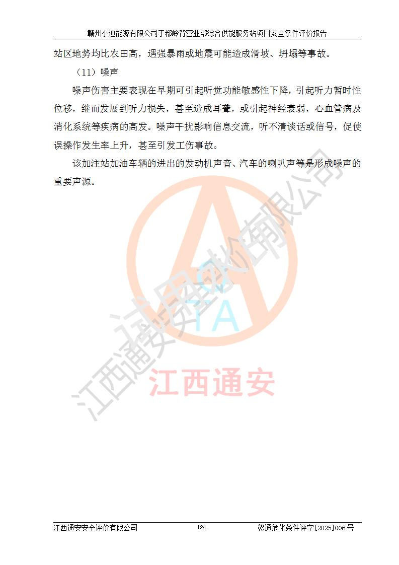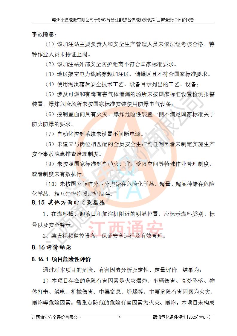 一、安全狀況綜合評(píng)述 通過(guò)對(duì)本項(xiàng)目的危險(xiǎn)、有害因素分析及定性、定量評(píng)價(jià),結(jié)果為: 1)本項(xiàng)目存在的危險(xiǎn)有害因素是火災(zāi)爆炸、**傷害、高處墜落、物體打擊、觸電、機(jī)械傷害、中毒窒息、坍塌等,主要危險(xiǎn)有害因素為火災(zāi)、爆炸等危險(xiǎn)因素。需重點(diǎn)防范的危險(xiǎn)有害因素為火災(zāi)、爆炸。本項(xiàng)目未構(gòu)成危險(xiǎn)化學(xué)品重大危險(xiǎn)源,也不存在劇毒、監(jiān)控、易制毒、易制爆化學(xué)品及高毒物品,高清潔醇醚燃料主要成分甲醇和石腦油為重點(diǎn)監(jiān)管危險(xiǎn)化學(xué)品,應(yīng)按照重點(diǎn)監(jiān)管危險(xiǎn)化學(xué)品相關(guān)規(guī)定管理。 2)預(yù)先危險(xiǎn)性分析表明該加注站儲(chǔ)存、經(jīng)營(yíng)過(guò)程中火災(zāi)、爆炸、觸電的危險(xiǎn)等級(jí)為Ⅲ級(jí),**傷害、高處墜落和中毒窒息等危險(xiǎn)等級(jí)為Ⅱ級(jí)。 3)從作業(yè)條件危險(xiǎn)性分析結(jié)果可以看出,在選定的評(píng)價(jià)單元中卸液作業(yè)、加注作業(yè)、變配電作業(yè)和維修作業(yè)中卸液作業(yè)中火災(zāi)爆炸、**傷害、觸電、中毒、窒息潛在危險(xiǎn)均為一般危險(xiǎn)。 4)從危險(xiǎn)度分析結(jié)果可以看出,燃料罐區(qū)屬中度危險(xiǎn)。 5)根據(jù)選址與總平面布置安全檢查表,該加注站符合《建筑設(shè)計(jì)防火規(guī)范》GB 50016-2014(2018年版)、《汽車(chē)加油加氣加氫站技術(shù)標(biāo)準(zhǔn)》GB50156-2021及《車(chē)用甲醇燃料加注站建設(shè)規(guī)范》(工信廳節(jié)〔2015〕129號(hào))等有關(guān)標(biāo)準(zhǔn)、規(guī)范的規(guī)定。該站與站外建筑物距離符合規(guī)范要求,站外50m內(nèi)無(wú)重要建筑物和明火設(shè)施。 6)根據(jù)立項(xiàng)批文及于都縣自然資源局出具的建設(shè)用地規(guī)劃許可證,該加注站符合有關(guān)部門(mén)的審批。 7)本項(xiàng)目采用成熟的工藝設(shè)備,項(xiàng)目在嚴(yán)格按照**相關(guān)法律、法規(guī)及技術(shù)標(biāo)準(zhǔn)制造、安裝、檢測(cè)檢驗(yàn)的情況下,其安全生產(chǎn)風(fēng)險(xiǎn)程度在可接受范圍。 8)本項(xiàng)目危害物質(zhì)為高清潔醇醚燃料(車(chē)用D型,甲類)和醚基燃料(車(chē)用Y型,丙類),應(yīng)重點(diǎn)注意火災(zāi)、爆炸危害,做好防火防靜電措施。**加注站罐區(qū)、加注區(qū)無(wú)明火產(chǎn)生;卸液口應(yīng)設(shè)置防靜電報(bào)警器,罐區(qū)法蘭應(yīng)跨接,防止靜電引起火災(zāi)爆炸事故。 四、評(píng)價(jià)結(jié)論 贛州小迪能源有限公司于都嶺背營(yíng)業(yè)部綜合供能服務(wù)站項(xiàng)目總平面布置符合相關(guān)規(guī)范的要求。在項(xiàng)目建設(shè)和運(yùn)行階段,總平面布置設(shè)計(jì)、施工圖設(shè)計(jì)和建設(shè)施工、安裝調(diào)試及生產(chǎn)運(yùn)行中,應(yīng)嚴(yán)格執(zhí)行**有關(guān)安全生產(chǎn)法律、法規(guī)和有關(guān)標(biāo)準(zhǔn)、規(guī)范,將本報(bào)告中提出的安全對(duì)策措施落實(shí)到位,真正做到安全設(shè)施與主體工程同時(shí)設(shè)計(jì)、同時(shí)施工、同時(shí)投入生產(chǎn)和使用,項(xiàng)目建成后危險(xiǎn)、有害因素可以得到**控制,安全風(fēng)險(xiǎn)在可接受范圍,擬建的贛州小迪能源有限公司于都嶺背營(yíng)業(yè)部綜合供能服務(wù)站項(xiàng)目符合法律法規(guī)、標(biāo)準(zhǔn)、規(guī)章和規(guī)范的要求。 |