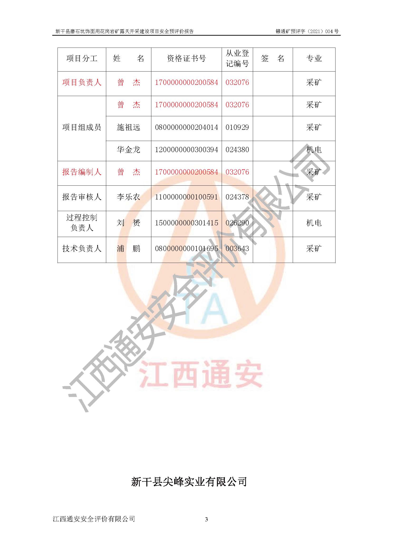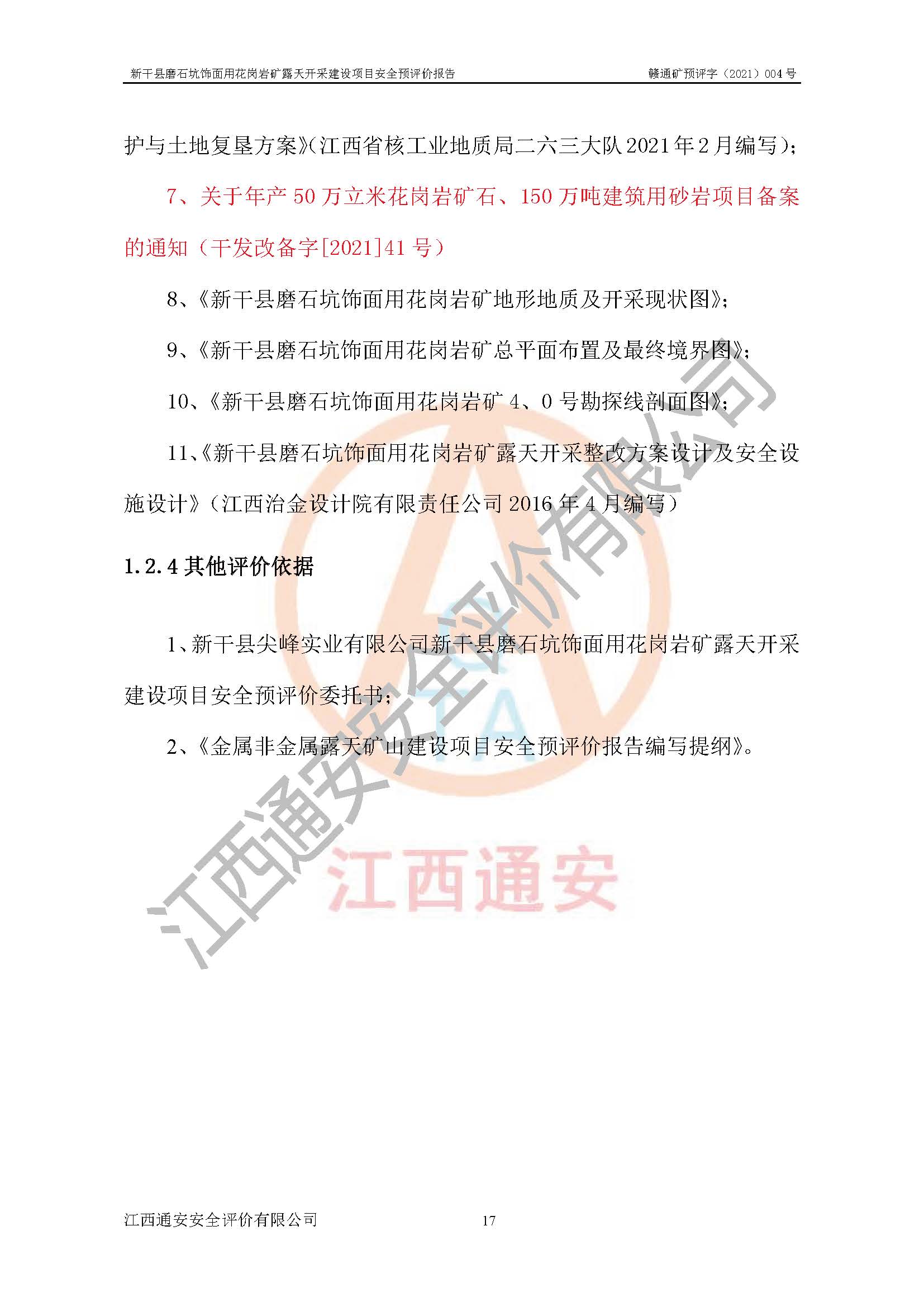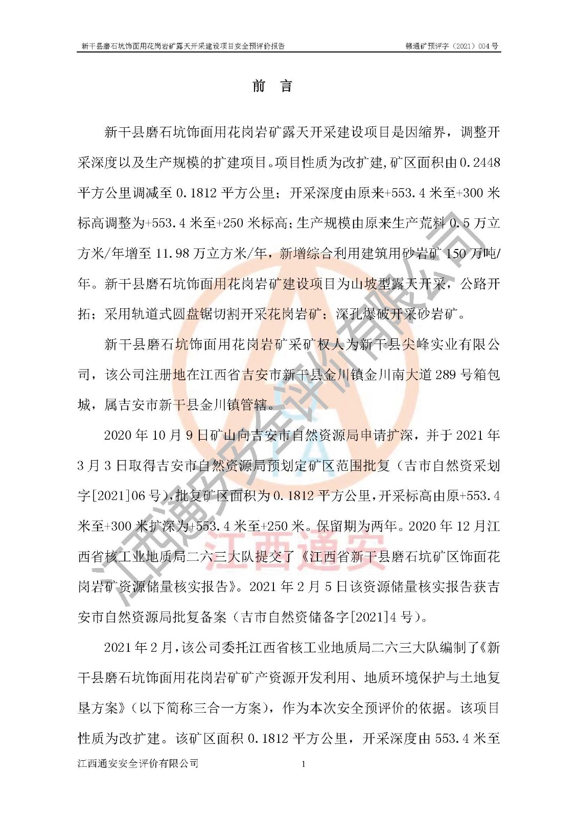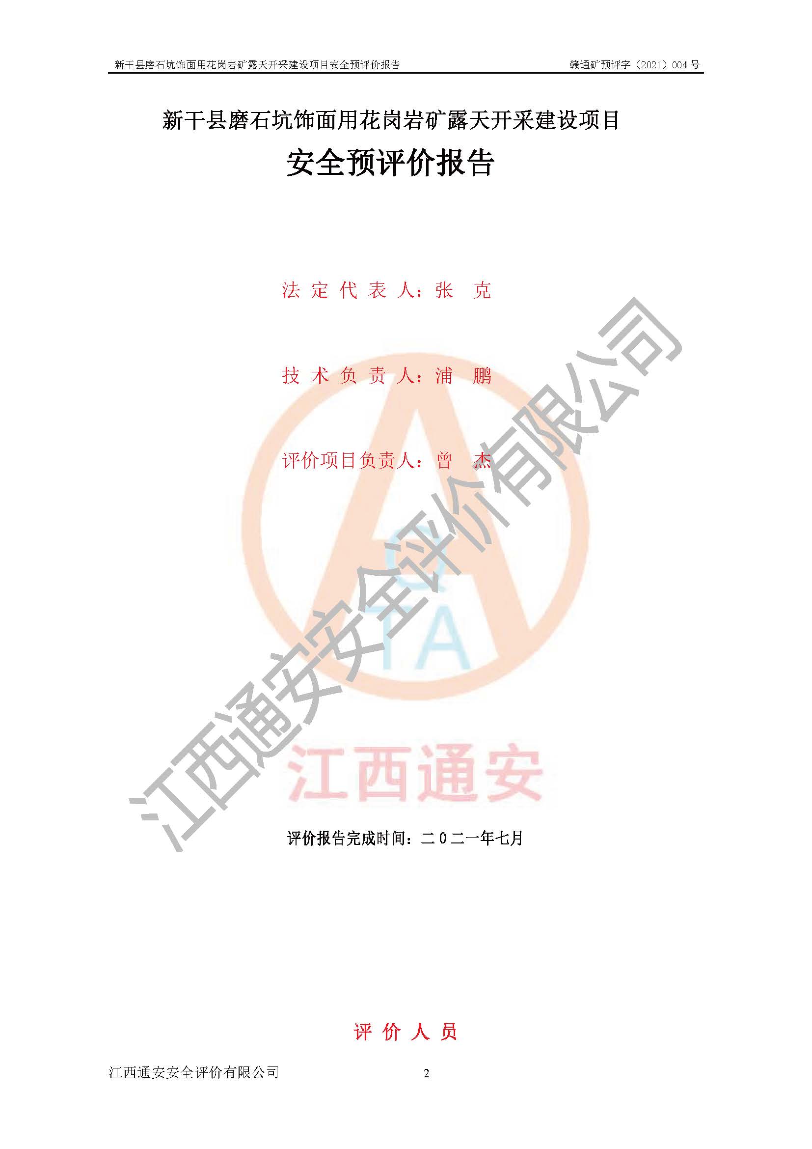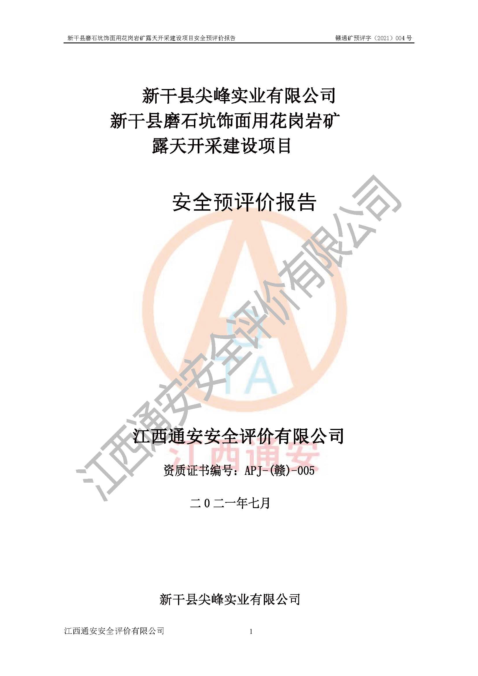 項目名稱 | 新干縣尖峰實業(yè)有限公司新干縣磨石坑飾面用花崗巖礦露天開采建設(shè)項目安全預(yù)評價報告 | ||||