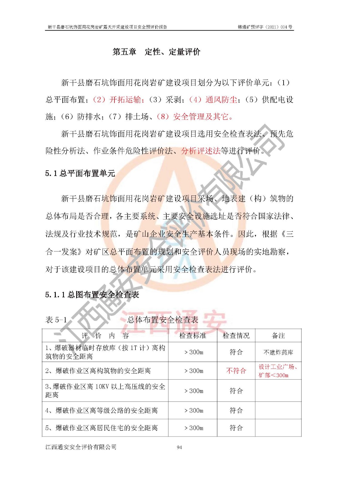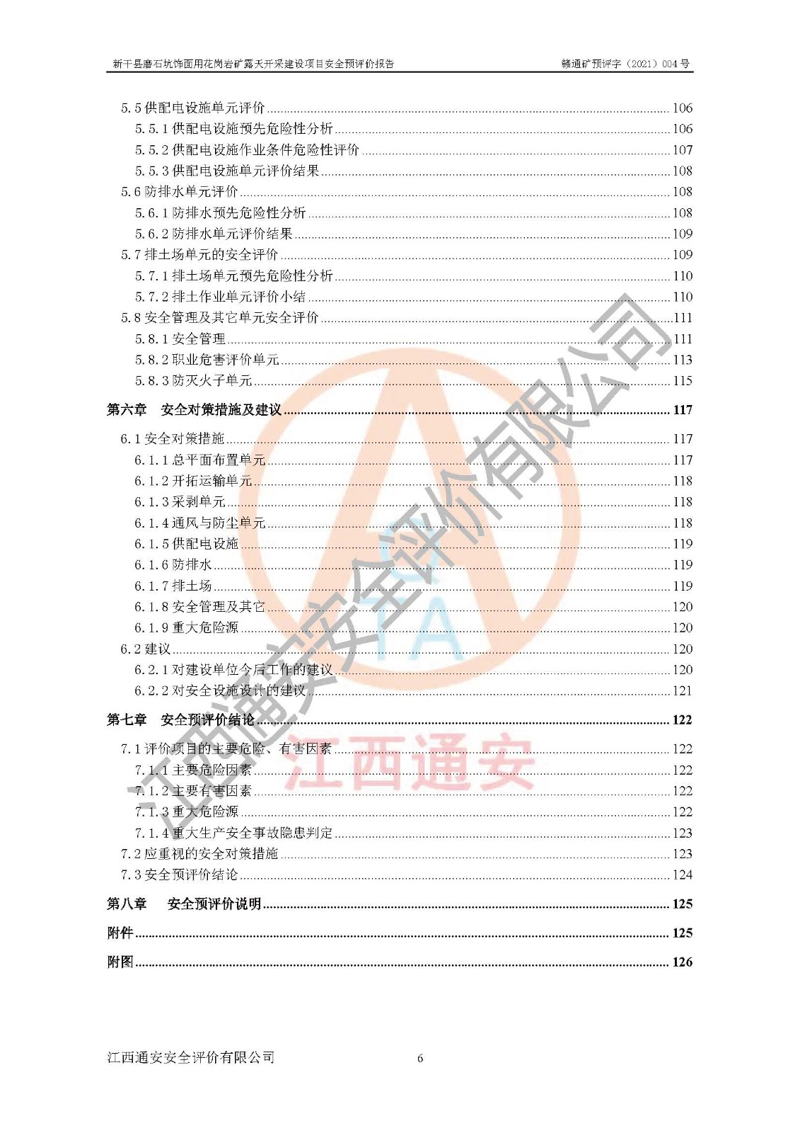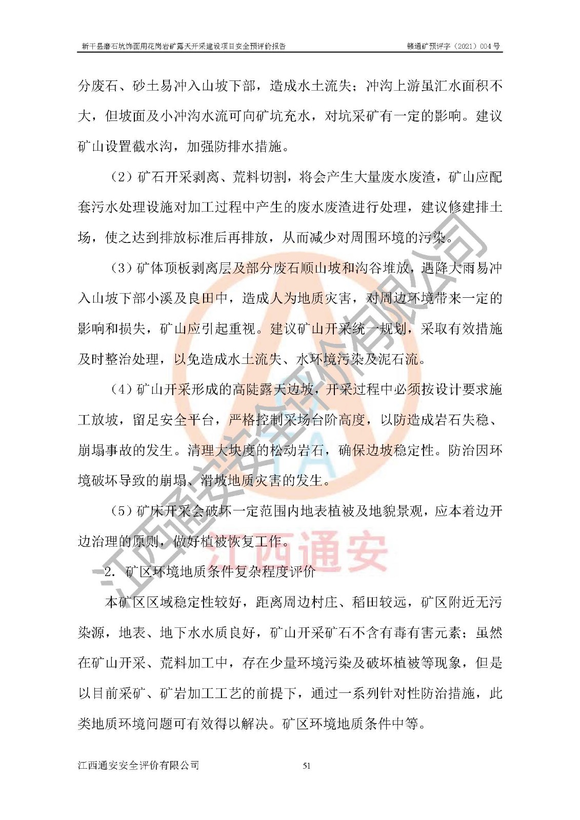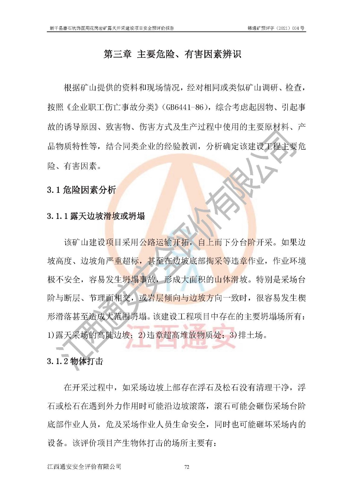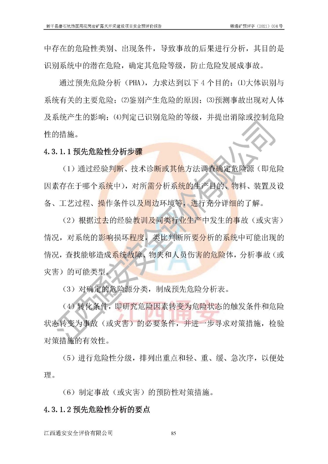 其它 | 安全預(yù)評價接受委托前,江西通安安全評價有限公司對該項目進行了風(fēng)險分析,分析結(jié)果結(jié)論為可接受安全預(yù)評價委托。接受安全預(yù)評價委托后,我公司發(fā)布了新干縣磨石坑飾面用花崗巖礦露天開采建設(shè)項目評價人員任命書。項目負(fù)責(zé)人及項目組成員編制了安全評價項目工作計劃。 為了**安全預(yù)評價的科學(xué)性、公正性和嚴(yán)肅性,我公司于2021年4月1日、4月20日組織安全評價組人員對新干縣磨石坑飾面用花崗巖礦露天開采建設(shè)項目的現(xiàn)場周邊環(huán)境進行勘察,并收集了與安全生產(chǎn)相關(guān)的法律、法規(guī)、技術(shù)標(biāo)準(zhǔn)和《江西省新干縣磨石坑礦區(qū)飾面花崗巖礦資源儲量核實報告》、《新干縣磨石坑飾面用花崗巖礦礦產(chǎn)資源開發(fā)利用、地質(zhì)環(huán)境保護與土地復(fù)墾方案》等建設(shè)項目資料,按照《**安全監(jiān)管總局關(guān)于印發(fā)金屬非金屬礦山建設(shè)項目安全評價報告編寫提綱的通知》(安監(jiān)總管一[2016]49號)及《金屬非金屬露天礦山建設(shè)項目安全預(yù)評價報告編寫提綱》的要求編制本預(yù)評價報告,為安全設(shè)施設(shè)計及安全生產(chǎn)監(jiān)督管理部門實施綜合監(jiān)管提供依據(jù)。 本安全預(yù)評價報告認(rèn)為:新干縣磨石坑飾面用花崗巖礦露天開采建設(shè)項目內(nèi)部場地及外部周邊環(huán)境一般,交通及通訊較為便利,便于露天開采。本建設(shè)項目相關(guān)證照合法**;相關(guān)資料、圖紙對項目今后的建設(shè)和生產(chǎn)具有**的指導(dǎo)意義;新干縣磨石坑飾面用花崗巖礦露天開采建設(shè)項目對公共安全無大的影響;存在的主要危險、有害因素是完全可以預(yù)防和控制的。 | ||||
