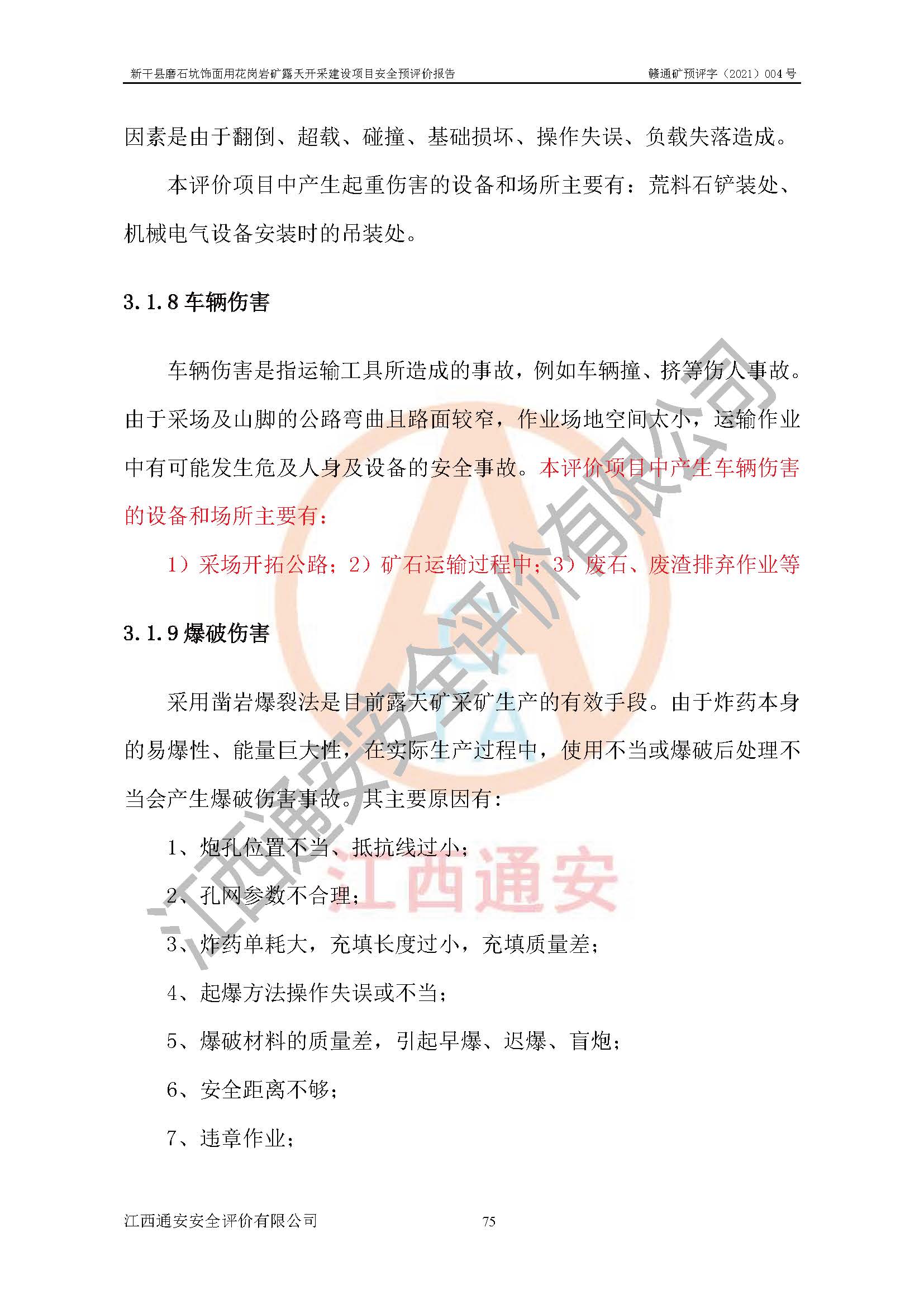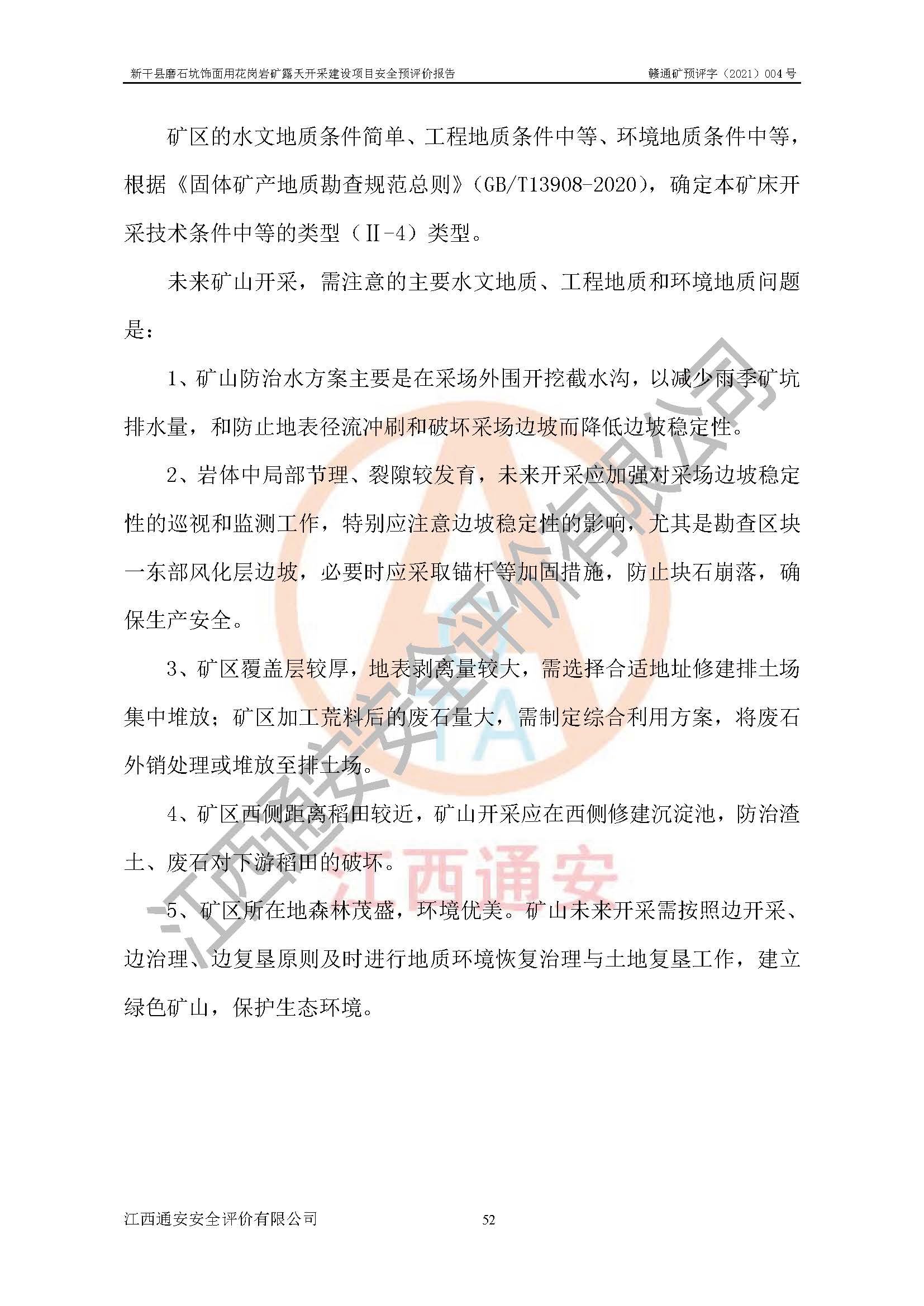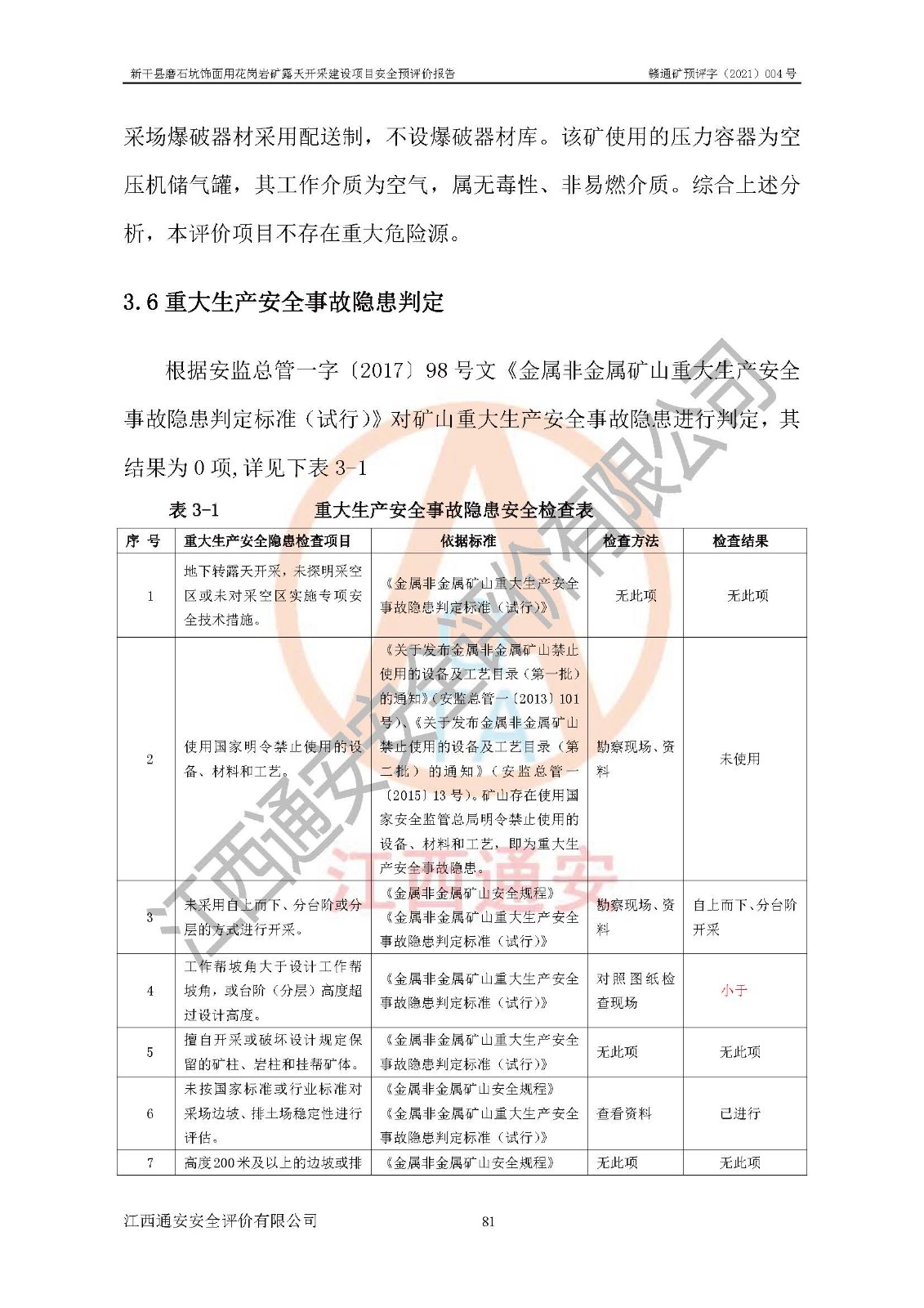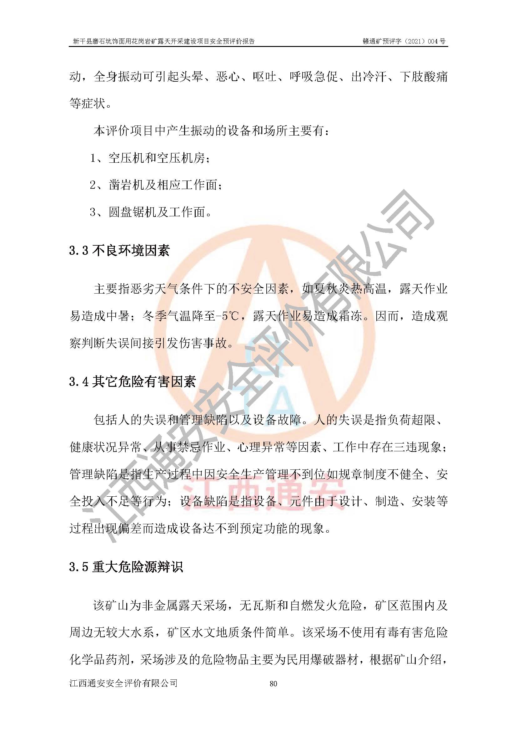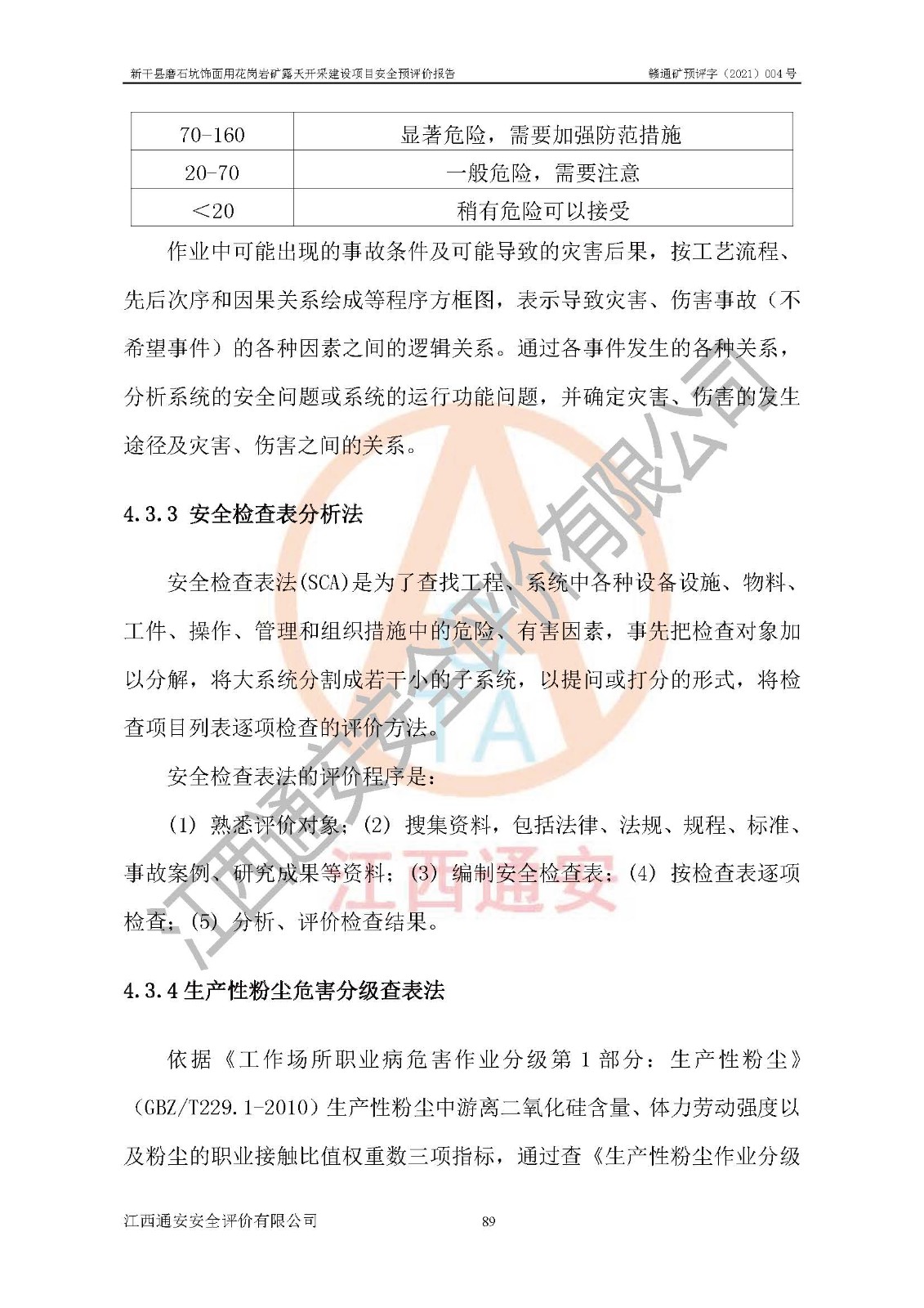 其它 | 安全預(yù)評價接受委托前,江西通安安全評價有限公司對該項目進行了風(fēng)險分析,分析結(jié)果結(jié)論為可接受安全預(yù)評價委托。接受安全預(yù)評價委托后,我公司發(fā)布了新干縣磨石坑飾面用花崗巖礦露天開采建設(shè)項目評價人員任命書。項目負(fù)責(zé)人及項目組成員編制了安全評價項目工作計劃。 為了**安全預(yù)評價的科學(xué)性、公正性和嚴(yán)肅性,我公司于2021年4月1日、4月20日組織安全評價組人員對新干縣磨石坑飾面用花崗巖礦露天開采建設(shè)項目的現(xiàn)場周邊環(huán)境進行勘察,并收集了與安全生產(chǎn)相關(guān)的法律、法規(guī)、技術(shù)標(biāo)準(zhǔn)和《江西省新干縣磨石坑礦區(qū)飾面花崗巖礦資源儲量核實報告》、《新干縣磨石坑飾面用花崗巖礦礦產(chǎn)資源開發(fā)利用、地質(zhì)環(huán)境保護與土地復(fù)墾方案》等建設(shè)項目資料,按照《**安全監(jiān)管總局關(guān)于印發(fā)金屬非金屬礦山建設(shè)項目安全評價報告編寫提綱的通知》(安監(jiān)總管一[2016]49號)及《金屬非金屬露天礦山建設(shè)項目安全預(yù)評價報告編寫提綱》的要求編制本預(yù)評價報告,為安全設(shè)施設(shè)計及安全生產(chǎn)監(jiān)督管理部門實施綜合監(jiān)管提供依據(jù)。 本安全預(yù)評價報告認(rèn)為:新干縣磨石坑飾面用花崗巖礦露天開采建設(shè)項目內(nèi)部場地及外部周邊環(huán)境一般,交通及通訊較為便利,便于露天開采。本建設(shè)項目相關(guān)證照合法**;相關(guān)資料、圖紙對項目今后的建設(shè)和生產(chǎn)具有**的指導(dǎo)意義;新干縣磨石坑飾面用花崗巖礦露天開采建設(shè)項目對公共安全無大的影響;存在的主要危險、有害因素是完全可以預(yù)防和控制的。 | ||||