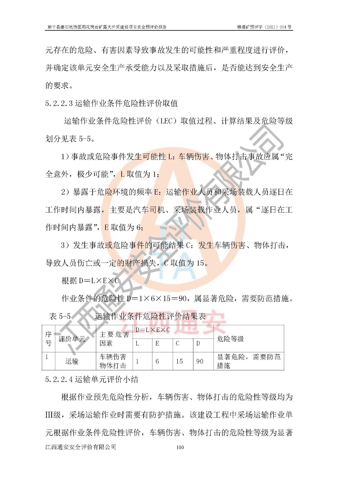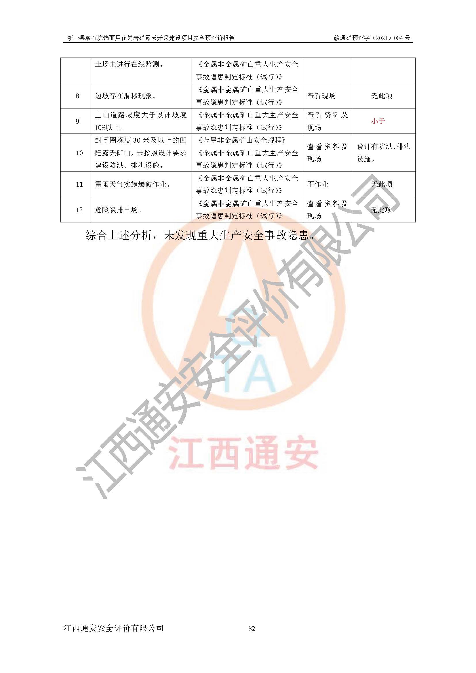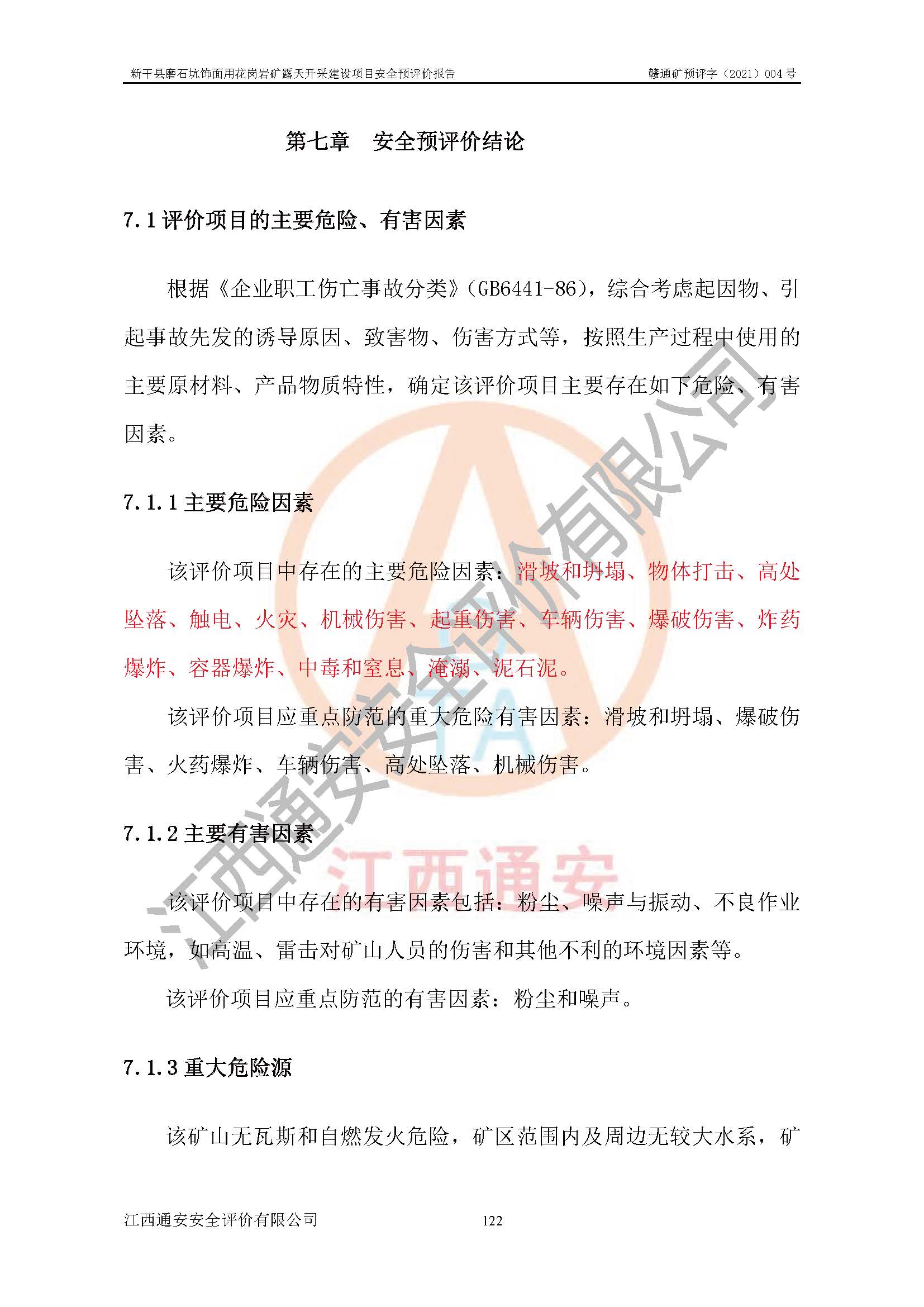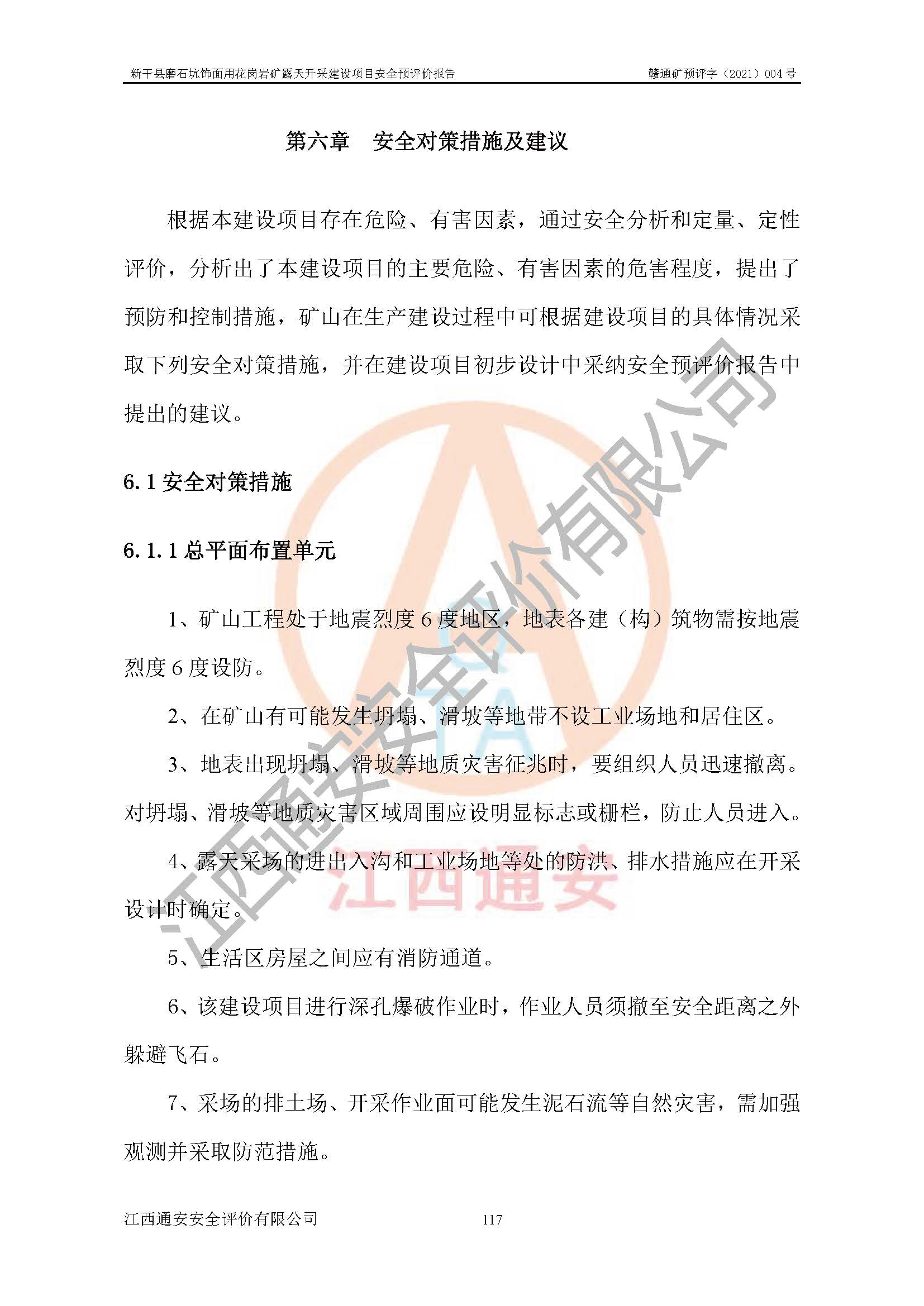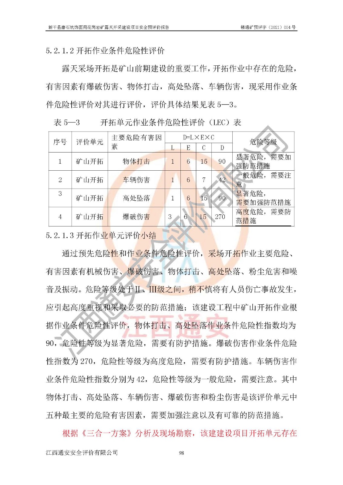 其它 | 安全預(yù)評價接受委托前,江西通安安全評價有限公司對該項目進行了風(fēng)險分析,分析結(jié)果結(jié)論為可接受安全預(yù)評價委托。接受安全預(yù)評價委托后,我公司發(fā)布了新干縣磨石坑飾面用花崗巖礦露天開采建設(shè)項目評價人員任命書。項目負(fù)責(zé)人及項目組成員編制了安全評價項目工作計劃。 為了**安全預(yù)評價的科學(xué)性、公正性和嚴(yán)肅性,我公司于2021年4月1日、4月20日組織安全評價組人員對新干縣磨石坑飾面用花崗巖礦露天開采建設(shè)項目的現(xiàn)場周邊環(huán)境進行勘察,并收集了與安全生產(chǎn)相關(guān)的法律、法規(guī)、技術(shù)標(biāo)準(zhǔn)和《江西省新干縣磨石坑礦區(qū)飾面花崗巖礦資源儲量核實報告》、《新干縣磨石坑飾面用花崗巖礦礦產(chǎn)資源開發(fā)利用、地質(zhì)環(huán)境保護與土地復(fù)墾方案》等建設(shè)項目資料,按照《**安全監(jiān)管總局關(guān)于印發(fā)金屬非金屬礦山建設(shè)項目安全評價報告編寫提綱的通知》(安監(jiān)總管一[2016]49號)及《金屬非金屬露天礦山建設(shè)項目安全預(yù)評價報告編寫提綱》的要求編制本預(yù)評價報告,為安全設(shè)施設(shè)計及安全生產(chǎn)監(jiān)督管理部門實施綜合監(jiān)管提供依據(jù)。 本安全預(yù)評價報告認(rèn)為:新干縣磨石坑飾面用花崗巖礦露天開采建設(shè)項目內(nèi)部場地及外部周邊環(huán)境一般,交通及通訊較為便利,便于露天開采。本建設(shè)項目相關(guān)證照合法**;相關(guān)資料、圖紙對項目今后的建設(shè)和生產(chǎn)具有**的指導(dǎo)意義;新干縣磨石坑飾面用花崗巖礦露天開采建設(shè)項目對公共安全無大的影響;存在的主要危險、有害因素是完全可以預(yù)防和控制的。 | ||||