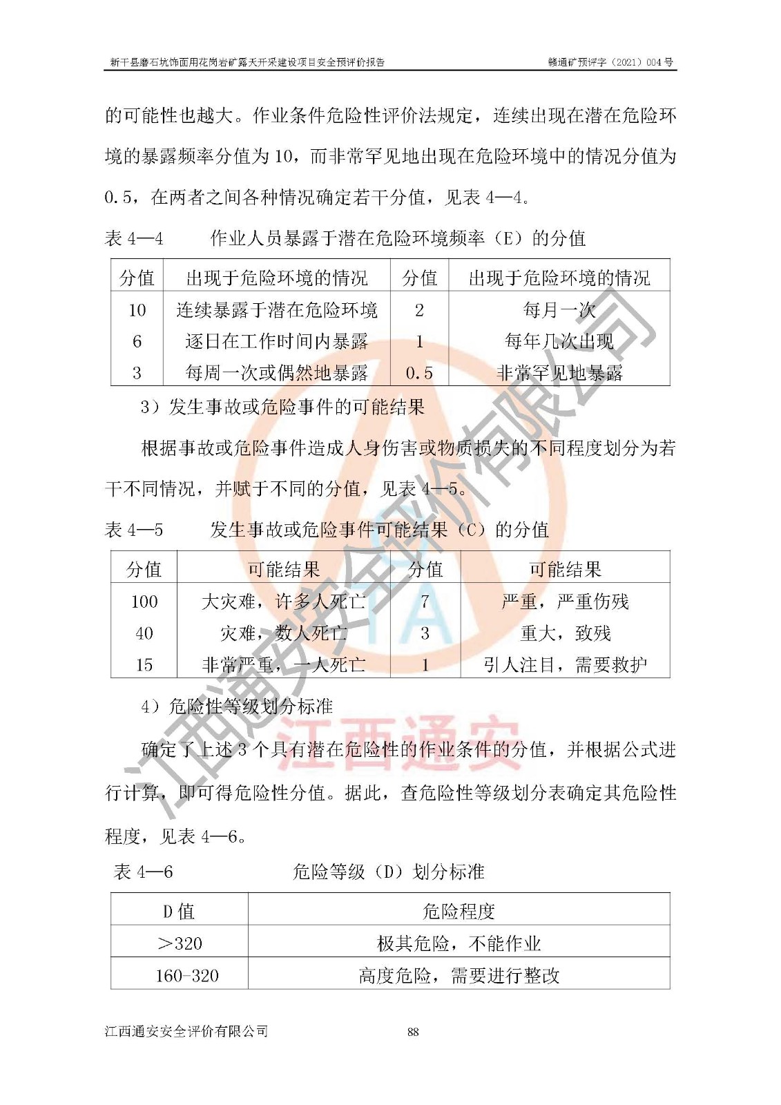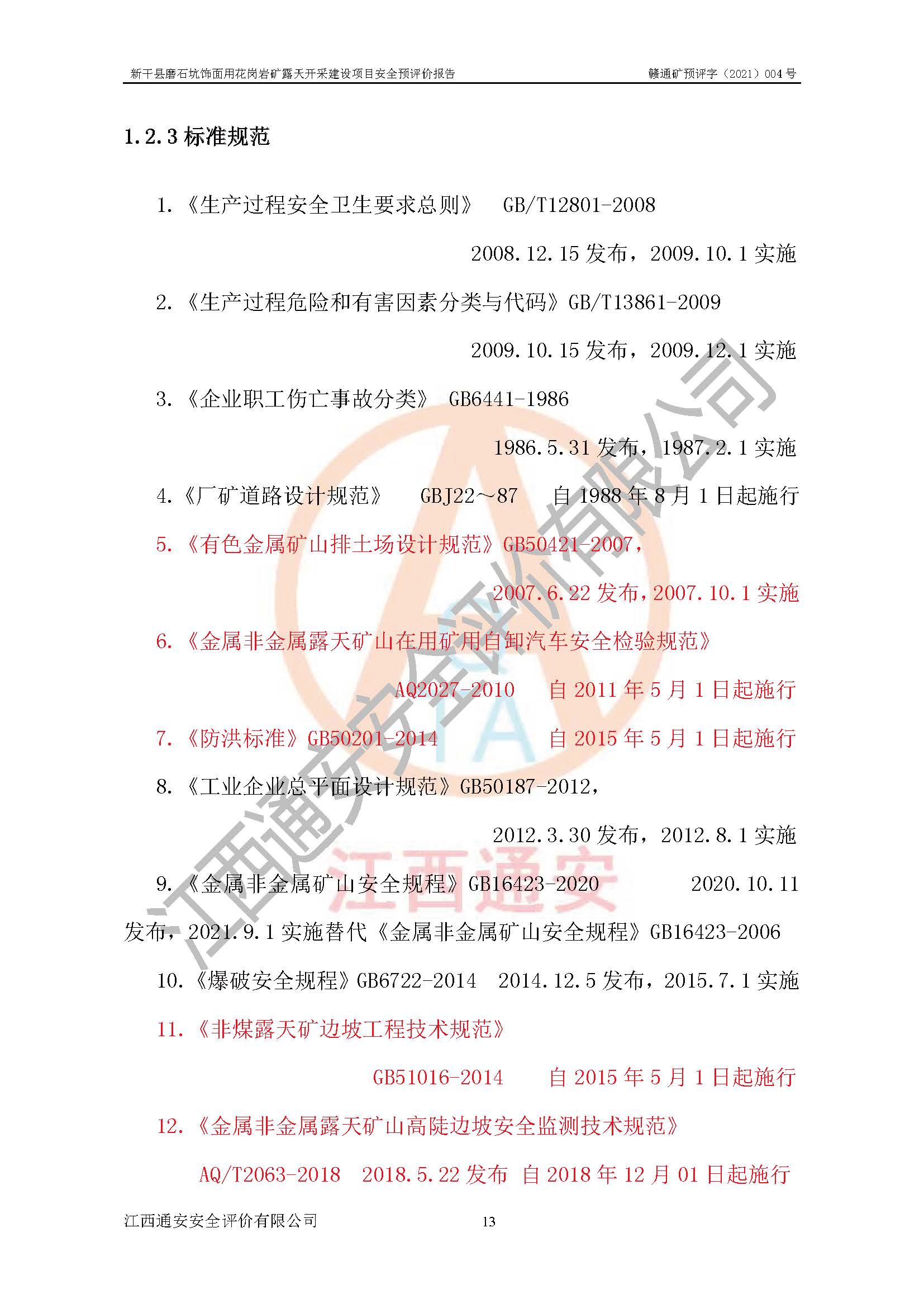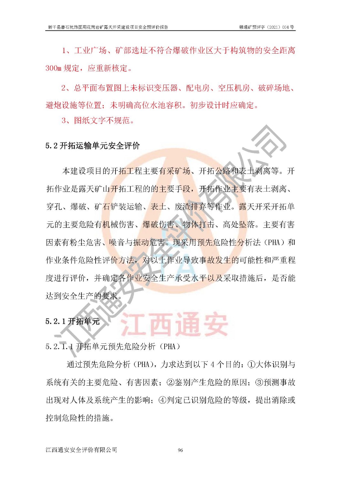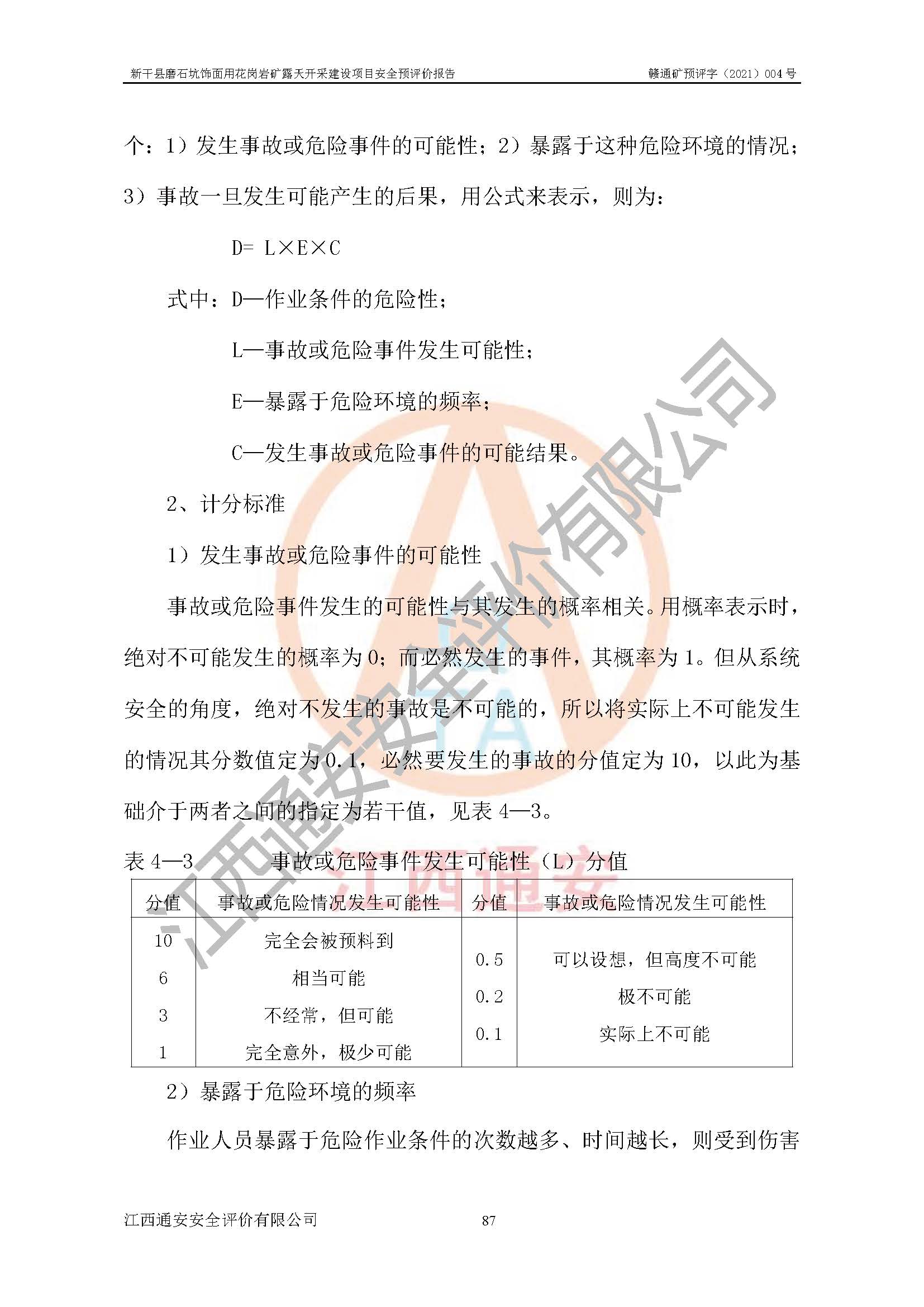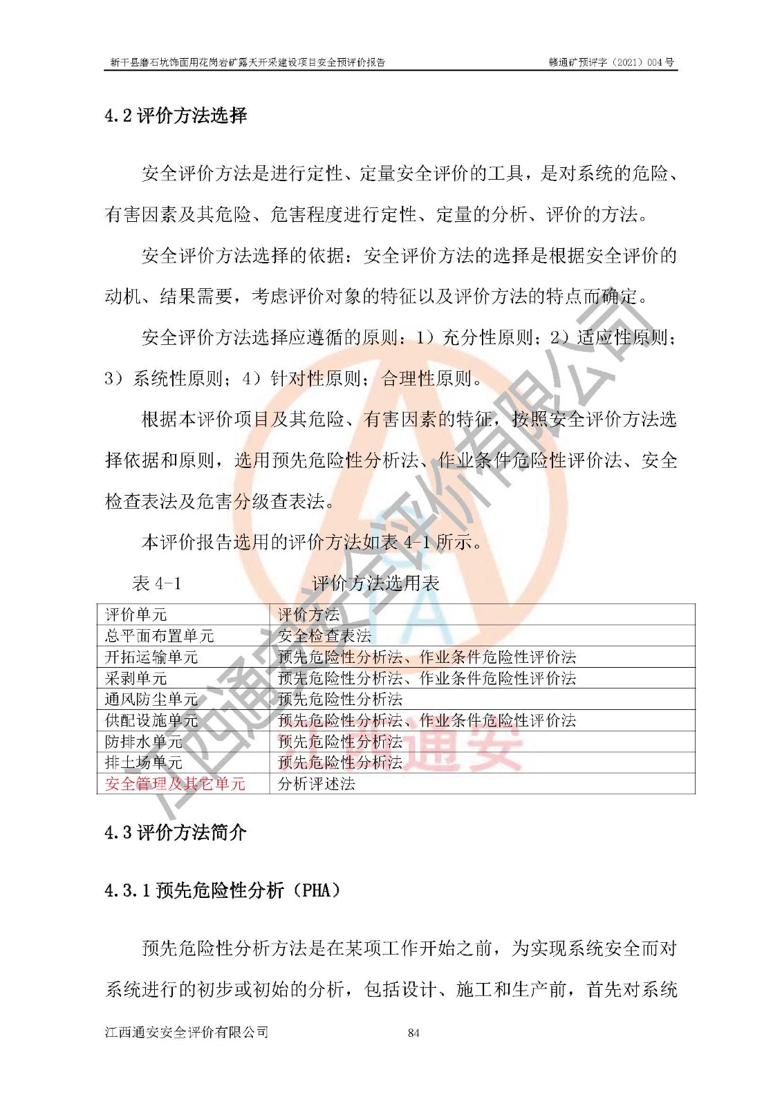 其它 | 安全預(yù)評價接受委托前,江西通安安全評價有限公司對該項目進行了風(fēng)險分析,分析結(jié)果結(jié)論為可接受安全預(yù)評價委托。接受安全預(yù)評價委托后,我公司發(fā)布了新干縣磨石坑飾面用花崗巖礦露天開采建設(shè)項目評價人員任命書。項目負(fù)責(zé)人及項目組成員編制了安全評價項目工作計劃。 為了**安全預(yù)評價的科學(xué)性、公正性和嚴(yán)肅性,我公司于2021年4月1日、4月20日組織安全評價組人員對新干縣磨石坑飾面用花崗巖礦露天開采建設(shè)項目的現(xiàn)場周邊環(huán)境進行勘察,并收集了與安全生產(chǎn)相關(guān)的法律、法規(guī)、技術(shù)標(biāo)準(zhǔn)和《江西省新干縣磨石坑礦區(qū)飾面花崗巖礦資源儲量核實報告》、《新干縣磨石坑飾面用花崗巖礦礦產(chǎn)資源開發(fā)利用、地質(zhì)環(huán)境保護與土地復(fù)墾方案》等建設(shè)項目資料,按照《**安全監(jiān)管總局關(guān)于印發(fā)金屬非金屬礦山建設(shè)項目安全評價報告編寫提綱的通知》(安監(jiān)總管一[2016]49號)及《金屬非金屬露天礦山建設(shè)項目安全預(yù)評價報告編寫提綱》的要求編制本預(yù)評價報告,為安全設(shè)施設(shè)計及安全生產(chǎn)監(jiān)督管理部門實施綜合監(jiān)管提供依據(jù)。 本安全預(yù)評價報告認(rèn)為:新干縣磨石坑飾面用花崗巖礦露天開采建設(shè)項目內(nèi)部場地及外部周邊環(huán)境一般,交通及通訊較為便利,便于露天開采。本建設(shè)項目相關(guān)證照合法**;相關(guān)資料、圖紙對項目今后的建設(shè)和生產(chǎn)具有**的指導(dǎo)意義;新干縣磨石坑飾面用花崗巖礦露天開采建設(shè)項目對公共安全無大的影響;存在的主要危險、有害因素是完全可以預(yù)防和控制的。 | ||||