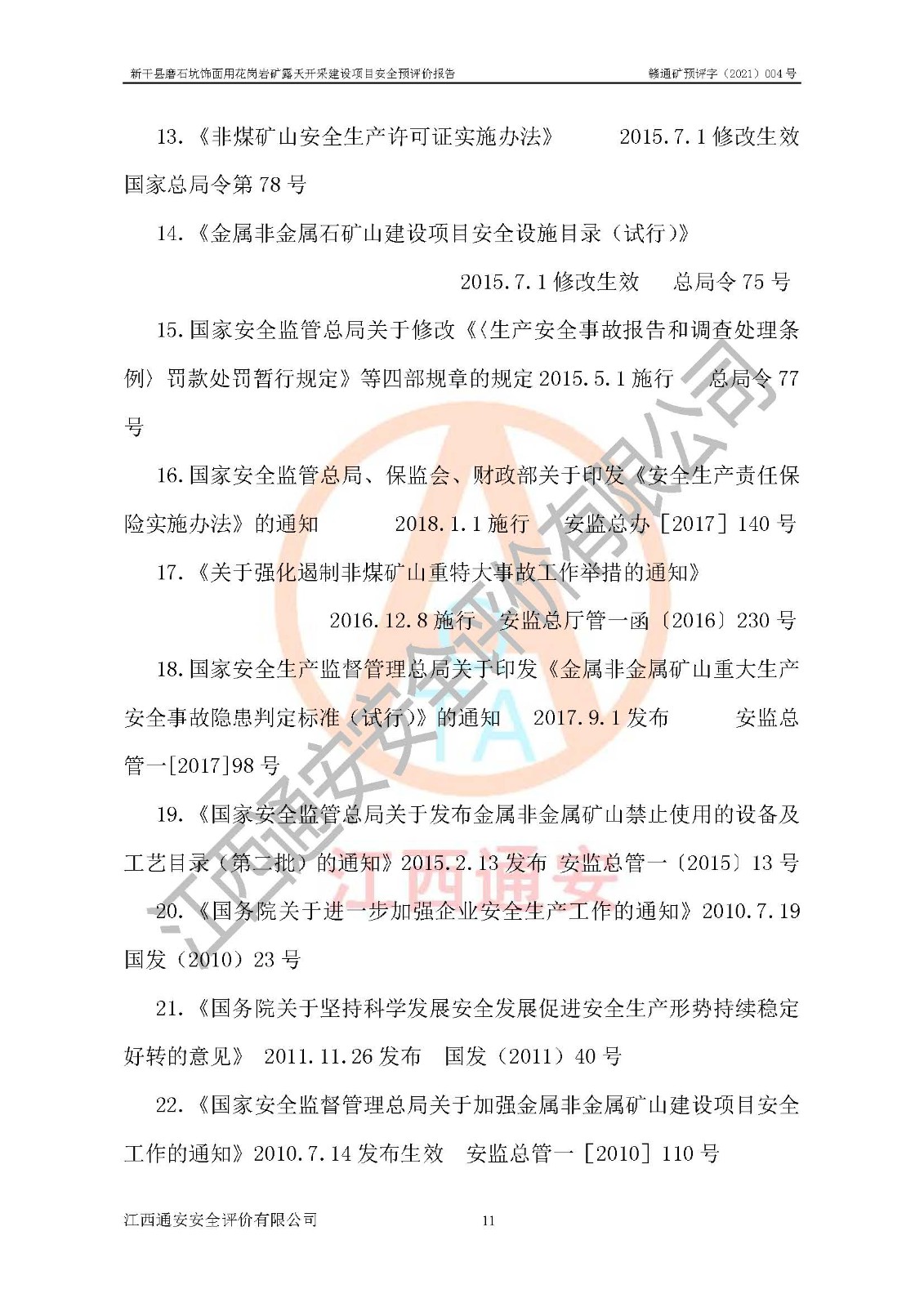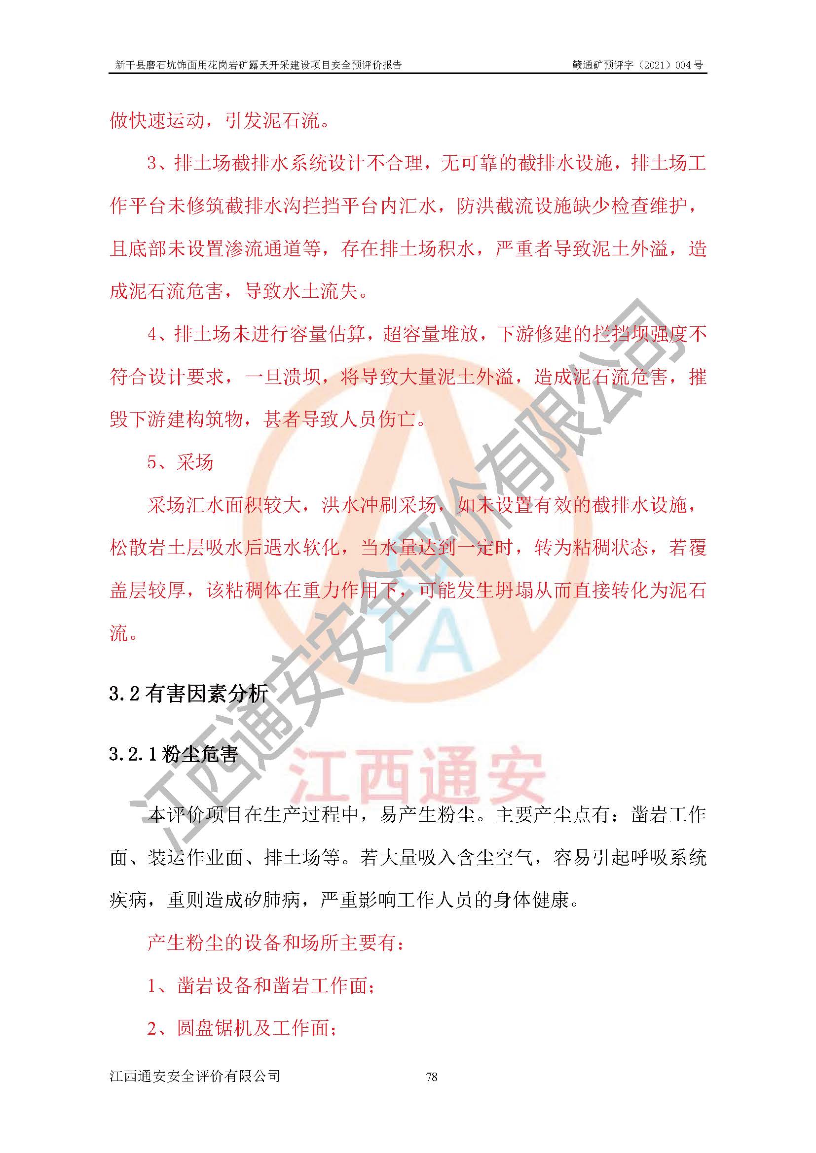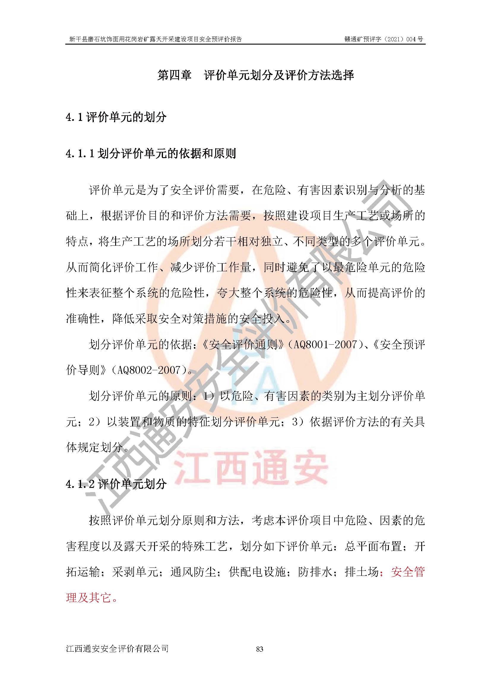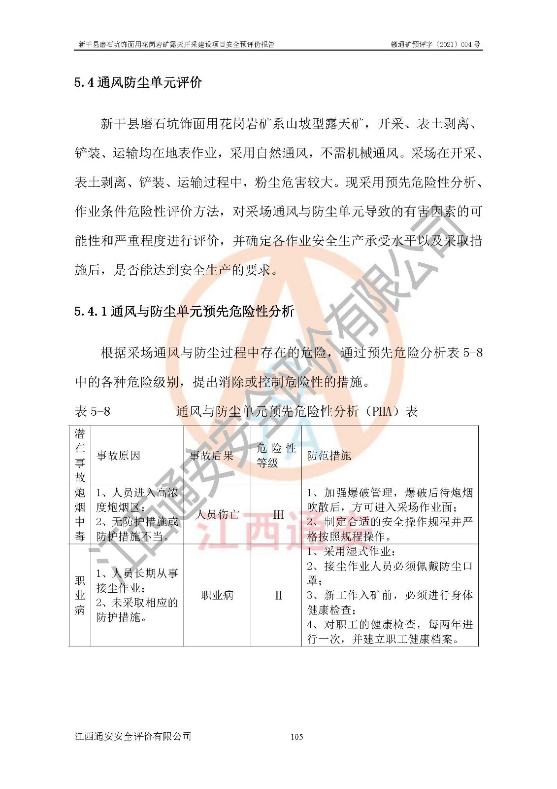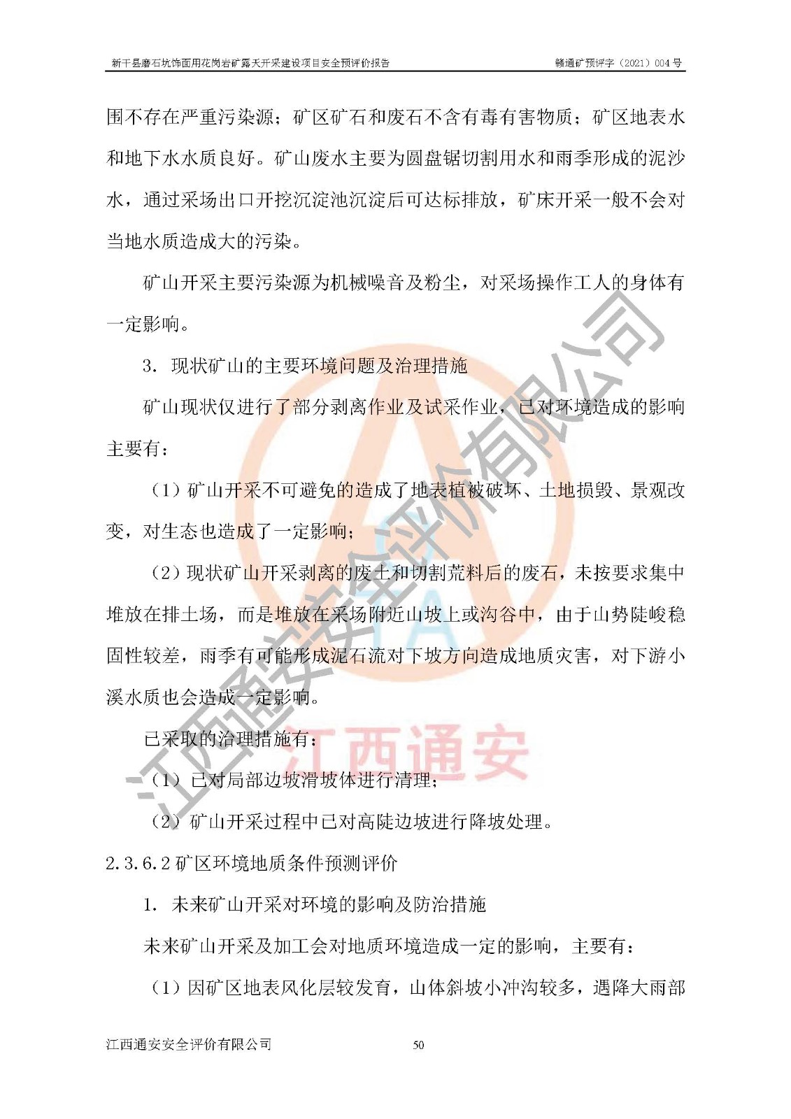 其它 | 安全預(yù)評價接受委托前,江西通安安全評價有限公司對該項目進行了風(fēng)險分析,分析結(jié)果結(jié)論為可接受安全預(yù)評價委托。接受安全預(yù)評價委托后,我公司發(fā)布了新干縣磨石坑飾面用花崗巖礦露天開采建設(shè)項目評價人員任命書。項目負(fù)責(zé)人及項目組成員編制了安全評價項目工作計劃。 為了**安全預(yù)評價的科學(xué)性、公正性和嚴(yán)肅性,我公司于2021年4月1日、4月20日組織安全評價組人員對新干縣磨石坑飾面用花崗巖礦露天開采建設(shè)項目的現(xiàn)場周邊環(huán)境進行勘察,并收集了與安全生產(chǎn)相關(guān)的法律、法規(guī)、技術(shù)標(biāo)準(zhǔn)和《江西省新干縣磨石坑礦區(qū)飾面花崗巖礦資源儲量核實報告》、《新干縣磨石坑飾面用花崗巖礦礦產(chǎn)資源開發(fā)利用、地質(zhì)環(huán)境保護與土地復(fù)墾方案》等建設(shè)項目資料,按照《**安全監(jiān)管總局關(guān)于印發(fā)金屬非金屬礦山建設(shè)項目安全評價報告編寫提綱的通知》(安監(jiān)總管一[2016]49號)及《金屬非金屬露天礦山建設(shè)項目安全預(yù)評價報告編寫提綱》的要求編制本預(yù)評價報告,為安全設(shè)施設(shè)計及安全生產(chǎn)監(jiān)督管理部門實施綜合監(jiān)管提供依據(jù)。 本安全預(yù)評價報告認(rèn)為:新干縣磨石坑飾面用花崗巖礦露天開采建設(shè)項目內(nèi)部場地及外部周邊環(huán)境一般,交通及通訊較為便利,便于露天開采。本建設(shè)項目相關(guān)證照合法**;相關(guān)資料、圖紙對項目今后的建設(shè)和生產(chǎn)具有**的指導(dǎo)意義;新干縣磨石坑飾面用花崗巖礦露天開采建設(shè)項目對公共安全無大的影響;存在的主要危險、有害因素是完全可以預(yù)防和控制的。 | ||||