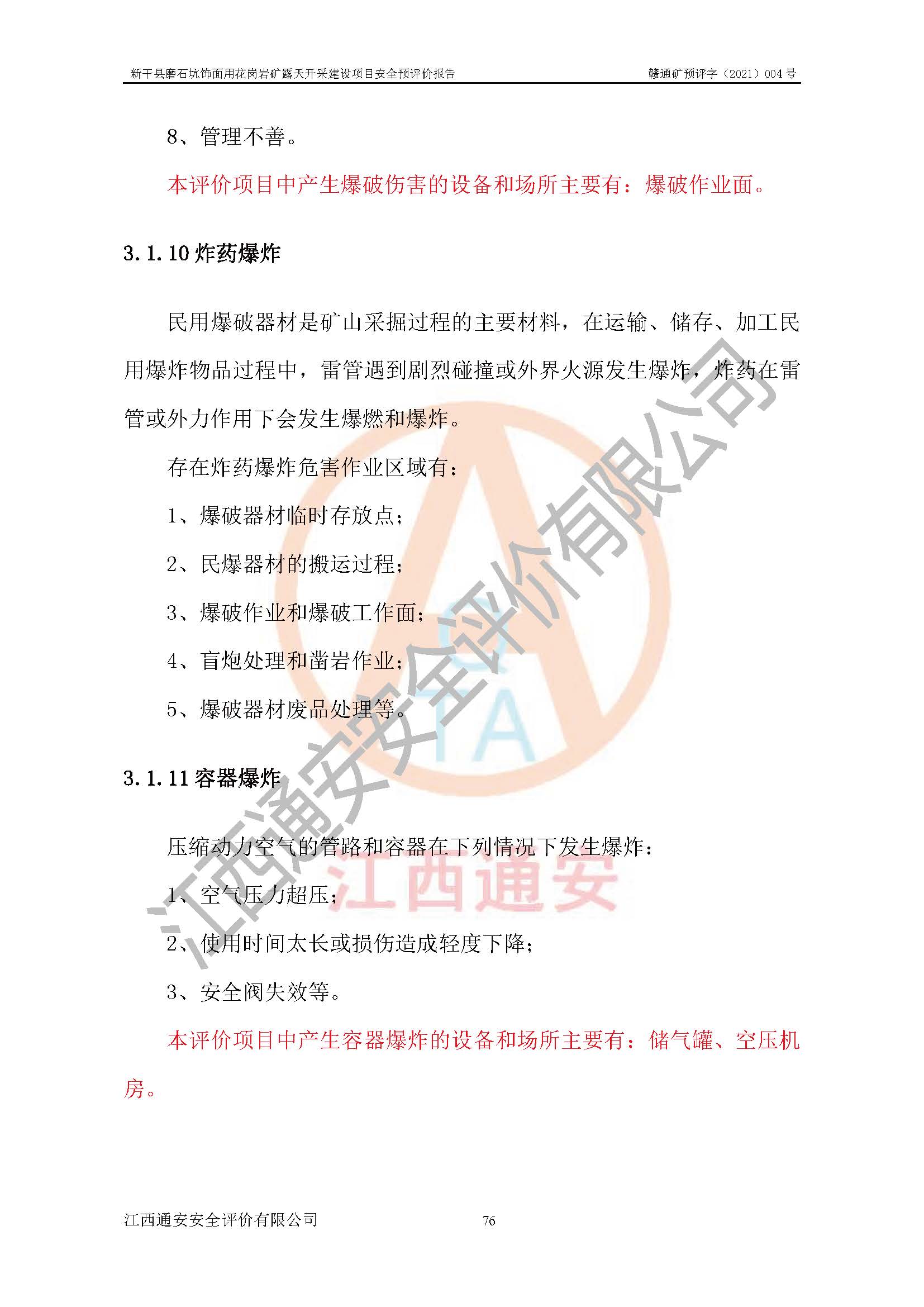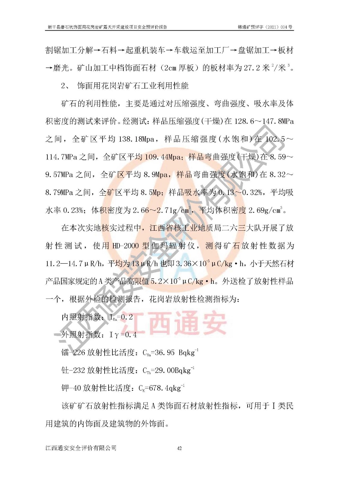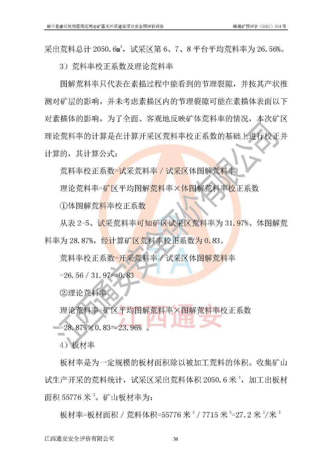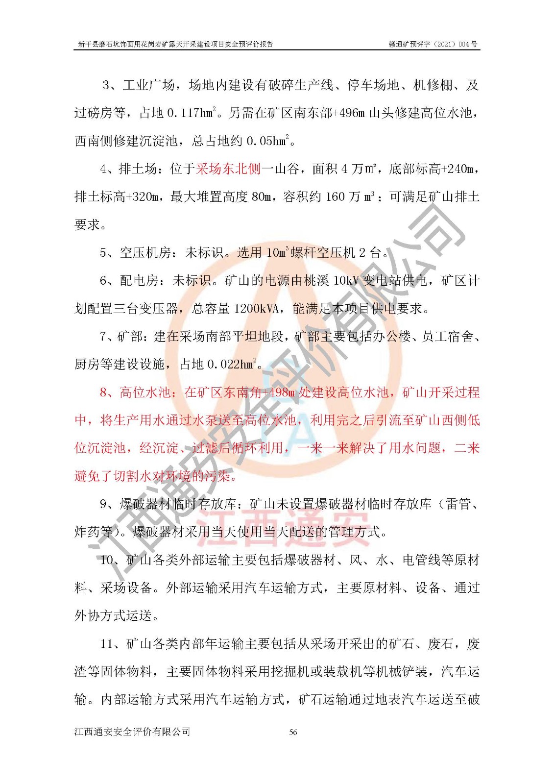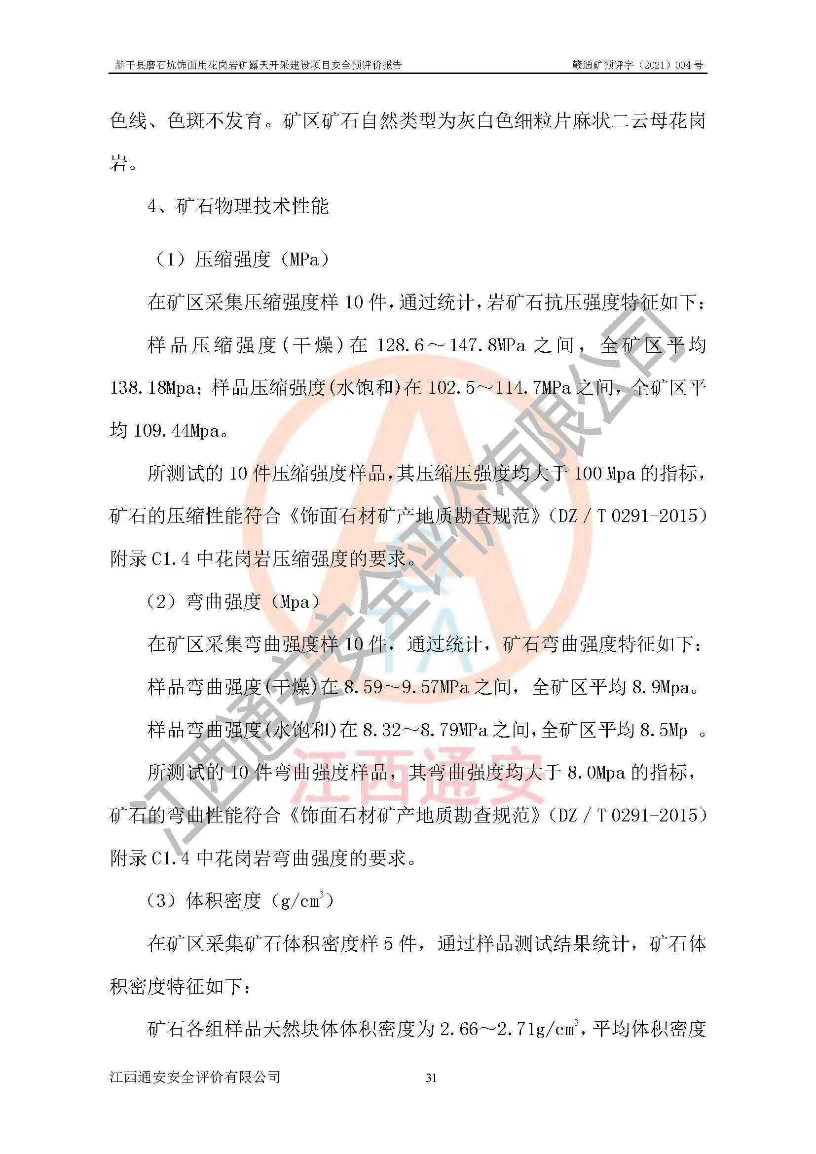 其它 | 安全預(yù)評價接受委托前,江西通安安全評價有限公司對該項目進行了風(fēng)險分析,分析結(jié)果結(jié)論為可接受安全預(yù)評價委托。接受安全預(yù)評價委托后,我公司發(fā)布了新干縣磨石坑飾面用花崗巖礦露天開采建設(shè)項目評價人員任命書。項目負(fù)責(zé)人及項目組成員編制了安全評價項目工作計劃。 為了**安全預(yù)評價的科學(xué)性、公正性和嚴(yán)肅性,我公司于2021年4月1日、4月20日組織安全評價組人員對新干縣磨石坑飾面用花崗巖礦露天開采建設(shè)項目的現(xiàn)場周邊環(huán)境進行勘察,并收集了與安全生產(chǎn)相關(guān)的法律、法規(guī)、技術(shù)標(biāo)準(zhǔn)和《江西省新干縣磨石坑礦區(qū)飾面花崗巖礦資源儲量核實報告》、《新干縣磨石坑飾面用花崗巖礦礦產(chǎn)資源開發(fā)利用、地質(zhì)環(huán)境保護與土地復(fù)墾方案》等建設(shè)項目資料,按照《**安全監(jiān)管總局關(guān)于印發(fā)金屬非金屬礦山建設(shè)項目安全評價報告編寫提綱的通知》(安監(jiān)總管一[2016]49號)及《金屬非金屬露天礦山建設(shè)項目安全預(yù)評價報告編寫提綱》的要求編制本預(yù)評價報告,為安全設(shè)施設(shè)計及安全生產(chǎn)監(jiān)督管理部門實施綜合監(jiān)管提供依據(jù)。 本安全預(yù)評價報告認(rèn)為:新干縣磨石坑飾面用花崗巖礦露天開采建設(shè)項目內(nèi)部場地及外部周邊環(huán)境一般,交通及通訊較為便利,便于露天開采。本建設(shè)項目相關(guān)證照合法**;相關(guān)資料、圖紙對項目今后的建設(shè)和生產(chǎn)具有**的指導(dǎo)意義;新干縣磨石坑飾面用花崗巖礦露天開采建設(shè)項目對公共安全無大的影響;存在的主要危險、有害因素是完全可以預(yù)防和控制的。 | ||||