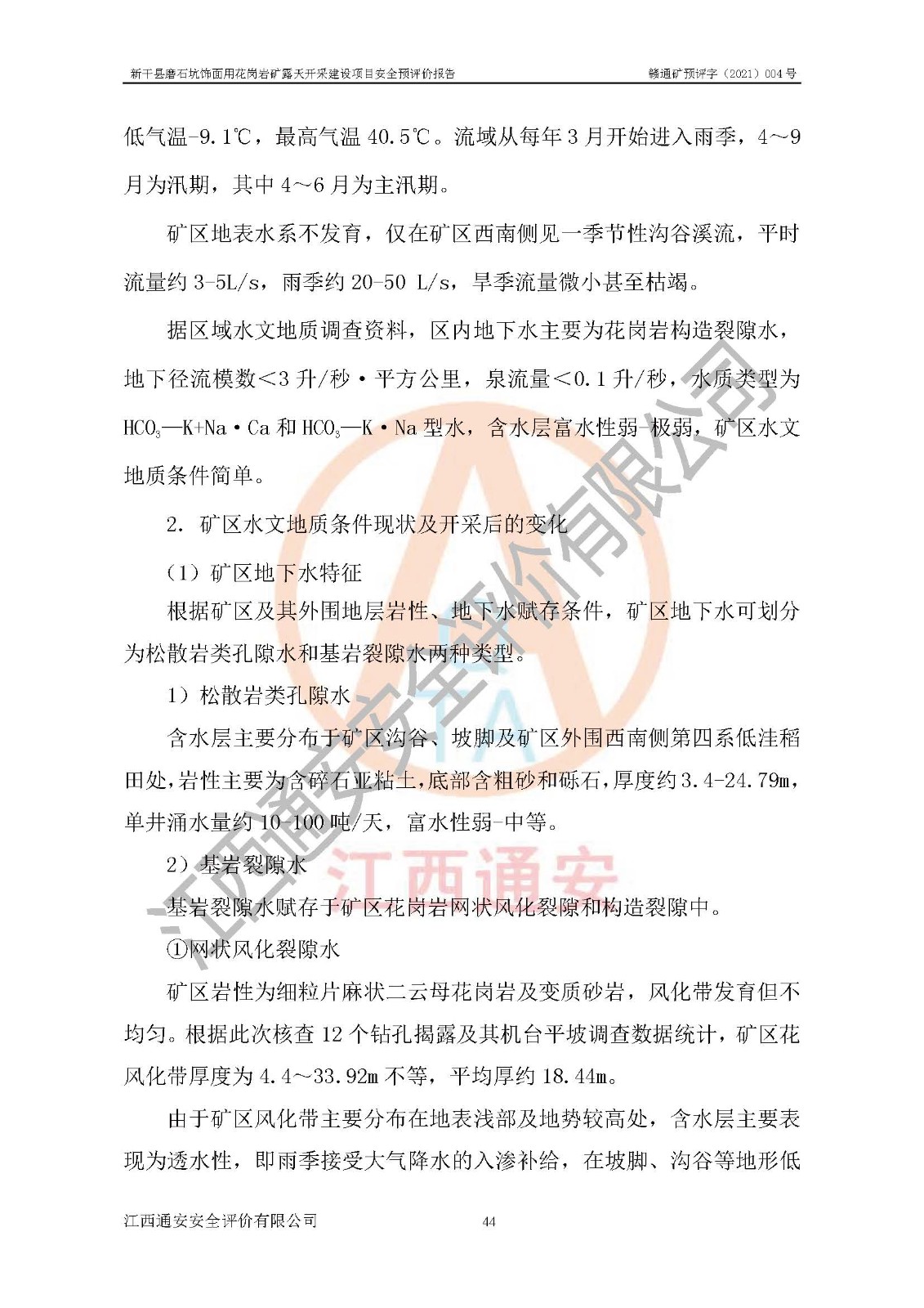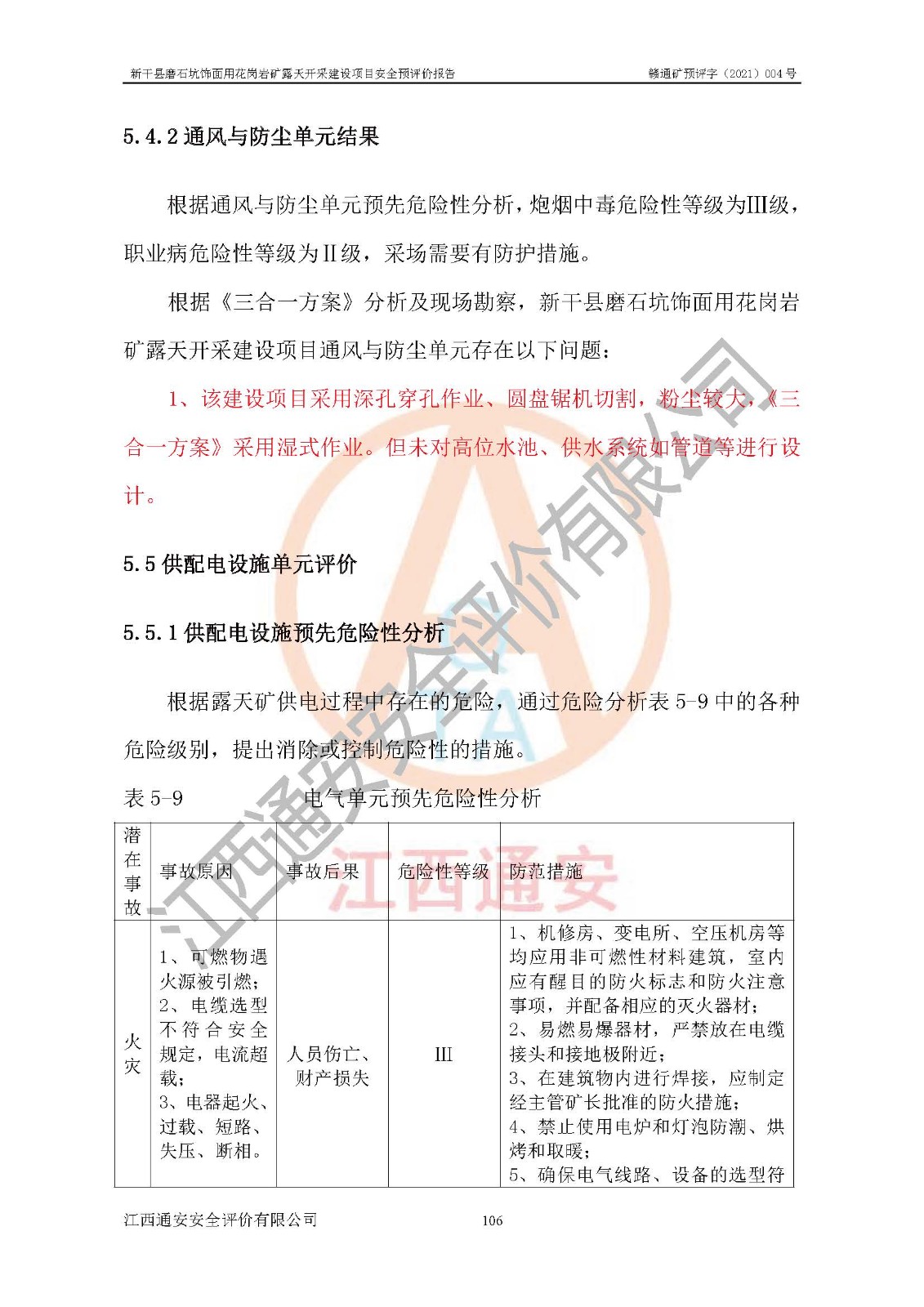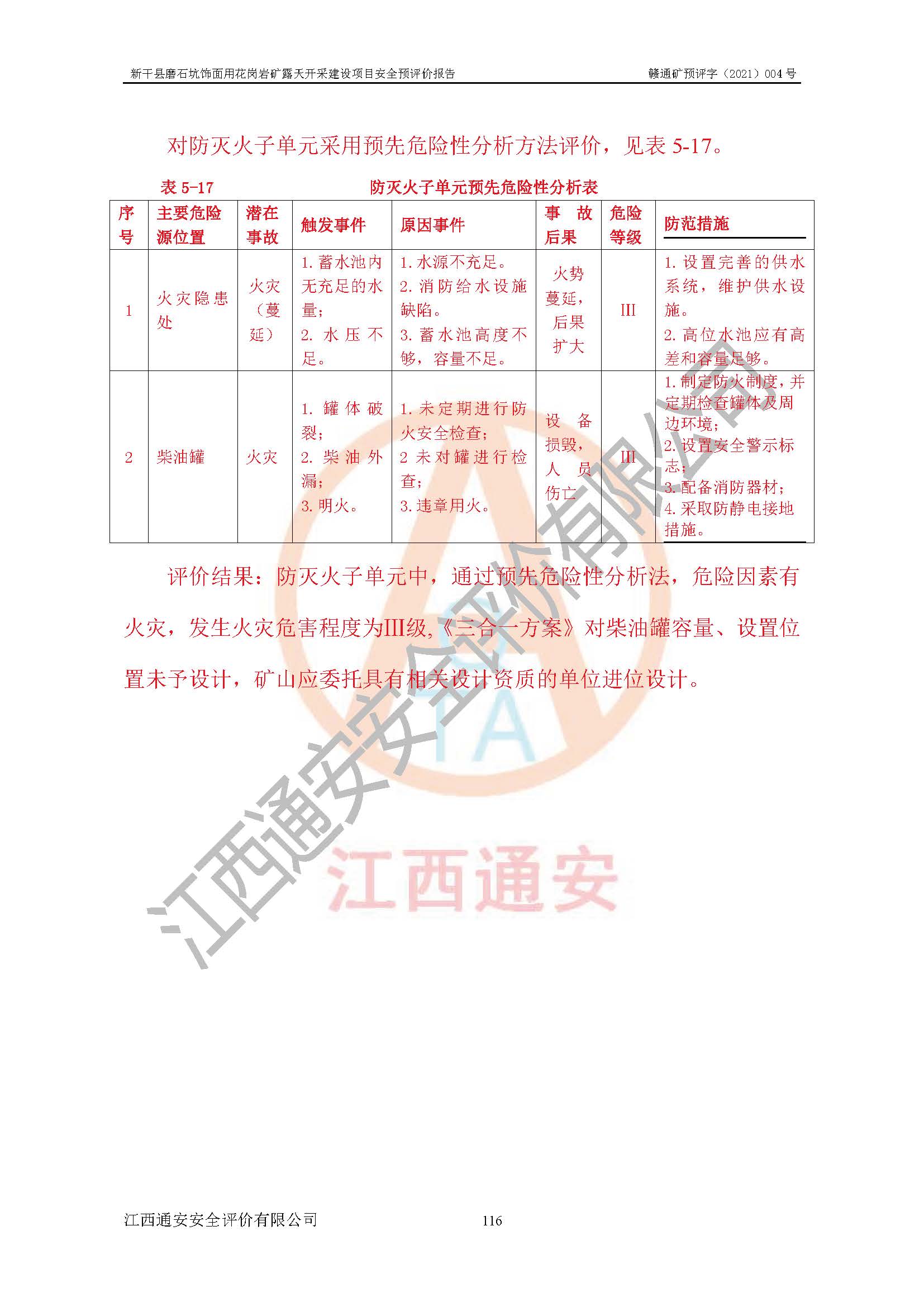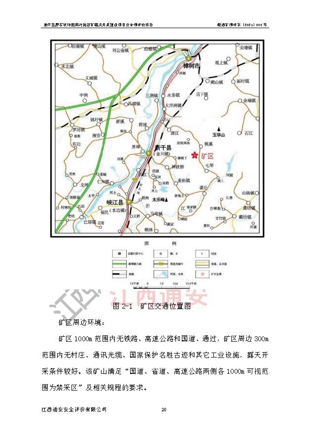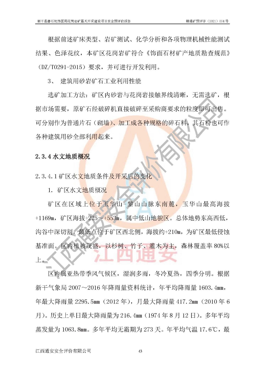 其它 | 安全預(yù)評價接受委托前,江西通安安全評價有限公司對該項目進行了風(fēng)險分析,分析結(jié)果結(jié)論為可接受安全預(yù)評價委托。接受安全預(yù)評價委托后,我公司發(fā)布了新干縣磨石坑飾面用花崗巖礦露天開采建設(shè)項目評價人員任命書。項目負(fù)責(zé)人及項目組成員編制了安全評價項目工作計劃。 為了**安全預(yù)評價的科學(xué)性、公正性和嚴(yán)肅性,我公司于2021年4月1日、4月20日組織安全評價組人員對新干縣磨石坑飾面用花崗巖礦露天開采建設(shè)項目的現(xiàn)場周邊環(huán)境進行勘察,并收集了與安全生產(chǎn)相關(guān)的法律、法規(guī)、技術(shù)標(biāo)準(zhǔn)和《江西省新干縣磨石坑礦區(qū)飾面花崗巖礦資源儲量核實報告》、《新干縣磨石坑飾面用花崗巖礦礦產(chǎn)資源開發(fā)利用、地質(zhì)環(huán)境保護與土地復(fù)墾方案》等建設(shè)項目資料,按照《**安全監(jiān)管總局關(guān)于印發(fā)金屬非金屬礦山建設(shè)項目安全評價報告編寫提綱的通知》(安監(jiān)總管一[2016]49號)及《金屬非金屬露天礦山建設(shè)項目安全預(yù)評價報告編寫提綱》的要求編制本預(yù)評價報告,為安全設(shè)施設(shè)計及安全生產(chǎn)監(jiān)督管理部門實施綜合監(jiān)管提供依據(jù)。 本安全預(yù)評價報告認(rèn)為:新干縣磨石坑飾面用花崗巖礦露天開采建設(shè)項目內(nèi)部場地及外部周邊環(huán)境一般,交通及通訊較為便利,便于露天開采。本建設(shè)項目相關(guān)證照合法**;相關(guān)資料、圖紙對項目今后的建設(shè)和生產(chǎn)具有**的指導(dǎo)意義;新干縣磨石坑飾面用花崗巖礦露天開采建設(shè)項目對公共安全無大的影響;存在的主要危險、有害因素是完全可以預(yù)防和控制的。 | ||||