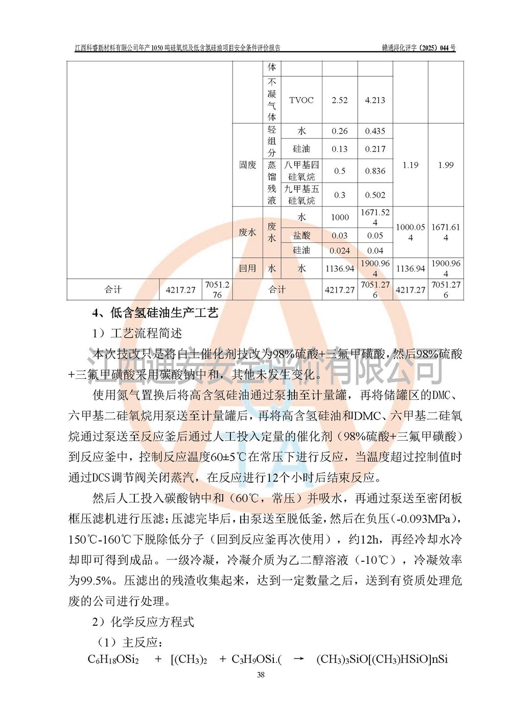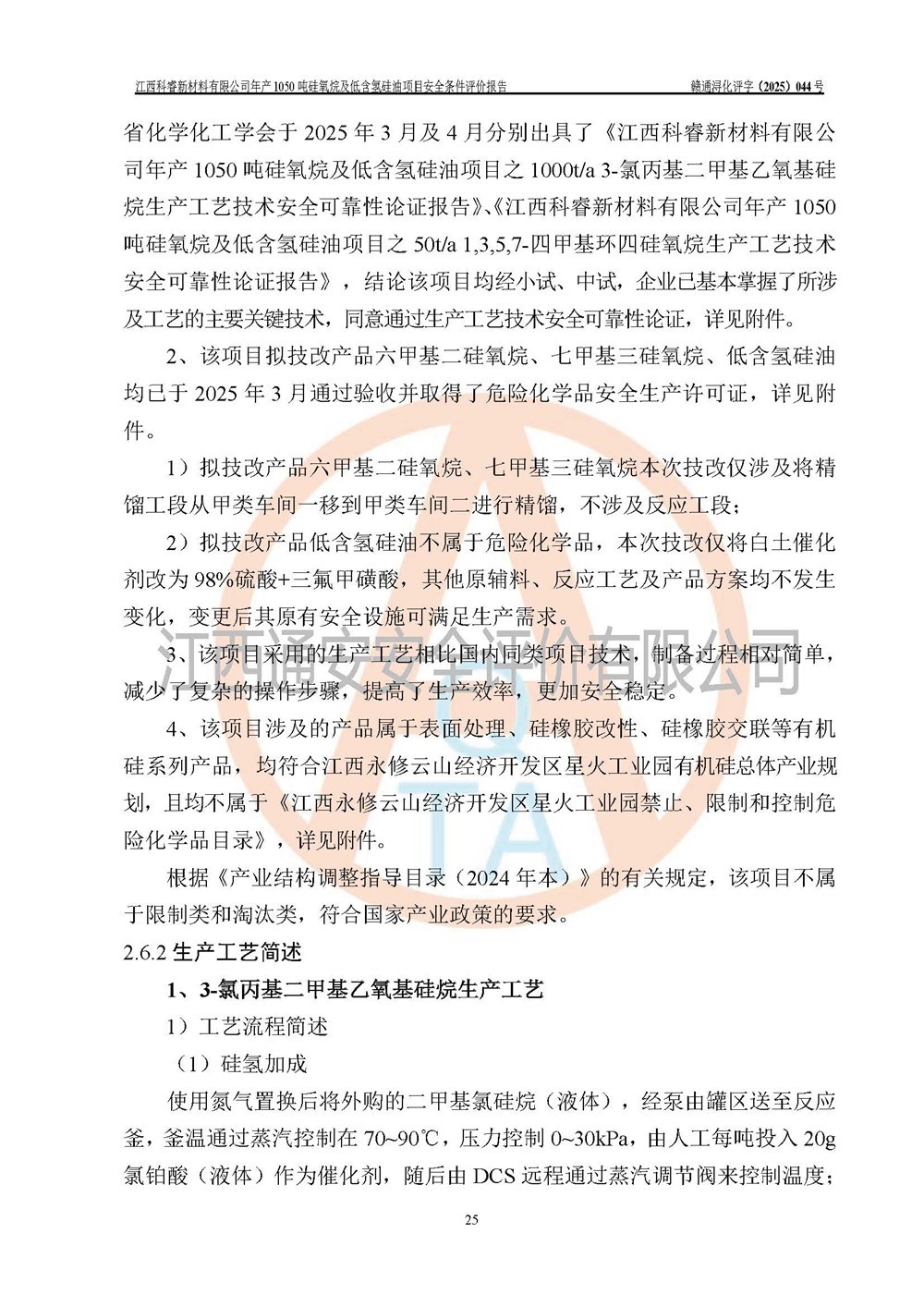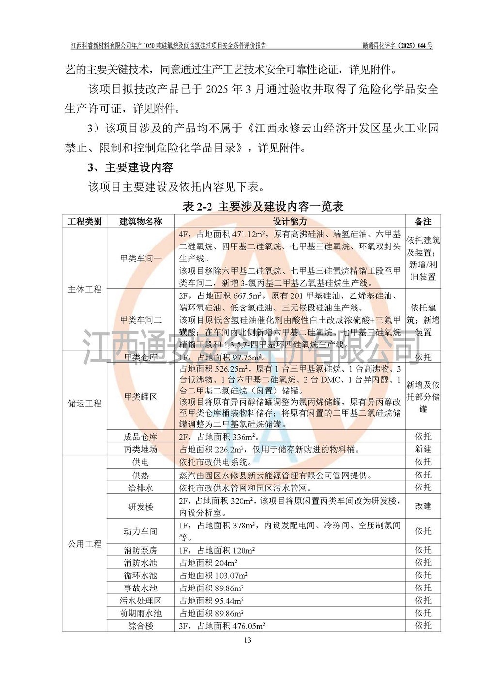 項(xiàng)目簡(jiǎn)介 | 江西科睿新材料有限公司位于江西省永修縣云山經(jīng)濟(jì)開(kāi)發(fā)區(qū)星火工業(yè)園希望大道7號(hào),于2014年02月19日在永修縣市場(chǎng)監(jiān)督管理局注冊(cè)成立,注冊(cè)資本為2000(萬(wàn)元),主要經(jīng)營(yíng)一般項(xiàng)目:有機(jī)硅產(chǎn)品的生產(chǎn)、銷售(危險(xiǎn)化學(xué)品除外);進(jìn)出口業(yè)務(wù)(以上經(jīng)營(yíng)項(xiàng)目**有專項(xiàng)規(guī)定的憑許可證、資質(zhì)證、批文經(jīng)營(yíng))。 為滿足企業(yè)內(nèi)部及市場(chǎng)需求擬再投資1215.94萬(wàn)元在現(xiàn)有廠區(qū)內(nèi)建設(shè)年產(chǎn)1050噸硅氧烷及低含氫硅油項(xiàng)目,具體包括1000t/a 3-氯丙基二甲基乙氧基硅烷(新增)、50t/a 1,3,5,7-四甲基環(huán)四硅氧烷(新增)、800t/a六甲基二硅氧烷(技改)、200t/a七甲基三硅氧烷(技改)、1000t/a低含氫硅油(技改)。 | |||||