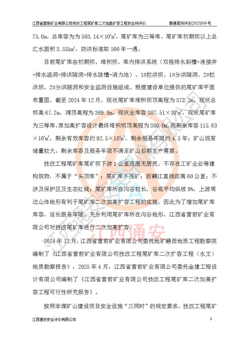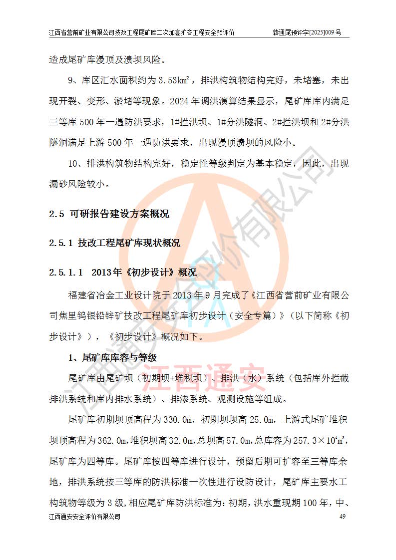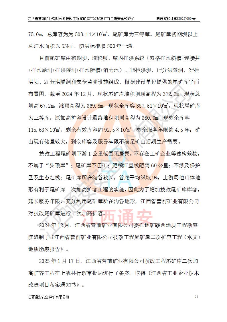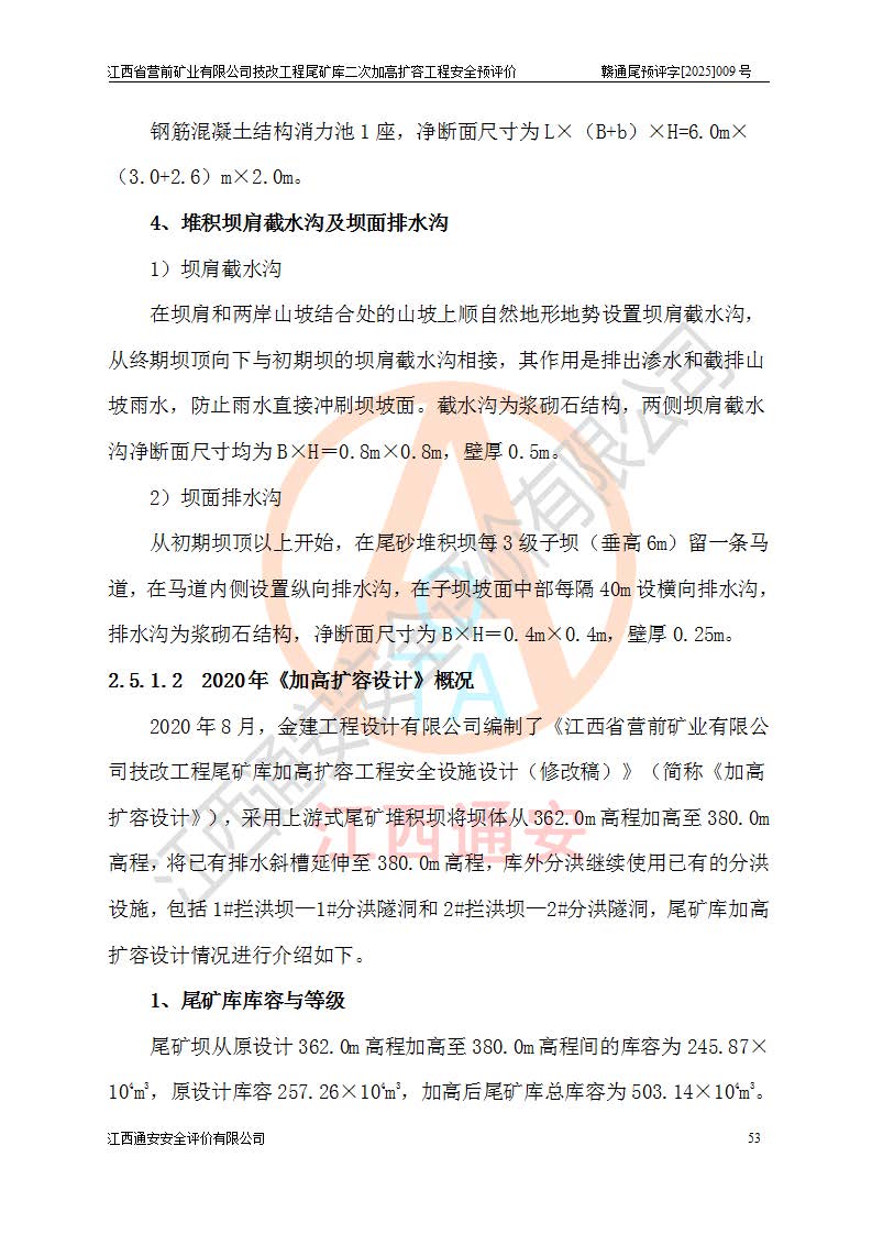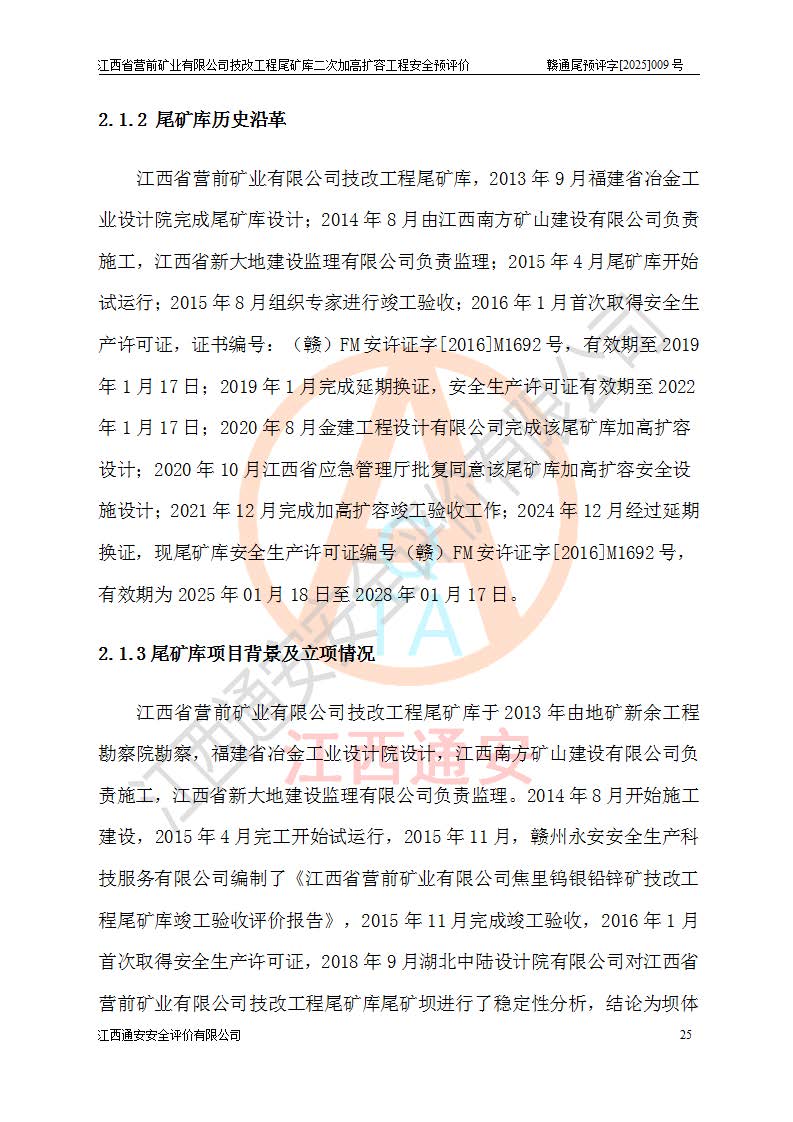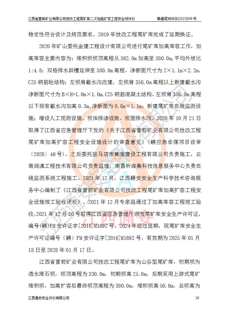 江西省營前礦業(yè)有限公司于2003年12月16日成立,位于贛州市上猶縣營前鎮(zhèn)焦里村境內(nèi),公司注冊資本10000萬元,法定**人陳雅博,礦區(qū)地理坐標(biāo):東經(jīng)114°18′30″~114°19′00″,北緯25°52′35″~25°53′47″。公司經(jīng)營范圍包括:鉛礦、鋅、鎢、銀地下開采、銷售。 江西省營前礦業(yè)有限公司技改工程尾礦庫位于焦里鎢銀鉛鋅礦區(qū),處于上猶縣水巖鄉(xiāng)井子村坑尾自然村境內(nèi),為山谷型尾礦庫。 江西省營前礦業(yè)有限公司技改工程尾礦庫于2013年由福建省冶金工業(yè)設(shè)計(jì)院設(shè)計(jì),2014年8月開始施工建設(shè),2015年4月竣工開始試運(yùn)行,2015年11月完成竣工驗(yàn)收,2016年1月首次取得安全生產(chǎn)許可證,2019年1月完成延期換證,2020年8月委托金建工程設(shè)計(jì)有限公司進(jìn)行尾礦庫加高擴(kuò)容工作,2020年10月21日取得了江西省應(yīng)急管理廳下發(fā)的《關(guān)于江西省營前礦業(yè)有限公司技改工程尾礦庫加高擴(kuò)容工程安全設(shè)施設(shè)計(jì)的審查意見》(贛應(yīng)急非煤項(xiàng)目設(shè)審〔2020〕46號),之后委托駐馬店市黃淮建設(shè)工程有限公司負(fù)責(zé)施工,云南潤滇工程技術(shù)有限公司負(fù)責(zé)監(jiān)理,2021年12月完成加高擴(kuò)容竣工驗(yàn)收工作,經(jīng)過延期,現(xiàn)尾礦庫安全生產(chǎn)許可證編號(贛)FM安許證字[2016]M1692號,**期為2025年01月18日至2028年01月17日。 江西省營前礦業(yè)有限公司技改工程尾礦庫為山谷型尾礦庫,初期壩為透水堆石壩,壩頂高程為330.0m,初期壩高25.0m,后期采用上游式尾礦堆積壩,加高擴(kuò)容后*終壩頂高程為380.0m,堆積壩高50.0m,總壩高為75.0m,總庫容為為503.14×104m3,尾礦庫為三等庫。尾礦庫初期壩以上總匯水面積3.53km2,防洪標(biāo)準(zhǔn)取500年一遇。 目前尾礦庫由初期壩、堆積壩、庫內(nèi)排洪系統(tǒng)(雙格排水斜槽+連接井+排水涵洞+排洪隧洞+排水陡槽+消力池)、1#攔洪壩、1#分洪隧洞、2#攔洪壩、2#分洪隧洞和安全監(jiān)測設(shè)施組成。根據(jù)建設(shè)單位提供的尾礦庫平面布置圖,截至2024年12月,現(xiàn)狀尾礦庫堆積壩頂高程為372.2m,現(xiàn)狀總壩高67.2m,灘頂高程為369.8m,現(xiàn)狀全庫容387.51×104m3,現(xiàn)狀尾礦庫為三等庫,原加高擴(kuò)容設(shè)計(jì)*終堆積壩頂高程為380.0m,現(xiàn)剩余庫容115.63×104m3,剩余**庫容約92.5×104m3,剩余服務(wù)年限約4.5年;礦山現(xiàn)有儲(chǔ)量較大,剩余庫容及服務(wù)年限不滿足礦山后期生產(chǎn)需要。 技改工程尾礦庫尾礦壩下游1**范圍無居民,不存在工礦企業(yè)等建構(gòu)筑物,不屬于“頭頂庫”;尾礦庫不壓礦;距贛江直線距離60**;不涉及保護(hù)區(qū)及生態(tài)紅線;尾礦庫所在溝谷較長,谷底平均縱坡9%,上游周邊山體地形有利于尾礦庫二次加高擴(kuò)容工程的實(shí)施,因此為了增加尾礦庫庫容,延長服務(wù)年限,充分利用尾礦庫所在溝谷地形,江西省營前礦業(yè)有限公司對技改尾礦庫進(jìn)行二次加高擴(kuò)容。 2024年12月,江西省營前礦業(yè)有限公司委托地礦贛西地質(zhì)工程勘察院編制了《江西省營前礦業(yè)有限公司技改工程尾礦庫二次擴(kuò)容工程(水文)地質(zhì)勘察報(bào)告》,2025年4月,江西省營前礦業(yè)有限公司委托金建工程設(shè)計(jì)有限公司編制了《江西省營前礦業(yè)有限公司技改工程尾礦庫二次加高擴(kuò)容工程可行性研究報(bào)告》。 按照非煤礦山建設(shè)項(xiàng)目安全設(shè)施“三同時(shí)”的規(guī)定要求,技改工程尾礦庫為二次加高擴(kuò)容工程,**進(jìn)行安全預(yù)評價(jià);江西省營前礦業(yè)有限公司委托我公司承擔(dān)技改工程尾礦庫二次加高擴(kuò)容工程建設(shè)項(xiàng)目的安全預(yù)評價(jià)工作。 |