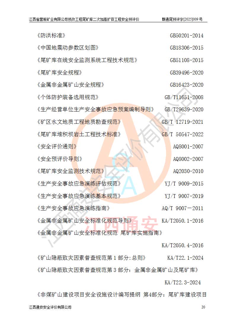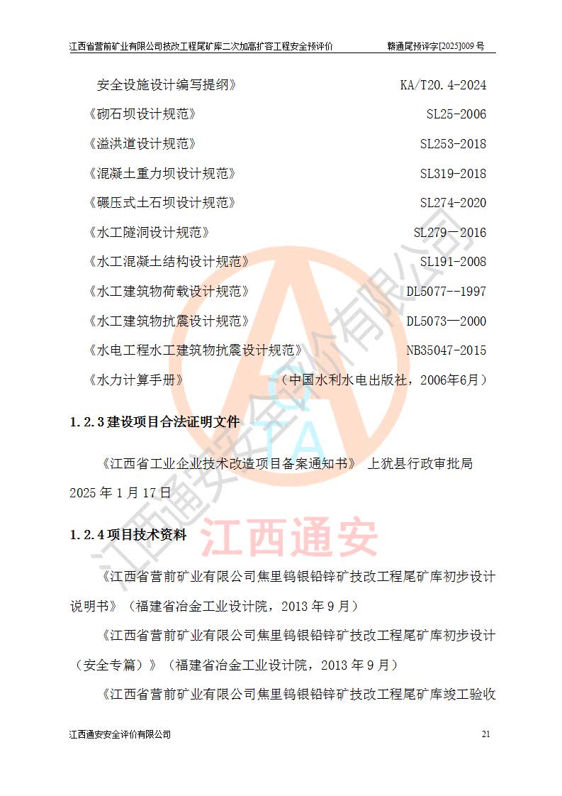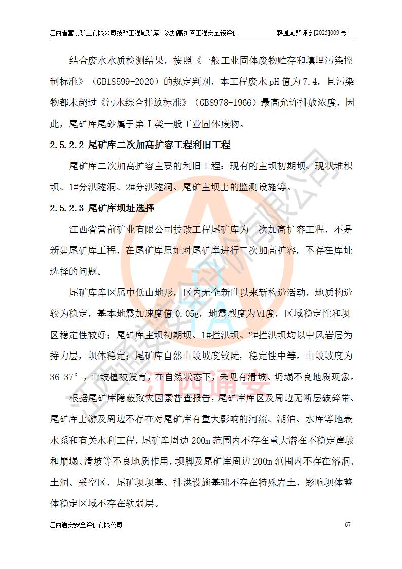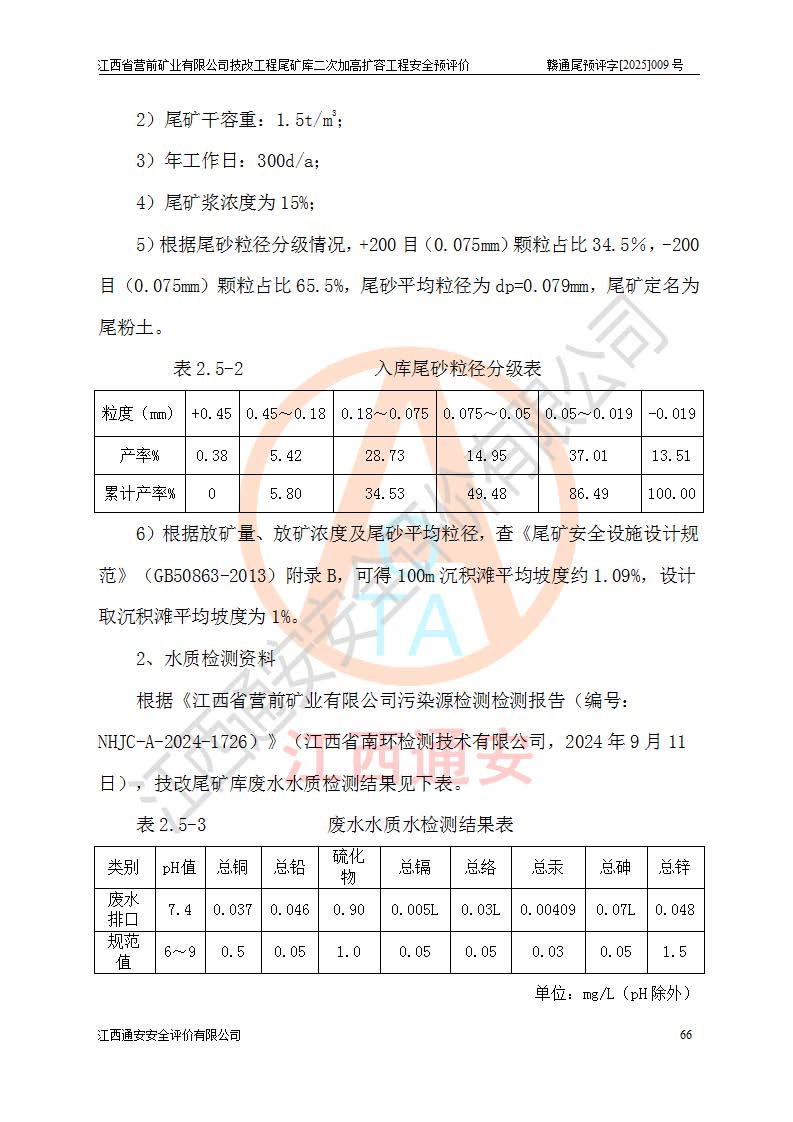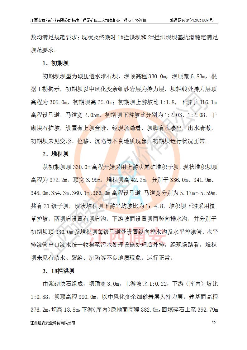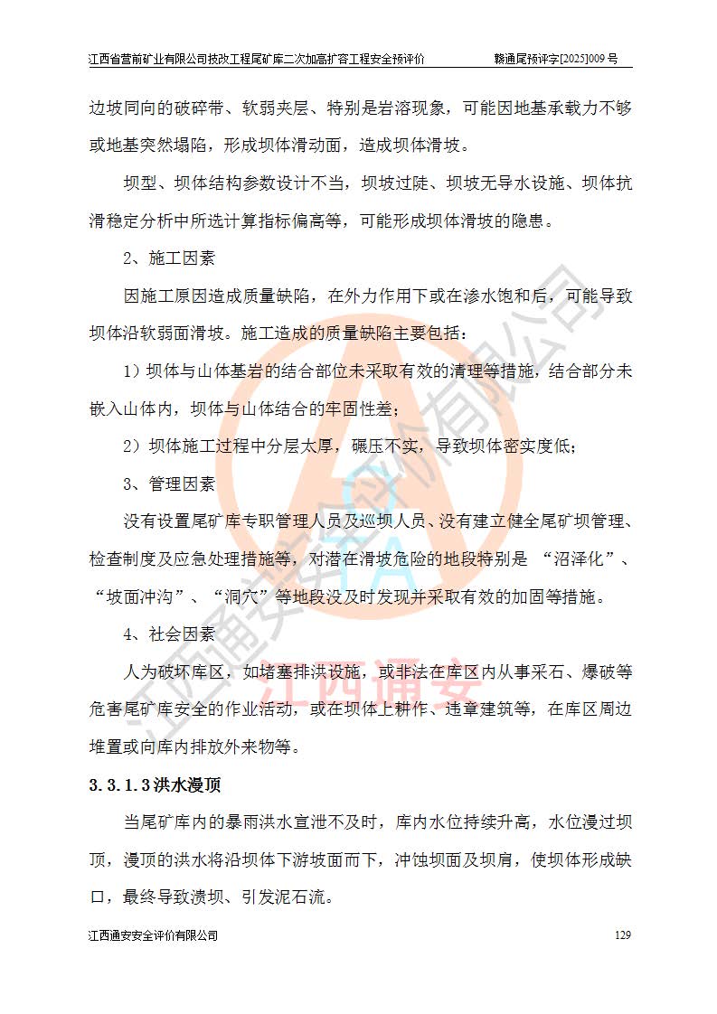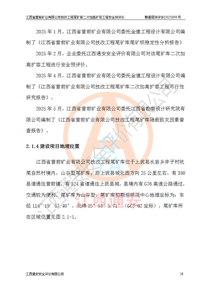 江西省營前礦業(yè)有限公司于2003年12月16日成立,位于贛州市上猶縣營前鎮(zhèn)焦里村境內(nèi),公司注冊資本10000萬元,法定**人陳雅博,礦區(qū)地理坐標(biāo):東經(jīng)114°18′30″~114°19′00″,北緯25°52′35″~25°53′47″。公司經(jīng)營范圍包括:鉛礦、鋅、鎢、銀地下開采、銷售。 江西省營前礦業(yè)有限公司技改工程尾礦庫位于焦里鎢銀鉛鋅礦區(qū),處于上猶縣水巖鄉(xiāng)井子村坑尾自然村境內(nèi),為山谷型尾礦庫。 江西省營前礦業(yè)有限公司技改工程尾礦庫于2013年由福建省冶金工業(yè)設(shè)計(jì)院設(shè)計(jì),2014年8月開始施工建設(shè),2015年4月竣工開始試運(yùn)行,2015年11月完成竣工驗(yàn)收,2016年1月首次取得安全生產(chǎn)許可證,2019年1月完成延期換證,2020年8月委托金建工程設(shè)計(jì)有限公司進(jìn)行尾礦庫加高擴(kuò)容工作,2020年10月21日取得了江西省應(yīng)急管理廳下發(fā)的《關(guān)于江西省營前礦業(yè)有限公司技改工程尾礦庫加高擴(kuò)容工程安全設(shè)施設(shè)計(jì)的審查意見》(贛應(yīng)急非煤項(xiàng)目設(shè)審〔2020〕46號),之后委托駐馬店市黃淮建設(shè)工程有限公司負(fù)責(zé)施工,云南潤滇工程技術(shù)有限公司負(fù)責(zé)監(jiān)理,2021年12月完成加高擴(kuò)容竣工驗(yàn)收工作,經(jīng)過延期,現(xiàn)尾礦庫安全生產(chǎn)許可證編號(贛)FM安許證字[2016]M1692號,**期為2025年01月18日至2028年01月17日。 江西省營前礦業(yè)有限公司技改工程尾礦庫為山谷型尾礦庫,初期壩為透水堆石壩,壩頂高程為330.0m,初期壩高25.0m,后期采用上游式尾礦堆積壩,加高擴(kuò)容后*終壩頂高程為380.0m,堆積壩高50.0m,總壩高為75.0m,總庫容為為503.14×104m3,尾礦庫為三等庫。尾礦庫初期壩以上總匯水面積3.53km2,防洪標(biāo)準(zhǔn)取500年一遇。 目前尾礦庫由初期壩、堆積壩、庫內(nèi)排洪系統(tǒng)(雙格排水斜槽+連接井+排水涵洞+排洪隧洞+排水陡槽+消力池)、1#攔洪壩、1#分洪隧洞、2#攔洪壩、2#分洪隧洞和安全監(jiān)測設(shè)施組成。根據(jù)建設(shè)單位提供的尾礦庫平面布置圖,截至2024年12月,現(xiàn)狀尾礦庫堆積壩頂高程為372.2m,現(xiàn)狀總壩高67.2m,灘頂高程為369.8m,現(xiàn)狀全庫容387.51×104m3,現(xiàn)狀尾礦庫為三等庫,原加高擴(kuò)容設(shè)計(jì)*終堆積壩頂高程為380.0m,現(xiàn)剩余庫容115.63×104m3,剩余**庫容約92.5×104m3,剩余服務(wù)年限約4.5年;礦山現(xiàn)有儲(chǔ)量較大,剩余庫容及服務(wù)年限不滿足礦山后期生產(chǎn)需要。 技改工程尾礦庫尾礦壩下游1**范圍無居民,不存在工礦企業(yè)等建構(gòu)筑物,不屬于“頭頂庫”;尾礦庫不壓礦;距贛江直線距離60**;不涉及保護(hù)區(qū)及生態(tài)紅線;尾礦庫所在溝谷較長,谷底平均縱坡9%,上游周邊山體地形有利于尾礦庫二次加高擴(kuò)容工程的實(shí)施,因此為了增加尾礦庫庫容,延長服務(wù)年限,充分利用尾礦庫所在溝谷地形,江西省營前礦業(yè)有限公司對技改尾礦庫進(jìn)行二次加高擴(kuò)容。 2024年12月,江西省營前礦業(yè)有限公司委托地礦贛西地質(zhì)工程勘察院編制了《江西省營前礦業(yè)有限公司技改工程尾礦庫二次擴(kuò)容工程(水文)地質(zhì)勘察報(bào)告》,2025年4月,江西省營前礦業(yè)有限公司委托金建工程設(shè)計(jì)有限公司編制了《江西省營前礦業(yè)有限公司技改工程尾礦庫二次加高擴(kuò)容工程可行性研究報(bào)告》。 按照非煤礦山建設(shè)項(xiàng)目安全設(shè)施“三同時(shí)”的規(guī)定要求,技改工程尾礦庫為二次加高擴(kuò)容工程,**進(jìn)行安全預(yù)評價(jià);江西省營前礦業(yè)有限公司委托我公司承擔(dān)技改工程尾礦庫二次加高擴(kuò)容工程建設(shè)項(xiàng)目的安全預(yù)評價(jià)工作。 |