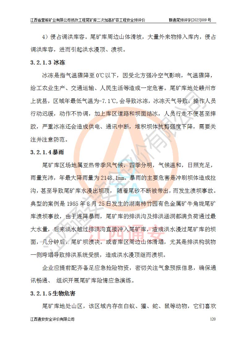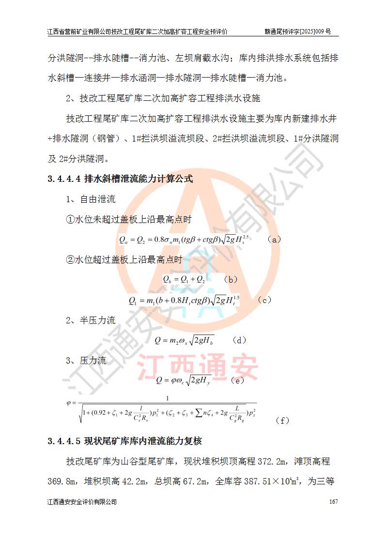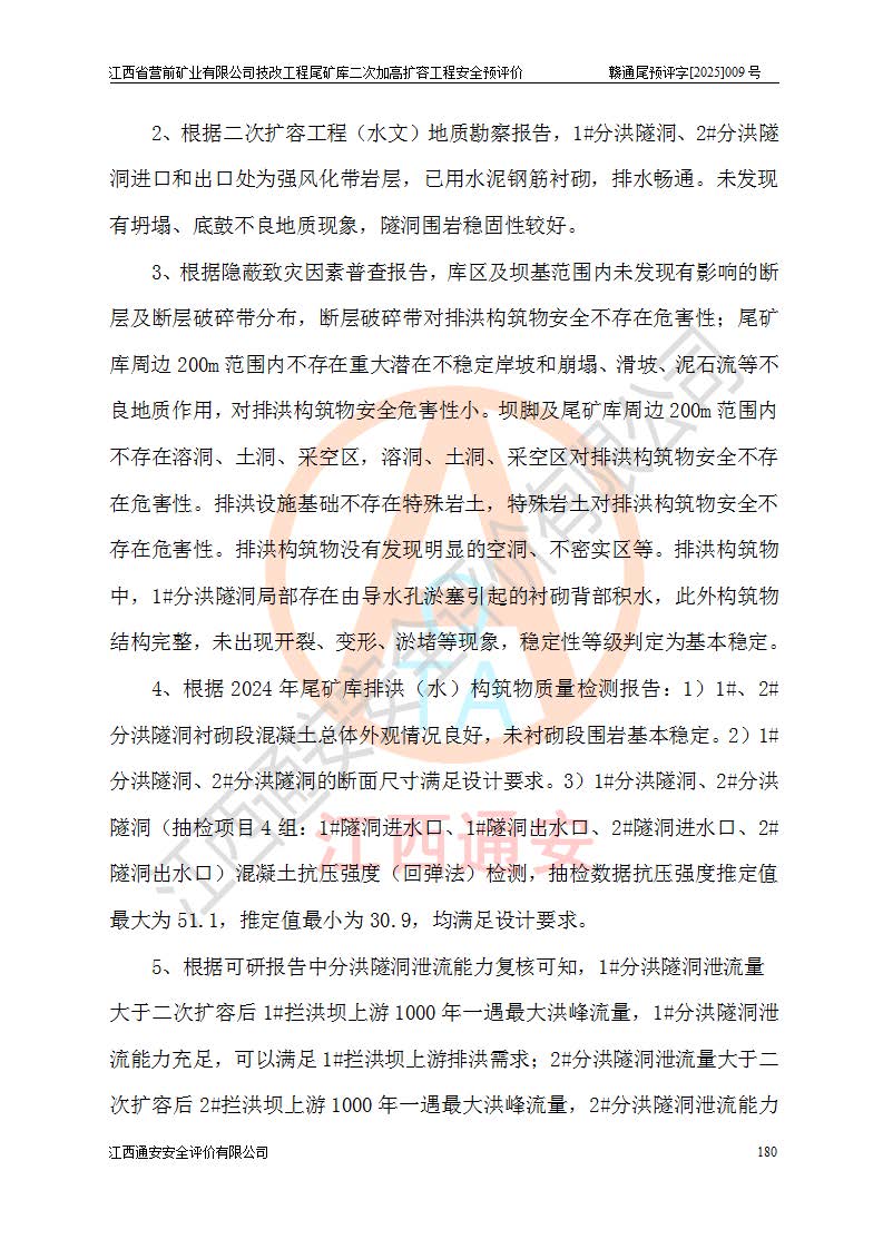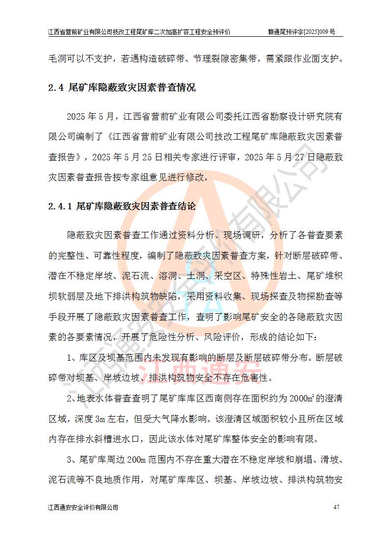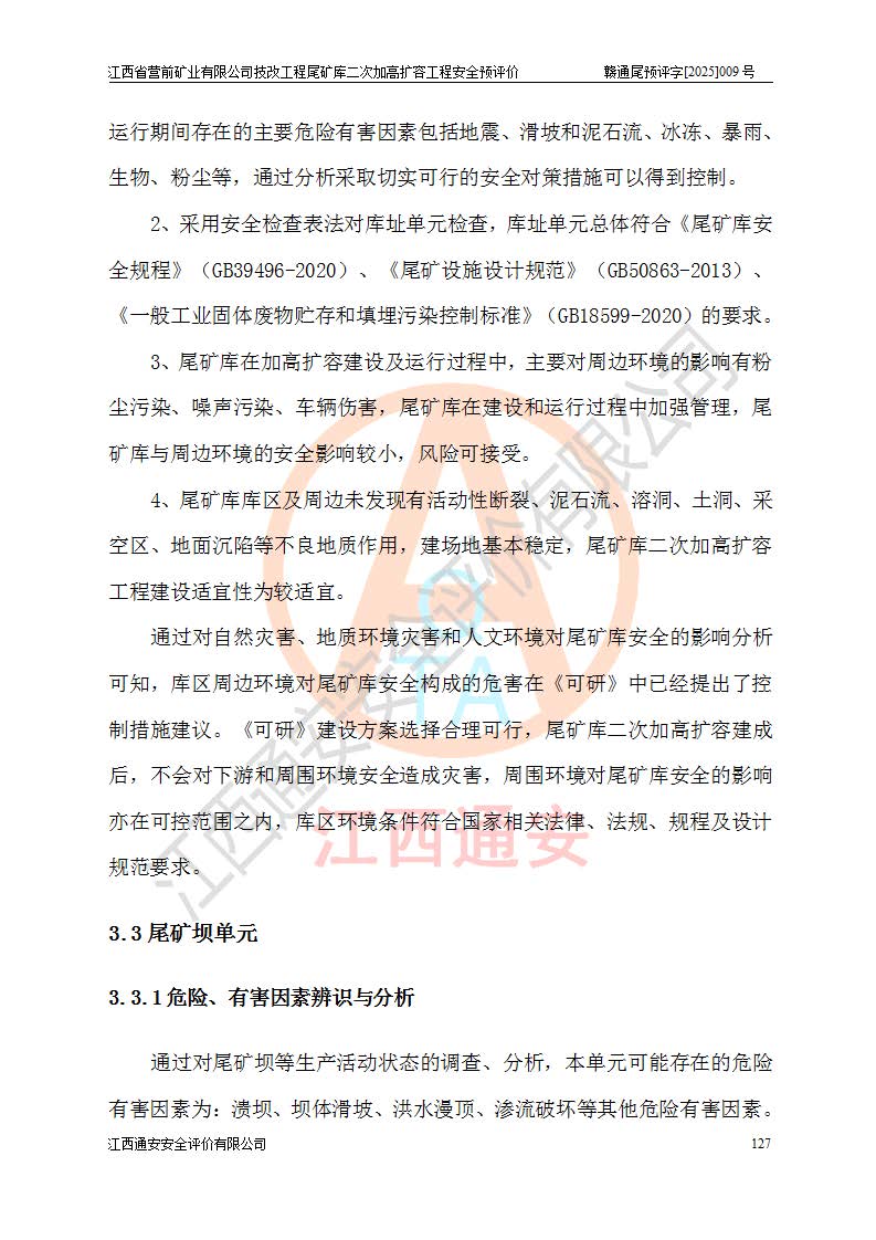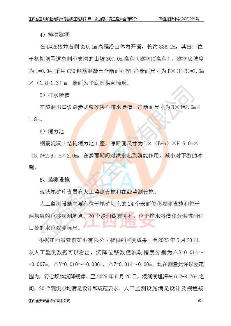 江西省營前礦業(yè)有限公司于2003年12月16日成立,位于贛州市上猶縣營前鎮(zhèn)焦里村境內(nèi),公司注冊資本10000萬元,法定**人陳雅博,礦區(qū)地理坐標(biāo):東經(jīng)114°18′30″~114°19′00″,北緯25°52′35″~25°53′47″。公司經(jīng)營范圍包括:鉛礦、鋅、鎢、銀地下開采、銷售。 江西省營前礦業(yè)有限公司技改工程尾礦庫位于焦里鎢銀鉛鋅礦區(qū),處于上猶縣水巖鄉(xiāng)井子村坑尾自然村境內(nèi),為山谷型尾礦庫。 江西省營前礦業(yè)有限公司技改工程尾礦庫于2013年由福建省冶金工業(yè)設(shè)計(jì)院設(shè)計(jì),2014年8月開始施工建設(shè),2015年4月竣工開始試運(yùn)行,2015年11月完成竣工驗(yàn)收,2016年1月首次取得安全生產(chǎn)許可證,2019年1月完成延期換證,2020年8月委托金建工程設(shè)計(jì)有限公司進(jìn)行尾礦庫加高擴(kuò)容工作,2020年10月21日取得了江西省應(yīng)急管理廳下發(fā)的《關(guān)于江西省營前礦業(yè)有限公司技改工程尾礦庫加高擴(kuò)容工程安全設(shè)施設(shè)計(jì)的審查意見》(贛應(yīng)急非煤項(xiàng)目設(shè)審〔2020〕46號),之后委托駐馬店市黃淮建設(shè)工程有限公司負(fù)責(zé)施工,云南潤滇工程技術(shù)有限公司負(fù)責(zé)監(jiān)理,2021年12月完成加高擴(kuò)容竣工驗(yàn)收工作,經(jīng)過延期,現(xiàn)尾礦庫安全生產(chǎn)許可證編號(贛)FM安許證字[2016]M1692號,**期為2025年01月18日至2028年01月17日。 江西省營前礦業(yè)有限公司技改工程尾礦庫為山谷型尾礦庫,初期壩為透水堆石壩,壩頂高程為330.0m,初期壩高25.0m,后期采用上游式尾礦堆積壩,加高擴(kuò)容后*終壩頂高程為380.0m,堆積壩高50.0m,總壩高為75.0m,總庫容為為503.14×104m3,尾礦庫為三等庫。尾礦庫初期壩以上總匯水面積3.53km2,防洪標(biāo)準(zhǔn)取500年一遇。 目前尾礦庫由初期壩、堆積壩、庫內(nèi)排洪系統(tǒng)(雙格排水斜槽+連接井+排水涵洞+排洪隧洞+排水陡槽+消力池)、1#攔洪壩、1#分洪隧洞、2#攔洪壩、2#分洪隧洞和安全監(jiān)測設(shè)施組成。根據(jù)建設(shè)單位提供的尾礦庫平面布置圖,截至2024年12月,現(xiàn)狀尾礦庫堆積壩頂高程為372.2m,現(xiàn)狀總壩高67.2m,灘頂高程為369.8m,現(xiàn)狀全庫容387.51×104m3,現(xiàn)狀尾礦庫為三等庫,原加高擴(kuò)容設(shè)計(jì)*終堆積壩頂高程為380.0m,現(xiàn)剩余庫容115.63×104m3,剩余**庫容約92.5×104m3,剩余服務(wù)年限約4.5年;礦山現(xiàn)有儲(chǔ)量較大,剩余庫容及服務(wù)年限不滿足礦山后期生產(chǎn)需要。 技改工程尾礦庫尾礦壩下游1**范圍無居民,不存在工礦企業(yè)等建構(gòu)筑物,不屬于“頭頂庫”;尾礦庫不壓礦;距贛江直線距離60**;不涉及保護(hù)區(qū)及生態(tài)紅線;尾礦庫所在溝谷較長,谷底平均縱坡9%,上游周邊山體地形有利于尾礦庫二次加高擴(kuò)容工程的實(shí)施,因此為了增加尾礦庫庫容,延長服務(wù)年限,充分利用尾礦庫所在溝谷地形,江西省營前礦業(yè)有限公司對技改尾礦庫進(jìn)行二次加高擴(kuò)容。 2024年12月,江西省營前礦業(yè)有限公司委托地礦贛西地質(zhì)工程勘察院編制了《江西省營前礦業(yè)有限公司技改工程尾礦庫二次擴(kuò)容工程(水文)地質(zhì)勘察報(bào)告》,2025年4月,江西省營前礦業(yè)有限公司委托金建工程設(shè)計(jì)有限公司編制了《江西省營前礦業(yè)有限公司技改工程尾礦庫二次加高擴(kuò)容工程可行性研究報(bào)告》。 按照非煤礦山建設(shè)項(xiàng)目安全設(shè)施“三同時(shí)”的規(guī)定要求,技改工程尾礦庫為二次加高擴(kuò)容工程,**進(jìn)行安全預(yù)評價(jià);江西省營前礦業(yè)有限公司委托我公司承擔(dān)技改工程尾礦庫二次加高擴(kuò)容工程建設(shè)項(xiàng)目的安全預(yù)評價(jià)工作。 |