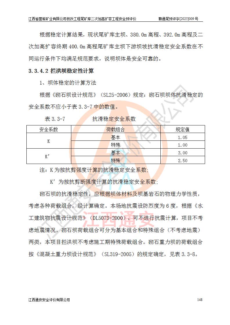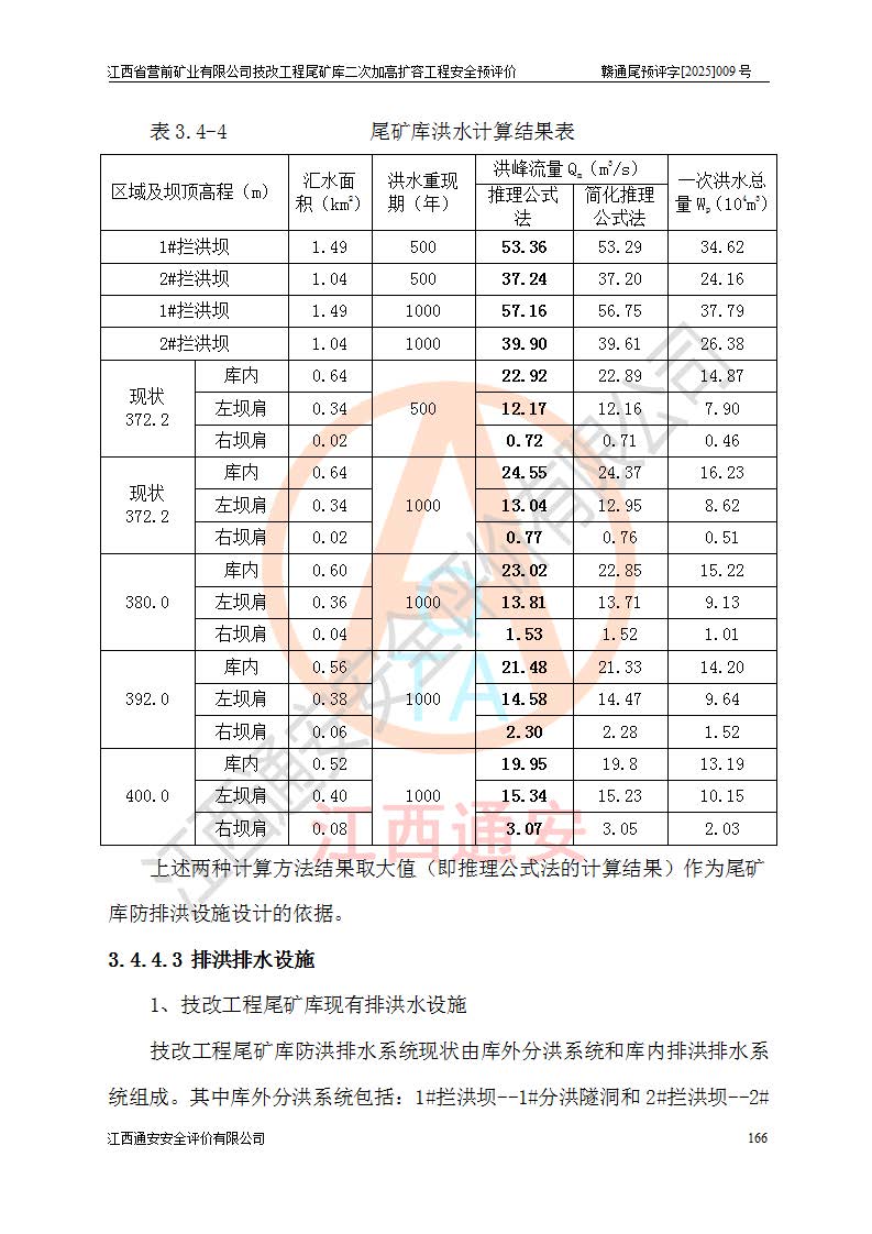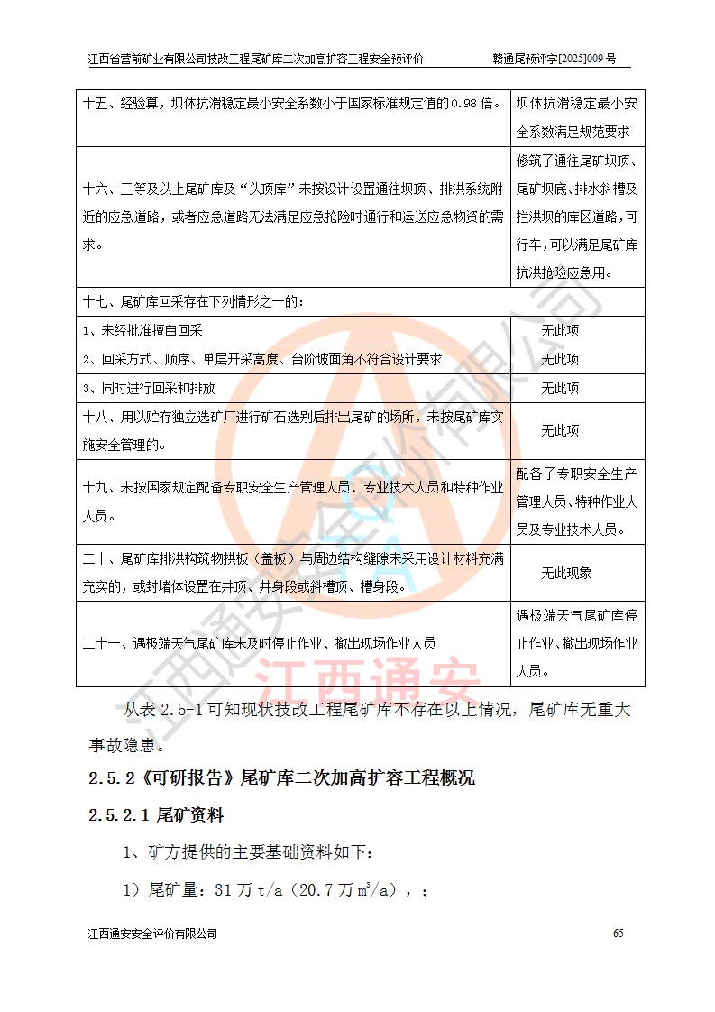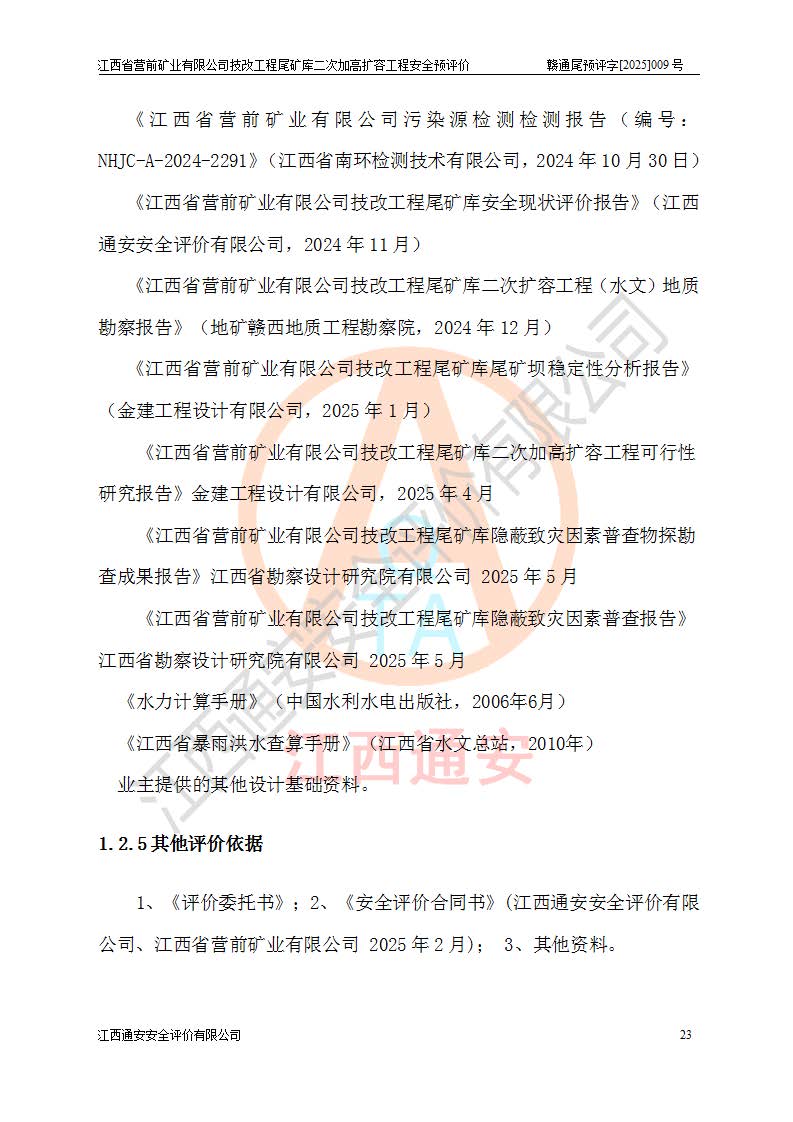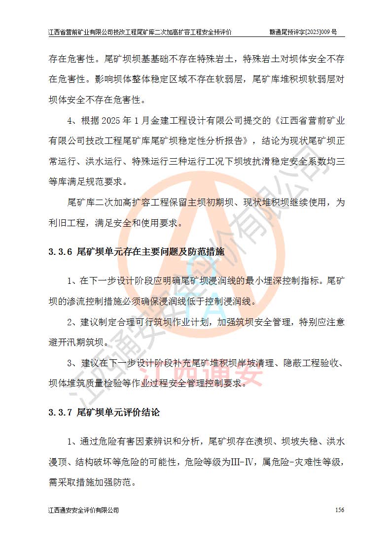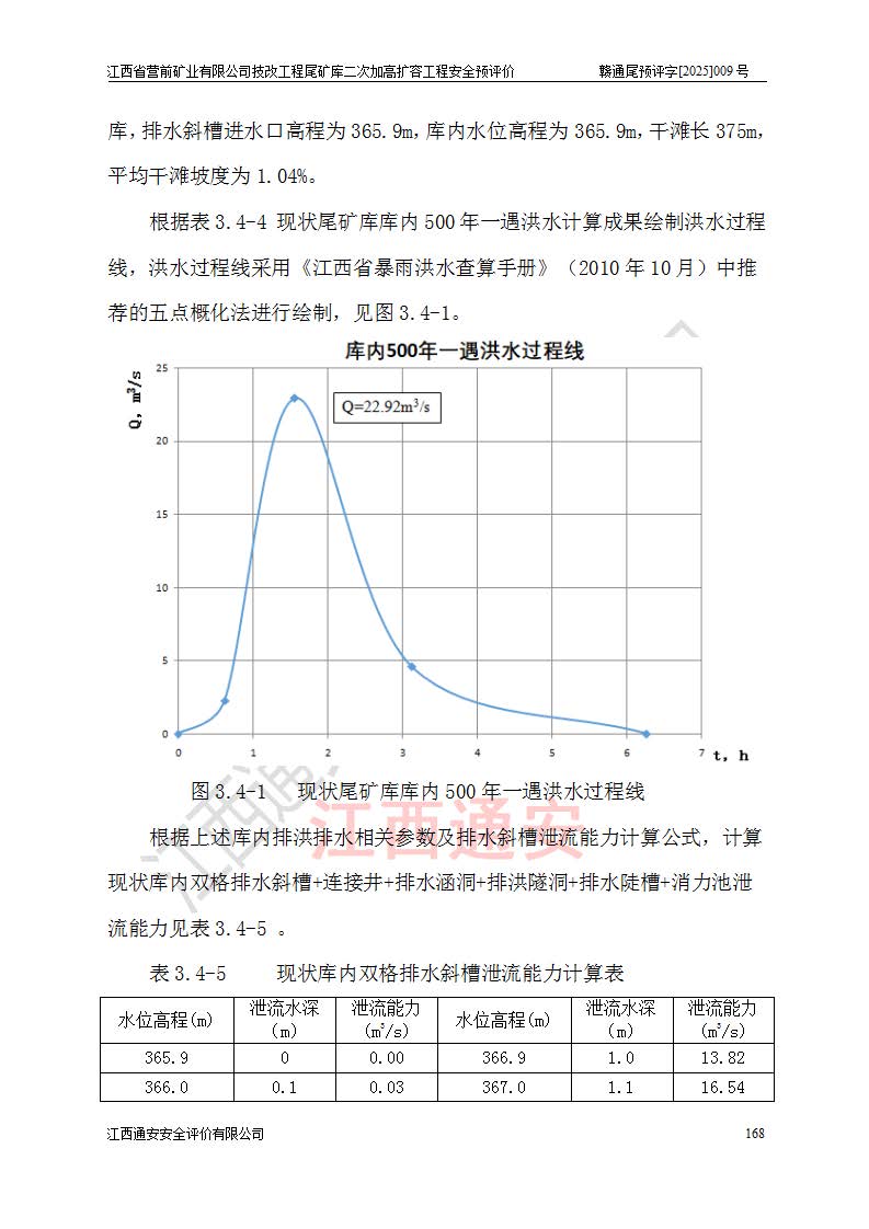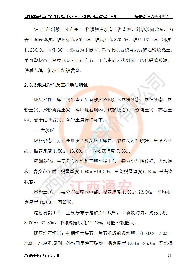 江西省營前礦業(yè)有限公司于2003年12月16日成立,位于贛州市上猶縣營前鎮(zhèn)焦里村境內(nèi),公司注冊資本10000萬元,法定**人陳雅博,礦區(qū)地理坐標(biāo):東經(jīng)114°18′30″~114°19′00″,北緯25°52′35″~25°53′47″。公司經(jīng)營范圍包括:鉛礦、鋅、鎢、銀地下開采、銷售。 江西省營前礦業(yè)有限公司技改工程尾礦庫位于焦里鎢銀鉛鋅礦區(qū),處于上猶縣水巖鄉(xiāng)井子村坑尾自然村境內(nèi),為山谷型尾礦庫。 江西省營前礦業(yè)有限公司技改工程尾礦庫于2013年由福建省冶金工業(yè)設(shè)計(jì)院設(shè)計(jì),2014年8月開始施工建設(shè),2015年4月竣工開始試運(yùn)行,2015年11月完成竣工驗(yàn)收,2016年1月首次取得安全生產(chǎn)許可證,2019年1月完成延期換證,2020年8月委托金建工程設(shè)計(jì)有限公司進(jìn)行尾礦庫加高擴(kuò)容工作,2020年10月21日取得了江西省應(yīng)急管理廳下發(fā)的《關(guān)于江西省營前礦業(yè)有限公司技改工程尾礦庫加高擴(kuò)容工程安全設(shè)施設(shè)計(jì)的審查意見》(贛應(yīng)急非煤項(xiàng)目設(shè)審〔2020〕46號),之后委托駐馬店市黃淮建設(shè)工程有限公司負(fù)責(zé)施工,云南潤滇工程技術(shù)有限公司負(fù)責(zé)監(jiān)理,2021年12月完成加高擴(kuò)容竣工驗(yàn)收工作,經(jīng)過延期,現(xiàn)尾礦庫安全生產(chǎn)許可證編號(贛)FM安許證字[2016]M1692號,**期為2025年01月18日至2028年01月17日。 江西省營前礦業(yè)有限公司技改工程尾礦庫為山谷型尾礦庫,初期壩為透水堆石壩,壩頂高程為330.0m,初期壩高25.0m,后期采用上游式尾礦堆積壩,加高擴(kuò)容后*終壩頂高程為380.0m,堆積壩高50.0m,總壩高為75.0m,總庫容為為503.14×104m3,尾礦庫為三等庫。尾礦庫初期壩以上總匯水面積3.53km2,防洪標(biāo)準(zhǔn)取500年一遇。 目前尾礦庫由初期壩、堆積壩、庫內(nèi)排洪系統(tǒng)(雙格排水斜槽+連接井+排水涵洞+排洪隧洞+排水陡槽+消力池)、1#攔洪壩、1#分洪隧洞、2#攔洪壩、2#分洪隧洞和安全監(jiān)測設(shè)施組成。根據(jù)建設(shè)單位提供的尾礦庫平面布置圖,截至2024年12月,現(xiàn)狀尾礦庫堆積壩頂高程為372.2m,現(xiàn)狀總壩高67.2m,灘頂高程為369.8m,現(xiàn)狀全庫容387.51×104m3,現(xiàn)狀尾礦庫為三等庫,原加高擴(kuò)容設(shè)計(jì)*終堆積壩頂高程為380.0m,現(xiàn)剩余庫容115.63×104m3,剩余**庫容約92.5×104m3,剩余服務(wù)年限約4.5年;礦山現(xiàn)有儲(chǔ)量較大,剩余庫容及服務(wù)年限不滿足礦山后期生產(chǎn)需要。 技改工程尾礦庫尾礦壩下游1**范圍無居民,不存在工礦企業(yè)等建構(gòu)筑物,不屬于“頭頂庫”;尾礦庫不壓礦;距贛江直線距離60**;不涉及保護(hù)區(qū)及生態(tài)紅線;尾礦庫所在溝谷較長,谷底平均縱坡9%,上游周邊山體地形有利于尾礦庫二次加高擴(kuò)容工程的實(shí)施,因此為了增加尾礦庫庫容,延長服務(wù)年限,充分利用尾礦庫所在溝谷地形,江西省營前礦業(yè)有限公司對技改尾礦庫進(jìn)行二次加高擴(kuò)容。 2024年12月,江西省營前礦業(yè)有限公司委托地礦贛西地質(zhì)工程勘察院編制了《江西省營前礦業(yè)有限公司技改工程尾礦庫二次擴(kuò)容工程(水文)地質(zhì)勘察報(bào)告》,2025年4月,江西省營前礦業(yè)有限公司委托金建工程設(shè)計(jì)有限公司編制了《江西省營前礦業(yè)有限公司技改工程尾礦庫二次加高擴(kuò)容工程可行性研究報(bào)告》。 按照非煤礦山建設(shè)項(xiàng)目安全設(shè)施“三同時(shí)”的規(guī)定要求,技改工程尾礦庫為二次加高擴(kuò)容工程,**進(jìn)行安全預(yù)評價(jià);江西省營前礦業(yè)有限公司委托我公司承擔(dān)技改工程尾礦庫二次加高擴(kuò)容工程建設(shè)項(xiàng)目的安全預(yù)評價(jià)工作。 |